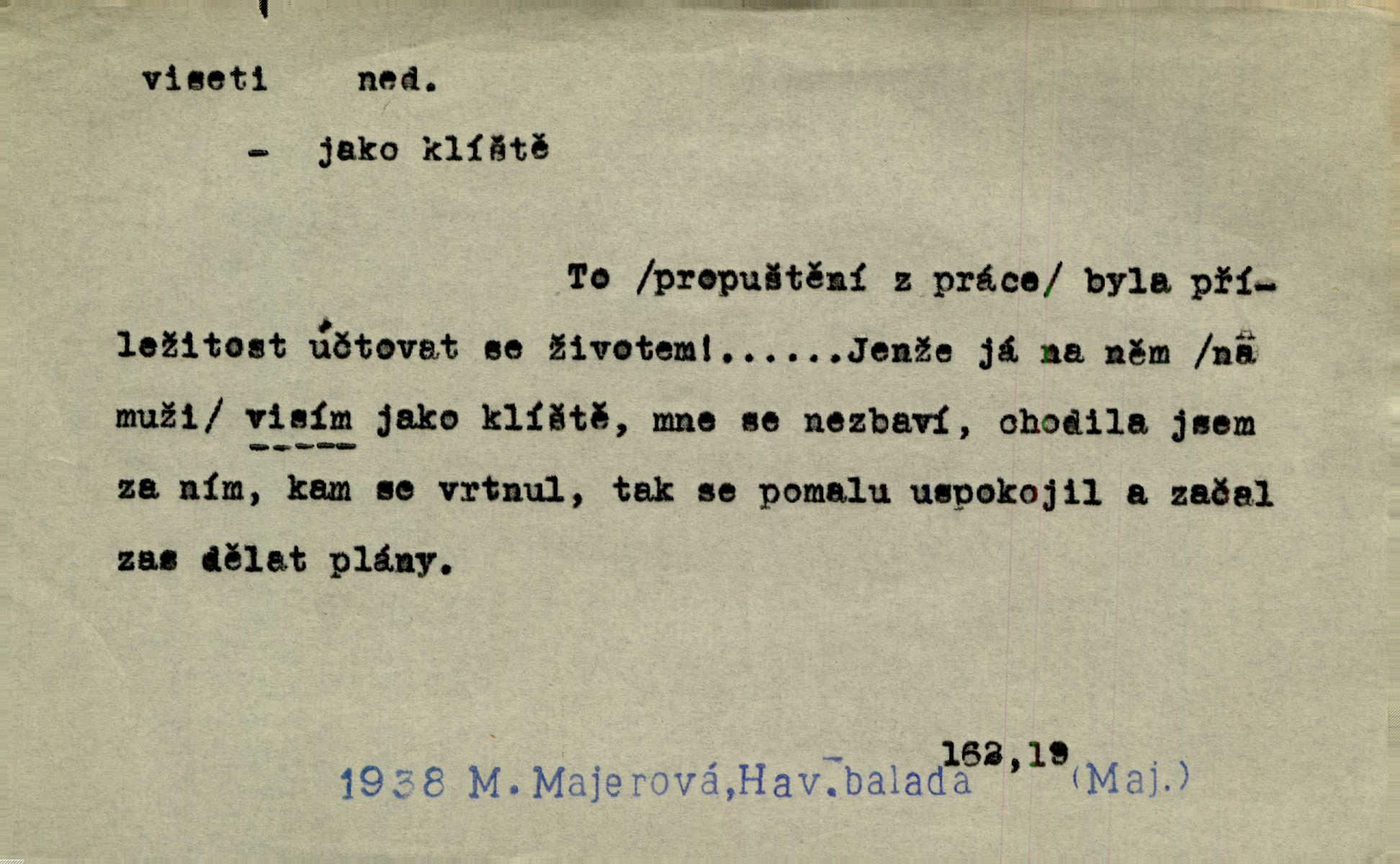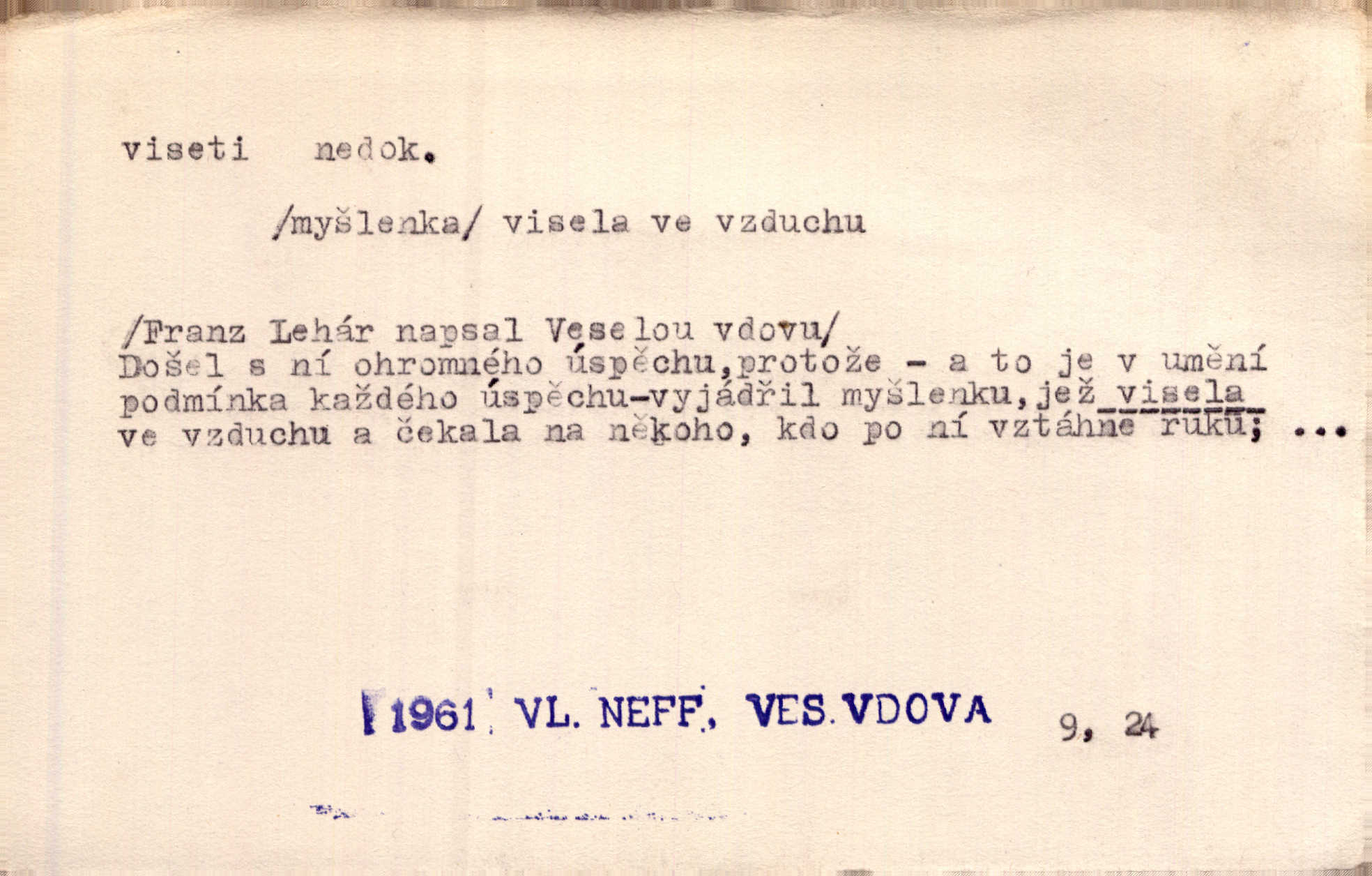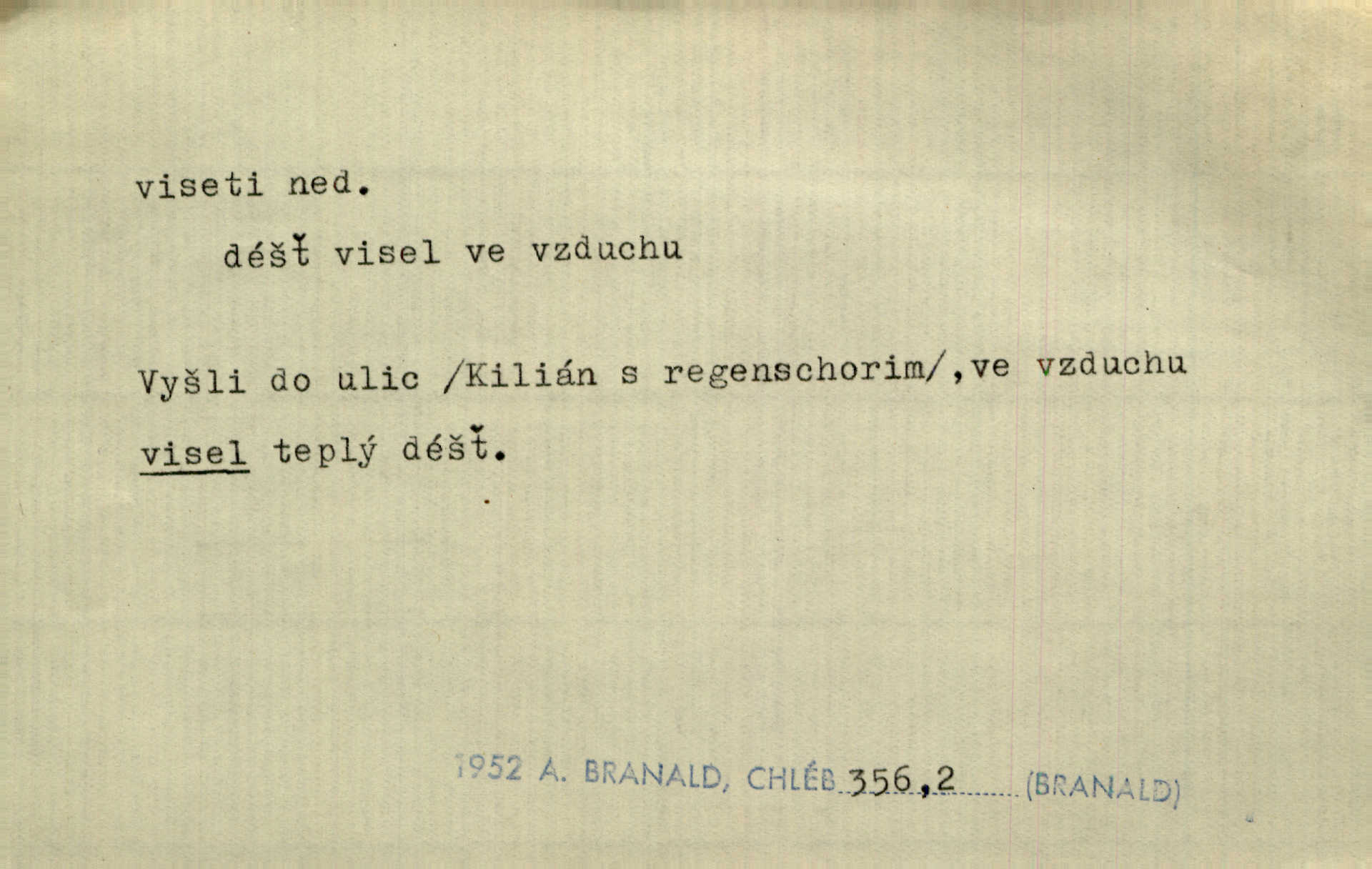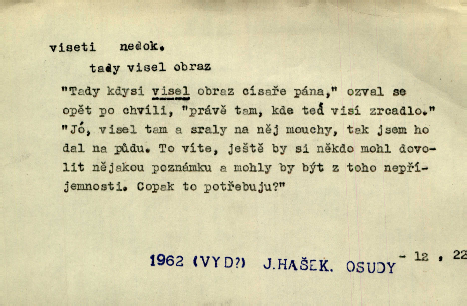 - viseti ned. býti zachycen, upevněn tak, že těžiště je pod místem upevnění. A nad ním zlatá lampa visí. Vrch. Z kapsy visel řetízek hodinek. Just. Kytara visela na krku. Rub. Komediant zazvonil velkým zvonem, který mu visel od pasu. Svět. Na levé ruce visel jí košík. Šmil. Dokončil převlek do svého občanského šatu v jeho klubovní skříni od včerejška visícího. Čap. Ch. Vzadu visel mu cop s mašlí. Něm. Podlé všeho nejsou tyto dvéře nové. Visí špatně v zámku. Pfleg. Mezkovi smekla se noha a již visel zadní částí těla nad propastí. Lum. Starý Božek visel ve větvích a sbíraje housenky, s hůry dolů cenil křivé svoje zuby. V. Mrš. Jedním skokem viseli oba chlapci otci na krku. Svět. Služby nevisí na hřebíčku nenajdou se snadno. Jah. A což nevisí ještě každým dnem nad naší hlavou Damoklův meč nehrozí. Marx-Štoll. Život její visel jen na jediné tenounké nitce byl ve velkém nebezpečí. Svět. Nejeden z těch pánů, kteří jsou dnes slavní, visel před lety u nás na černé tabuli byl dlužen. Ben. Žert. Už, prosím, visíme na Staroměstské radnici! máme ohlášky. Švan. D vůbec býti ve svislé, skleslé poloze. Netečně nyní visely mu ruce. Svob. Brada visí na prsa. Ner. Dlaní hladil si široký obličej visících vrásčitých tváří. Rais. S koutků úst visí cigareta. Poláč. Jak mdle se klonila kupředu, kterak visel oděv na její jindy tak plné postavě. Svět. D přečnívati, pnouti se nad něčím. Zasedl jsem s drahým svým přítelem na verandě kolem zámku nad mořem visící. Ner. Nad příbojem, kde visí skála holá, dlí pěvec zamyšlen a k živlům volá. Krás. D býti oběšen. Ty, chlape, budeš viset. Vanč. Chci viset, jestliže kýs arcipadouch nevymyslil si tu pomluvu. Slád. Jestli ta je pravá, tak ať visím (v důrazném ujištění). Hoffm. D (nad čím) vznášeti se nehybně nad něčím, v něčem. Nad pasekou v modru nebes nehybně visí krahujec. J. Šulc. Mračno viselo nad plochou krajinou. Vanč. Byl chladný večer, mlha visela s nebe. Zey. Sníh ležel všude, nebe šedivé nad černým hvozdem viselo. Zey. Zářijové slunce viselo na bleděmodré, bezmračné obloze jako zralý, ohnivý plod. K. J. Ben. Na obzoru širém juž visí noc. Vrch. Politický program sebe lepší, když není schopen a přijat mnohými a mnohými jednotlivci, ve vzduchu visí, je abstraktní nemá souvislost se skutečností. Naše d. D (na kom, n. čem) váznouti, lpěti, tkvíti na někom n. něčem. Visí na tom jakési, starému pánu dobře povědomé trestní vyšetřování. Staš. Kleveta byla slavně vyvrácena — ale na Bozděchovi ještě dlouho po tom z ní něco viselo. Kronb. Z každé třeba nejhanebněji vymyšlené lži vždy předce nějaká skvrna viseti zůstane. Ner. Na patách visela mu [Jardovi] pořád maminka, služka nebo tatínek stále za ním chodili. Hašková. Na rtech stále visela jí otázka. Svob. Ať je pokyn jakkoliv správný, může zůstat viset ve vzduchu, budou-li na odpovědných místech stát lidé, kteří nejsou schopni tento pokyn uskutečnit minouti se účinkem. R. právo. Šafránka visela očima na dědkovi karbaníku stále ho pozorovala. Herrm. Jeho zrak visel ustavičně na její tváři. Zey. Oni všichni zdají se viseti na mých rtech, mých očích a čekají na to, co vyřknu. Kun. Pomoz mi, zůstala jsem zde někde viset zachytila jsem šatem a uvázla. Ner. D (čím, s čím) slang. býti dlužen nějakou částku. Posléze zůstal předce asi desítkou viseti a nedal se dlouho vidět. Sab. S loňským nedoplatkem bude teď u firmy viset s dvanácti sty. Horečka. Tak namátkou si vzpomínám, že tady visíte pěkným penízem již od léta. Vanč. Visíme tam třiceti korunami. Lang. D (na kom) lpěti na někom jako nějaká starost, těžká povinnost, tížiti někoho; (nad kým n. čím) hroziti někomu n. něčemu nepříznivým obratem, nebezpečím. Všecko všude visí na člověku! Svob. Všecko jen na tobě visí. A. Mrš. Hmotná starost o ně [sourozence] visela na něm jako závaží. Rozhlas. Bankrot zemský se vší svou hrůzou visí nám nad hlavami. Havl. Pachtil se v lomu, kde smrt pořád nad ním visela. Svět. Cosi viselo ve vzduchu, o tom nebylo pochyby. K. J. Ben. D (na kom n. čem, řidč. od koho n. čeho, čím) poněk. zast. záviseti. Bude všechno viset na předsedovi, ku které straně se přidá. Staš. Všecko visí ovšem na povaze Luisině. Šmil. Snad i jeho život na tom visí, jakým se bude na první pohled císaři zdát. Zey. Napřed zjednati bylo dovolení nejvyšších úředníků a místodržících, na jejichž dobrém zdání takový zákup visel rozhodně. Win. Vše od krále visí, co se stane. A. Dvoř. Zásada svrchované autority a celé ústrojí církve visely takořka od rozhodnutí otázky české. Pal. I když viseli Rakovničtí robotou na Hrádku, oslavovali vždy den, kdy hejtman z Hrádku nový úřad posazoval. Win. Z vůle jeho jediného visel pokoj v Čechách. Pal. D (na kom n. čem) býti cele někomu n. něčemu oddán, něčím zaujat, vřele milovati někoho n. něco. Je to dítě, má tě rádo, visí na tobě. Kun. On na statku vezdejším nevisí tak jako sestra jeho. Zey. Srdce tvé visí na statcích pozemských. Prav. Bylo zřejmo, jak na bratru visí, jak jej má ráda. Jir. Bylo zřejmo, jak visí na tom plánu svém vdáti Lidušku za Piltyše. Štech. — V. t. visení.