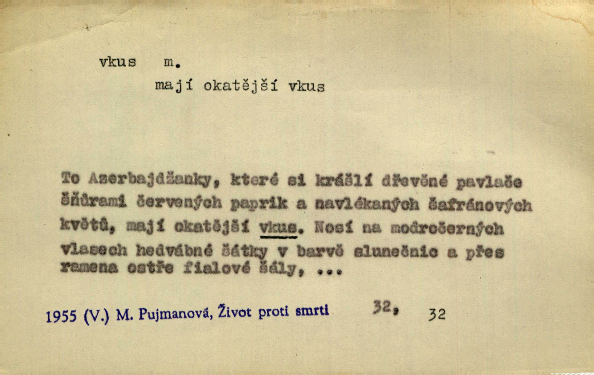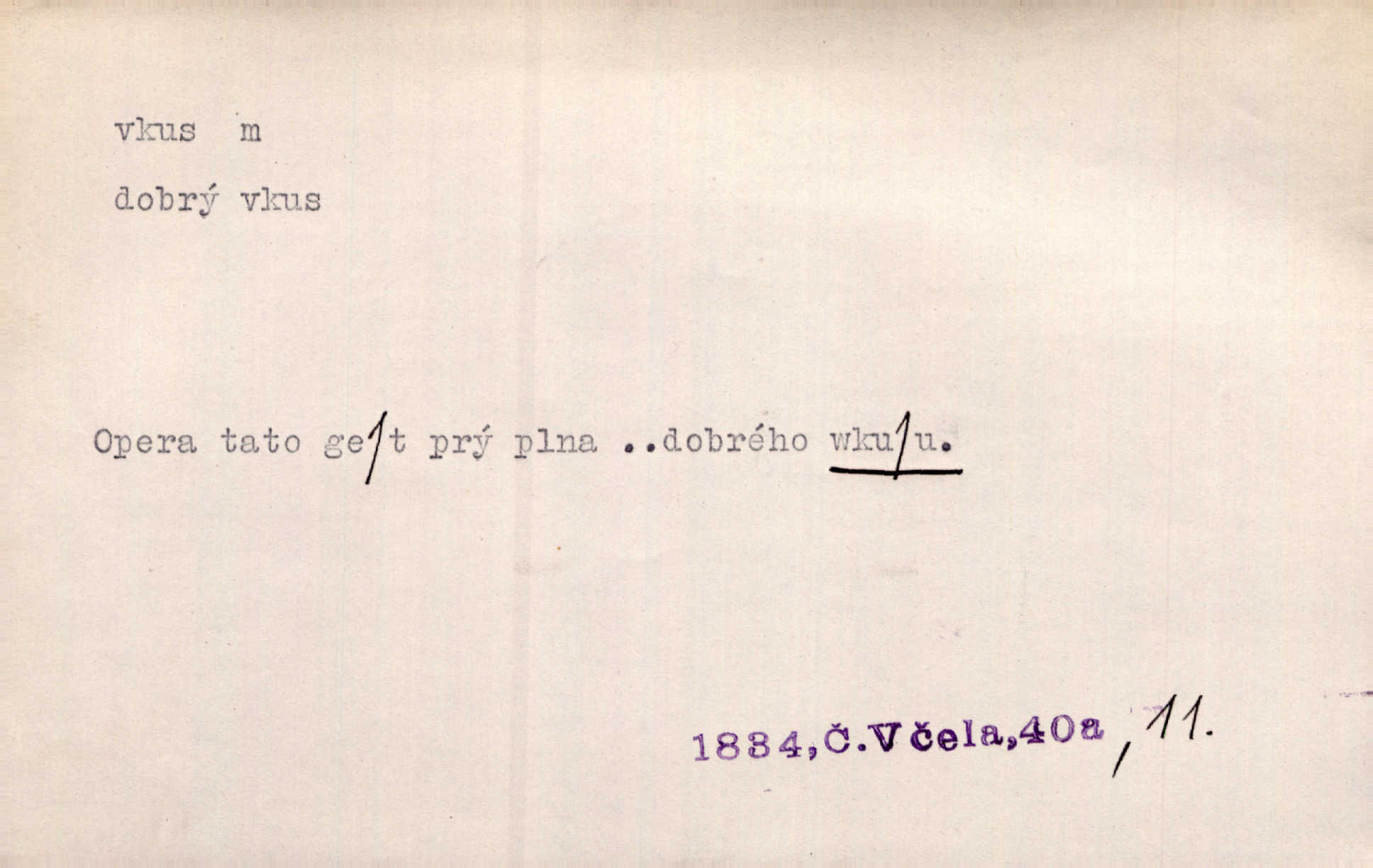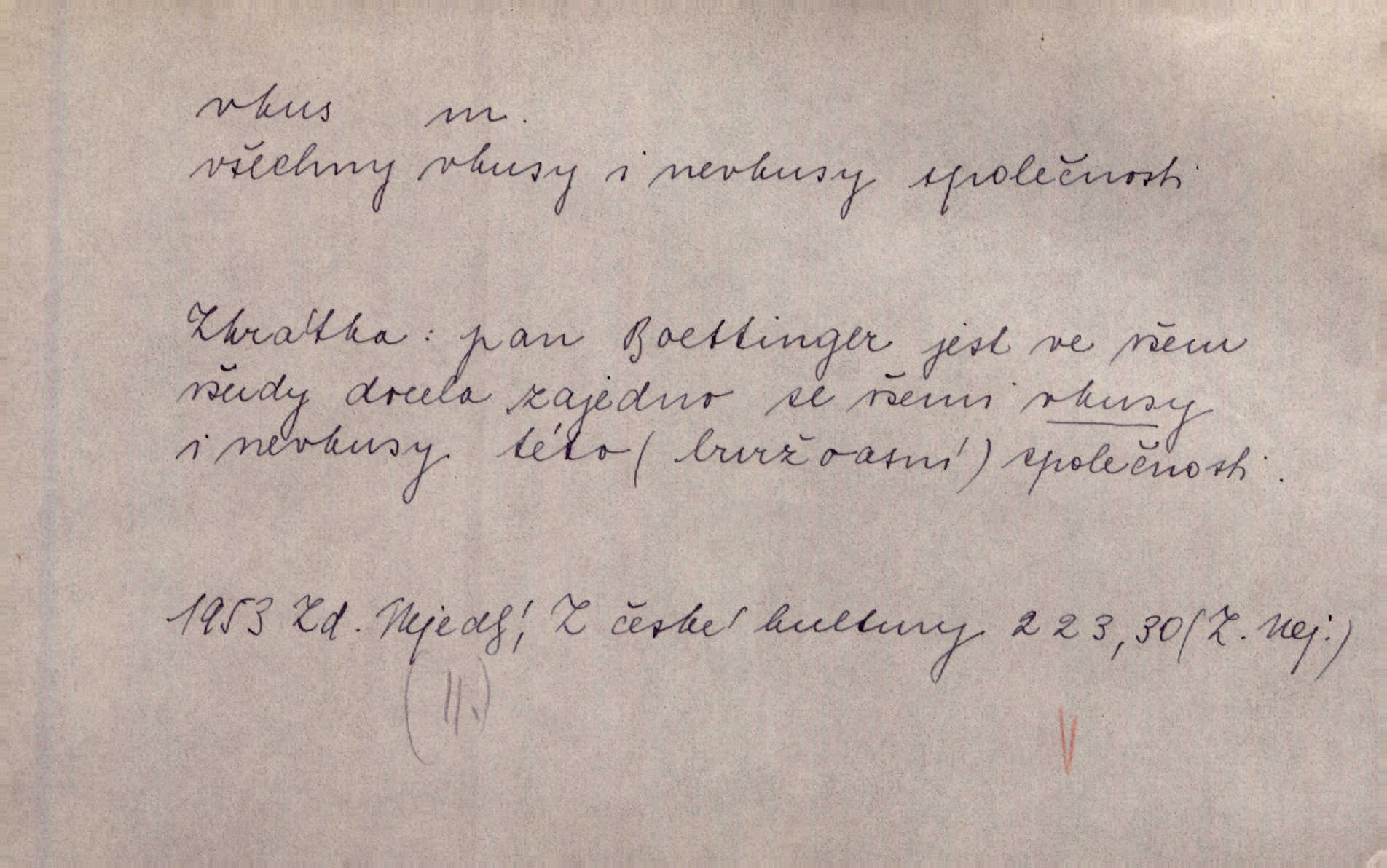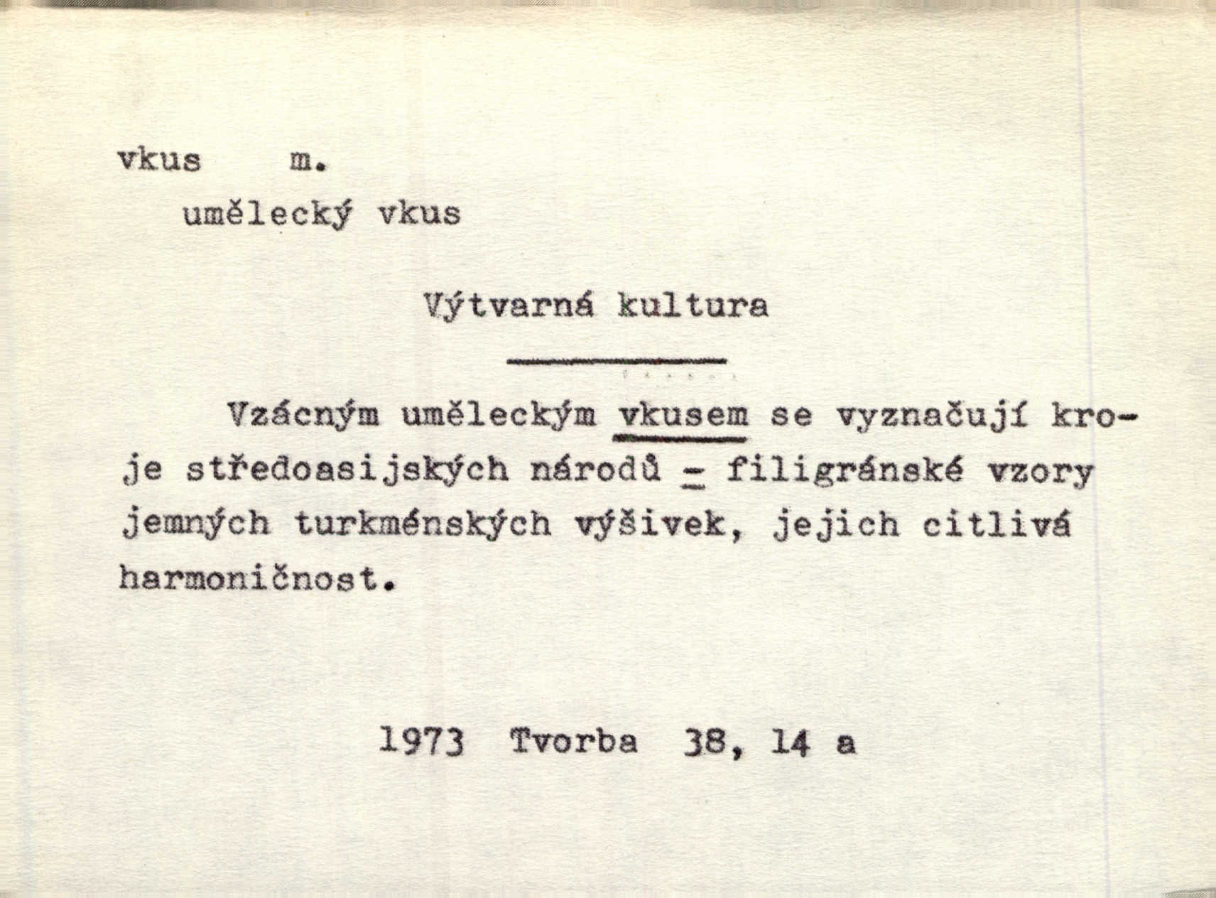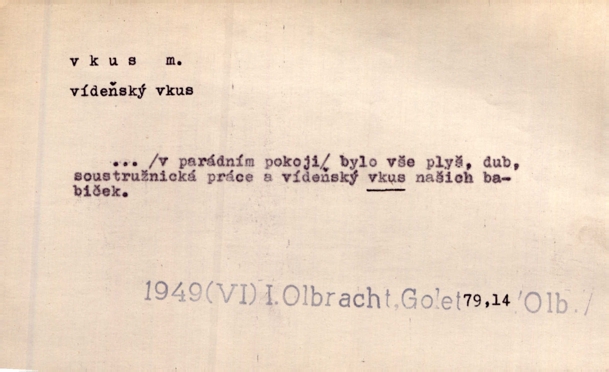 - vkus, -u m. osobní schopnost cítiti a rozeznávati krásu, posuzovati přednosti a chyby s hlediska estetického. Pravda, že nemají venkovští dělníci toho vybroušeného vkusu, té umělosti. Něm. [Malířův] dobrý vkus byl obecně znám. Herrm. Když se jednou vdám, vyberu si ženicha dle svého vkusu. Preis. [Byla hrda] na svůj vkus, jak se i za laciné peníze uměla šatiti. Herrm. To byly náhledy a slova dle Štěpánova vkusu vyhovující mu. Svět. Filos. schopnost estetického posuzování. D soubor dobových, místních a j. měřítek pro výběr po stránce estetické. [Dějiny umění] nejpádněji ukazují, že tak zv. vkus, podle něhož přisuzujeme věcem hodnotu krásna, jest velmi rozmanitý a proměnlivý. Z. Nej. [Stůl] a ostatní části nářadí byly již modernější, zrobeny dle toho vkusu, jaký panoval na konec republiky. Jir. [Za hájem objevil se] pravidelný obdélný zámek ve vkusu císařství. R. Svob. Proposice k čistě uměleckému a k tomu domácímu vkusu položili Mánes, Aleš, Chittusi, Myslbek, Jenewein, Schwaigr. V. Mrš. Dílo přírody nikdy nepodléhá dobovému vkusu. K. Konr. Nábytek vídeňského vkusu plnil jeho pokoje. Staš. Zast. Pavillony v italianském, čínském, francouzském i Bůh ví jakém ještě vkusu stavěné slohu, stylu. Něm. [Schody se rozbíhají] vroubeny jsouce promalovaným kamenným zábradlím v barokovém vkusu. Čech. [Vazba] jest přísně provedena buďto v byzantinském, maurském nebo gothickém, italském nebo francouzském vkusu. Ner. Filos., est. soubor ustálených hledisek, na základě nichž něco posuzujeme, obyč. po stránce estetické, vládnoucí kánon estetických norem.