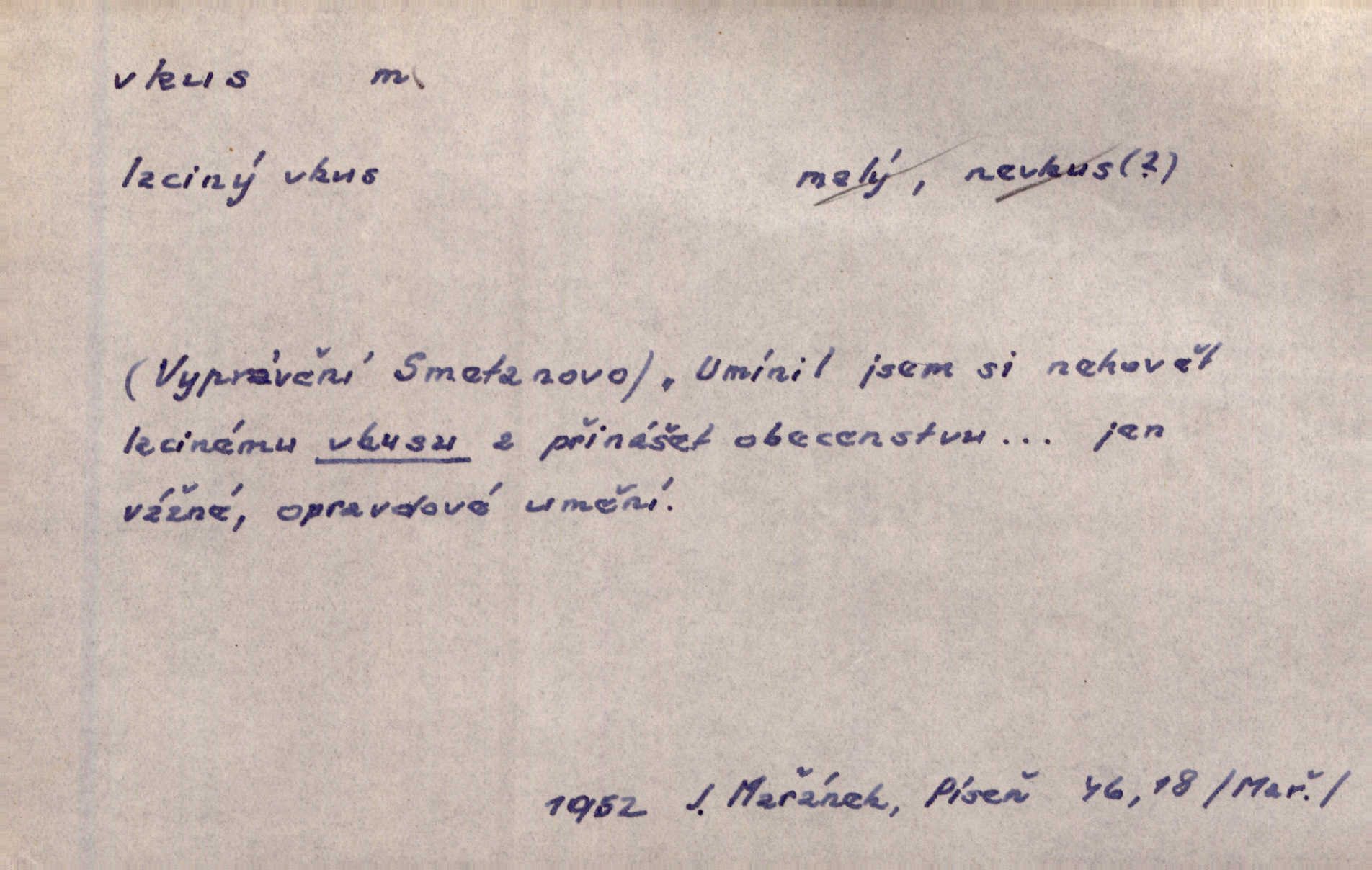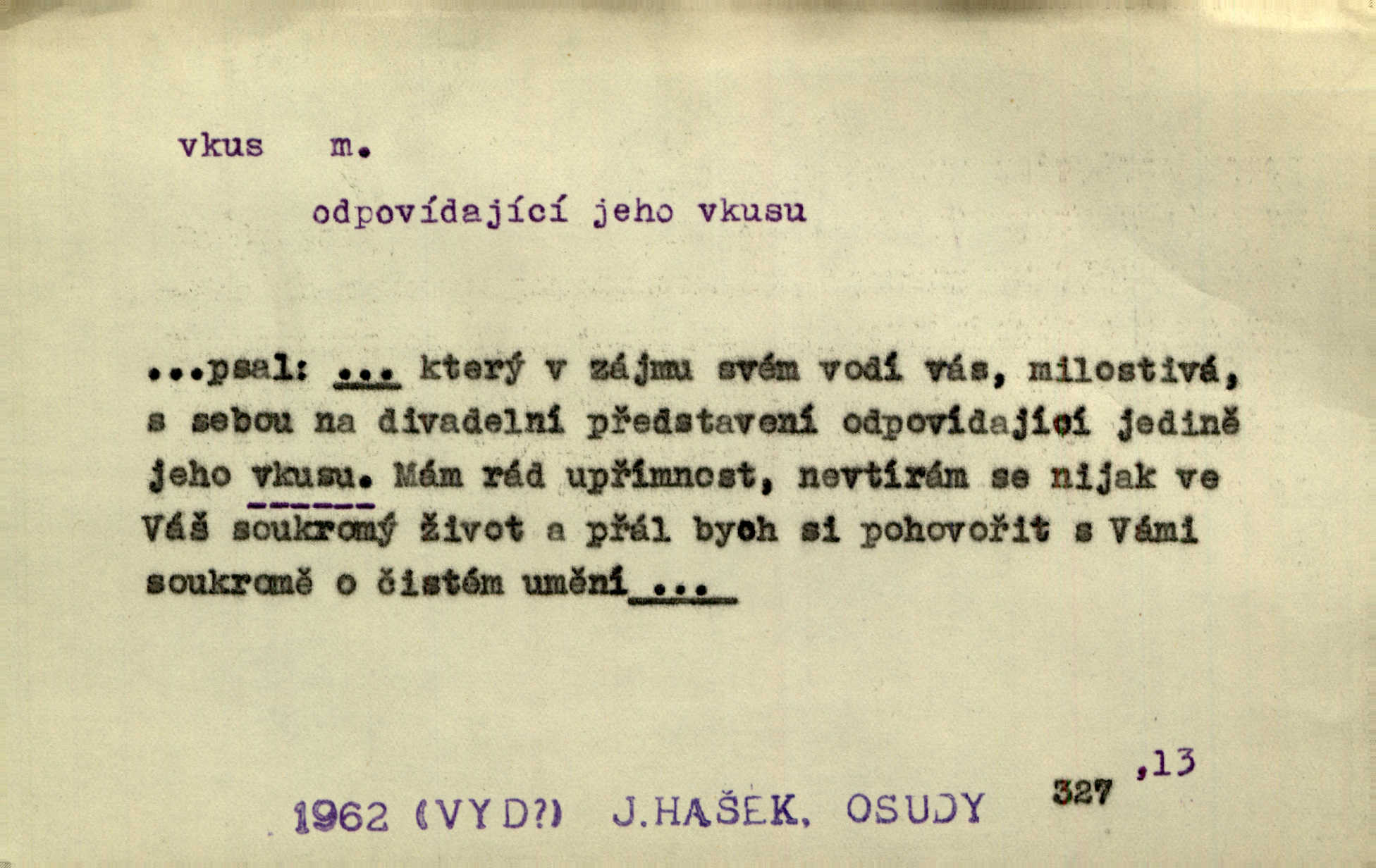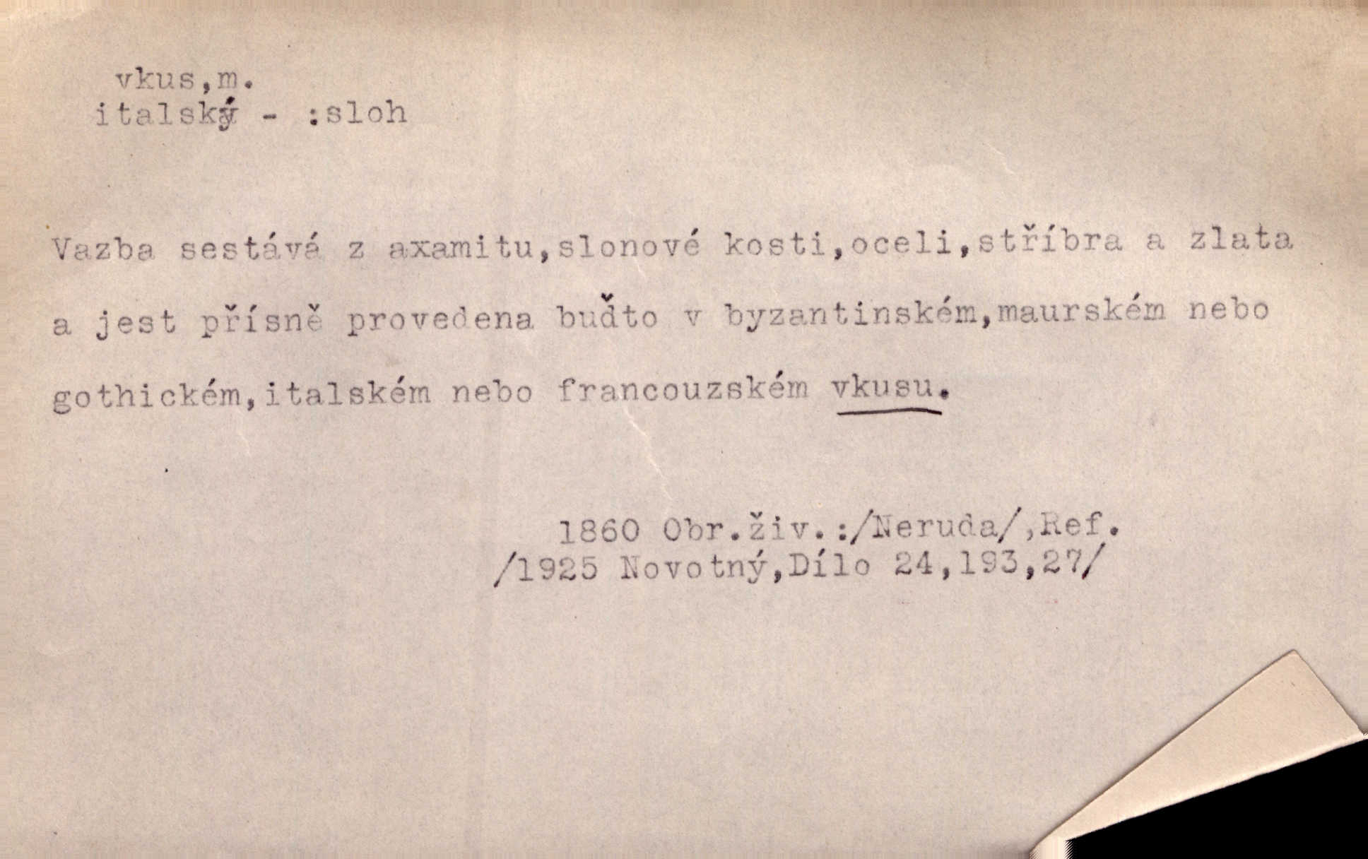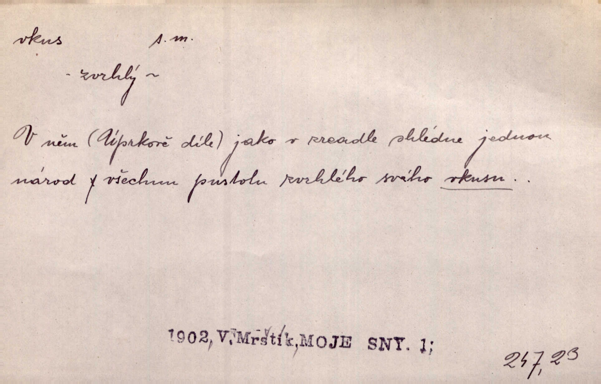 - vkus, -u m. osobní schopnost cítiti a rozeznávati krásu, posuzovati přednosti a chyby s hlediska estetického. Pravda, že nemají venkovští dělníci toho vybroušeného vkusu, té umělosti. Něm. [Malířův] dobrý vkus byl obecně znám. Herrm. Když se jednou vdám, vyberu si ženicha dle svého vkusu. Preis. [Byla hrda] na svůj vkus, jak se i za laciné peníze uměla šatiti. Herrm. To byly náhledy a slova dle Štěpánova vkusu vyhovující mu. Svět. Filos. schopnost estetického posuzování. D soubor dobových, místních a j. měřítek pro výběr po stránce estetické. [Dějiny umění] nejpádněji ukazují, že tak zv. vkus, podle něhož přisuzujeme věcem hodnotu krásna, jest velmi rozmanitý a proměnlivý. Z. Nej. [Stůl] a ostatní části nářadí byly již modernější, zrobeny dle toho vkusu, jaký panoval na konec republiky. Jir. [Za hájem objevil se] pravidelný obdélný zámek ve vkusu císařství. R. Svob. Proposice k čistě uměleckému a k tomu domácímu vkusu položili Mánes, Aleš, Chittusi, Myslbek, Jenewein, Schwaigr. V. Mrš. Dílo přírody nikdy nepodléhá dobovému vkusu. K. Konr. Nábytek vídeňského vkusu plnil jeho pokoje. Staš. Zast. Pavillony v italianském, čínském, francouzském i Bůh ví jakém ještě vkusu stavěné slohu, stylu. Něm. [Schody se rozbíhají] vroubeny jsouce promalovaným kamenným zábradlím v barokovém vkusu. Čech. [Vazba] jest přísně provedena buďto v byzantinském, maurském nebo gothickém, italském nebo francouzském vkusu. Ner. Filos., est. soubor ustálených hledisek, na základě nichž něco posuzujeme, obyč. po stránce estetické, vládnoucí kánon estetických norem.