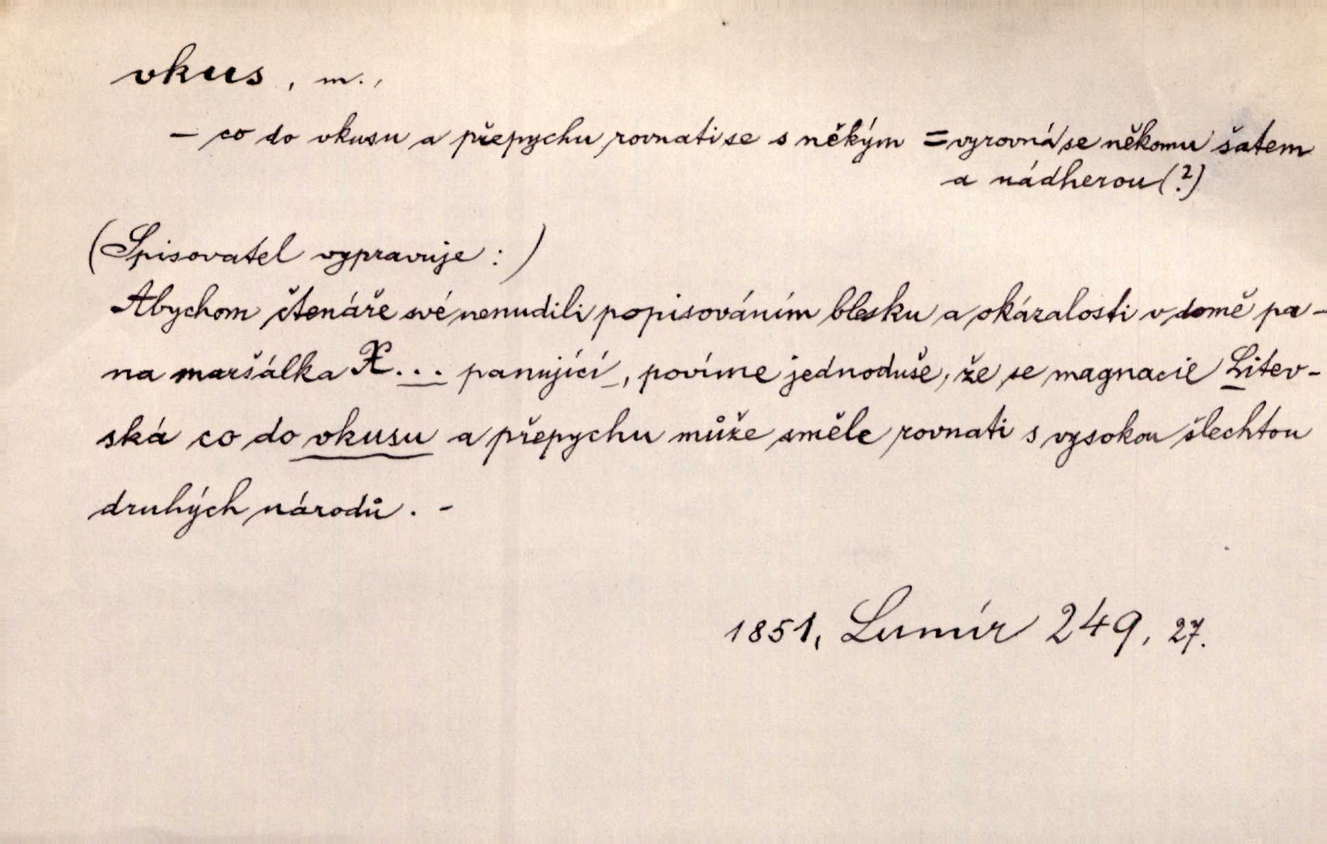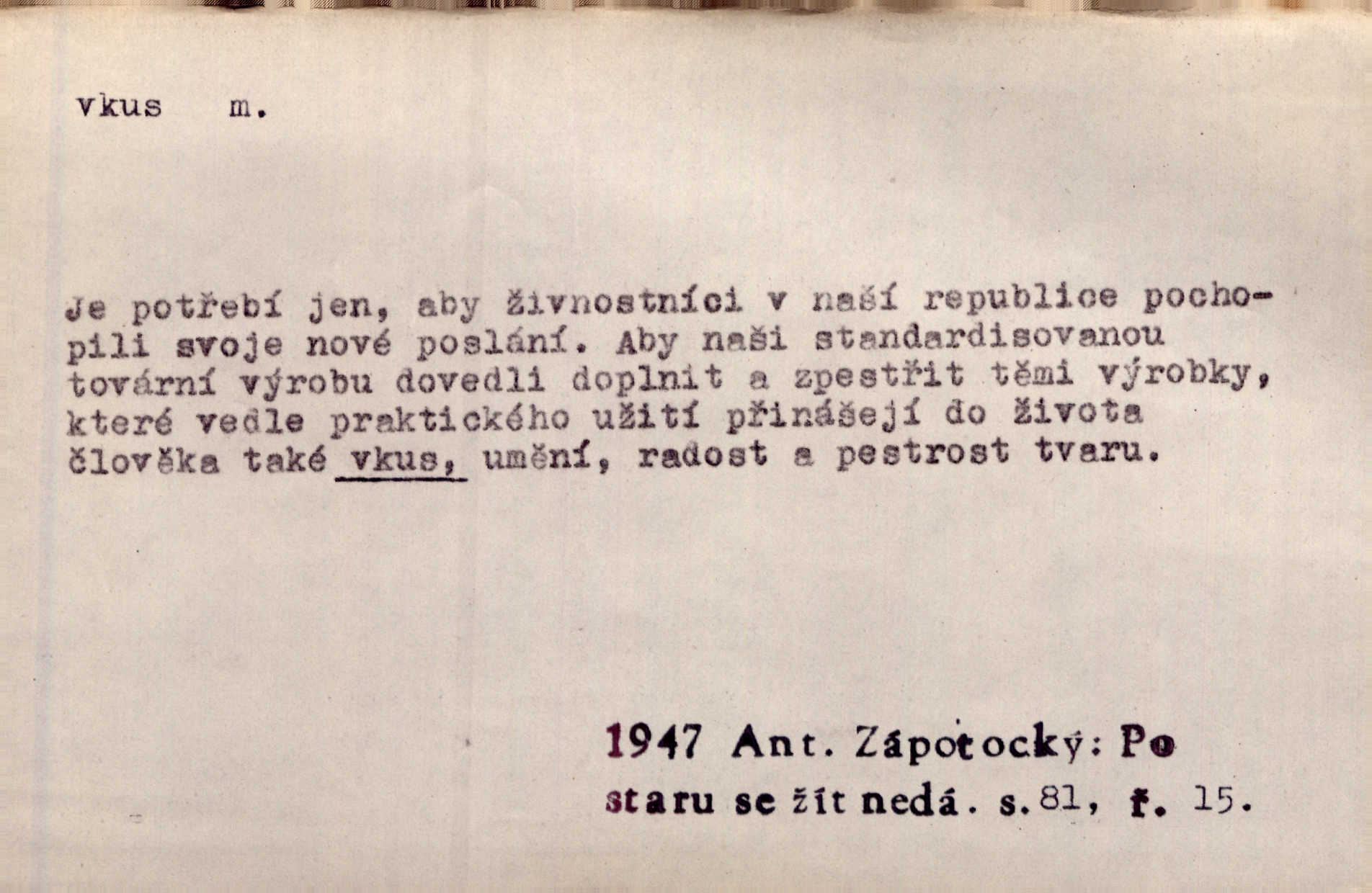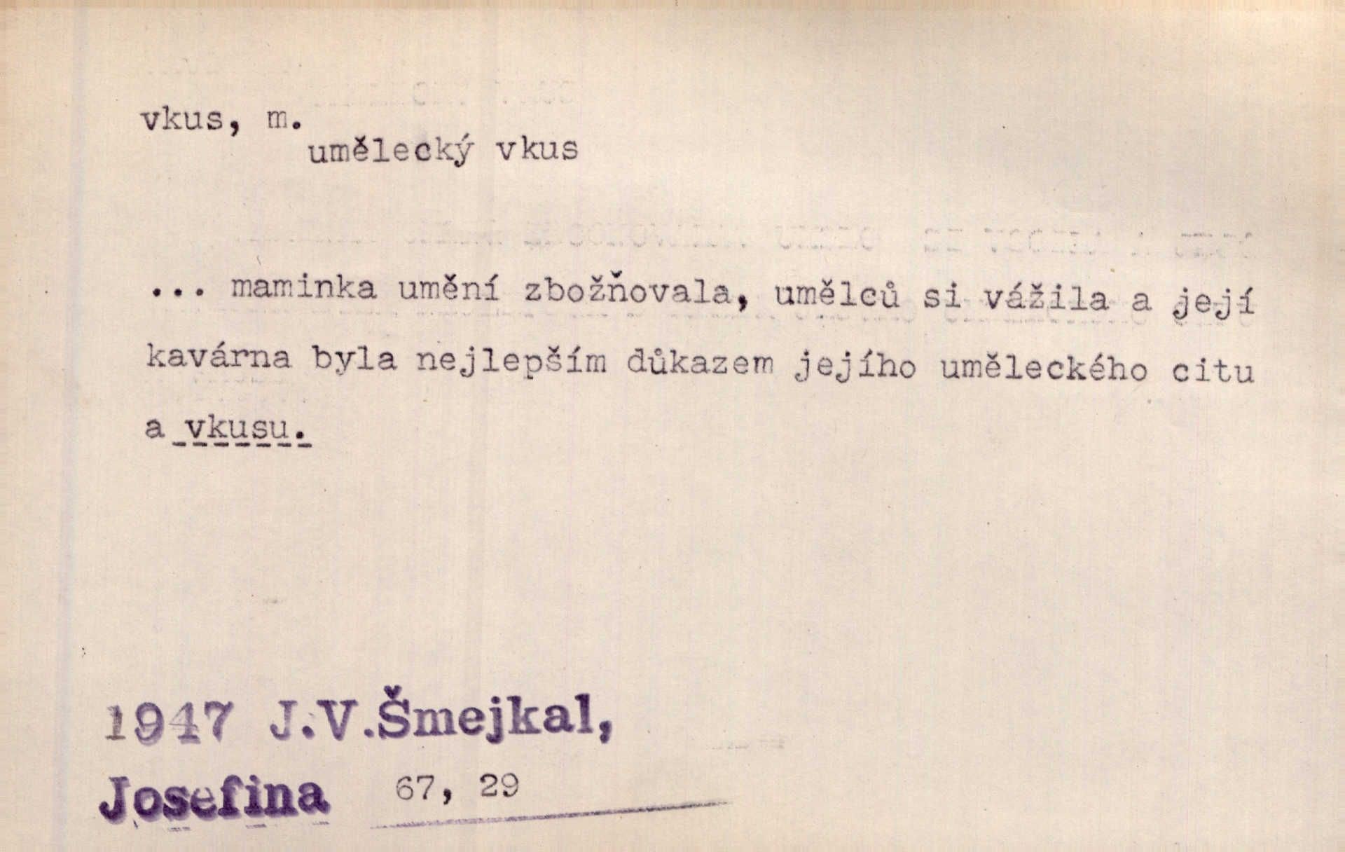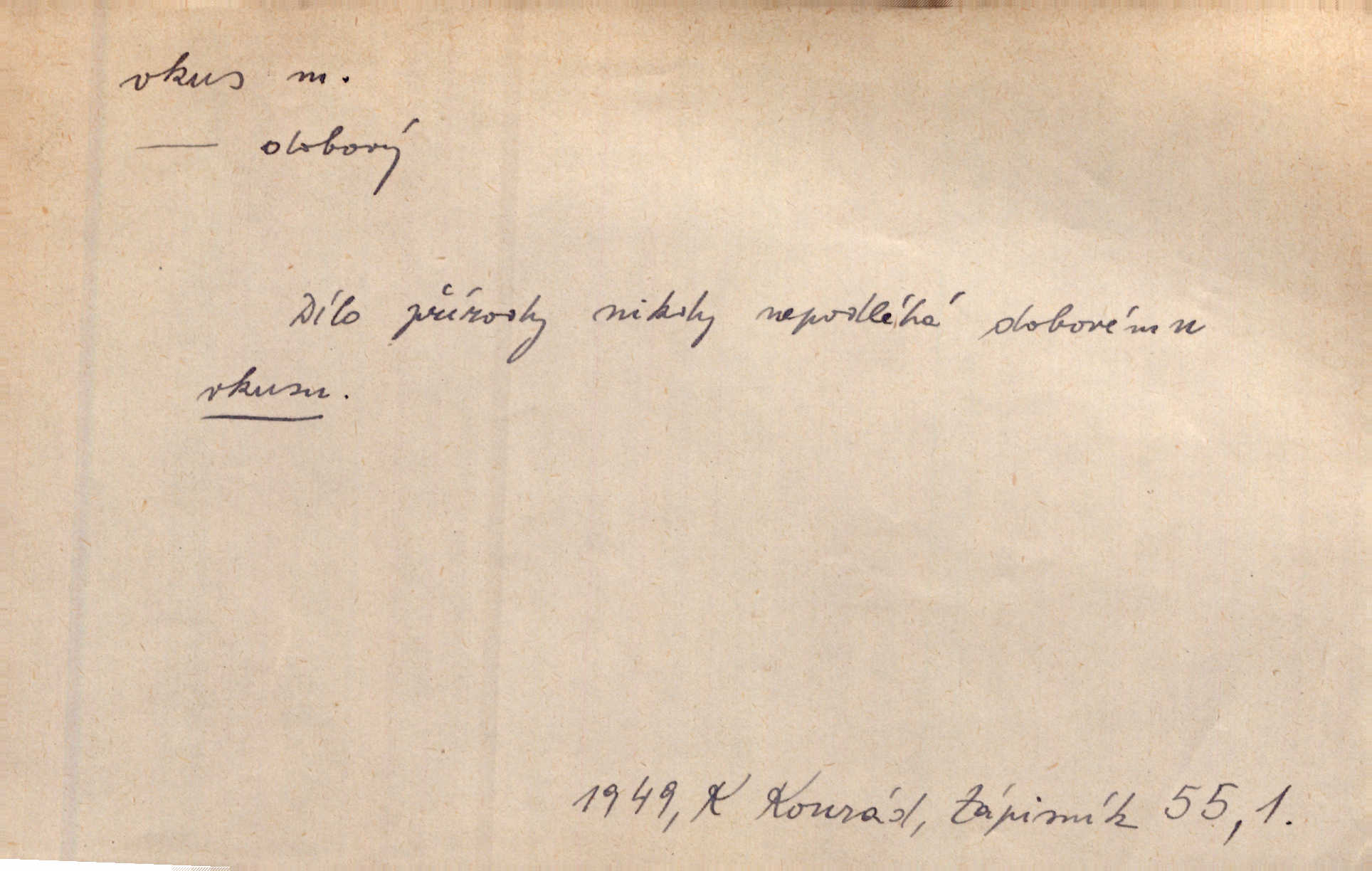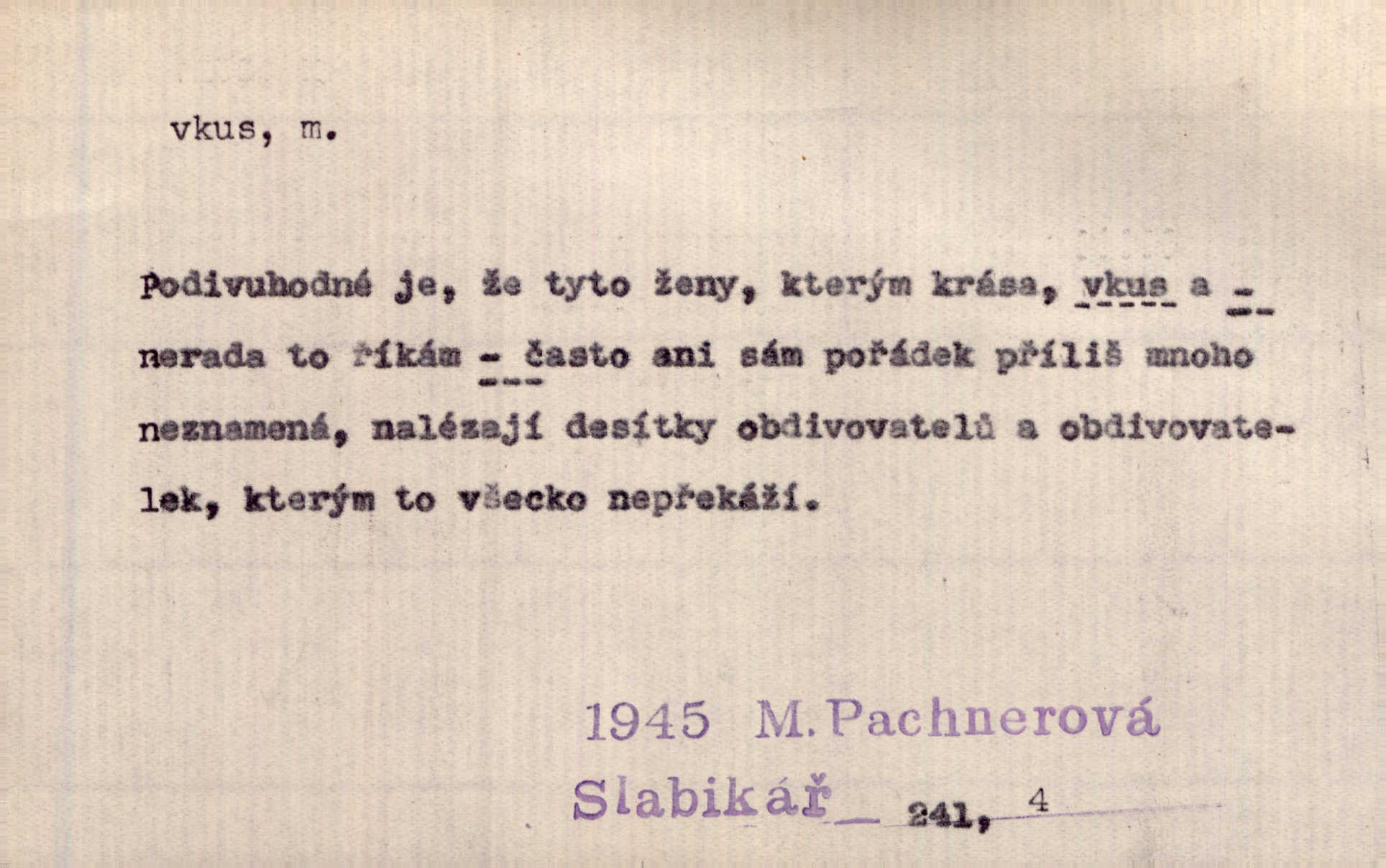 - vkus, -u m. osobní schopnost cítiti a rozeznávati krásu, posuzovati přednosti a chyby s hlediska estetického. Pravda, že nemají venkovští dělníci toho vybroušeného vkusu, té umělosti. Něm. [Malířův] dobrý vkus byl obecně znám. Herrm. Když se jednou vdám, vyberu si ženicha dle svého vkusu. Preis. [Byla hrda] na svůj vkus, jak se i za laciné peníze uměla šatiti. Herrm. To byly náhledy a slova dle Štěpánova vkusu vyhovující mu. Svět. Filos. schopnost estetického posuzování. D soubor dobových, místních a j. měřítek pro výběr po stránce estetické. [Dějiny umění] nejpádněji ukazují, že tak zv. vkus, podle něhož přisuzujeme věcem hodnotu krásna, jest velmi rozmanitý a proměnlivý. Z. Nej. [Stůl] a ostatní části nářadí byly již modernější, zrobeny dle toho vkusu, jaký panoval na konec republiky. Jir. [Za hájem objevil se] pravidelný obdélný zámek ve vkusu císařství. R. Svob. Proposice k čistě uměleckému a k tomu domácímu vkusu položili Mánes, Aleš, Chittusi, Myslbek, Jenewein, Schwaigr. V. Mrš. Dílo přírody nikdy nepodléhá dobovému vkusu. K. Konr. Nábytek vídeňského vkusu plnil jeho pokoje. Staš. Zast. Pavillony v italianském, čínském, francouzském i Bůh ví jakém ještě vkusu stavěné slohu, stylu. Něm. [Schody se rozbíhají] vroubeny jsouce promalovaným kamenným zábradlím v barokovém vkusu. Čech. [Vazba] jest přísně provedena buďto v byzantinském, maurském nebo gothickém, italském nebo francouzském vkusu. Ner. Filos., est. soubor ustálených hledisek, na základě nichž něco posuzujeme, obyč. po stránce estetické, vládnoucí kánon estetických norem.