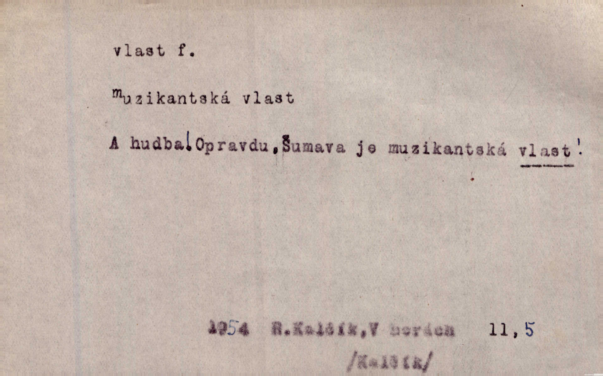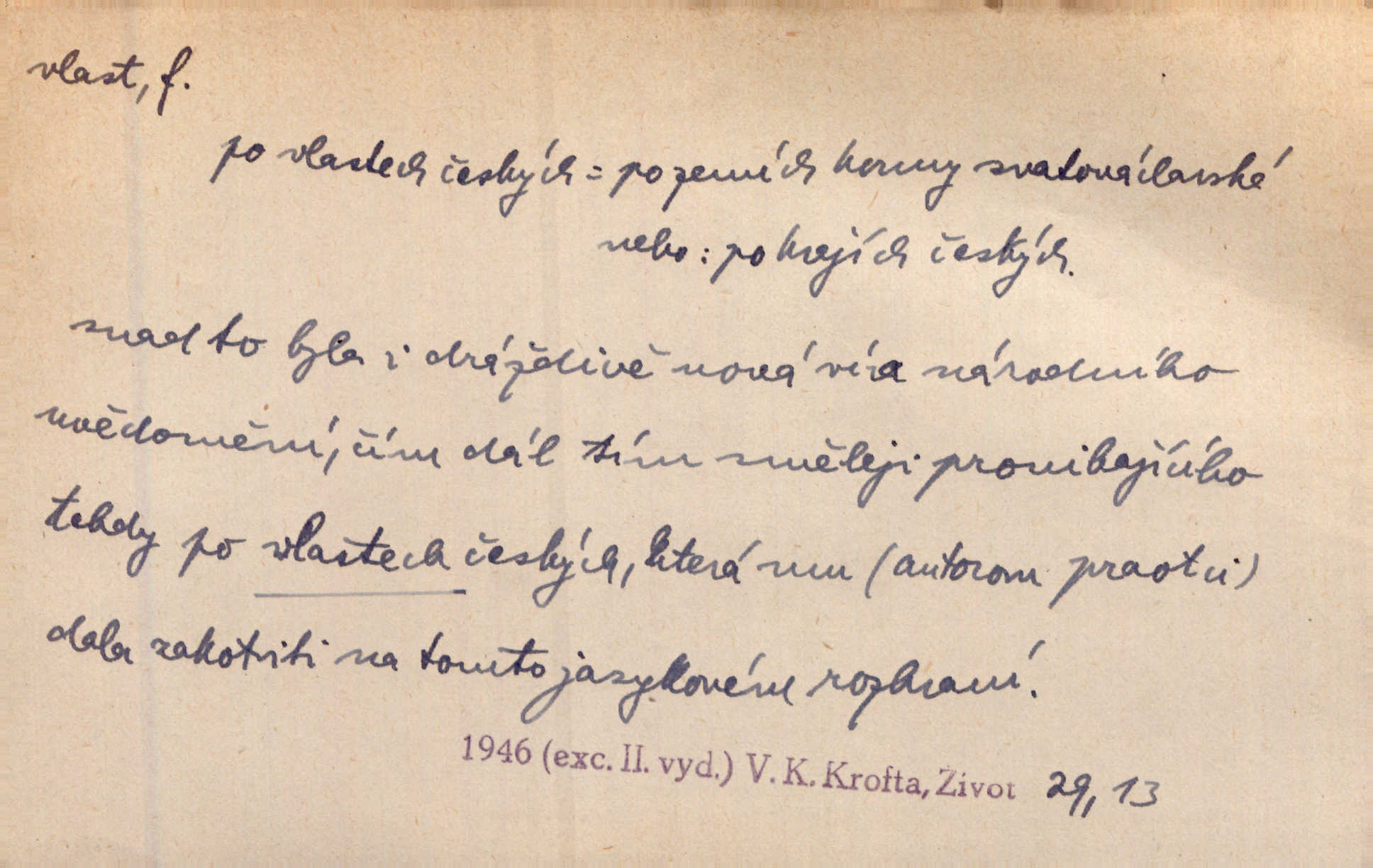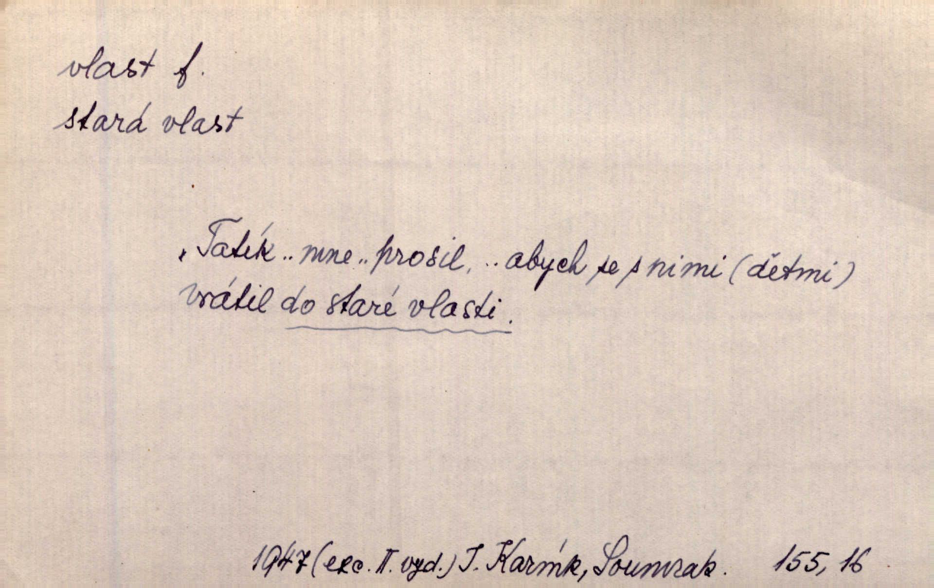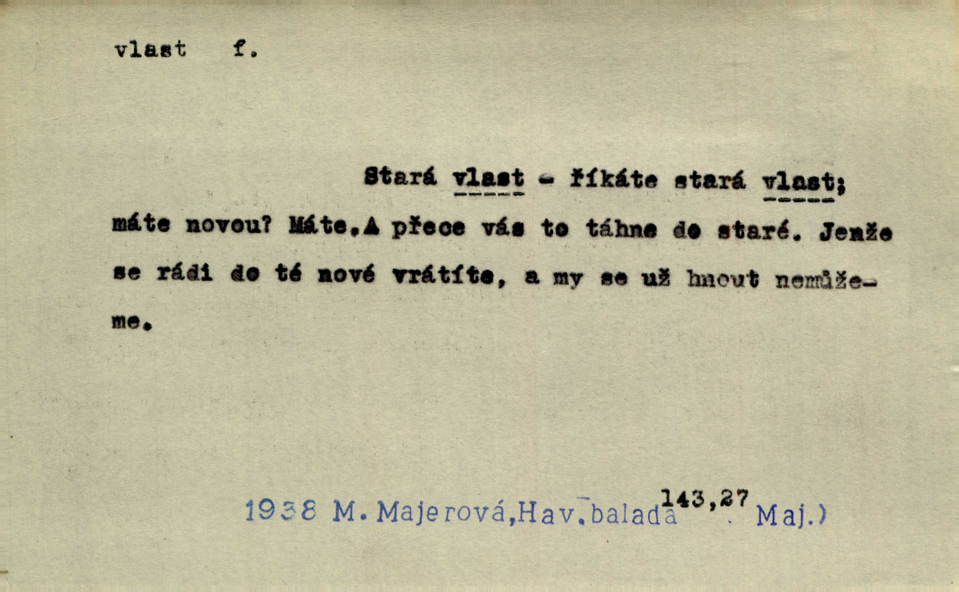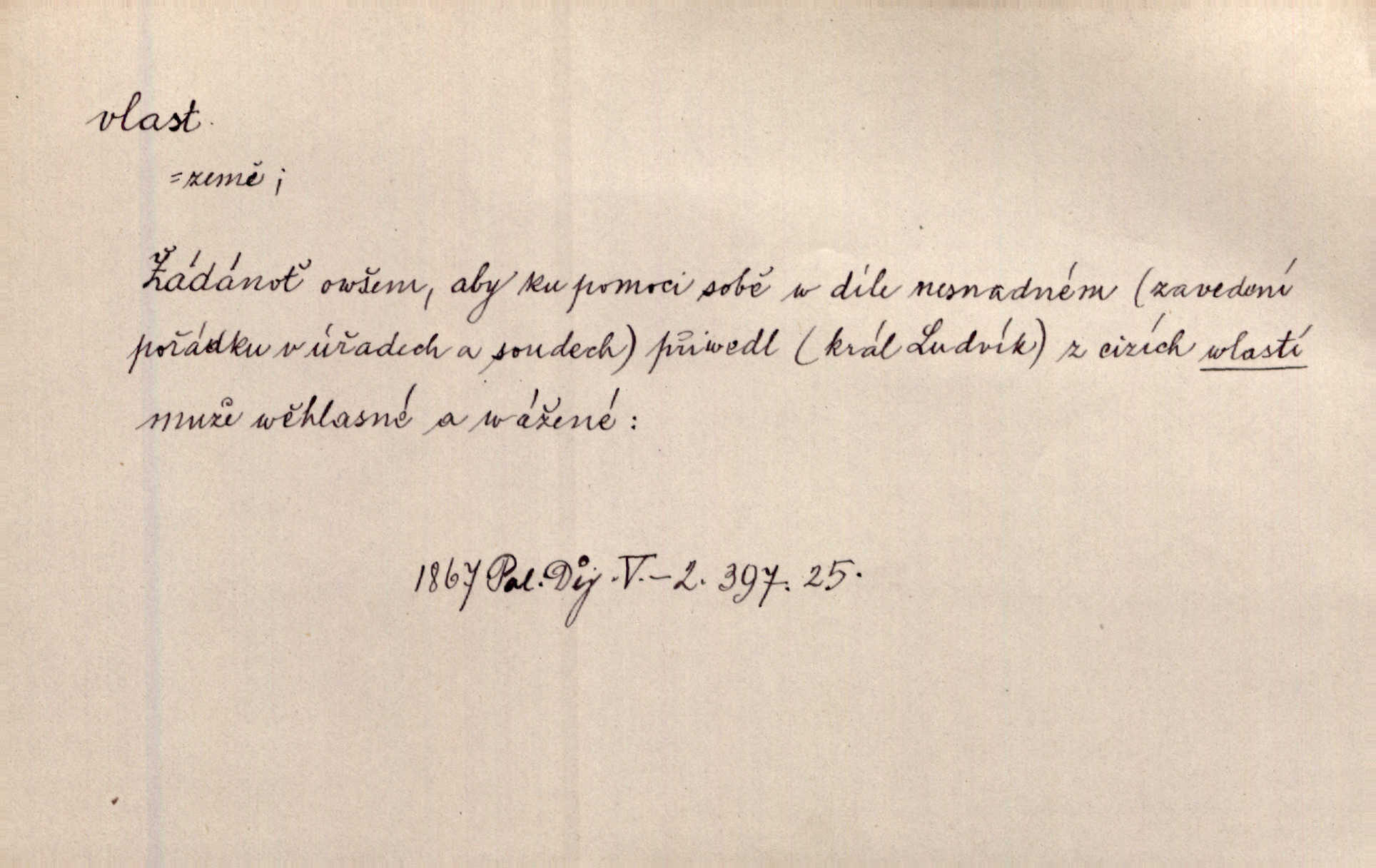 - vlast, -i f. rodná země, otčina. Vlasti své je Čech vřele oddán. Jir. Kdo to byl, kdo tehdy na prvním místě zvedl svůj hlas a volal k obraně vlasti. Z. Nej. Jak by se mohla [mládež] dívat na budování socialistické vlasti s rukama založenýma. Knih. úder. [Drahomíra ke sboru kněží:] Vy jediní jste zbyli z průvodu, jenž vyšel se mnou z drahé vlasti mé. Vrch. Na širší naši vlast, na Rakousko, připomíná velký nadpis „vyslanectví rakouské“. Ner. Po slavném panování krále Karla, Otce vlasti. Ehrenb. Paže tuž, vlasti služ. Kam. Tatík mne prosil, abych se s nimi vrátil do staré vlasti. Karník. Kollára si netroufám jmenovati, — totě básník z doby vlasti — slasti z doby, kdy se vlastenčilo. Kos. D místo narození n. pobytu, domov. Když i někdy Habrůvce pohrozil, že ji opustí a půjde sobě hledat jinou vlast — nikdo mu nevěřil. A. Mrš. „Z Čech?“ „Přímo z vlasti Václavů.“ Čech. Mnou [branou] vchází se do zatracenců vlasti do pekla. Vrch. Tu [ve skále] měly vlast svou sovy rozličné. Klác. D Poněk. zast. krajina, země. O hradě tom [Karlštejně] šly po všech vlastech pověsti až báječné. Třeb. Rozloučiv se odešel arcibiskup z vlasti moravské. Vanč. Sta a sta telegramů a přípisů [k oslavám Palackého] došlo netoliko z vlastí českých, ale i ze všech ostatních zemí slovanských. Kal. Nestydatěji, surověji se tehdy roztáhl nenáviděný cizák po českých vlastech. Gottw. I přivede na tě Pán lidi z daleké vlasti. Jir. Prochodil huslař celý svět, vlasti i daleké země domácí kraje. Heyd. [Rezinka] četla hlasem tlumeným: „Rozpomeň se, matko dobrotivá, v nebeské vlasti na dítky své v tomto slzavém údolí.“ v nebi. Jir. Těšil se, až se lepší jeho částka povznese do lepší vlasti, kde kraluje světlo nejjasnější. Svět. Duch [starcův] po vlasti nad hvězdami práhne. J. z Hv. D místo, odkud něco pochází, kde se něco hromadně vyskytuje, vyrábí a pod. Chtěl jsem poznat vlast vítězného proletariátu na vlastní oči. R. právo. Švýcary jsou vlastí výborných sýrů. Svob. nov. Roztoužil se po dalekých krajinách, po vlastech hraček javanských. R. Svob. V naší církvi vyšlo pronásledování z vlasti inkvisice, ze Španěl. Ner.