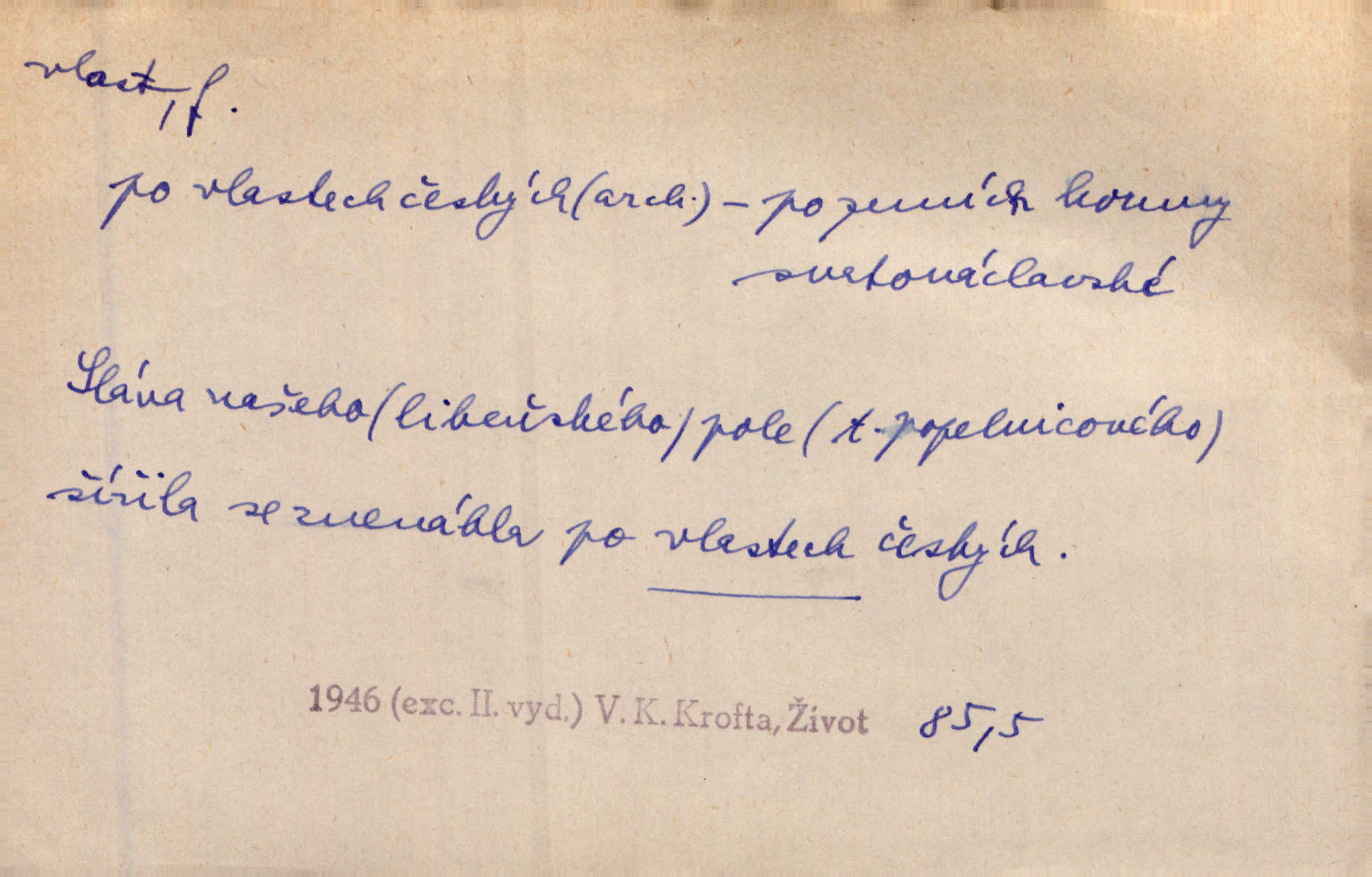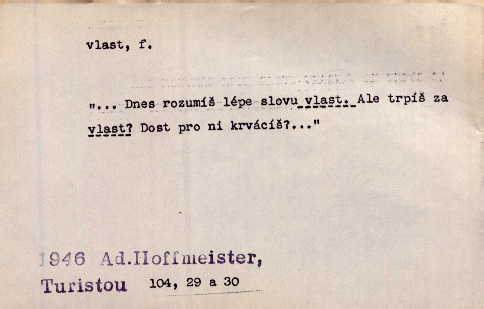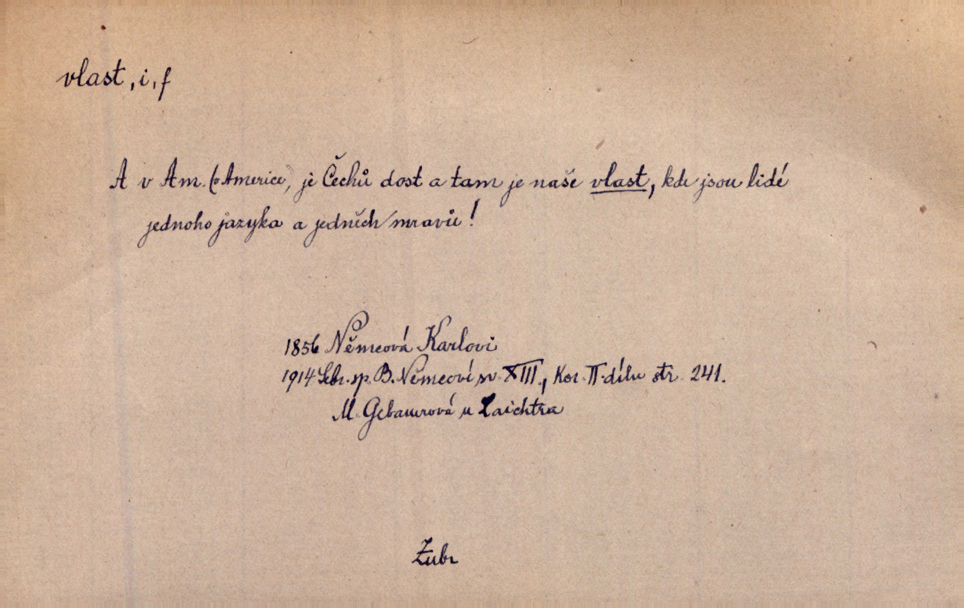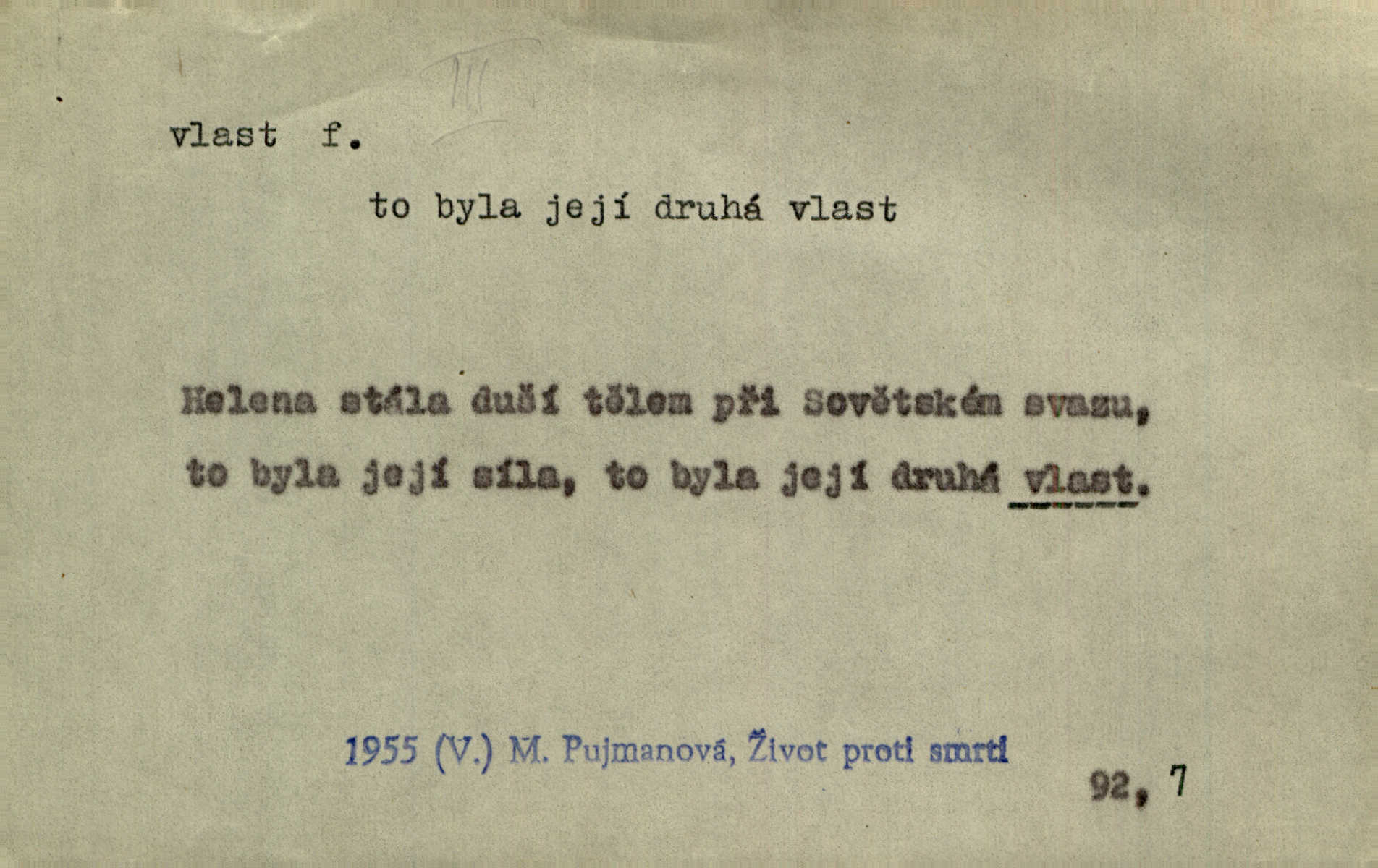 - vlast, -i f. rodná země, otčina. Vlasti své je Čech vřele oddán. Jir. Kdo to byl, kdo tehdy na prvním místě zvedl svůj hlas a volal k obraně vlasti. Z. Nej. Jak by se mohla [mládež] dívat na budování socialistické vlasti s rukama založenýma. Knih. úder. [Drahomíra ke sboru kněží:] Vy jediní jste zbyli z průvodu, jenž vyšel se mnou z drahé vlasti mé. Vrch. Na širší naši vlast, na Rakousko, připomíná velký nadpis „vyslanectví rakouské“. Ner. Po slavném panování krále Karla, Otce vlasti. Ehrenb. Paže tuž, vlasti služ. Kam. Tatík mne prosil, abych se s nimi vrátil do staré vlasti. Karník. Kollára si netroufám jmenovati, — totě básník z doby vlasti — slasti z doby, kdy se vlastenčilo. Kos. D místo narození n. pobytu, domov. Když i někdy Habrůvce pohrozil, že ji opustí a půjde sobě hledat jinou vlast — nikdo mu nevěřil. A. Mrš. „Z Čech?“ „Přímo z vlasti Václavů.“ Čech. Mnou [branou] vchází se do zatracenců vlasti do pekla. Vrch. Tu [ve skále] měly vlast svou sovy rozličné. Klác. D Poněk. zast. krajina, země. O hradě tom [Karlštejně] šly po všech vlastech pověsti až báječné. Třeb. Rozloučiv se odešel arcibiskup z vlasti moravské. Vanč. Sta a sta telegramů a přípisů [k oslavám Palackého] došlo netoliko z vlastí českých, ale i ze všech ostatních zemí slovanských. Kal. Nestydatěji, surověji se tehdy roztáhl nenáviděný cizák po českých vlastech. Gottw. I přivede na tě Pán lidi z daleké vlasti. Jir. Prochodil huslař celý svět, vlasti i daleké země domácí kraje. Heyd. [Rezinka] četla hlasem tlumeným: „Rozpomeň se, matko dobrotivá, v nebeské vlasti na dítky své v tomto slzavém údolí.“ v nebi. Jir. Těšil se, až se lepší jeho částka povznese do lepší vlasti, kde kraluje světlo nejjasnější. Svět. Duch [starcův] po vlasti nad hvězdami práhne. J. z Hv. D místo, odkud něco pochází, kde se něco hromadně vyskytuje, vyrábí a pod. Chtěl jsem poznat vlast vítězného proletariátu na vlastní oči. R. právo. Švýcary jsou vlastí výborných sýrů. Svob. nov. Roztoužil se po dalekých krajinách, po vlastech hraček javanských. R. Svob. V naší církvi vyšlo pronásledování z vlasti inkvisice, ze Španěl. Ner.