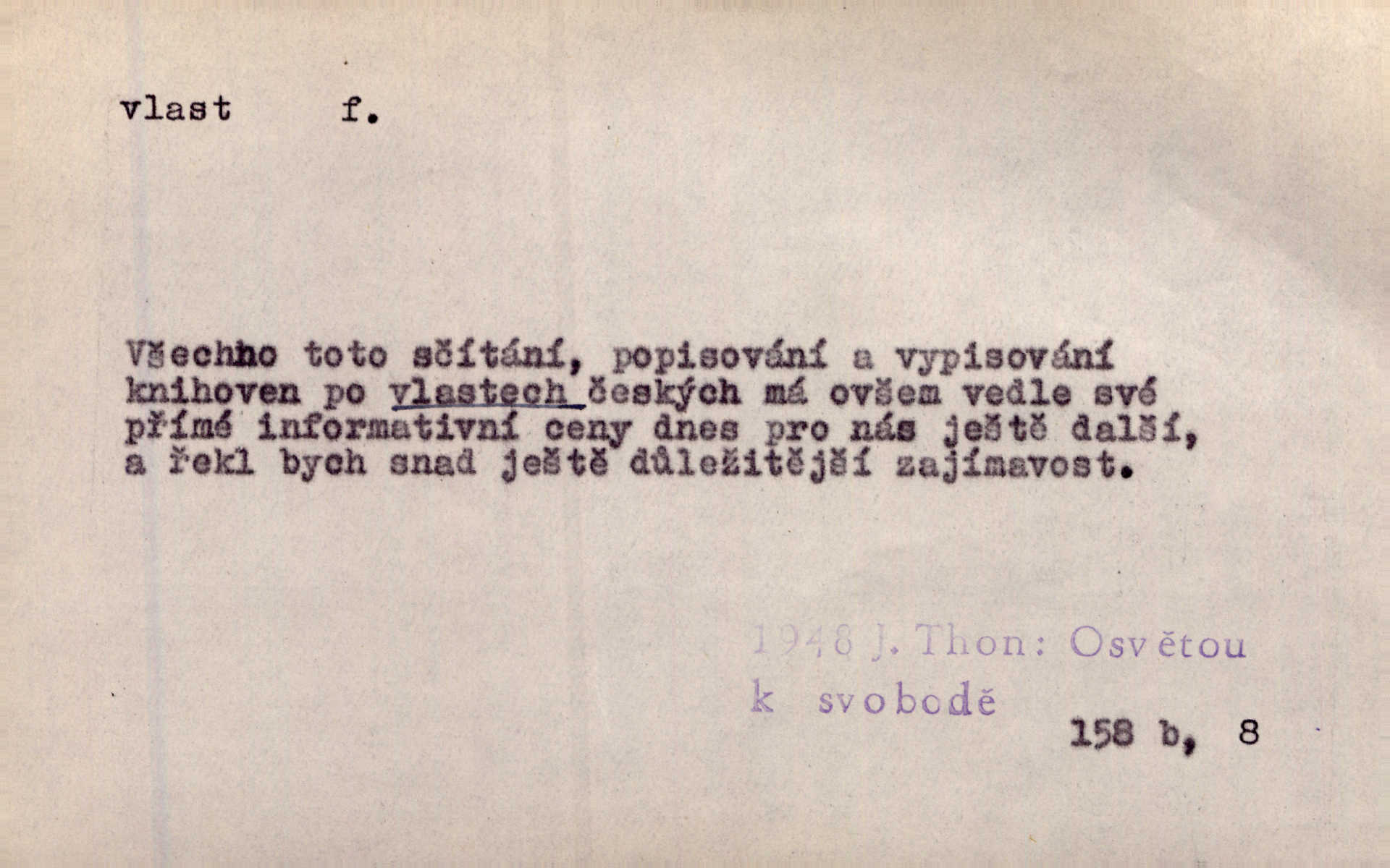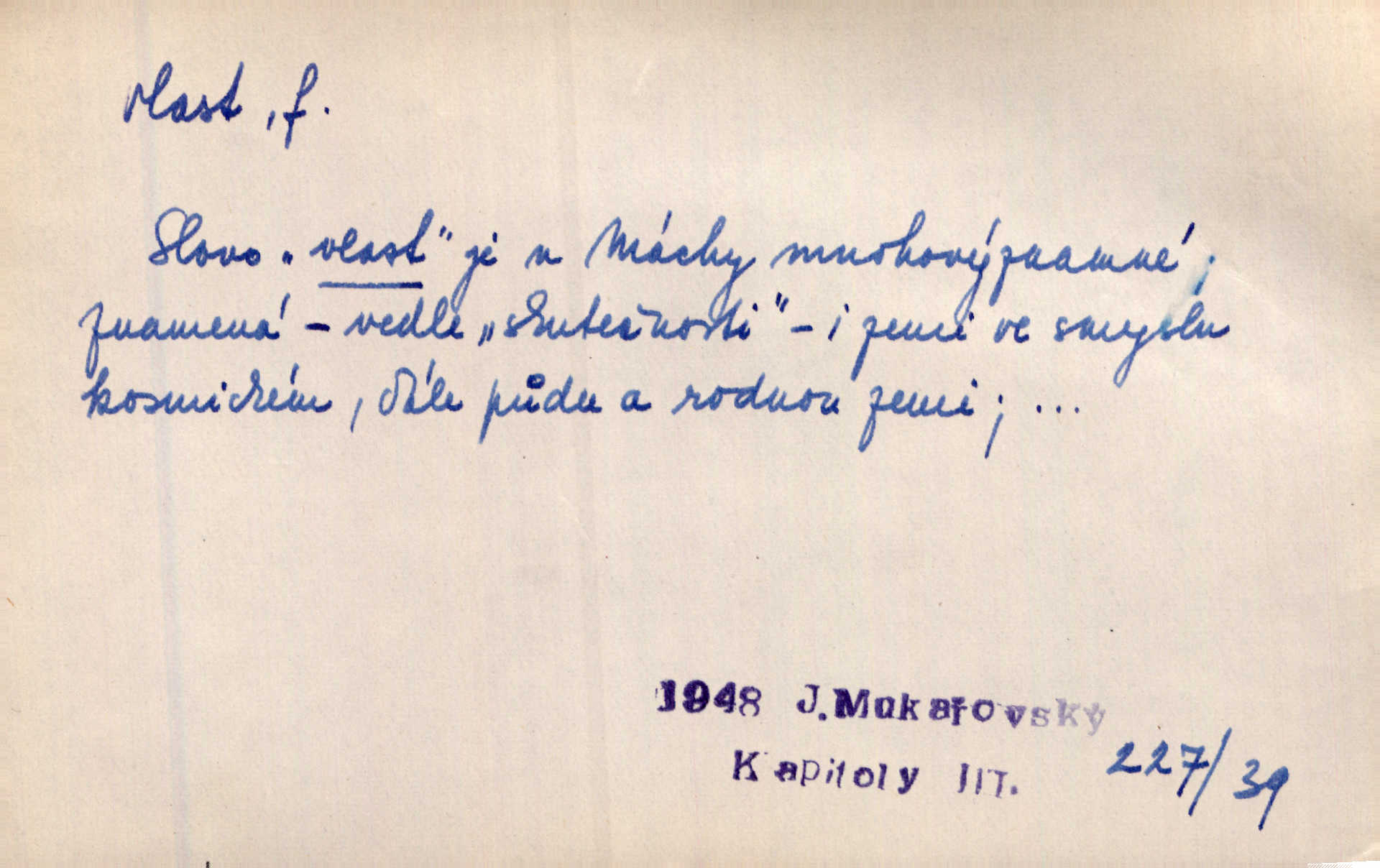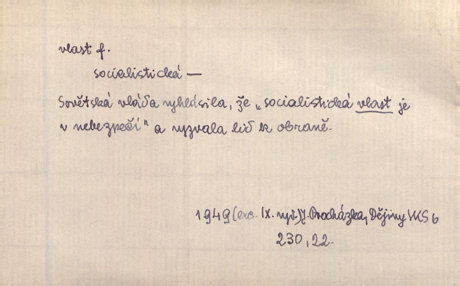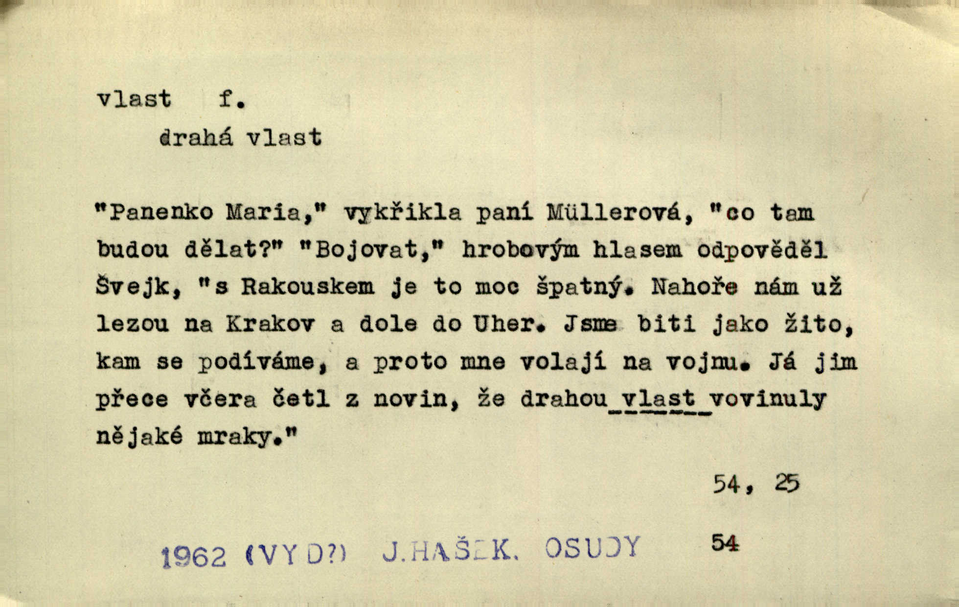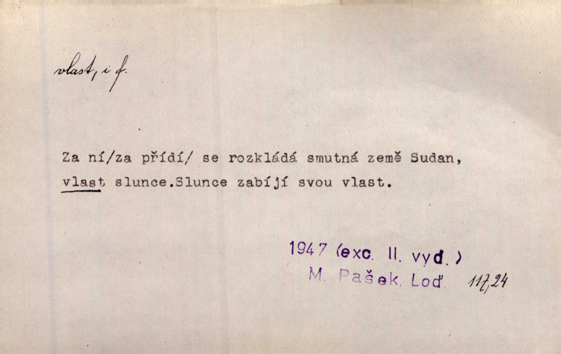 - vlast, -i f. rodná země, otčina. Vlasti své je Čech vřele oddán. Jir. Kdo to byl, kdo tehdy na prvním místě zvedl svůj hlas a volal k obraně vlasti. Z. Nej. Jak by se mohla [mládež] dívat na budování socialistické vlasti s rukama založenýma. Knih. úder. [Drahomíra ke sboru kněží:] Vy jediní jste zbyli z průvodu, jenž vyšel se mnou z drahé vlasti mé. Vrch. Na širší naši vlast, na Rakousko, připomíná velký nadpis „vyslanectví rakouské“. Ner. Po slavném panování krále Karla, Otce vlasti. Ehrenb. Paže tuž, vlasti služ. Kam. Tatík mne prosil, abych se s nimi vrátil do staré vlasti. Karník. Kollára si netroufám jmenovati, — totě básník z doby vlasti — slasti z doby, kdy se vlastenčilo. Kos. D místo narození n. pobytu, domov. Když i někdy Habrůvce pohrozil, že ji opustí a půjde sobě hledat jinou vlast — nikdo mu nevěřil. A. Mrš. „Z Čech?“ „Přímo z vlasti Václavů.“ Čech. Mnou [branou] vchází se do zatracenců vlasti do pekla. Vrch. Tu [ve skále] měly vlast svou sovy rozličné. Klác. D Poněk. zast. krajina, země. O hradě tom [Karlštejně] šly po všech vlastech pověsti až báječné. Třeb. Rozloučiv se odešel arcibiskup z vlasti moravské. Vanč. Sta a sta telegramů a přípisů [k oslavám Palackého] došlo netoliko z vlastí českých, ale i ze všech ostatních zemí slovanských. Kal. Nestydatěji, surověji se tehdy roztáhl nenáviděný cizák po českých vlastech. Gottw. I přivede na tě Pán lidi z daleké vlasti. Jir. Prochodil huslař celý svět, vlasti i daleké země domácí kraje. Heyd. [Rezinka] četla hlasem tlumeným: „Rozpomeň se, matko dobrotivá, v nebeské vlasti na dítky své v tomto slzavém údolí.“ v nebi. Jir. Těšil se, až se lepší jeho částka povznese do lepší vlasti, kde kraluje světlo nejjasnější. Svět. Duch [starcův] po vlasti nad hvězdami práhne. J. z Hv. D místo, odkud něco pochází, kde se něco hromadně vyskytuje, vyrábí a pod. Chtěl jsem poznat vlast vítězného proletariátu na vlastní oči. R. právo. Švýcary jsou vlastí výborných sýrů. Svob. nov. Roztoužil se po dalekých krajinách, po vlastech hraček javanských. R. Svob. V naší církvi vyšlo pronásledování z vlasti inkvisice, ze Španěl. Ner.