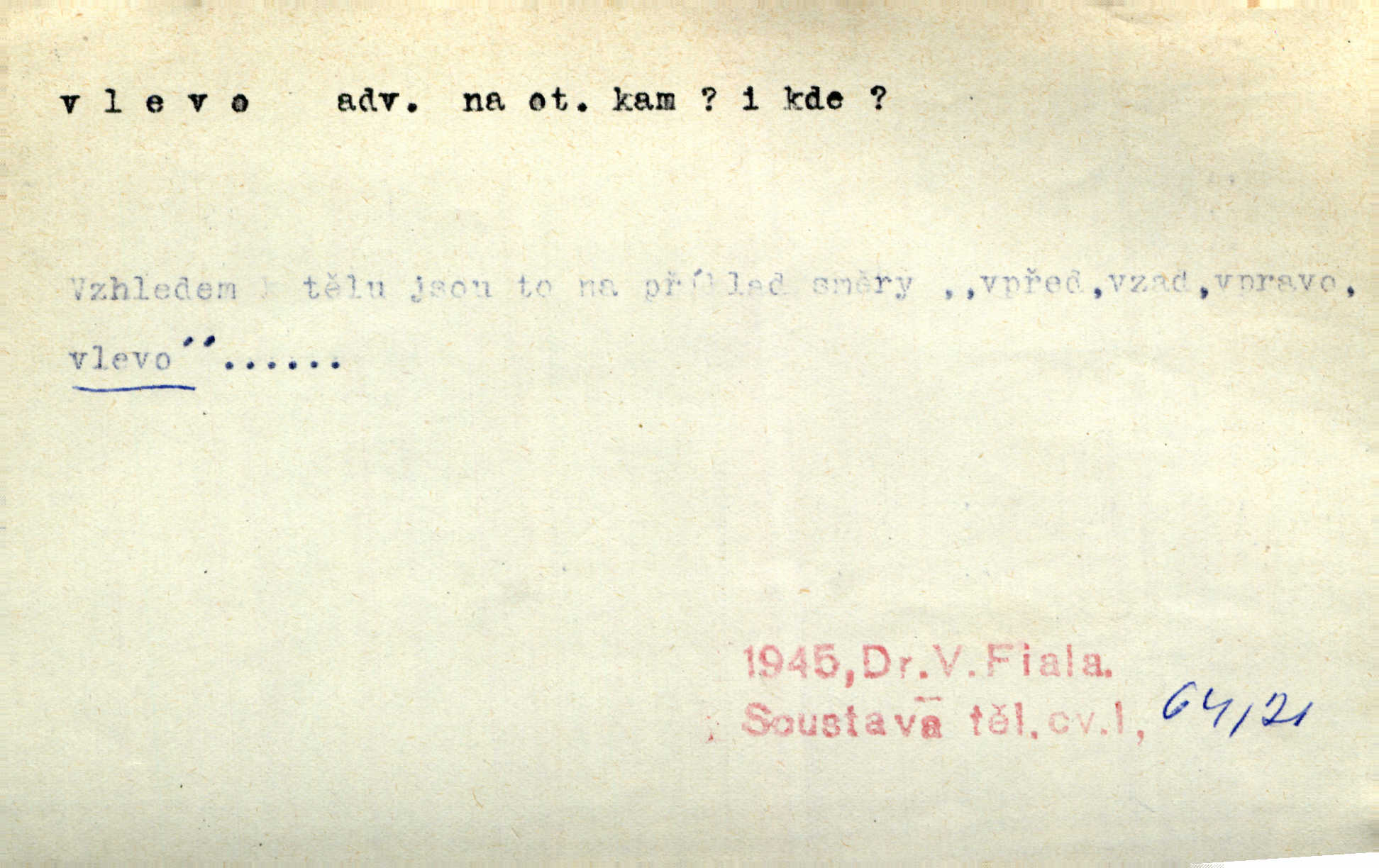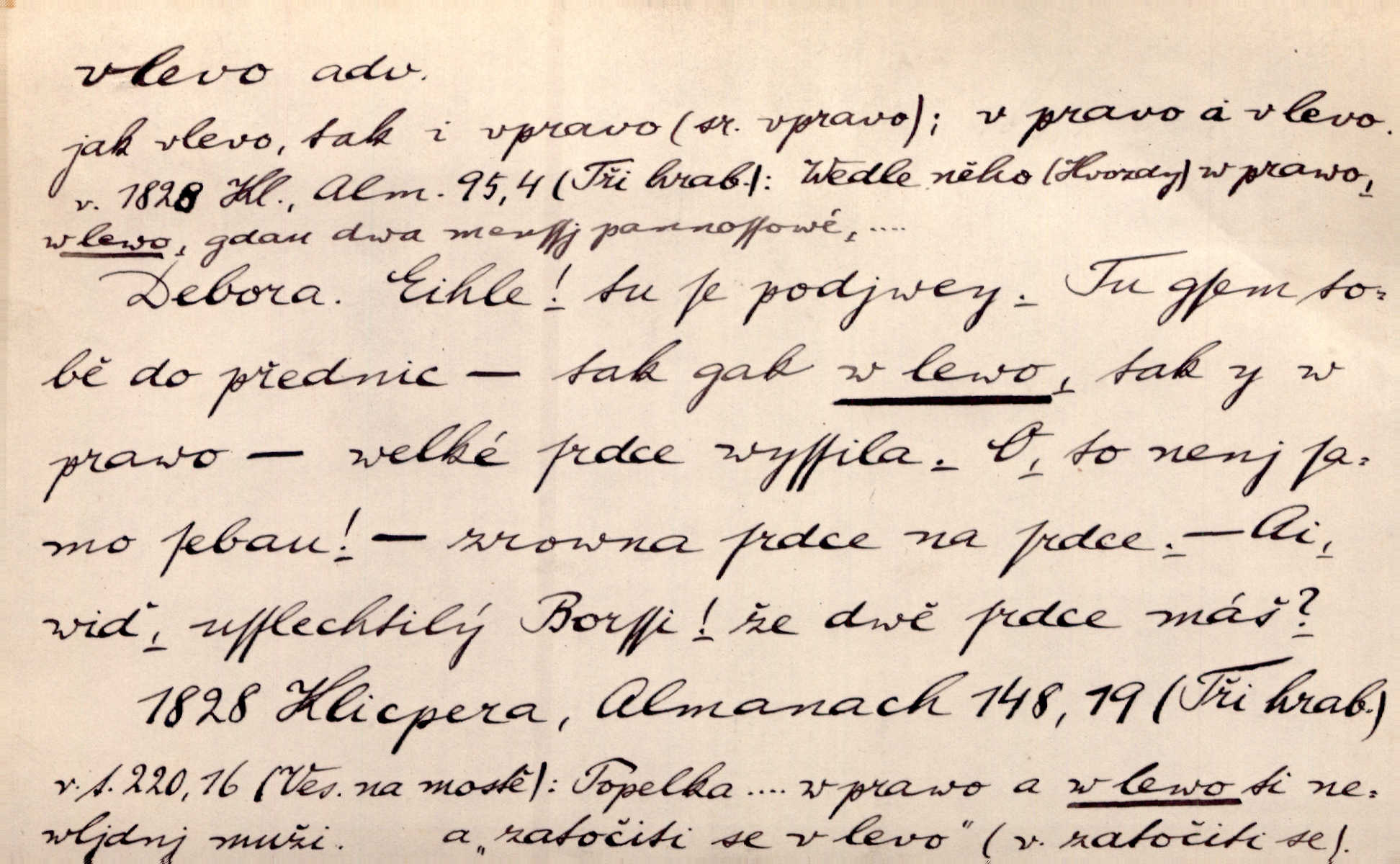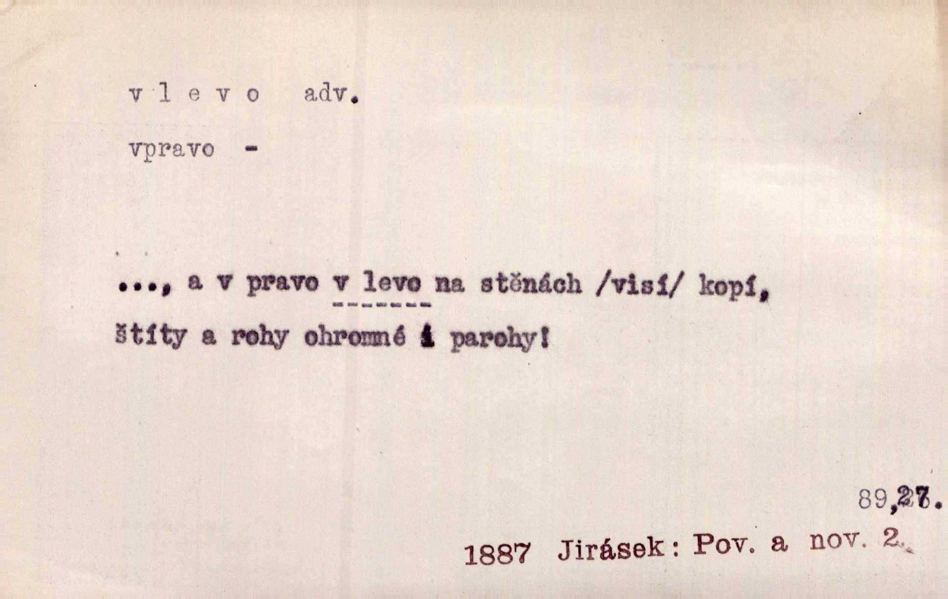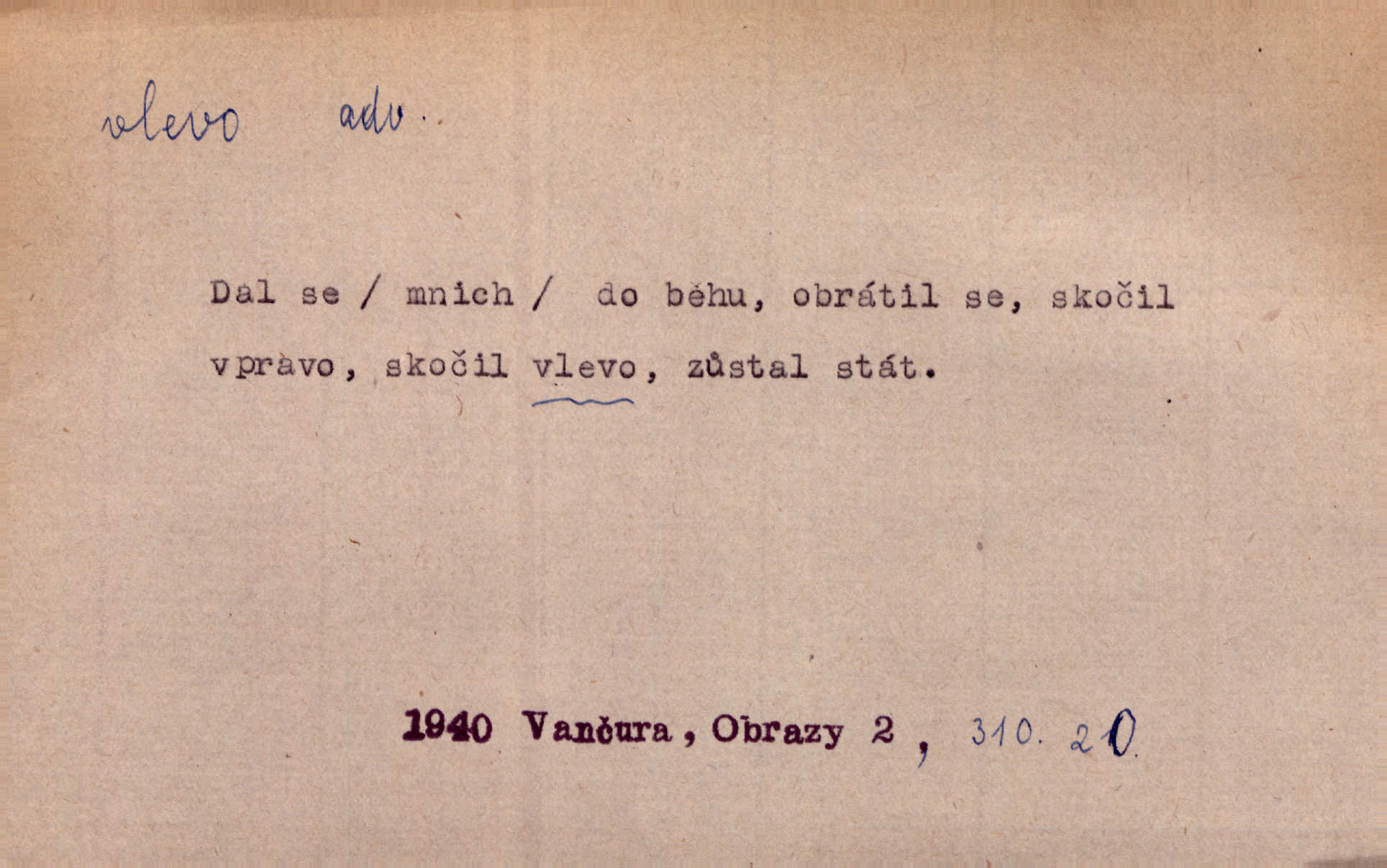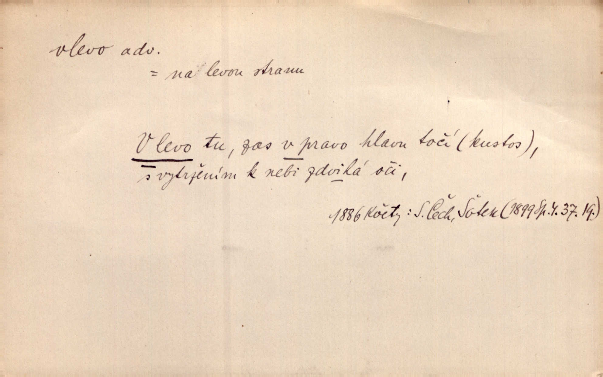 - vlevo adv. ve směru levé ruky, na levé straně, na levou stranu. Zahněme vlevo! John. Nechali [jsme] vlevo prostorný zámek se dvěma křídly. John. V pravo, v levo od silnice [stály] statky a chalupy. Jir. Chvátali hřbitovní stezkou v levo do města. Rais. I jde v pravo ten a onen v levo. Kal. Tenkráte silně v levo střelil jsi zmýlil ses. Šub. Ondrejkovy zraky těkaly v pravo v levo sem tam. Jir. Zř. Vlevo skály u prostřed olšin a bujných luk je velký dvůr. Svět. Voj. vlevo v bok, vlevo hleď (povel). D směrem k pokroku, k socialismu. Vývoj směřuje vlevo. Lid. nov.