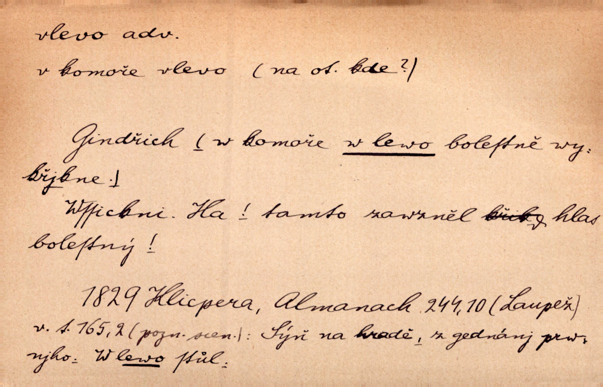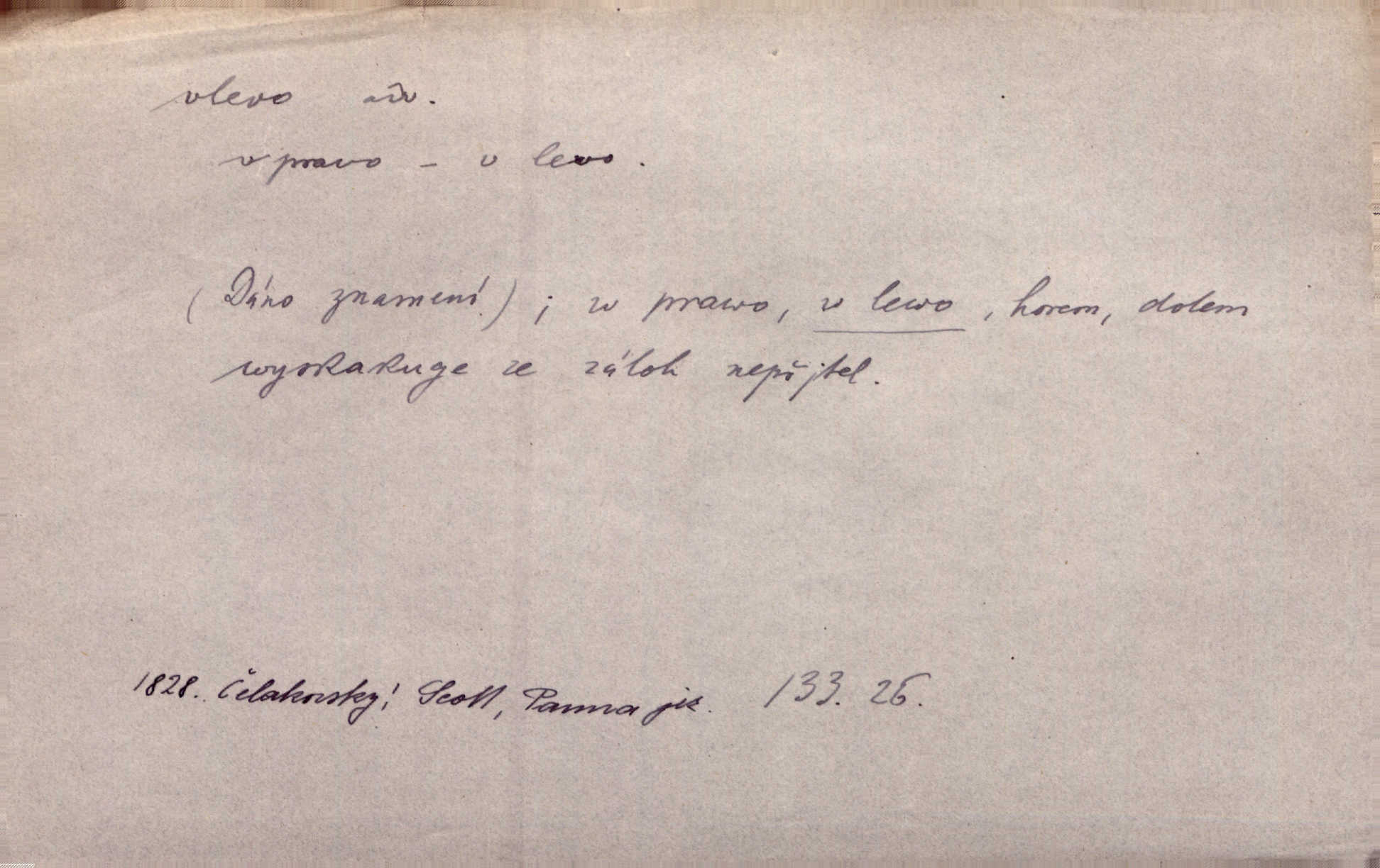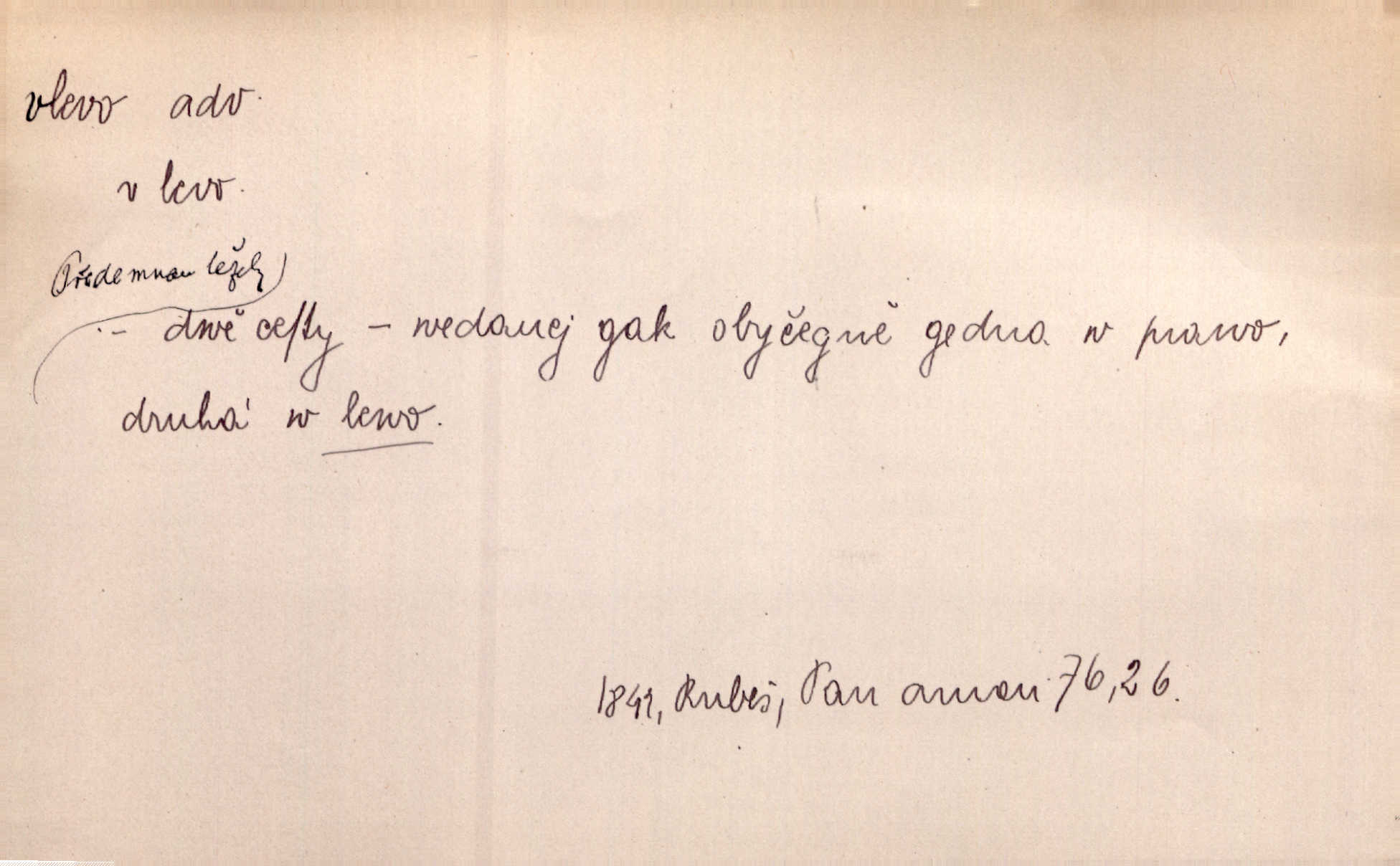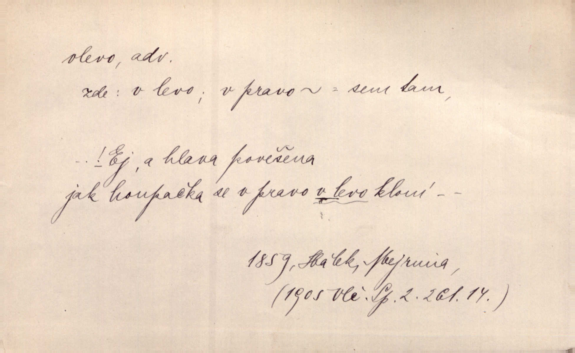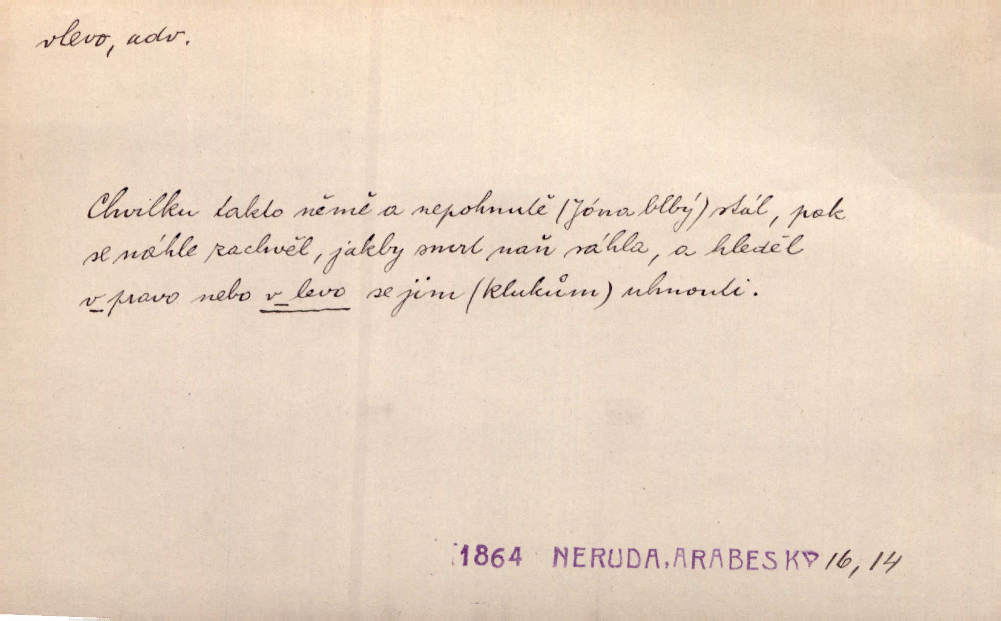 - vlevo adv. ve směru levé ruky, na levé straně, na levou stranu. Zahněme vlevo! John. Nechali [jsme] vlevo prostorný zámek se dvěma křídly. John. V pravo, v levo od silnice [stály] statky a chalupy. Jir. Chvátali hřbitovní stezkou v levo do města. Rais. I jde v pravo ten a onen v levo. Kal. Tenkráte silně v levo střelil jsi zmýlil ses. Šub. Ondrejkovy zraky těkaly v pravo v levo sem tam. Jir. Zř. Vlevo skály u prostřed olšin a bujných luk je velký dvůr. Svět. Voj. vlevo v bok, vlevo hleď (povel). D směrem k pokroku, k socialismu. Vývoj směřuje vlevo. Lid. nov.