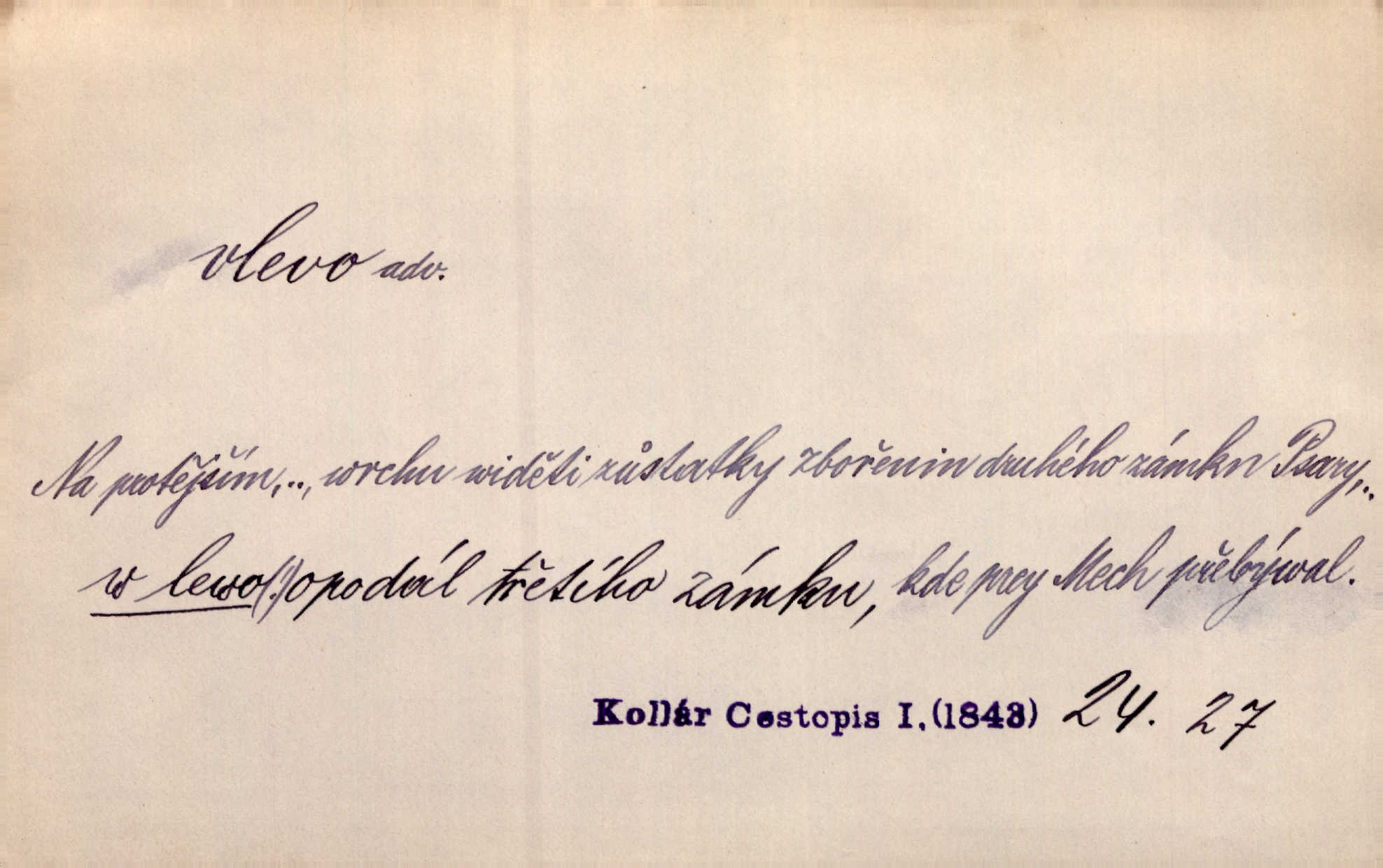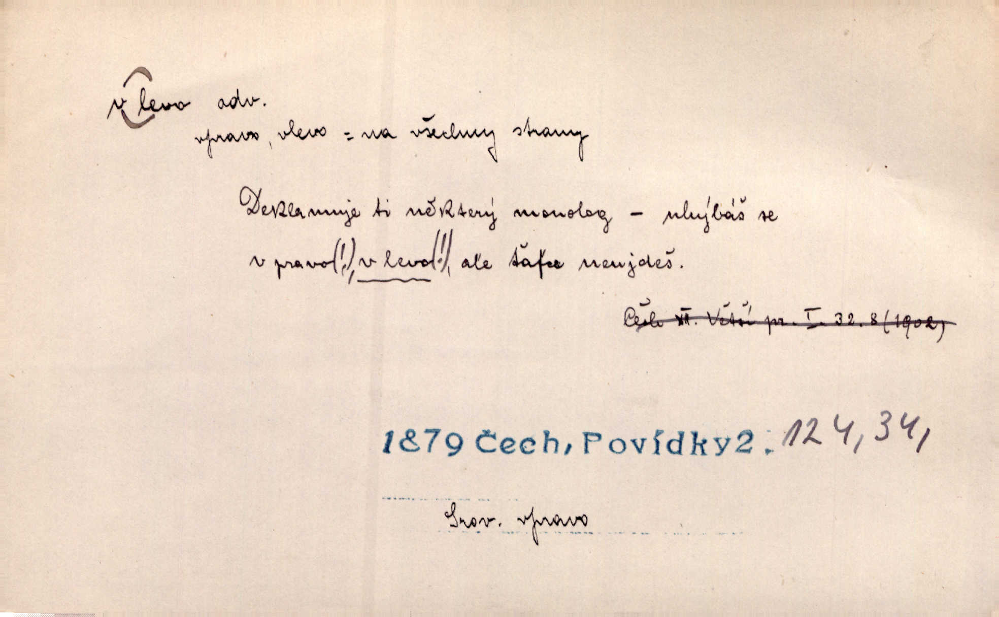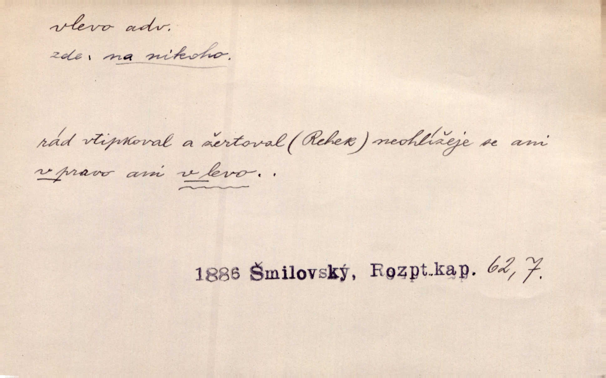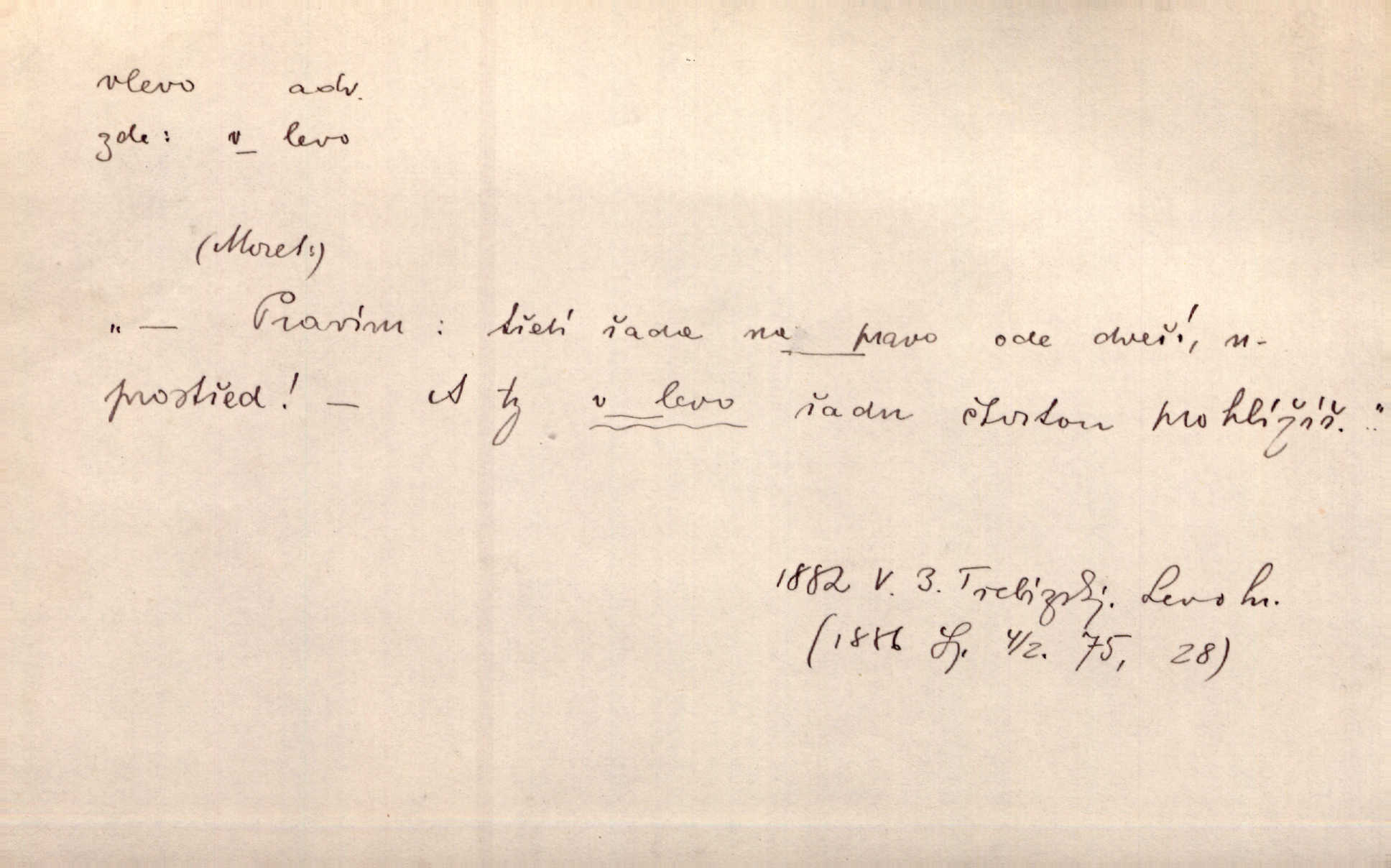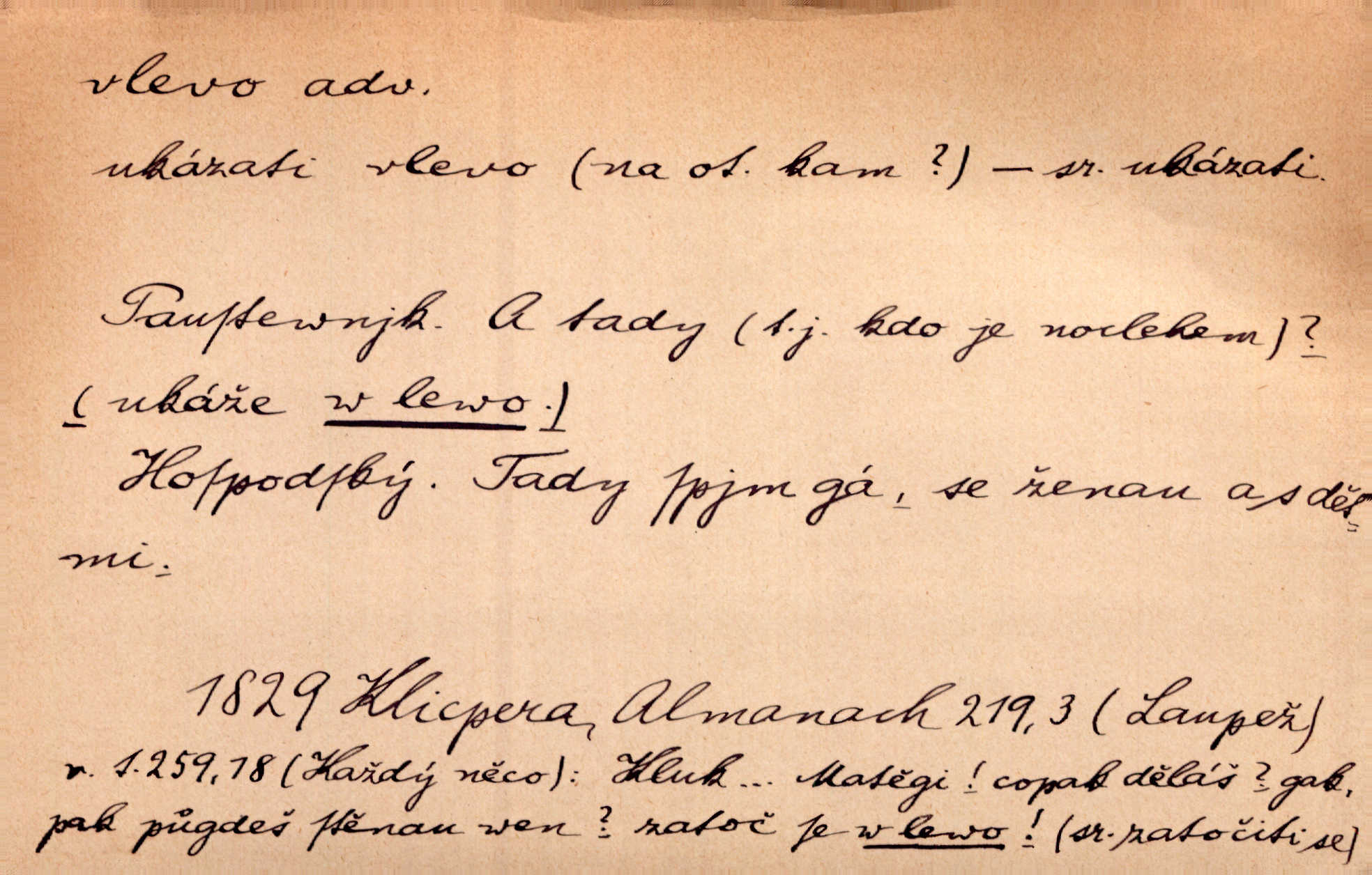 - vlevo adv. ve směru levé ruky, na levé straně, na levou stranu. Zahněme vlevo! John. Nechali [jsme] vlevo prostorný zámek se dvěma křídly. John. V pravo, v levo od silnice [stály] statky a chalupy. Jir. Chvátali hřbitovní stezkou v levo do města. Rais. I jde v pravo ten a onen v levo. Kal. Tenkráte silně v levo střelil jsi zmýlil ses. Šub. Ondrejkovy zraky těkaly v pravo v levo sem tam. Jir. Zř. Vlevo skály u prostřed olšin a bujných luk je velký dvůr. Svět. Voj. vlevo v bok, vlevo hleď (povel). D směrem k pokroku, k socialismu. Vývoj směřuje vlevo. Lid. nov.