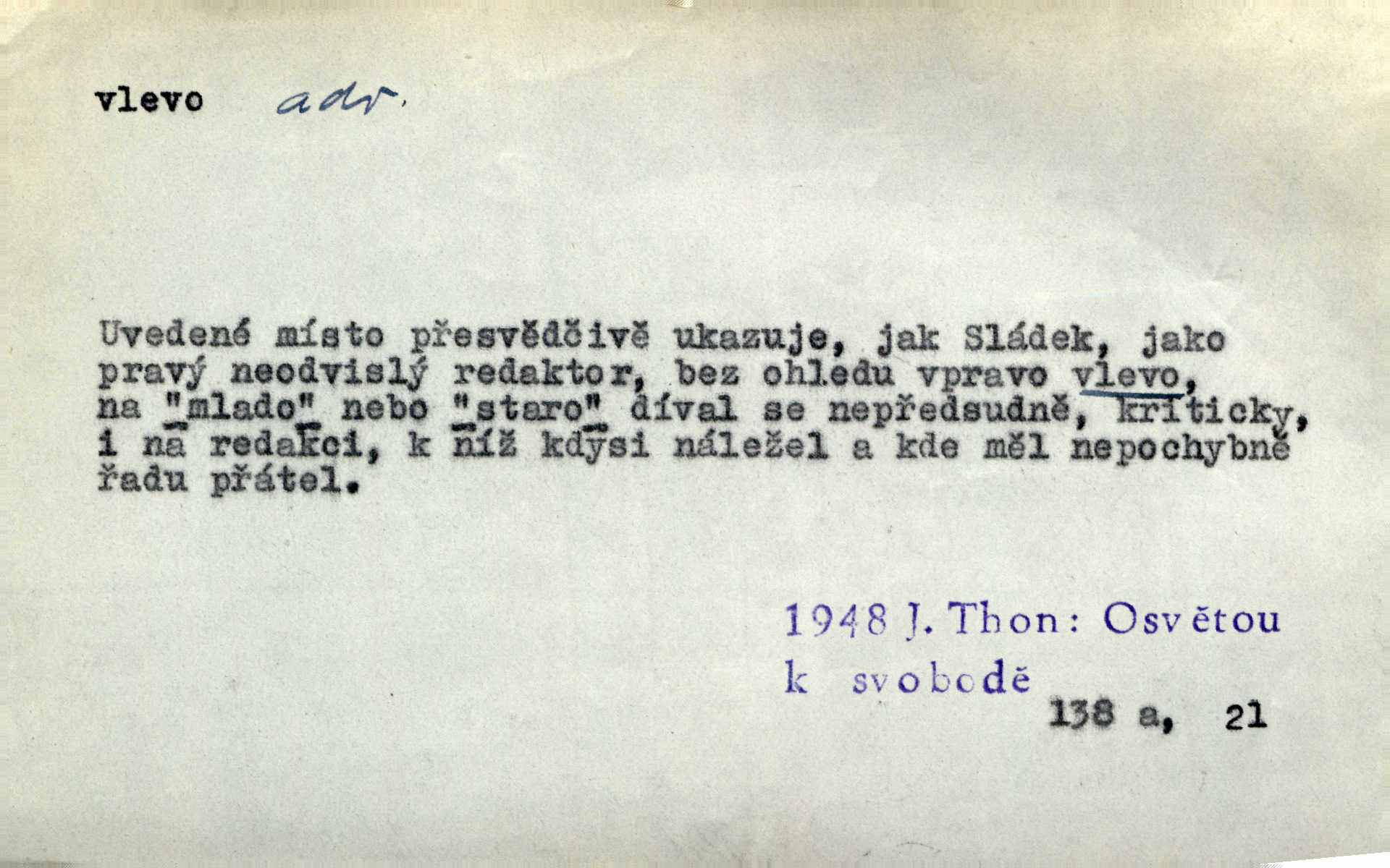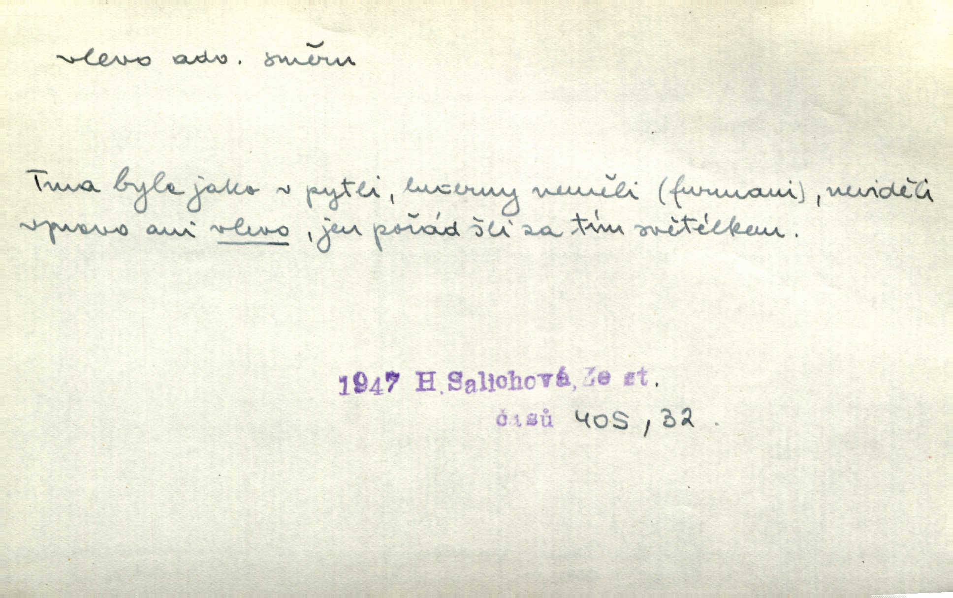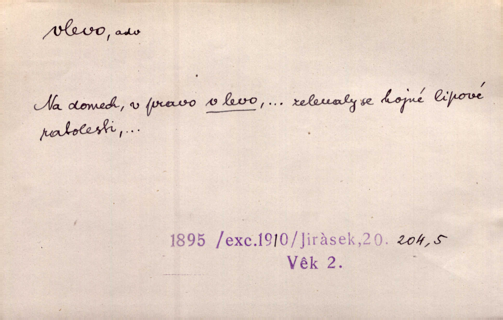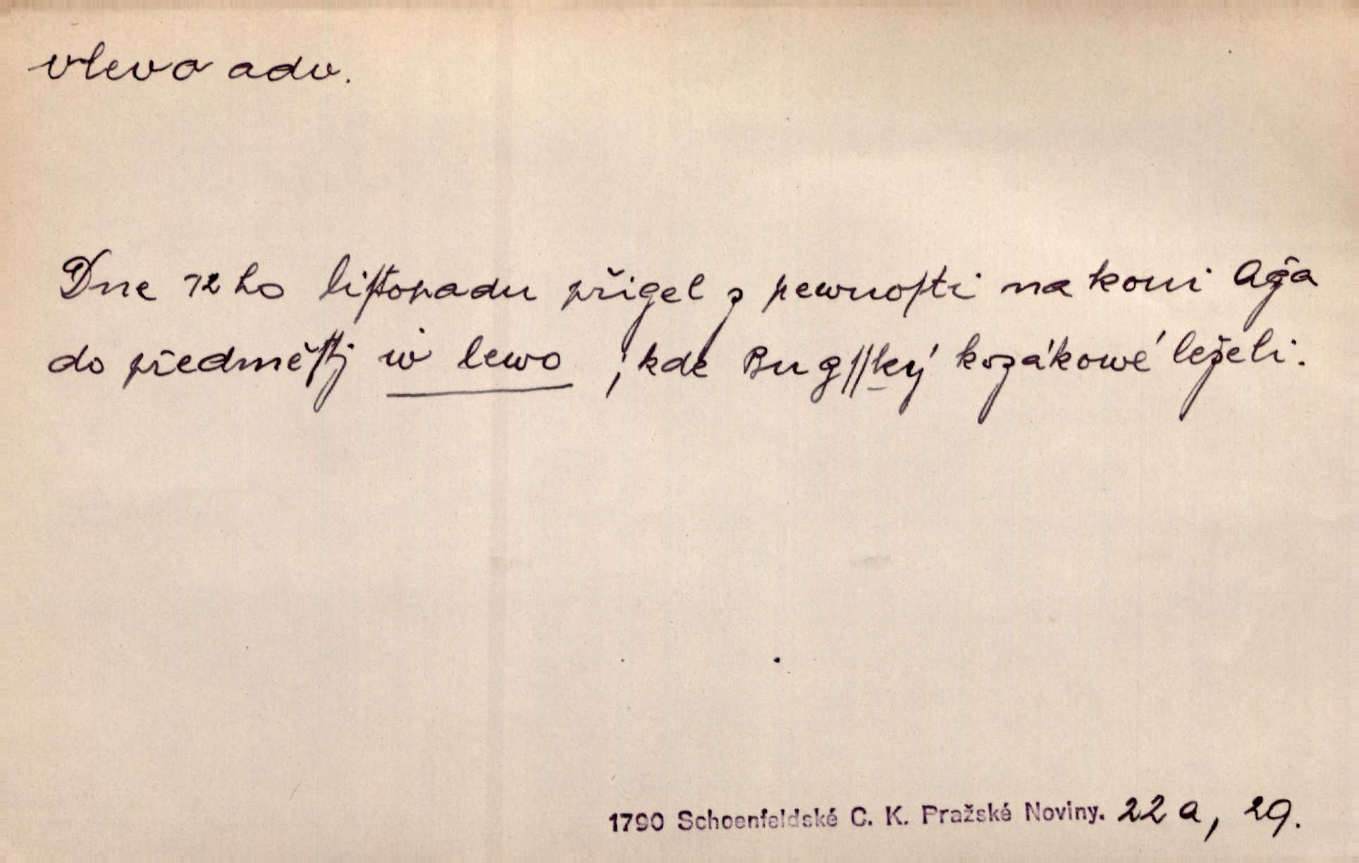 - vlevo adv. ve směru levé ruky, na levé straně, na levou stranu. Zahněme vlevo! John. Nechali [jsme] vlevo prostorný zámek se dvěma křídly. John. V pravo, v levo od silnice [stály] statky a chalupy. Jir. Chvátali hřbitovní stezkou v levo do města. Rais. I jde v pravo ten a onen v levo. Kal. Tenkráte silně v levo střelil jsi zmýlil ses. Šub. Ondrejkovy zraky těkaly v pravo v levo sem tam. Jir. Zř. Vlevo skály u prostřed olšin a bujných luk je velký dvůr. Svět. Voj. vlevo v bok, vlevo hleď (povel). D směrem k pokroku, k socialismu. Vývoj směřuje vlevo. Lid. nov.