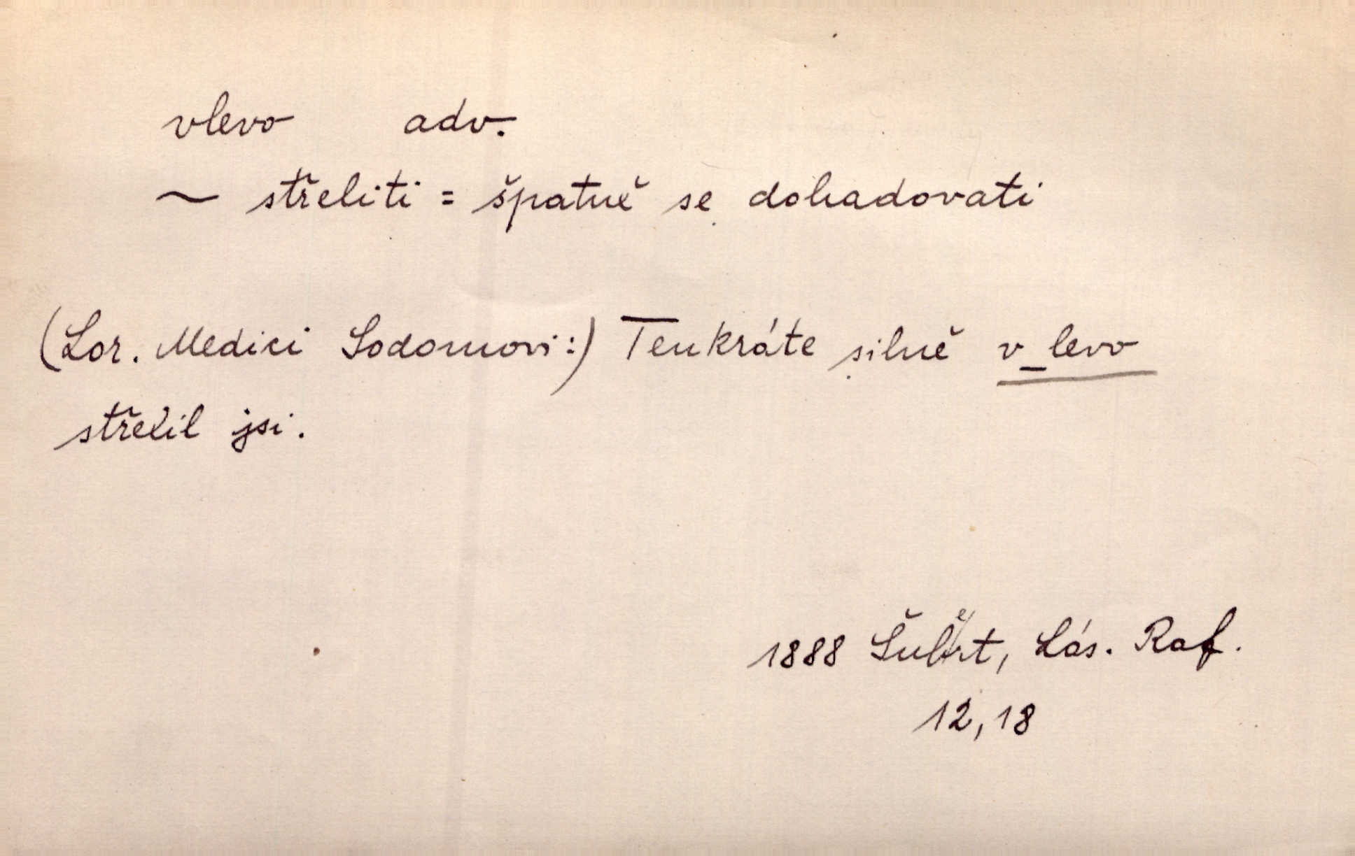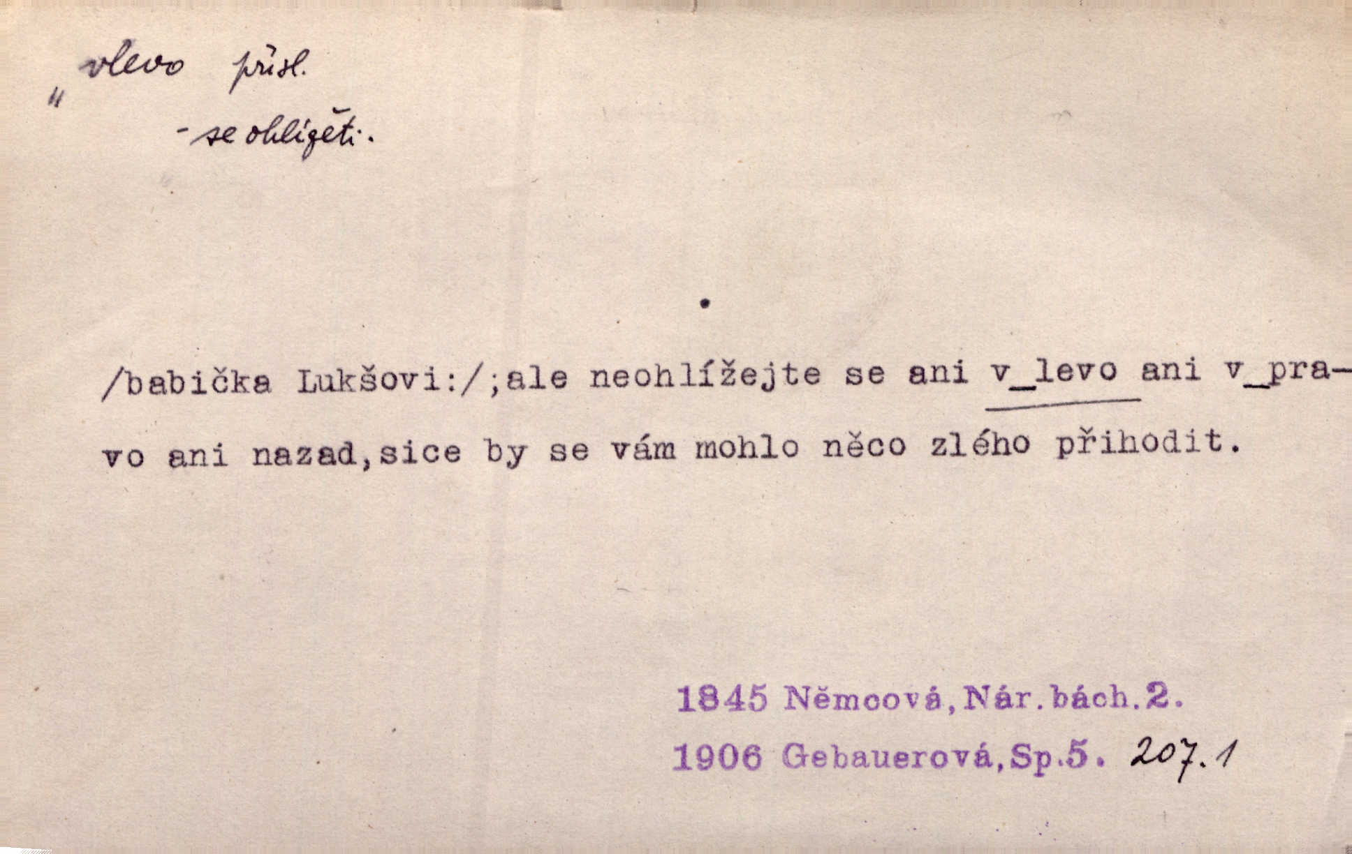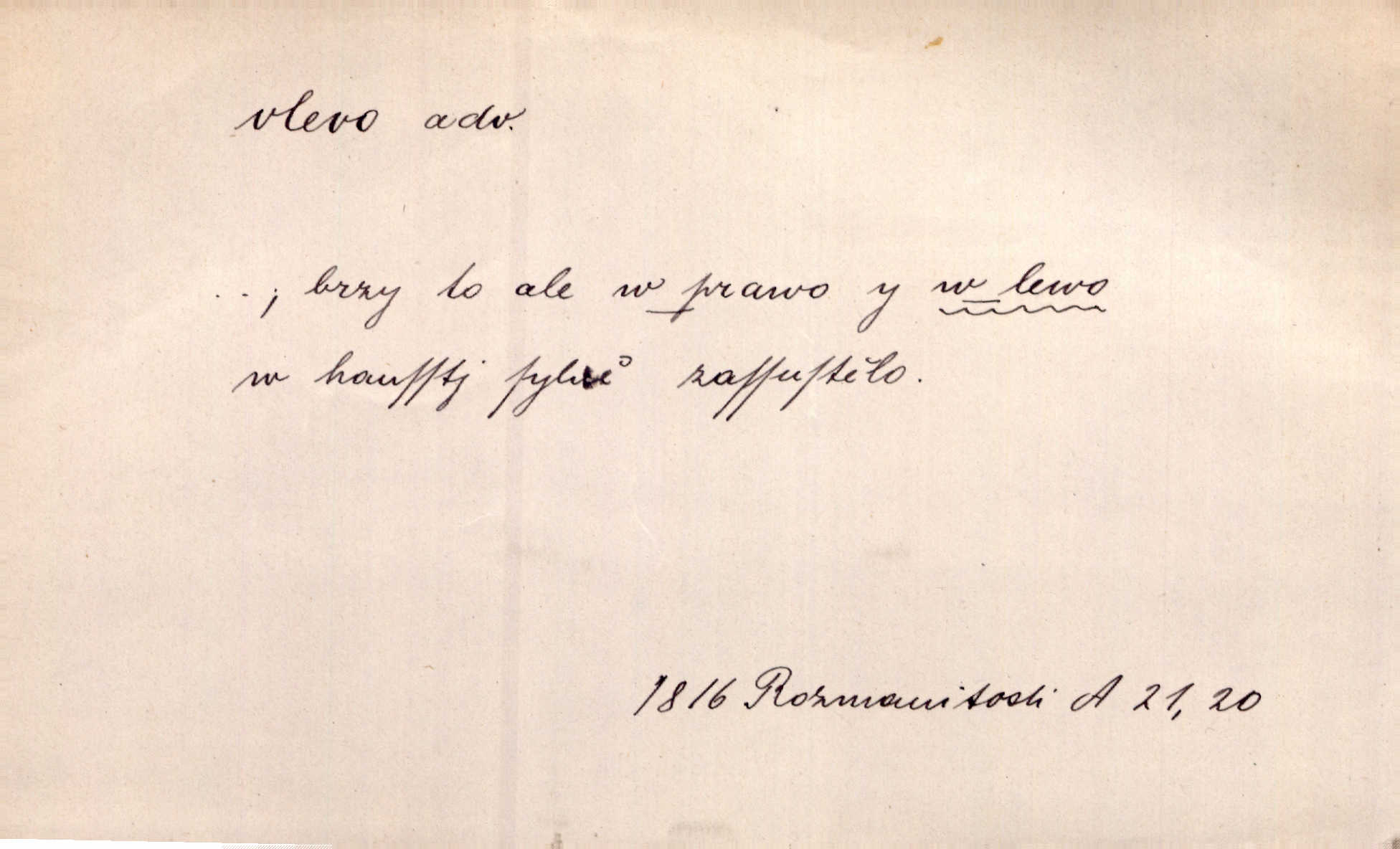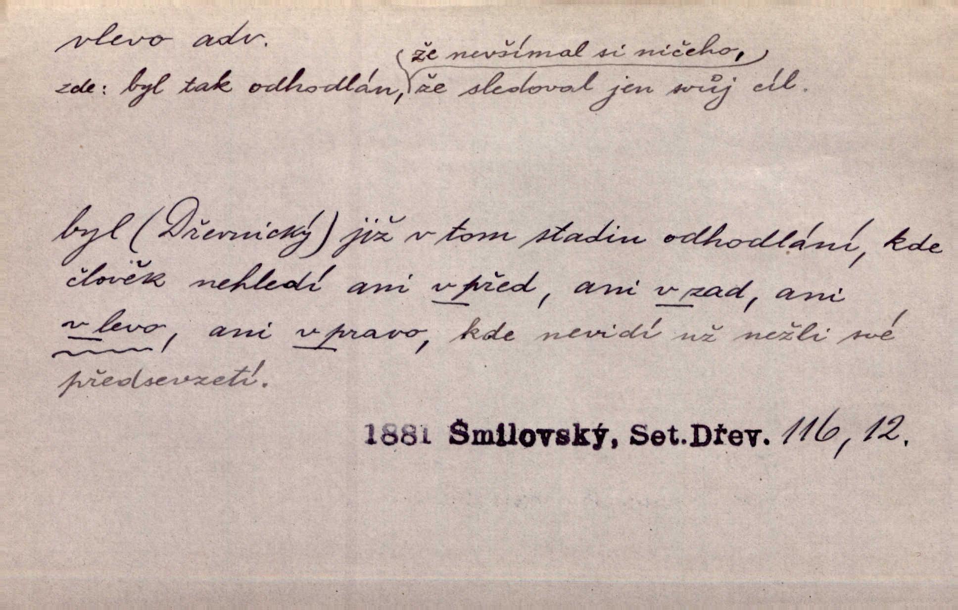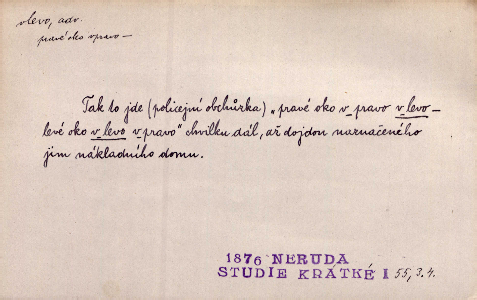 - vlevo adv. ve směru levé ruky, na levé straně, na levou stranu. Zahněme vlevo! John. Nechali [jsme] vlevo prostorný zámek se dvěma křídly. John. V pravo, v levo od silnice [stály] statky a chalupy. Jir. Chvátali hřbitovní stezkou v levo do města. Rais. I jde v pravo ten a onen v levo. Kal. Tenkráte silně v levo střelil jsi zmýlil ses. Šub. Ondrejkovy zraky těkaly v pravo v levo sem tam. Jir. Zř. Vlevo skály u prostřed olšin a bujných luk je velký dvůr. Svět. Voj. vlevo v bok, vlevo hleď (povel). D směrem k pokroku, k socialismu. Vývoj směřuje vlevo. Lid. nov.