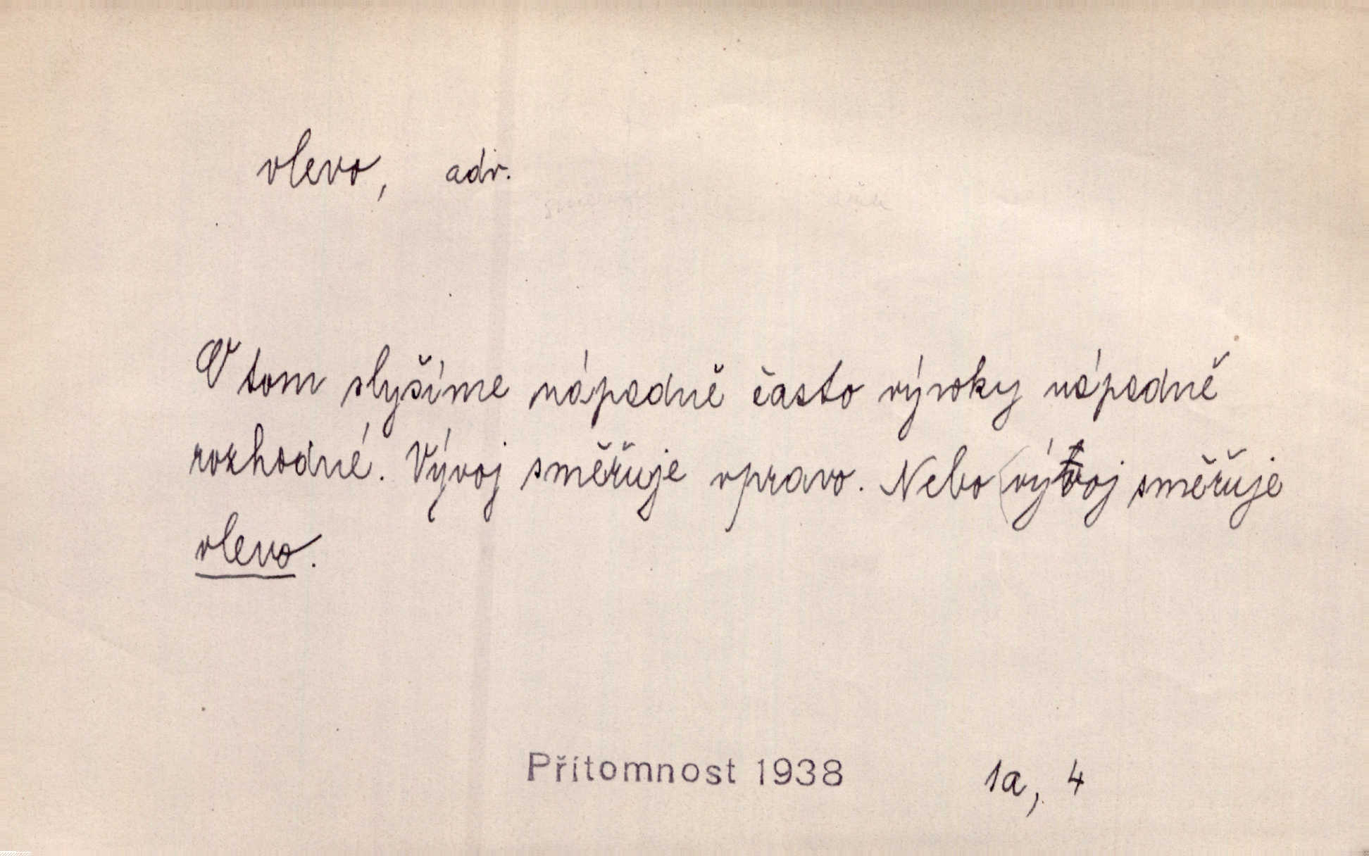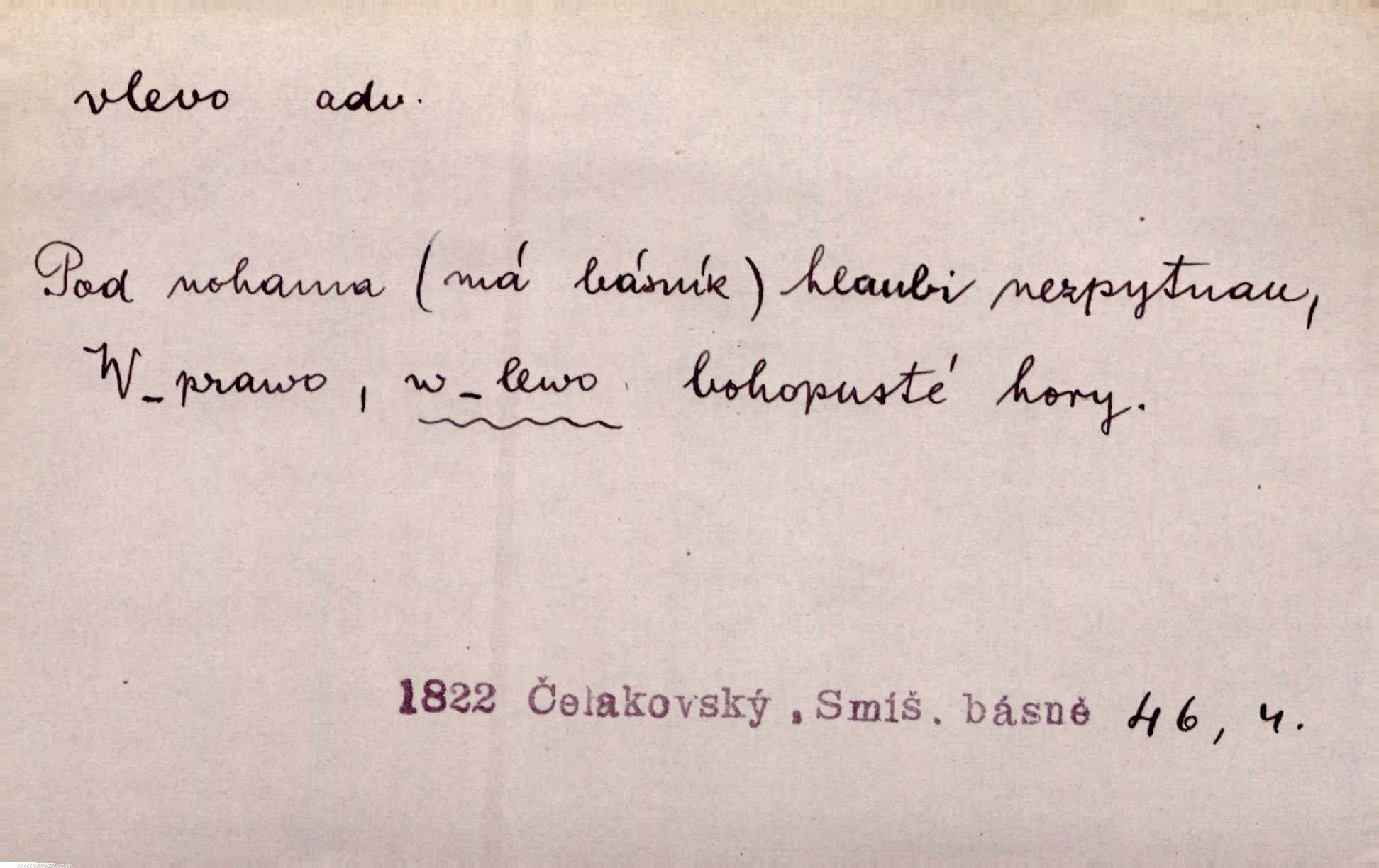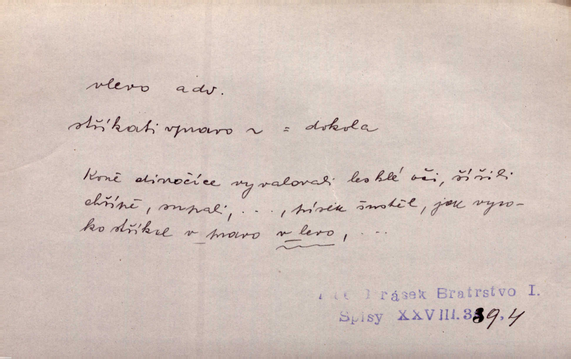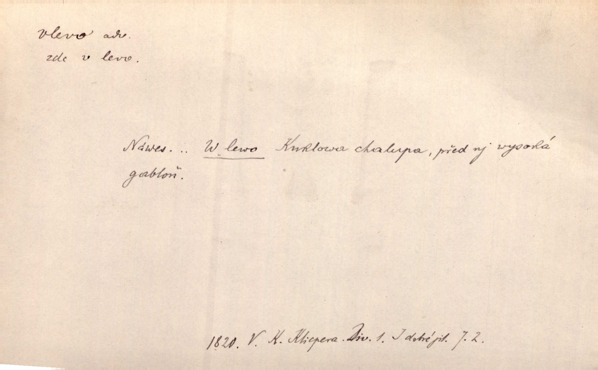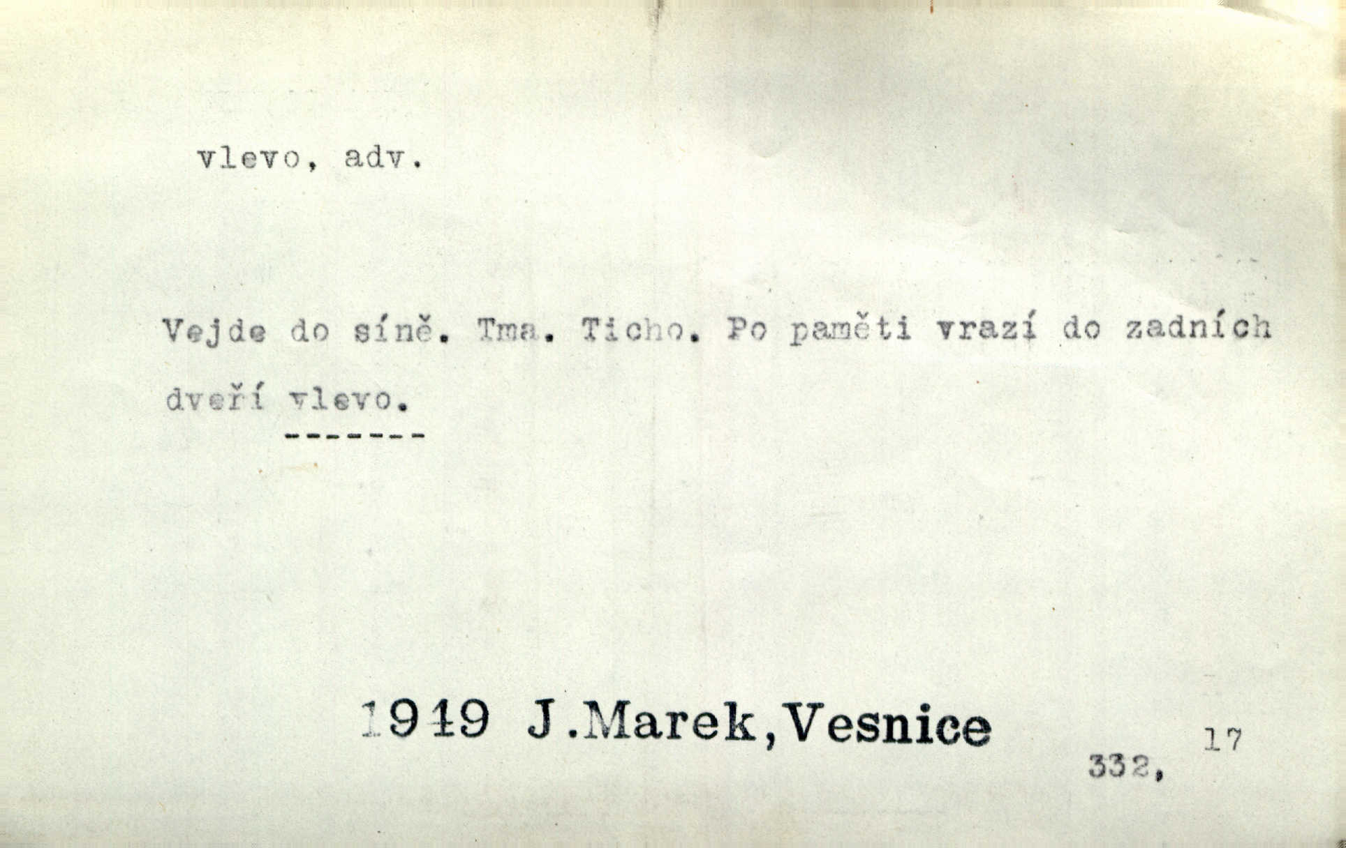- vlevo adv. ve směru levé ruky, na levé straně, na levou stranu. Zahněme vlevo! John. Nechali [jsme] vlevo prostorný zámek se dvěma křídly. John. V pravo, v levo od silnice [stály] statky a chalupy. Jir. Chvátali hřbitovní stezkou v levo do města. Rais. I jde v pravo ten a onen v levo. Kal. Tenkráte silně v levo střelil jsi zmýlil ses. Šub. Ondrejkovy zraky těkaly v pravo v levo sem tam. Jir. Zř. Vlevo skály u prostřed olšin a bujných luk je velký dvůr. Svět. Voj. vlevo v bok, vlevo hleď (povel). D směrem k pokroku, k socialismu. Vývoj směřuje vlevo. Lid. nov.