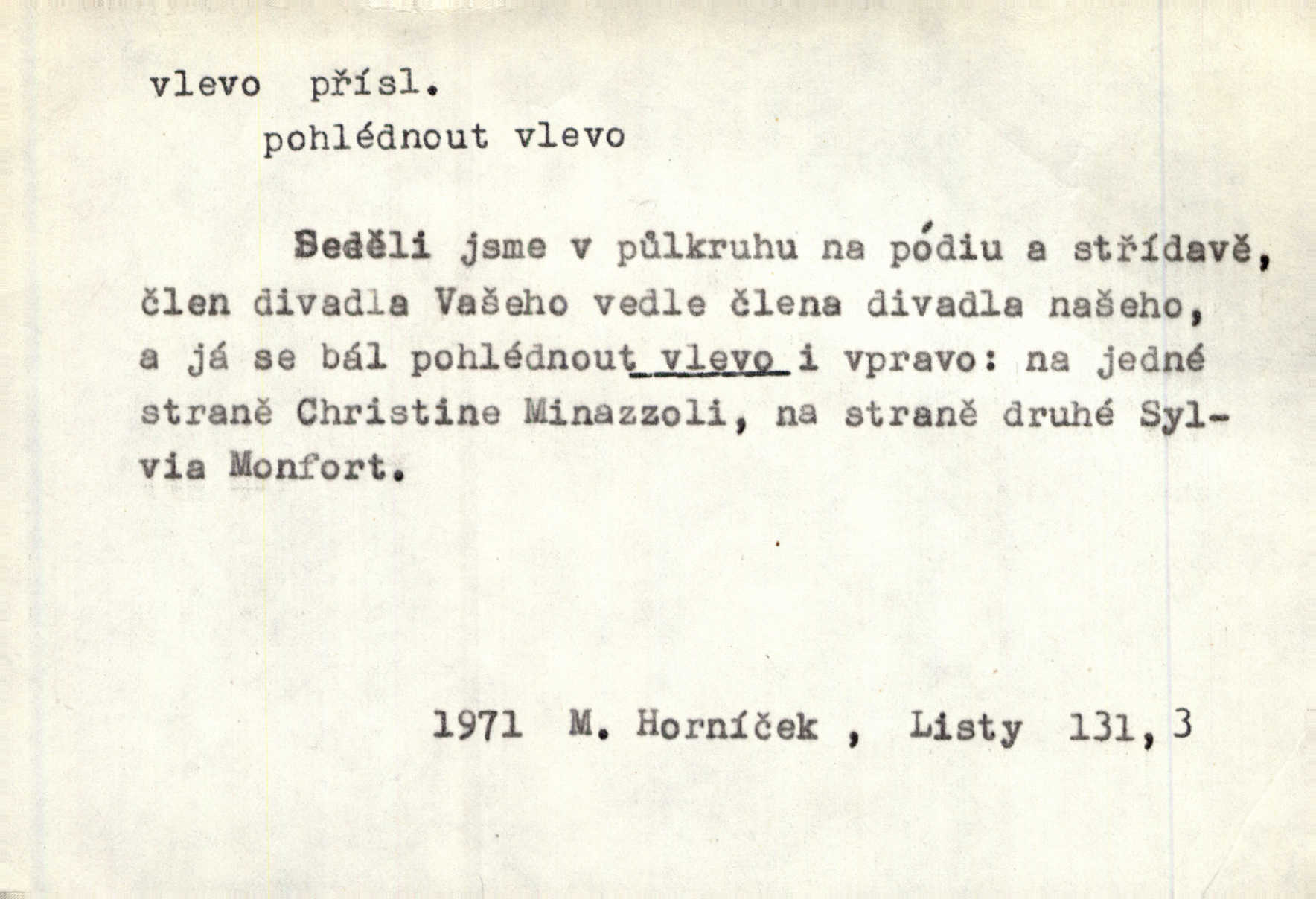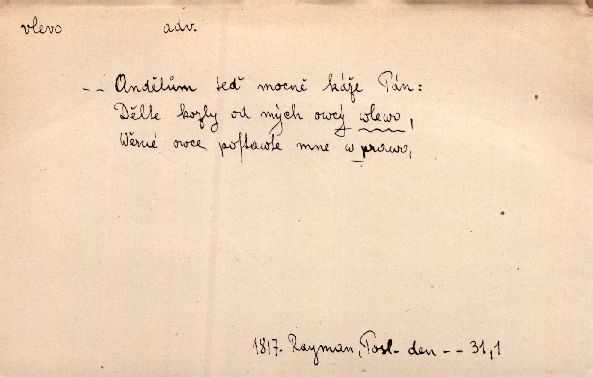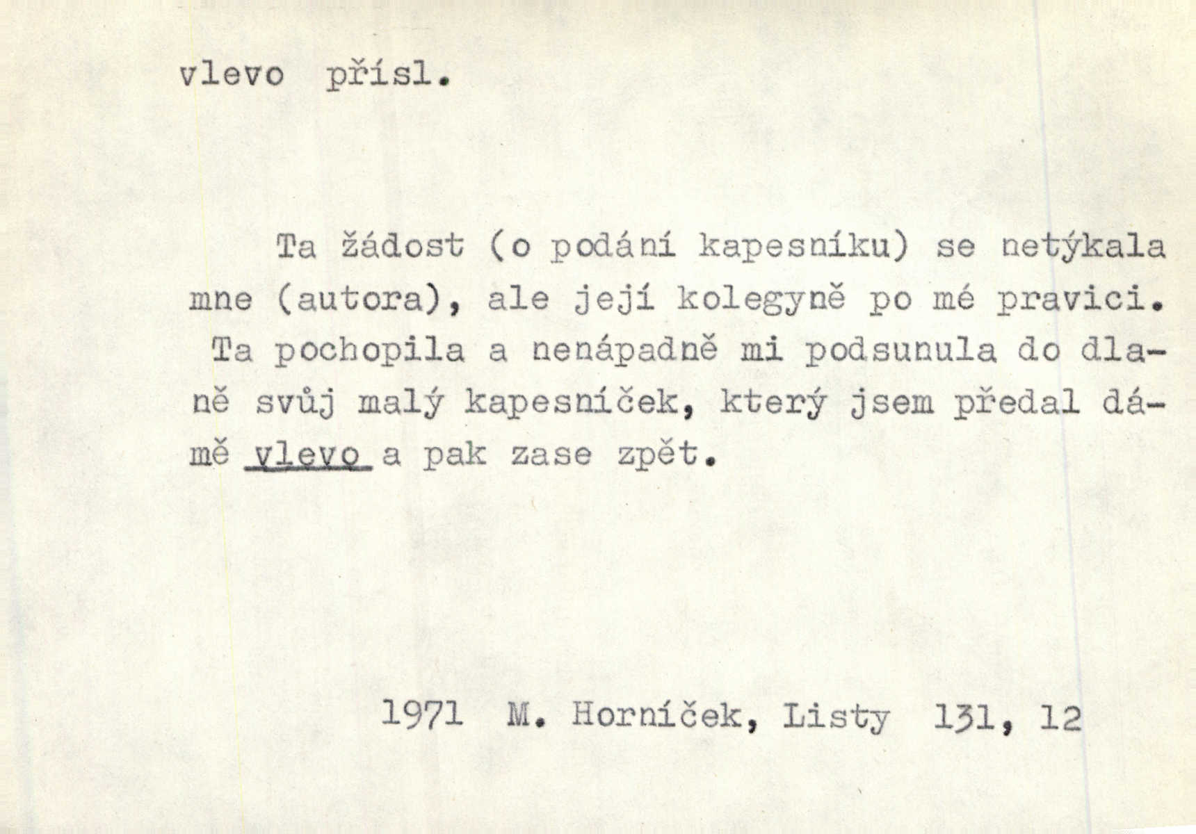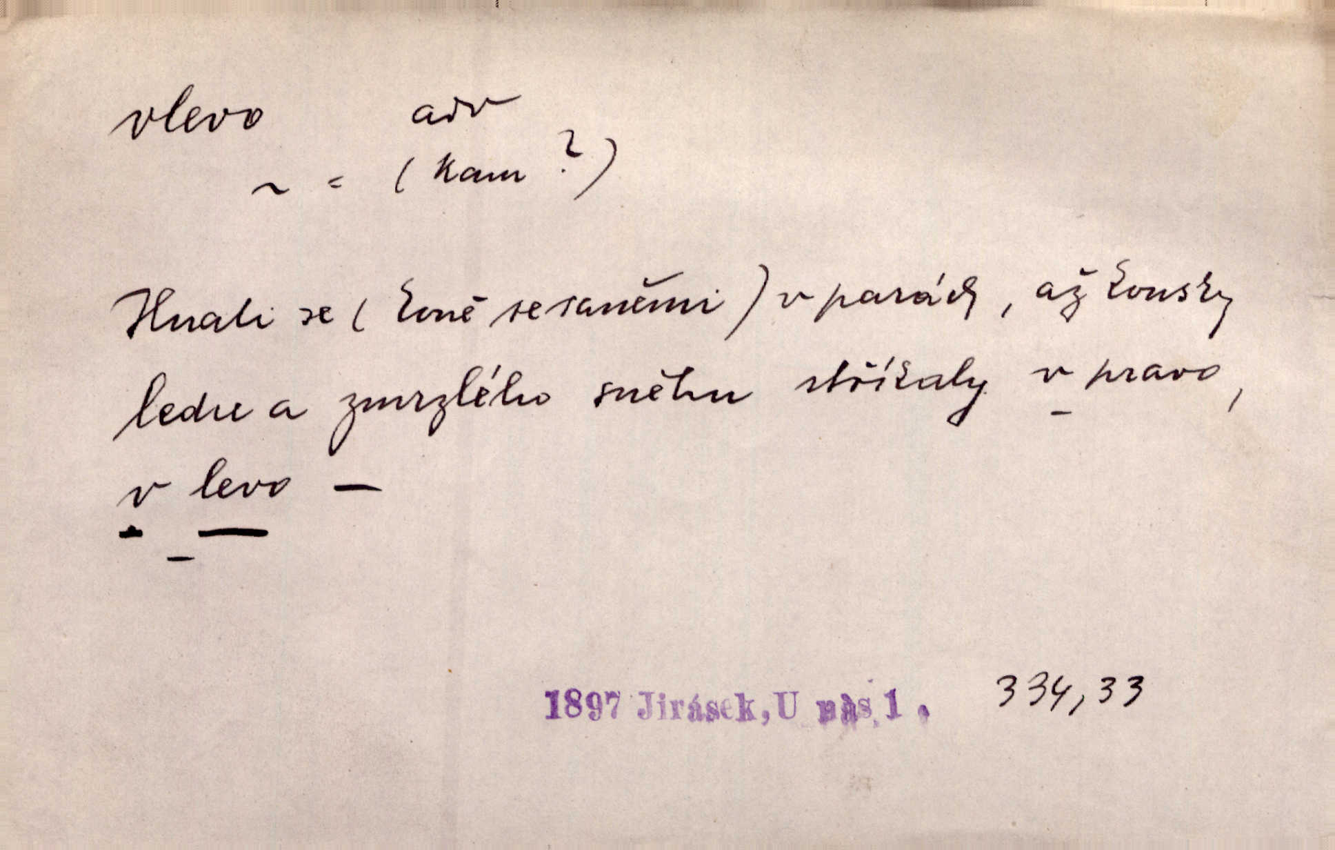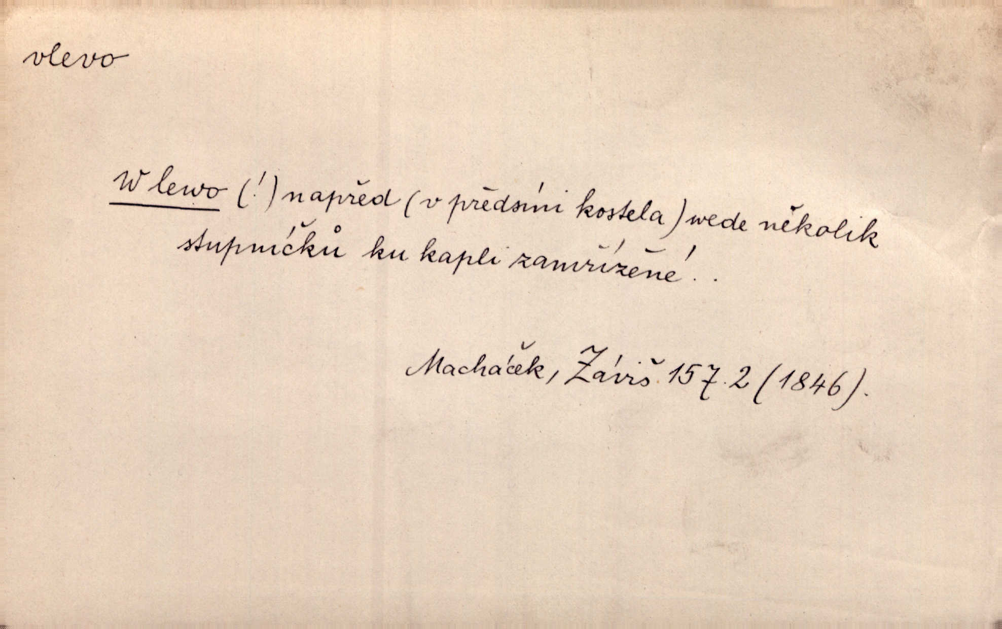 - vlevo adv. ve směru levé ruky, na levé straně, na levou stranu. Zahněme vlevo! John. Nechali [jsme] vlevo prostorný zámek se dvěma křídly. John. V pravo, v levo od silnice [stály] statky a chalupy. Jir. Chvátali hřbitovní stezkou v levo do města. Rais. I jde v pravo ten a onen v levo. Kal. Tenkráte silně v levo střelil jsi zmýlil ses. Šub. Ondrejkovy zraky těkaly v pravo v levo sem tam. Jir. Zř. Vlevo skály u prostřed olšin a bujných luk je velký dvůr. Svět. Voj. vlevo v bok, vlevo hleď (povel). D směrem k pokroku, k socialismu. Vývoj směřuje vlevo. Lid. nov.