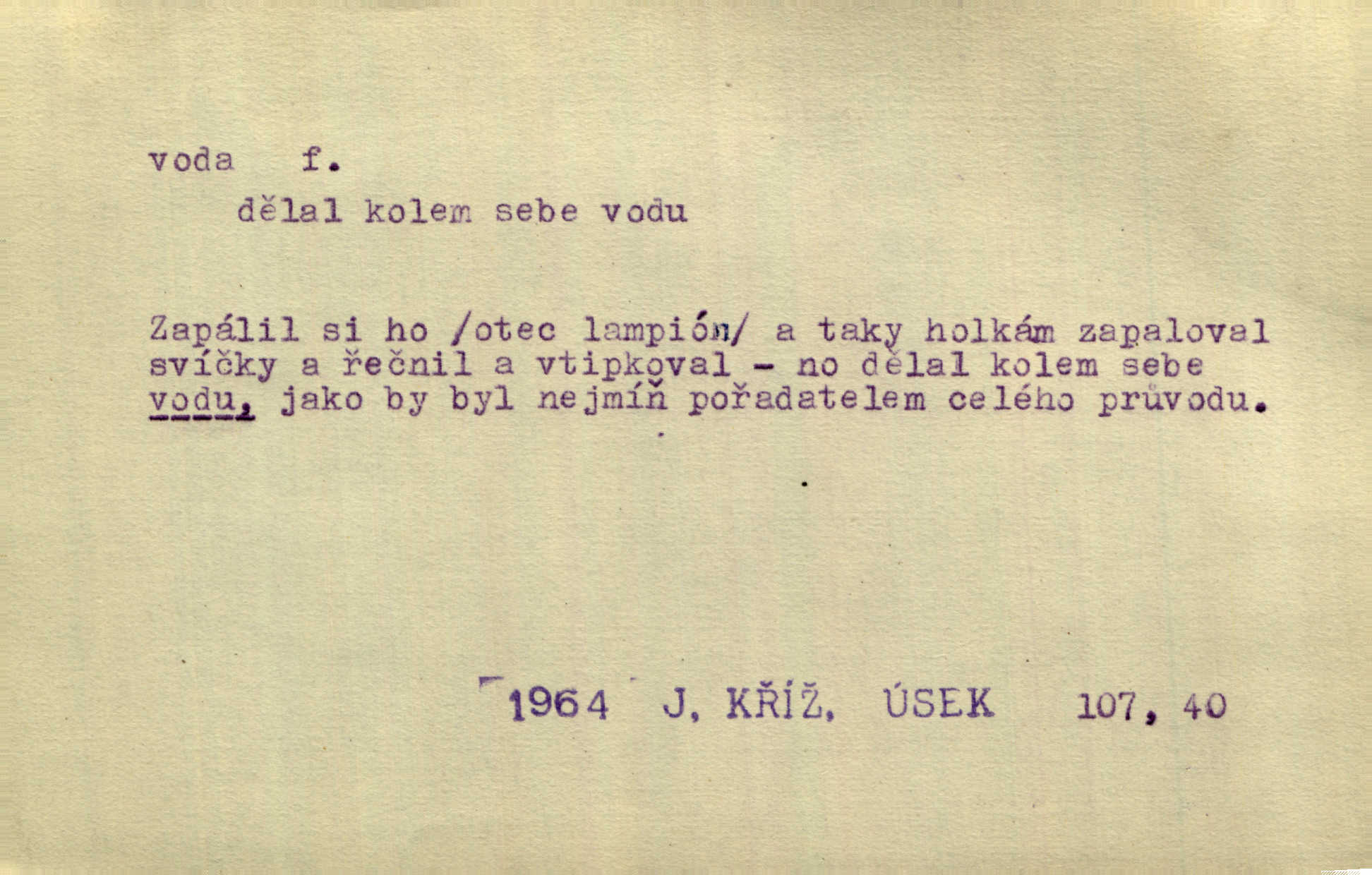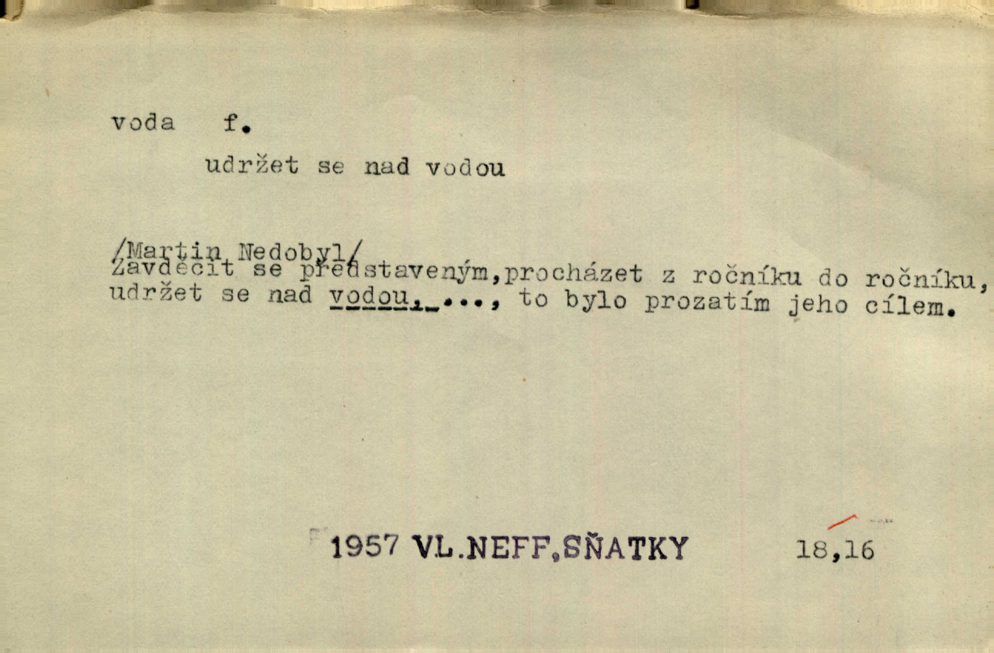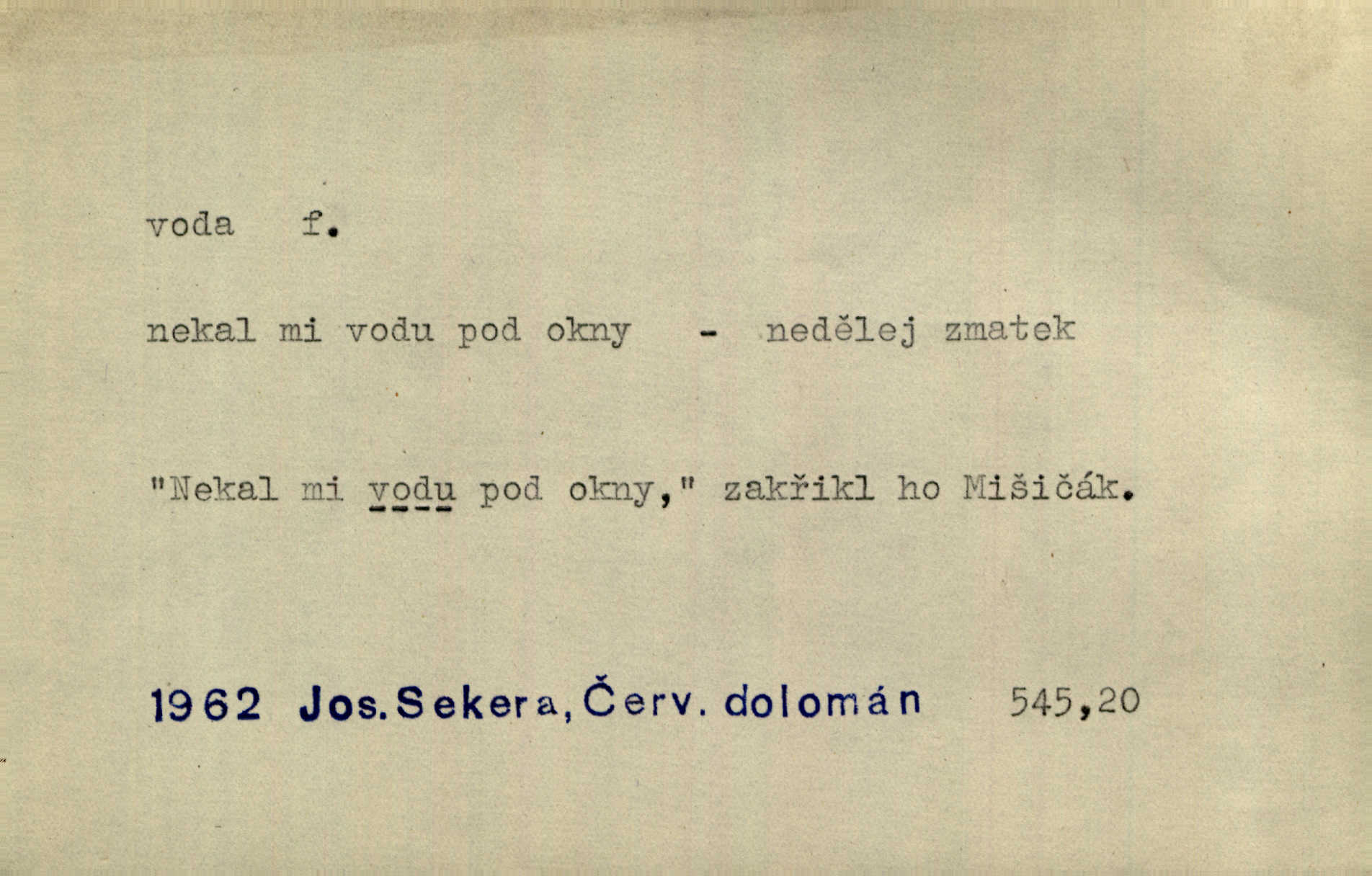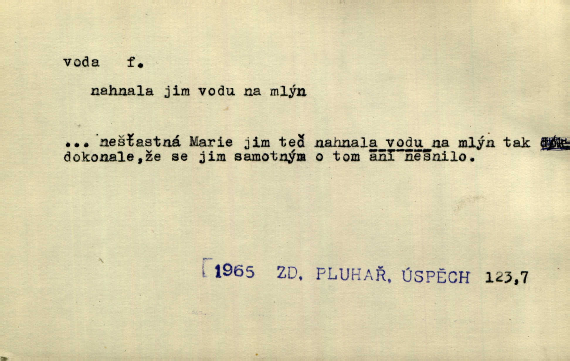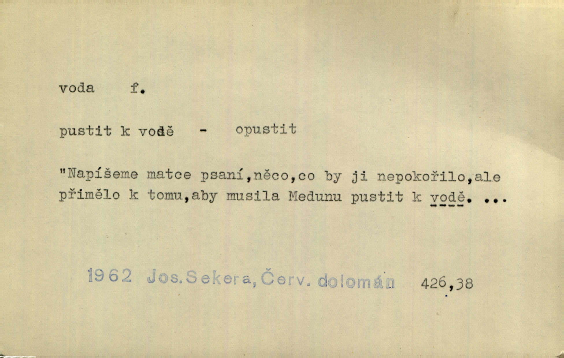 - voda, -y f. průhledná kapalina, vyskytující se jako déšť (sníh, led) n. pramenící ze země, uložená v různých přírodních nádržích a sloužící za základní nápoj. Vyběhnuvši na dvůr, navážila vody. Rais. Voda se už vaří a můžete hned po čaji usnout. Ner. Po mase přinesla sobě sklenici vody. Šim. Přišel čas, kdy došla [na lodi] sladká voda pitná. Dyk. [Řeka] je nějak zachmouřená. Spadla někde voda dešť. V. Mrš. A v dáli Eufrat své sivé vody valí bez hluku jak řeka smrti vlny. Mach. Ráda kočka ryby jí, ale do vody se jí nechce. Přísl. Tak dlouho se chodí s hrnečkem pro vodu, až se ucho utrhne všecko má své následky. Přísl. Není ostýchavý a nesmělý: ryba přišla do vody je ve svém živlu. Hol. Krev není voda. Přísl. Řeč se mluví a voda teče něco nemá závažnosti. Přísl. Inu, voda se pije a řeč se mluví. Bozd. Je [syn] jako voda v koši nestálý. Poláč. Jen nesmíš zapomjet, že von je stálej jako voda v saku. Lid. nov. U mladého jsou peníze jako voda v koši hned je utratí. Jir. Neřekl nic a vytratil se jako voda z koše. Jir. Plynou peníze jako voda skrz prsty snadno se utratí. Ner. Celý den jsem jako na vodě, z pláče nevycházím. Rais. Karla zůstala, jako by ji polil studenou vodou zaražena. Štol. Všichni tu stáli, jako by je polil horkou vodou. Hál. Byly na sebe jak oheň a voda nesnesly se. Herb. Po čtyřnedělním pátrání vyšla skutečně pravda na světlo jako olej na vodu zřetelně, jasně. Herb. Bylo tam řečí jako vody mnoho. Vrba. I lidé nadělají řečí jako vody. Rais. Je tu tak potřebný jako voda velmi. Svět. Jsme my ženy sobě podobny jako voda k dešti. Šmil. Stála průhledná jako voda úplně. Hol. Já byl střízliv jako džbánek vody. Šmil. Žoli jako by se byl do vody propadl zmizel beze stopy. Čech. Jako by se nad ním voda zavřela. Šim. Byl stále jako na vodě nejistý, neklidný. Rais. Mám dneska žaludek jako na vodě podrážděný. J. Tom. V dalších dnech se chodník pod botami poddával, chodci „šli jako na vodě“ nejistě. Techn. obz. Spala ještě jako na nepokojné vodě. Šmil. [Říkala o zubech,] že je už má jako na vodě viklavé. Šim. [Bříza] rostla jako z vody a brzo přerostla všecky smrčky bujně. Vrba. Byli dvojčata a rostli jako z vody. Herb. Měl jedinou dceru Gábinku, dívku jako z vody vyrostlou ztepilou. Šmil. Dni utíkaly jako voda rychle. Jir. Léta ubíhají jako vlny po vodě. Šmil. Spal jsem celou noc, jakoby mne do vody hodil tvrdě. Jir. Inu pan doktor je pevná hlava a hodí se do těch časů jako ryba do vody dobře. O. Červ. Ve dveřích, jak ji [rakev] vynášeli, se na ní zaleskly kapky svěcené vody posvěcené církevním obřadem. Til. Svěcení „tříkrálové vody“. Cin. A teď mu ani svěcená voda nepomůže nic, nikdo. Vrba. Uvidíš časem, že bude třeba, abys měla svěcenou vodu v žilách místo krve velkou trpělivost. Šmil. Neruda vznášel se tu vždycky [při humoru] nad vodami vyhnul se všednosti. Vrch. [Žurnalista] musí nové prameny pro svůj časopis hledat, neboť by jeho čtenářstvo mnoho vody nesneslo banalit. Ner. „Kočku,“ vykřikla paní Včeličková [hádajíc, co jí muž přinese]. „Samá voda,“ smál jsem se vesele jsi daleko od pravdy (cíle). Lid. nov. Menší děti měly oči na vodě plakaly. J. Šír. Tolik dokladů měl, že ho mohl utopit na lžíci vody velmi snadno. Vrba. Socialistu by na lžíci vody utopil. Zápot. Na koho si zasedla, byla by jej na lžíci vody utopila. Pitt. Kdo má cit v těle, ani vám vody nepodá nebude mít nejmenší úctu. Šmil. Tito koníčci by na příklad hanáckým „vody podat nesměli“ nevyrovnali se. Herb. Do konce června t. r. bude ústava z první vody projednána zhruba, v hlavních rysech. Svob. nov. Zašlete mi novellu svou třeba jen z první vody napsanou. Svět. Hrál jsem symfonii z jedné vody načisto z listu, bez nácviku. Smet. Domácí povinnosti vykonány z jedné vody na čisto najednou, bez okolků. Kun. [V úvodníku] bylo práno špinavé prádlo páně purkmistrovo z jedné vody na čisto činnost důkladně probírána. Vrba. Měli svatbu najednou, aby se to vypralo jednou vodou odbylo najednou. Kosm. Mnoho práce bude potřebí, než budeme moci říci, že jsme již opravdu z vody venku z nejhoršího. R. právo. Machno se zrovna do vody propadl zmizel beze stopy. Maj. Stalo se — nestalo, padlo do vody a bylo dobře zapomnělo se. Herrm. Potřebuješ mě vždycky, když ti teče voda do bot jsi v nesnázích. Branald. My začínáme vařit z vody žijeme skromně. Práce. No, kalí to nebylo, chudý lidi vařej z vody mají chudá jídla. Kubín. Bylo to ohromné plácnutí do vody nicotný čin, zbytečnost. K. Čap. Purkmistr mu prorokoval, že bude vodu řešetem nabírat, omluvil se a odešel dělat marnou práci. Baar. Blázen, kdo vodu řešetem měří. Čech. Tedy nemá nazbyt peněz, ale chce honit vodu dělat dojem. K. Čap. Jistě by neopomněli poznamenat, že bych v nich [rukavičkách] mohl i „honit vodu“ dělati šviháka. Svob. nov. Bude vám na prospěch, když vám v „Pražském sportu“ udělám trochu vody reklamu. Böhn. Uhlídá pan direktor, jakou zvednu vodu způsobím rozruch. Štech. A co ti lidé mají? Vždyť nikomu vody nekalím neubližuji. Herb. Po lidských žlabech kalná voda teče lidé rádi pomlouvají. Přísl. Byla to sebranka, lidé, kteří chtějí lovit v kalných vodách těžiti ze situace. Dyk. Postihla jeho rozpaky, a to byla voda na její mlýn velmi se jí to hodilo. Herrm. Nesprávná politika hnala přímo vodu na mlýn hlinkovských zrádců prospívala jim. R. právo. Nač hnáti vodu cizí na kola? Vrch. Noviny varovaly ministry naše, že nadhánějí vodu jen na mlýn pruský. Herb. Udržoval s napětím pozornosti hovor nad vodou plynulý rozhovor. Schein. Jen ponižující vydávání h