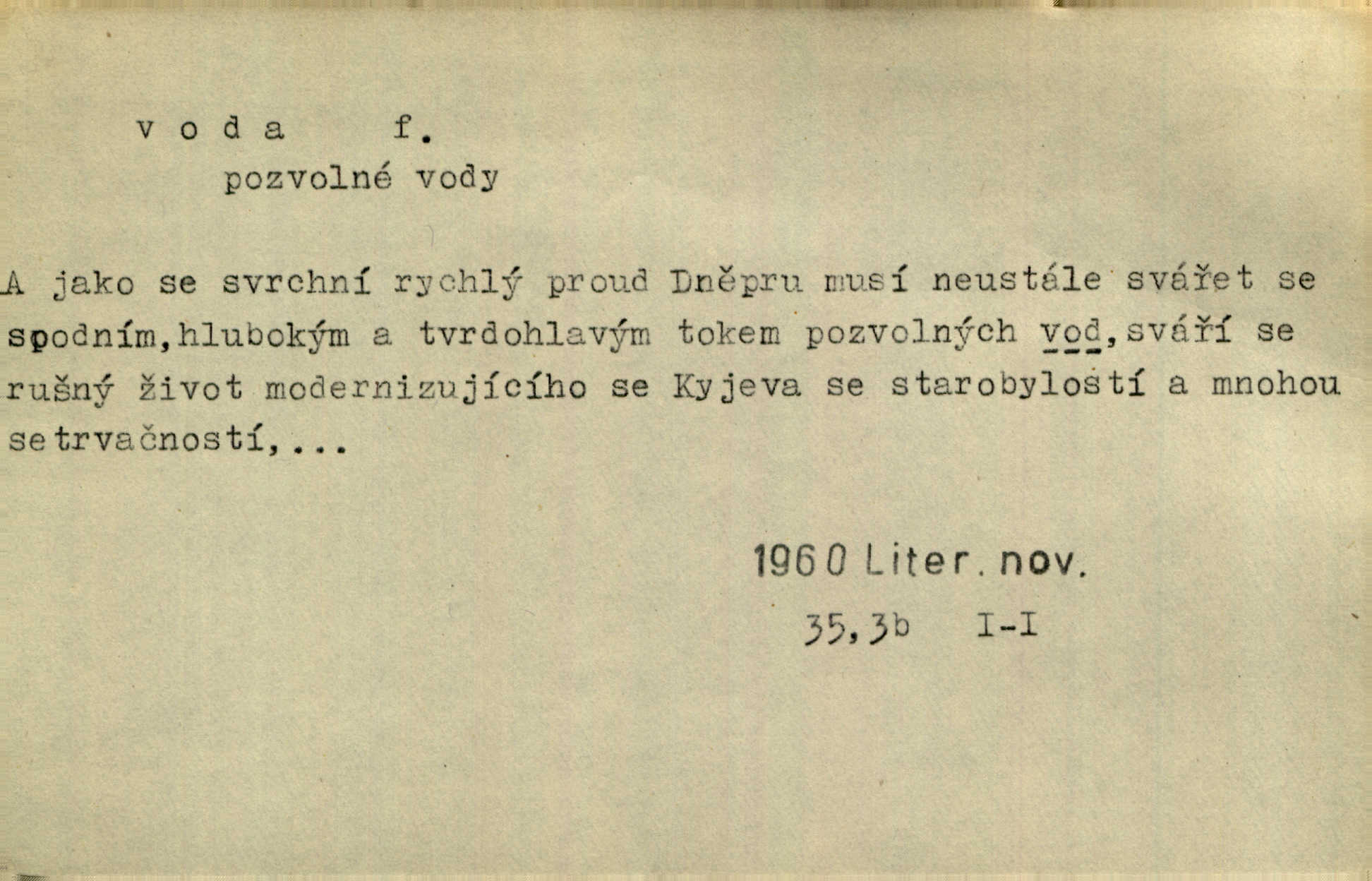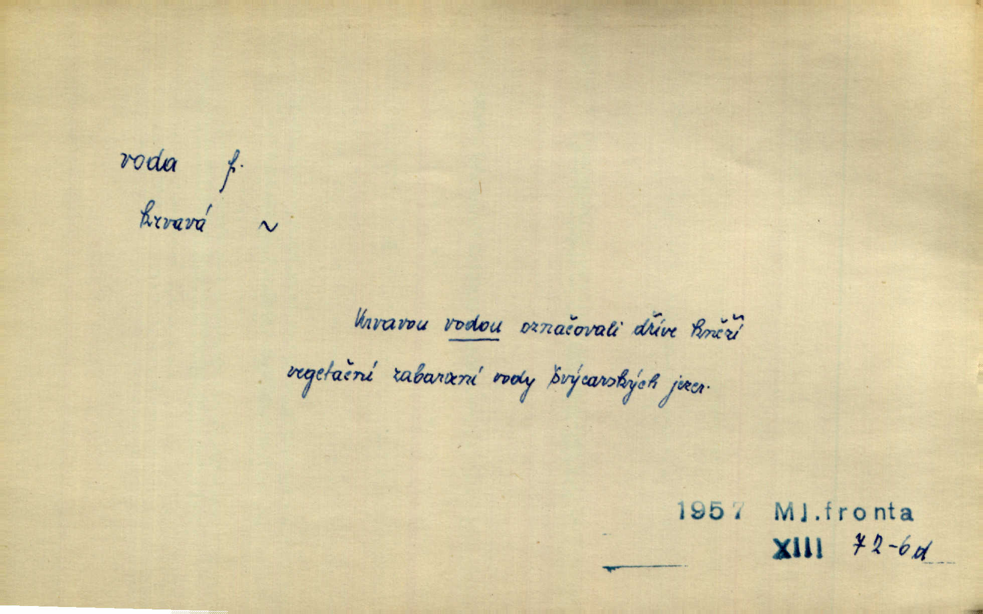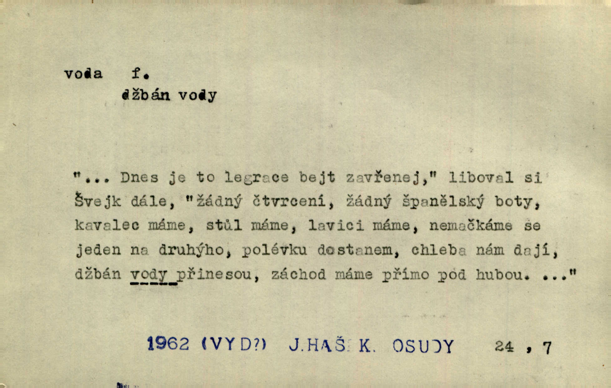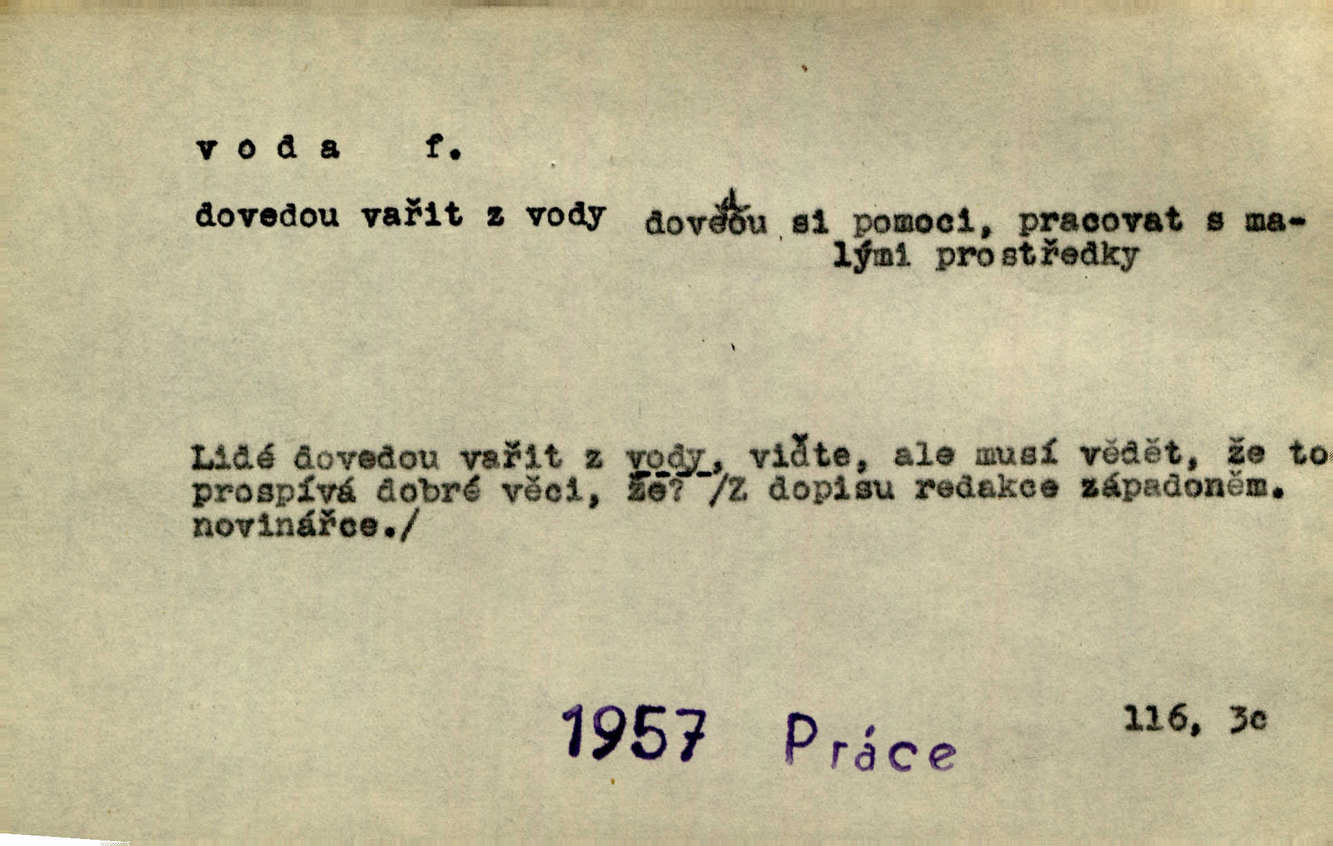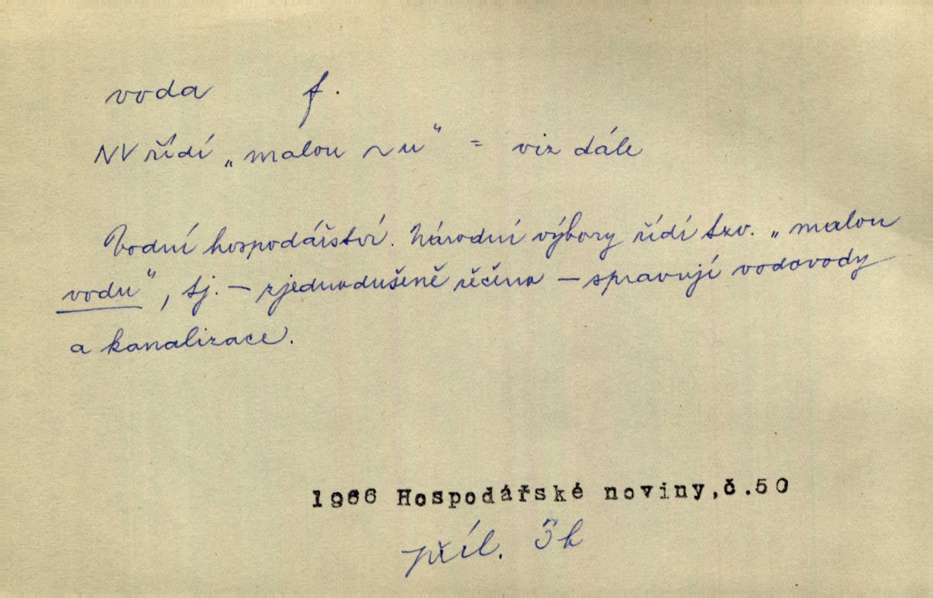 - voda, -y f. průhledná kapalina, vyskytující se jako déšť (sníh, led) n. pramenící ze země, uložená v různých přírodních nádržích a sloužící za základní nápoj. Vyběhnuvši na dvůr, navážila vody. Rais. Voda se už vaří a můžete hned po čaji usnout. Ner. Po mase přinesla sobě sklenici vody. Šim. Přišel čas, kdy došla [na lodi] sladká voda pitná. Dyk. [Řeka] je nějak zachmouřená. Spadla někde voda dešť. V. Mrš. A v dáli Eufrat své sivé vody valí bez hluku jak řeka smrti vlny. Mach. Ráda kočka ryby jí, ale do vody se jí nechce. Přísl. Tak dlouho se chodí s hrnečkem pro vodu, až se ucho utrhne všecko má své následky. Přísl. Není ostýchavý a nesmělý: ryba přišla do vody je ve svém živlu. Hol. Krev není voda. Přísl. Řeč se mluví a voda teče něco nemá závažnosti. Přísl. Inu, voda se pije a řeč se mluví. Bozd. Je [syn] jako voda v koši nestálý. Poláč. Jen nesmíš zapomjet, že von je stálej jako voda v saku. Lid. nov. U mladého jsou peníze jako voda v koši hned je utratí. Jir. Neřekl nic a vytratil se jako voda z koše. Jir. Plynou peníze jako voda skrz prsty snadno se utratí. Ner. Celý den jsem jako na vodě, z pláče nevycházím. Rais. Karla zůstala, jako by ji polil studenou vodou zaražena. Štol. Všichni tu stáli, jako by je polil horkou vodou. Hál. Byly na sebe jak oheň a voda nesnesly se. Herb. Po čtyřnedělním pátrání vyšla skutečně pravda na světlo jako olej na vodu zřetelně, jasně. Herb. Bylo tam řečí jako vody mnoho. Vrba. I lidé nadělají řečí jako vody. Rais. Je tu tak potřebný jako voda velmi. Svět. Jsme my ženy sobě podobny jako voda k dešti. Šmil. Stála průhledná jako voda úplně. Hol. Já byl střízliv jako džbánek vody. Šmil. Žoli jako by se byl do vody propadl zmizel beze stopy. Čech. Jako by se nad ním voda zavřela. Šim. Byl stále jako na vodě nejistý, neklidný. Rais. Mám dneska žaludek jako na vodě podrážděný. J. Tom. V dalších dnech se chodník pod botami poddával, chodci „šli jako na vodě“ nejistě. Techn. obz. Spala ještě jako na nepokojné vodě. Šmil. [Říkala o zubech,] že je už má jako na vodě viklavé. Šim. [Bříza] rostla jako z vody a brzo přerostla všecky smrčky bujně. Vrba. Byli dvojčata a rostli jako z vody. Herb. Měl jedinou dceru Gábinku, dívku jako z vody vyrostlou ztepilou. Šmil. Dni utíkaly jako voda rychle. Jir. Léta ubíhají jako vlny po vodě. Šmil. Spal jsem celou noc, jakoby mne do vody hodil tvrdě. Jir. Inu pan doktor je pevná hlava a hodí se do těch časů jako ryba do vody dobře. O. Červ. Ve dveřích, jak ji [rakev] vynášeli, se na ní zaleskly kapky svěcené vody posvěcené církevním obřadem. Til. Svěcení „tříkrálové vody“. Cin. A teď mu ani svěcená voda nepomůže nic, nikdo. Vrba. Uvidíš časem, že bude třeba, abys měla svěcenou vodu v žilách místo krve velkou trpělivost. Šmil. Neruda vznášel se tu vždycky [při humoru] nad vodami vyhnul se všednosti. Vrch. [Žurnalista] musí nové prameny pro svůj časopis hledat, neboť by jeho čtenářstvo mnoho vody nesneslo banalit. Ner. „Kočku,“ vykřikla paní Včeličková [hádajíc, co jí muž přinese]. „Samá voda,“ smál jsem se vesele jsi daleko od pravdy (cíle). Lid. nov. Menší děti měly oči na vodě plakaly. J. Šír. Tolik dokladů měl, že ho mohl utopit na lžíci vody velmi snadno. Vrba. Socialistu by na lžíci vody utopil. Zápot. Na koho si zasedla, byla by jej na lžíci vody utopila. Pitt. Kdo má cit v těle, ani vám vody nepodá nebude mít nejmenší úctu. Šmil. Tito koníčci by na příklad hanáckým „vody podat nesměli“ nevyrovnali se. Herb. Do konce června t. r. bude ústava z první vody projednána zhruba, v hlavních rysech. Svob. nov. Zašlete mi novellu svou třeba jen z první vody napsanou. Svět. Hrál jsem symfonii z jedné vody načisto z listu, bez nácviku. Smet. Domácí povinnosti vykonány z jedné vody na čisto najednou, bez okolků. Kun. [V úvodníku] bylo práno špinavé prádlo páně purkmistrovo z jedné vody na čisto činnost důkladně probírána. Vrba. Měli svatbu najednou, aby se to vypralo jednou vodou odbylo najednou. Kosm. Mnoho práce bude potřebí, než budeme moci říci, že jsme již opravdu z vody venku z nejhoršího. R. právo. Machno se zrovna do vody propadl zmizel beze stopy. Maj. Stalo se — nestalo, padlo do vody a bylo dobře zapomnělo se. Herrm. Potřebuješ mě vždycky, když ti teče voda do bot jsi v nesnázích. Branald. My začínáme vařit z vody žijeme skromně. Práce. No, kalí to nebylo, chudý lidi vařej z vody mají chudá jídla. Kubín. Bylo to ohromné plácnutí do vody nicotný čin, zbytečnost. K. Čap. Purkmistr mu prorokoval, že bude vodu řešetem nabírat, omluvil se a odešel dělat marnou práci. Baar. Blázen, kdo vodu řešetem měří. Čech. Tedy nemá nazbyt peněz, ale chce honit vodu dělat dojem. K. Čap. Jistě by neopomněli poznamenat, že bych v nich [rukavičkách] mohl i „honit vodu“ dělati šviháka. Svob. nov. Bude vám na prospěch, když vám v „Pražském sportu“ udělám trochu vody reklamu. Böhn. Uhlídá pan direktor, jakou zvednu vodu způsobím rozruch. Štech. A co ti lidé mají? Vždyť nikomu vody nekalím neubližuji. Herb. Po lidských žlabech kalná voda teče lidé rádi pomlouvají. Přísl. Byla to sebranka, lidé, kteří chtějí lovit v kalných vodách těžiti ze situace. Dyk. Postihla jeho rozpaky, a to byla voda na její mlýn velmi se jí to hodilo. Herrm. Nesprávná politika hnala přímo vodu na mlýn hlinkovských zrádců prospívala jim. R. právo. Nač hnáti vodu cizí na kola? Vrch. Noviny varovaly ministry naše, že nadhánějí vodu jen na mlýn pruský. Herb. Udržoval s napětím pozornosti hovor nad vodou plynulý rozhovor. Schein. Jen ponižující vydávání h