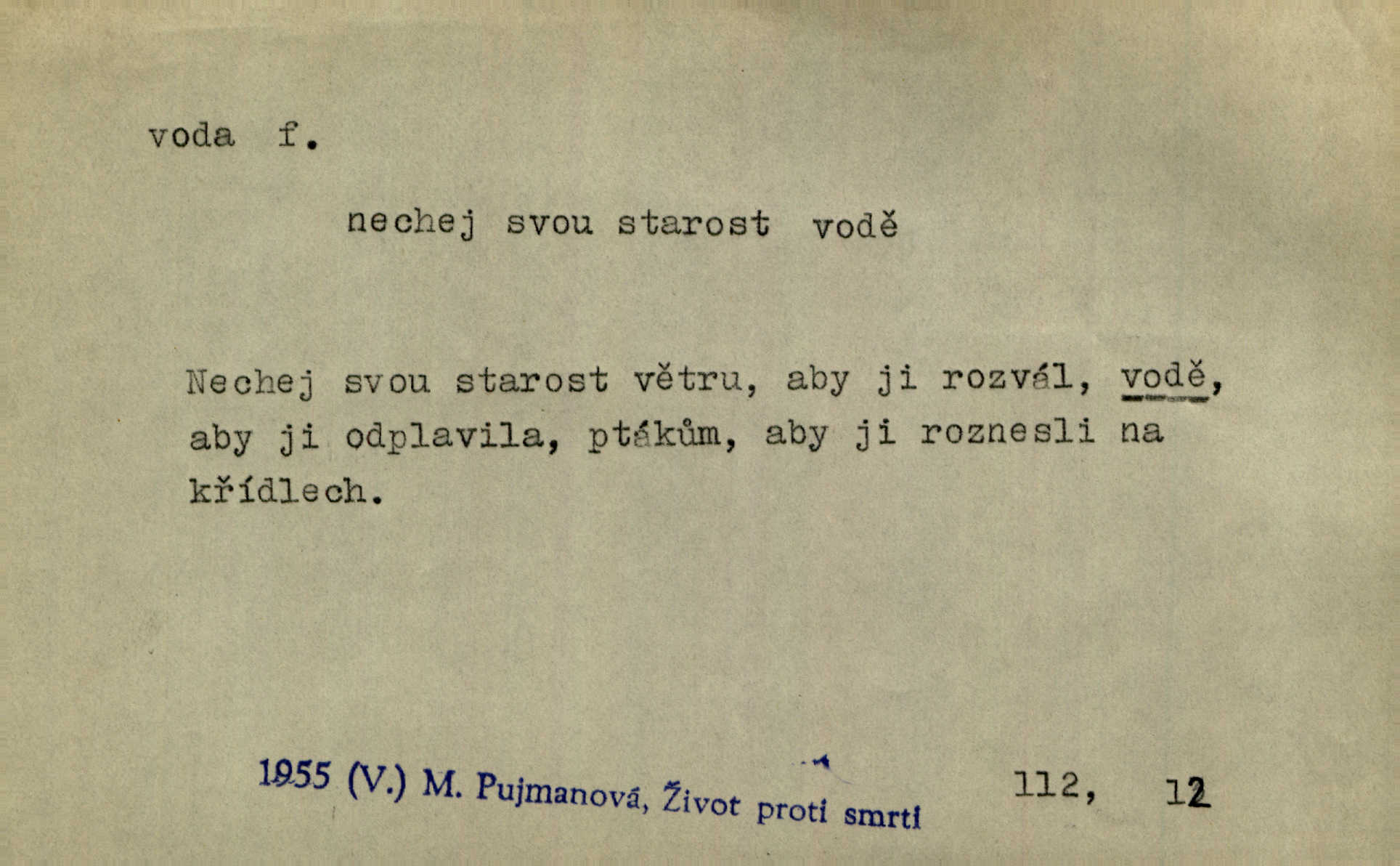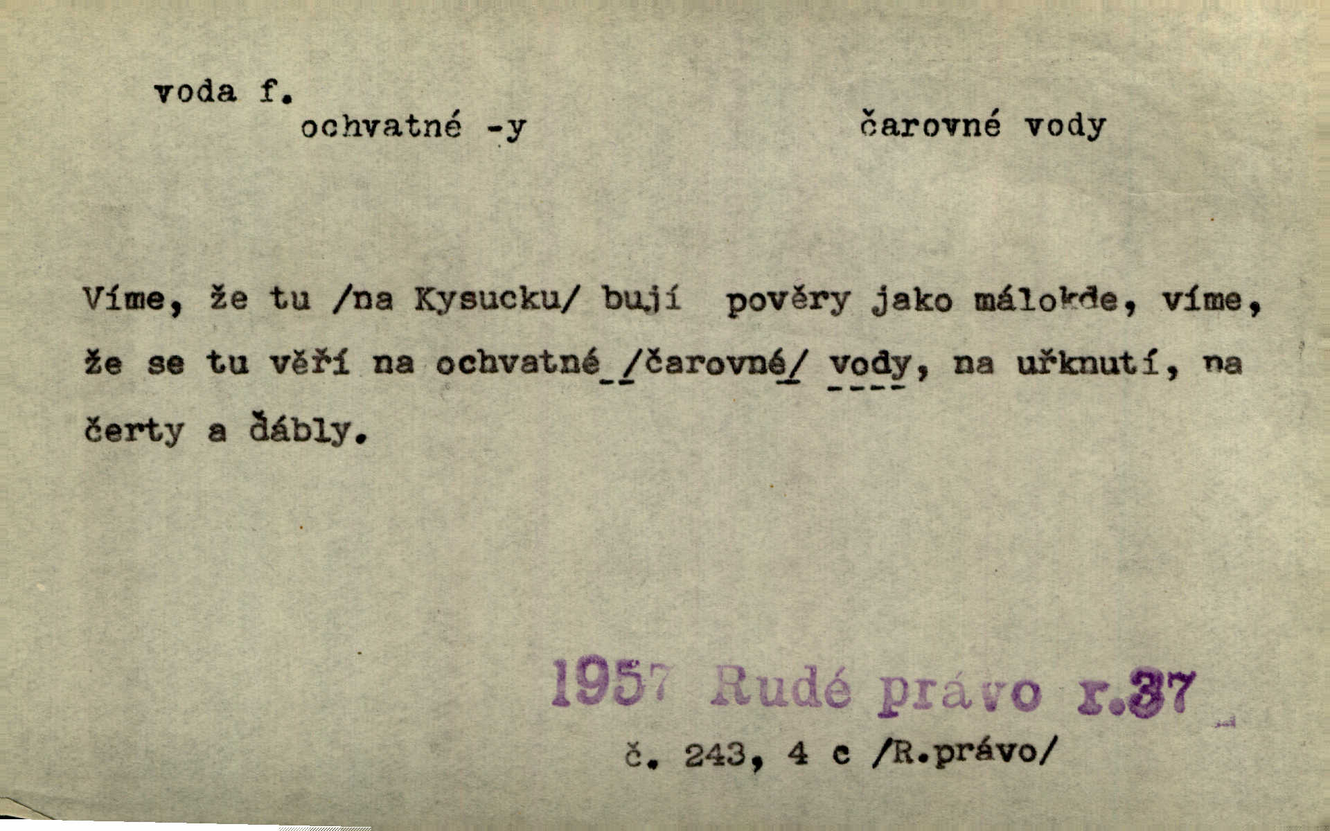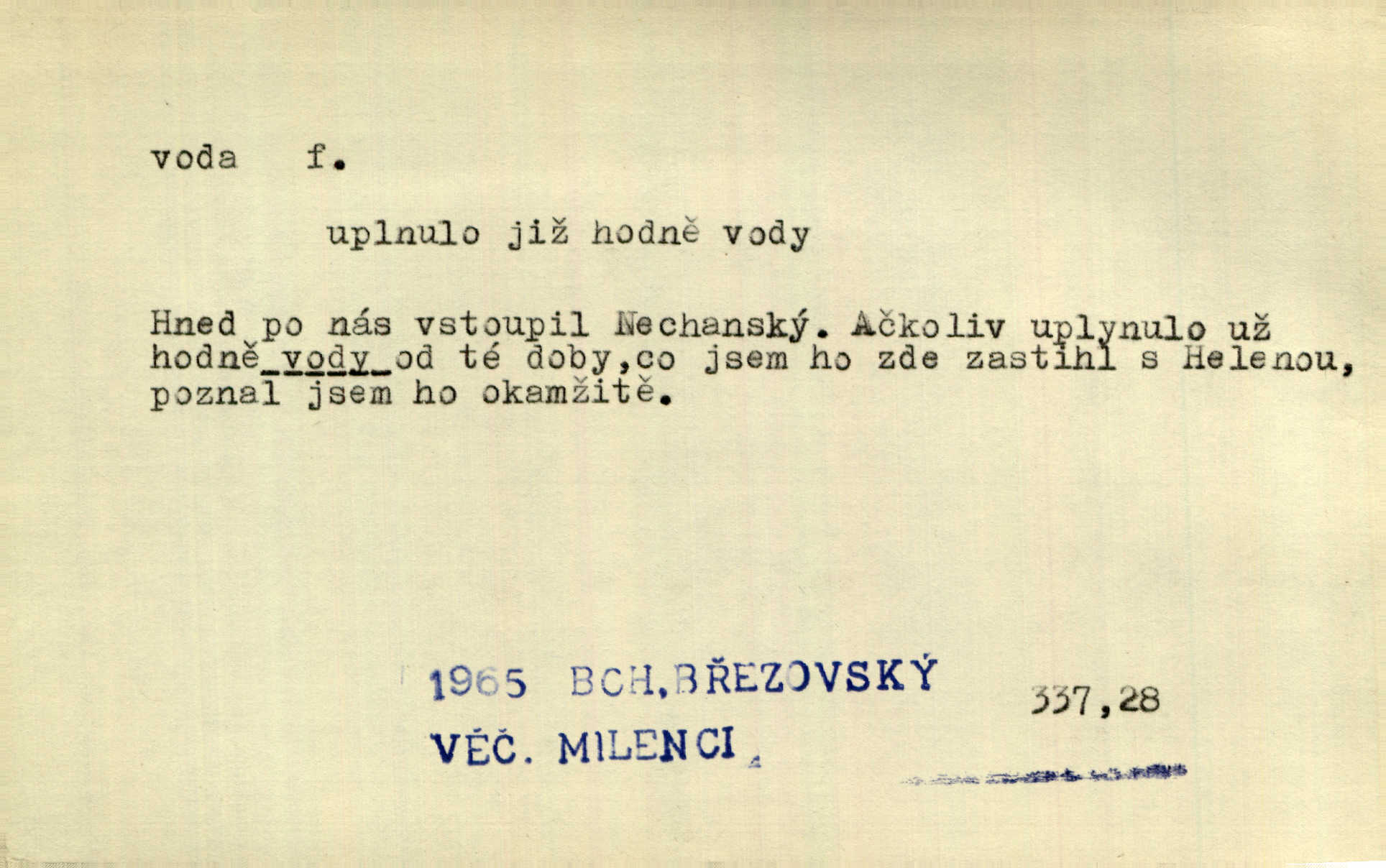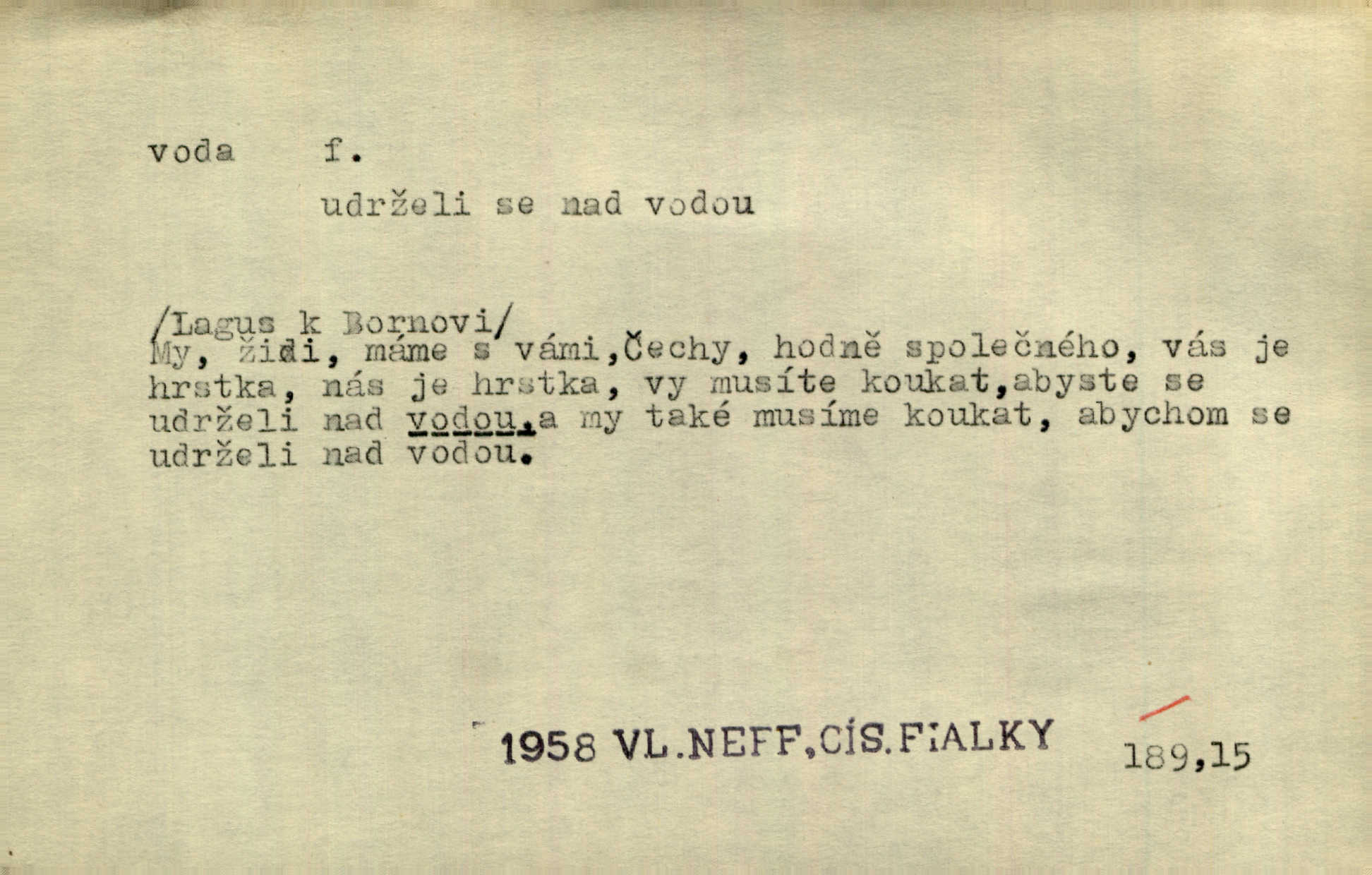 - voda, -y f. průhledná kapalina, vyskytující se jako déšť (sníh, led) n. pramenící ze země, uložená v různých přírodních nádržích a sloužící za základní nápoj. Vyběhnuvši na dvůr, navážila vody. Rais. Voda se už vaří a můžete hned po čaji usnout. Ner. Po mase přinesla sobě sklenici vody. Šim. Přišel čas, kdy došla [na lodi] sladká voda pitná. Dyk. [Řeka] je nějak zachmouřená. Spadla někde voda dešť. V. Mrš. A v dáli Eufrat své sivé vody valí bez hluku jak řeka smrti vlny. Mach. Ráda kočka ryby jí, ale do vody se jí nechce. Přísl. Tak dlouho se chodí s hrnečkem pro vodu, až se ucho utrhne všecko má své následky. Přísl. Není ostýchavý a nesmělý: ryba přišla do vody je ve svém živlu. Hol. Krev není voda. Přísl. Řeč se mluví a voda teče něco nemá závažnosti. Přísl. Inu, voda se pije a řeč se mluví. Bozd. Je [syn] jako voda v koši nestálý. Poláč. Jen nesmíš zapomjet, že von je stálej jako voda v saku. Lid. nov. U mladého jsou peníze jako voda v koši hned je utratí. Jir. Neřekl nic a vytratil se jako voda z koše. Jir. Plynou peníze jako voda skrz prsty snadno se utratí. Ner. Celý den jsem jako na vodě, z pláče nevycházím. Rais. Karla zůstala, jako by ji polil studenou vodou zaražena. Štol. Všichni tu stáli, jako by je polil horkou vodou. Hál. Byly na sebe jak oheň a voda nesnesly se. Herb. Po čtyřnedělním pátrání vyšla skutečně pravda na světlo jako olej na vodu zřetelně, jasně. Herb. Bylo tam řečí jako vody mnoho. Vrba. I lidé nadělají řečí jako vody. Rais. Je tu tak potřebný jako voda velmi. Svět. Jsme my ženy sobě podobny jako voda k dešti. Šmil. Stála průhledná jako voda úplně. Hol. Já byl střízliv jako džbánek vody. Šmil. Žoli jako by se byl do vody propadl zmizel beze stopy. Čech. Jako by se nad ním voda zavřela. Šim. Byl stále jako na vodě nejistý, neklidný. Rais. Mám dneska žaludek jako na vodě podrážděný. J. Tom. V dalších dnech se chodník pod botami poddával, chodci „šli jako na vodě“ nejistě. Techn. obz. Spala ještě jako na nepokojné vodě. Šmil. [Říkala o zubech,] že je už má jako na vodě viklavé. Šim. [Bříza] rostla jako z vody a brzo přerostla všecky smrčky bujně. Vrba. Byli dvojčata a rostli jako z vody. Herb. Měl jedinou dceru Gábinku, dívku jako z vody vyrostlou ztepilou. Šmil. Dni utíkaly jako voda rychle. Jir. Léta ubíhají jako vlny po vodě. Šmil. Spal jsem celou noc, jakoby mne do vody hodil tvrdě. Jir. Inu pan doktor je pevná hlava a hodí se do těch časů jako ryba do vody dobře. O. Červ. Ve dveřích, jak ji [rakev] vynášeli, se na ní zaleskly kapky svěcené vody posvěcené církevním obřadem. Til. Svěcení „tříkrálové vody“. Cin. A teď mu ani svěcená voda nepomůže nic, nikdo. Vrba. Uvidíš časem, že bude třeba, abys měla svěcenou vodu v žilách místo krve velkou trpělivost. Šmil. Neruda vznášel se tu vždycky [při humoru] nad vodami vyhnul se všednosti. Vrch. [Žurnalista] musí nové prameny pro svůj časopis hledat, neboť by jeho čtenářstvo mnoho vody nesneslo banalit. Ner. „Kočku,“ vykřikla paní Včeličková [hádajíc, co jí muž přinese]. „Samá voda,“ smál jsem se vesele jsi daleko od pravdy (cíle). Lid. nov. Menší děti měly oči na vodě plakaly. J. Šír. Tolik dokladů měl, že ho mohl utopit na lžíci vody velmi snadno. Vrba. Socialistu by na lžíci vody utopil. Zápot. Na koho si zasedla, byla by jej na lžíci vody utopila. Pitt. Kdo má cit v těle, ani vám vody nepodá nebude mít nejmenší úctu. Šmil. Tito koníčci by na příklad hanáckým „vody podat nesměli“ nevyrovnali se. Herb. Do konce června t. r. bude ústava z první vody projednána zhruba, v hlavních rysech. Svob. nov. Zašlete mi novellu svou třeba jen z první vody napsanou. Svět. Hrál jsem symfonii z jedné vody načisto z listu, bez nácviku. Smet. Domácí povinnosti vykonány z jedné vody na čisto najednou, bez okolků. Kun. [V úvodníku] bylo práno špinavé prádlo páně purkmistrovo z jedné vody na čisto činnost důkladně probírána. Vrba. Měli svatbu najednou, aby se to vypralo jednou vodou odbylo najednou. Kosm. Mnoho práce bude potřebí, než budeme moci říci, že jsme již opravdu z vody venku z nejhoršího. R. právo. Machno se zrovna do vody propadl zmizel beze stopy. Maj. Stalo se — nestalo, padlo do vody a bylo dobře zapomnělo se. Herrm. Potřebuješ mě vždycky, když ti teče voda do bot jsi v nesnázích. Branald. My začínáme vařit z vody žijeme skromně. Práce. No, kalí to nebylo, chudý lidi vařej z vody mají chudá jídla. Kubín. Bylo to ohromné plácnutí do vody nicotný čin, zbytečnost. K. Čap. Purkmistr mu prorokoval, že bude vodu řešetem nabírat, omluvil se a odešel dělat marnou práci. Baar. Blázen, kdo vodu řešetem měří. Čech. Tedy nemá nazbyt peněz, ale chce honit vodu dělat dojem. K. Čap. Jistě by neopomněli poznamenat, že bych v nich [rukavičkách] mohl i „honit vodu“ dělati šviháka. Svob. nov. Bude vám na prospěch, když vám v „Pražském sportu“ udělám trochu vody reklamu. Böhn. Uhlídá pan direktor, jakou zvednu vodu způsobím rozruch. Štech. A co ti lidé mají? Vždyť nikomu vody nekalím neubližuji. Herb. Po lidských žlabech kalná voda teče lidé rádi pomlouvají. Přísl. Byla to sebranka, lidé, kteří chtějí lovit v kalných vodách těžiti ze situace. Dyk. Postihla jeho rozpaky, a to byla voda na její mlýn velmi se jí to hodilo. Herrm. Nesprávná politika hnala přímo vodu na mlýn hlinkovských zrádců prospívala jim. R. právo. Nač hnáti vodu cizí na kola? Vrch. Noviny varovaly ministry naše, že nadhánějí vodu jen na mlýn pruský. Herb. Udržoval s napětím pozornosti hovor nad vodou plynulý rozhovor. Schein. Jen ponižující vydávání h