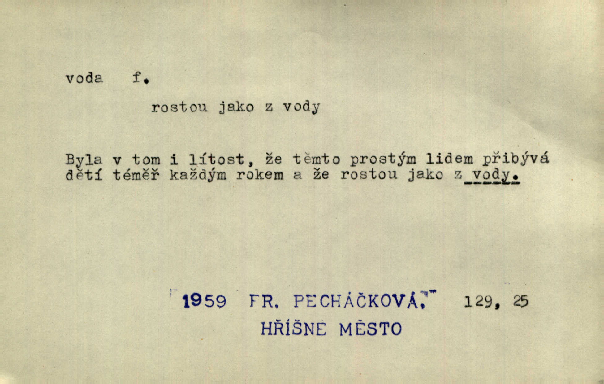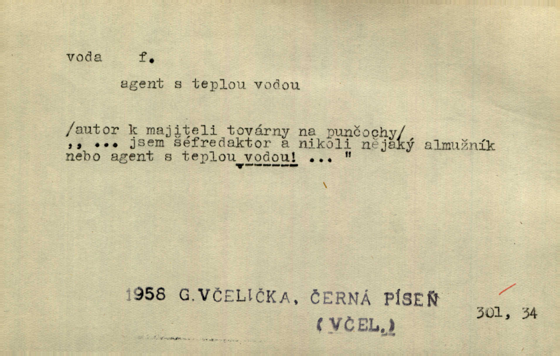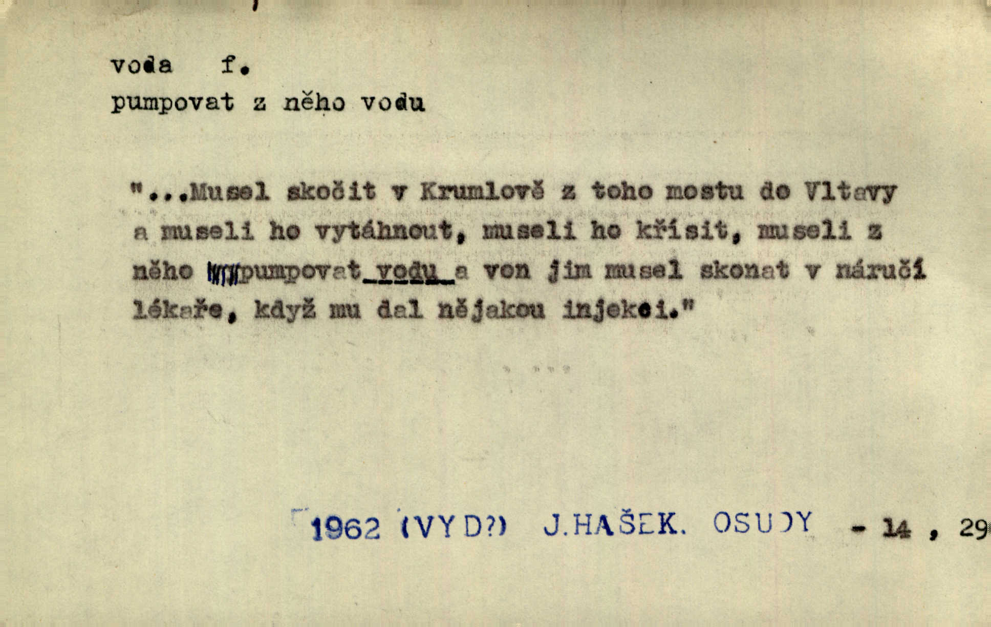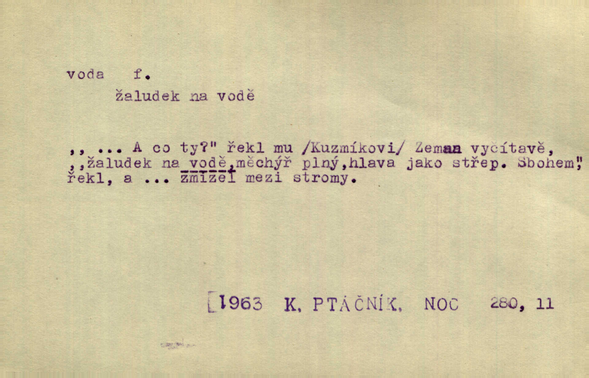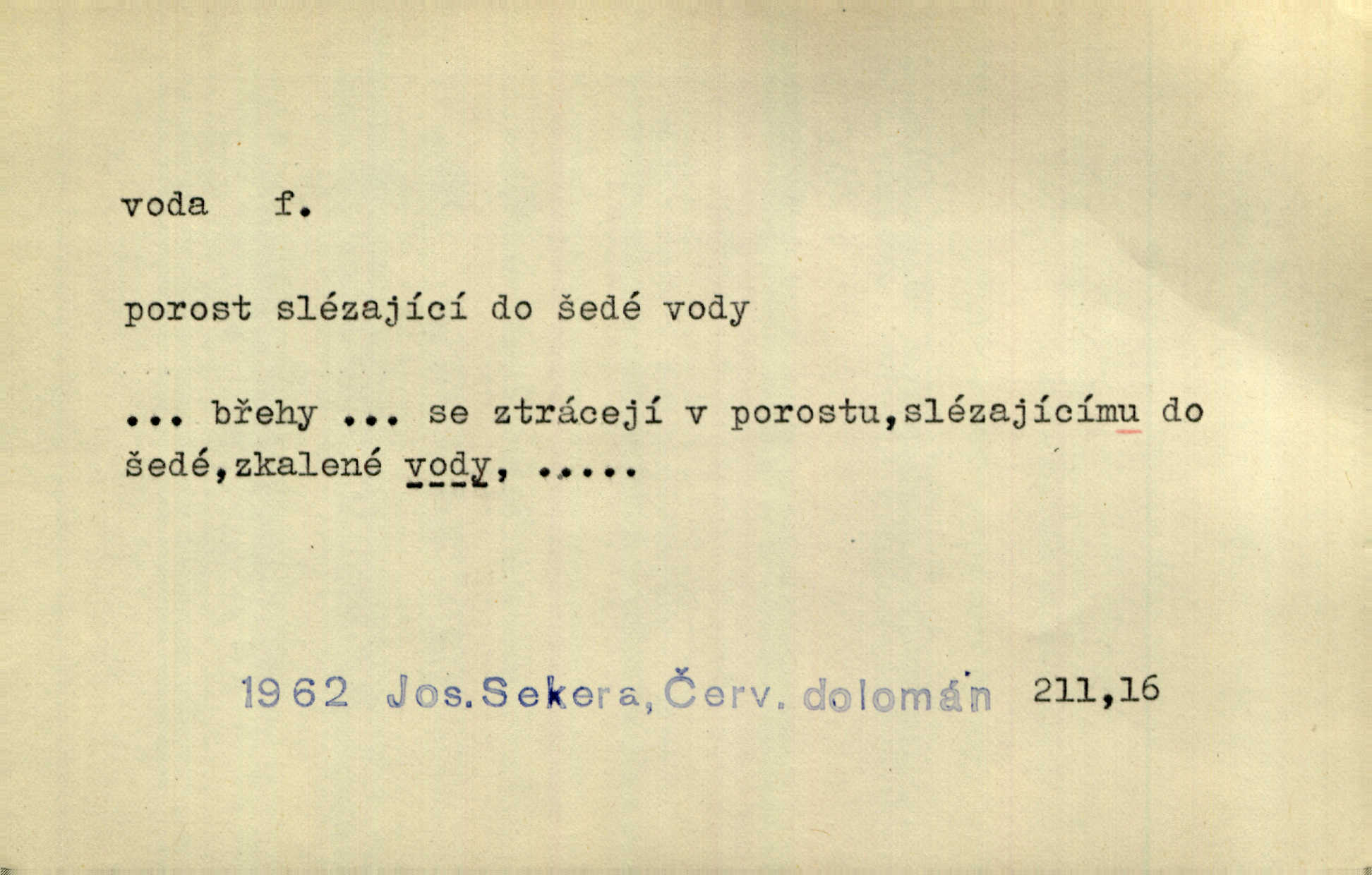 - voda, -y f. průhledná kapalina, vyskytující se jako déšť (sníh, led) n. pramenící ze země, uložená v různých přírodních nádržích a sloužící za základní nápoj. Vyběhnuvši na dvůr, navážila vody. Rais. Voda se už vaří a můžete hned po čaji usnout. Ner. Po mase přinesla sobě sklenici vody. Šim. Přišel čas, kdy došla [na lodi] sladká voda pitná. Dyk. [Řeka] je nějak zachmouřená. Spadla někde voda dešť. V. Mrš. A v dáli Eufrat své sivé vody valí bez hluku jak řeka smrti vlny. Mach. Ráda kočka ryby jí, ale do vody se jí nechce. Přísl. Tak dlouho se chodí s hrnečkem pro vodu, až se ucho utrhne všecko má své následky. Přísl. Není ostýchavý a nesmělý: ryba přišla do vody je ve svém živlu. Hol. Krev není voda. Přísl. Řeč se mluví a voda teče něco nemá závažnosti. Přísl. Inu, voda se pije a řeč se mluví. Bozd. Je [syn] jako voda v koši nestálý. Poláč. Jen nesmíš zapomjet, že von je stálej jako voda v saku. Lid. nov. U mladého jsou peníze jako voda v koši hned je utratí. Jir. Neřekl nic a vytratil se jako voda z koše. Jir. Plynou peníze jako voda skrz prsty snadno se utratí. Ner. Celý den jsem jako na vodě, z pláče nevycházím. Rais. Karla zůstala, jako by ji polil studenou vodou zaražena. Štol. Všichni tu stáli, jako by je polil horkou vodou. Hál. Byly na sebe jak oheň a voda nesnesly se. Herb. Po čtyřnedělním pátrání vyšla skutečně pravda na světlo jako olej na vodu zřetelně, jasně. Herb. Bylo tam řečí jako vody mnoho. Vrba. I lidé nadělají řečí jako vody. Rais. Je tu tak potřebný jako voda velmi. Svět. Jsme my ženy sobě podobny jako voda k dešti. Šmil. Stála průhledná jako voda úplně. Hol. Já byl střízliv jako džbánek vody. Šmil. Žoli jako by se byl do vody propadl zmizel beze stopy. Čech. Jako by se nad ním voda zavřela. Šim. Byl stále jako na vodě nejistý, neklidný. Rais. Mám dneska žaludek jako na vodě podrážděný. J. Tom. V dalších dnech se chodník pod botami poddával, chodci „šli jako na vodě“ nejistě. Techn. obz. Spala ještě jako na nepokojné vodě. Šmil. [Říkala o zubech,] že je už má jako na vodě viklavé. Šim. [Bříza] rostla jako z vody a brzo přerostla všecky smrčky bujně. Vrba. Byli dvojčata a rostli jako z vody. Herb. Měl jedinou dceru Gábinku, dívku jako z vody vyrostlou ztepilou. Šmil. Dni utíkaly jako voda rychle. Jir. Léta ubíhají jako vlny po vodě. Šmil. Spal jsem celou noc, jakoby mne do vody hodil tvrdě. Jir. Inu pan doktor je pevná hlava a hodí se do těch časů jako ryba do vody dobře. O. Červ. Ve dveřích, jak ji [rakev] vynášeli, se na ní zaleskly kapky svěcené vody posvěcené církevním obřadem. Til. Svěcení „tříkrálové vody“. Cin. A teď mu ani svěcená voda nepomůže nic, nikdo. Vrba. Uvidíš časem, že bude třeba, abys měla svěcenou vodu v žilách místo krve velkou trpělivost. Šmil. Neruda vznášel se tu vždycky [při humoru] nad vodami vyhnul se všednosti. Vrch. [Žurnalista] musí nové prameny pro svůj časopis hledat, neboť by jeho čtenářstvo mnoho vody nesneslo banalit. Ner. „Kočku,“ vykřikla paní Včeličková [hádajíc, co jí muž přinese]. „Samá voda,“ smál jsem se vesele jsi daleko od pravdy (cíle). Lid. nov. Menší děti měly oči na vodě plakaly. J. Šír. Tolik dokladů měl, že ho mohl utopit na lžíci vody velmi snadno. Vrba. Socialistu by na lžíci vody utopil. Zápot. Na koho si zasedla, byla by jej na lžíci vody utopila. Pitt. Kdo má cit v těle, ani vám vody nepodá nebude mít nejmenší úctu. Šmil. Tito koníčci by na příklad hanáckým „vody podat nesměli“ nevyrovnali se. Herb. Do konce června t. r. bude ústava z první vody projednána zhruba, v hlavních rysech. Svob. nov. Zašlete mi novellu svou třeba jen z první vody napsanou. Svět. Hrál jsem symfonii z jedné vody načisto z listu, bez nácviku. Smet. Domácí povinnosti vykonány z jedné vody na čisto najednou, bez okolků. Kun. [V úvodníku] bylo práno špinavé prádlo páně purkmistrovo z jedné vody na čisto činnost důkladně probírána. Vrba. Měli svatbu najednou, aby se to vypralo jednou vodou odbylo najednou. Kosm. Mnoho práce bude potřebí, než budeme moci říci, že jsme již opravdu z vody venku z nejhoršího. R. právo. Machno se zrovna do vody propadl zmizel beze stopy. Maj. Stalo se — nestalo, padlo do vody a bylo dobře zapomnělo se. Herrm. Potřebuješ mě vždycky, když ti teče voda do bot jsi v nesnázích. Branald. My začínáme vařit z vody žijeme skromně. Práce. No, kalí to nebylo, chudý lidi vařej z vody mají chudá jídla. Kubín. Bylo to ohromné plácnutí do vody nicotný čin, zbytečnost. K. Čap. Purkmistr mu prorokoval, že bude vodu řešetem nabírat, omluvil se a odešel dělat marnou práci. Baar. Blázen, kdo vodu řešetem měří. Čech. Tedy nemá nazbyt peněz, ale chce honit vodu dělat dojem. K. Čap. Jistě by neopomněli poznamenat, že bych v nich [rukavičkách] mohl i „honit vodu“ dělati šviháka. Svob. nov. Bude vám na prospěch, když vám v „Pražském sportu“ udělám trochu vody reklamu. Böhn. Uhlídá pan direktor, jakou zvednu vodu způsobím rozruch. Štech. A co ti lidé mají? Vždyť nikomu vody nekalím neubližuji. Herb. Po lidských žlabech kalná voda teče lidé rádi pomlouvají. Přísl. Byla to sebranka, lidé, kteří chtějí lovit v kalných vodách těžiti ze situace. Dyk. Postihla jeho rozpaky, a to byla voda na její mlýn velmi se jí to hodilo. Herrm. Nesprávná politika hnala přímo vodu na mlýn hlinkovských zrádců prospívala jim. R. právo. Nač hnáti vodu cizí na kola? Vrch. Noviny varovaly ministry naše, že nadhánějí vodu jen na mlýn pruský. Herb. Udržoval s napětím pozornosti hovor nad vodou plynulý rozhovor. Schein. Jen ponižující vydávání h