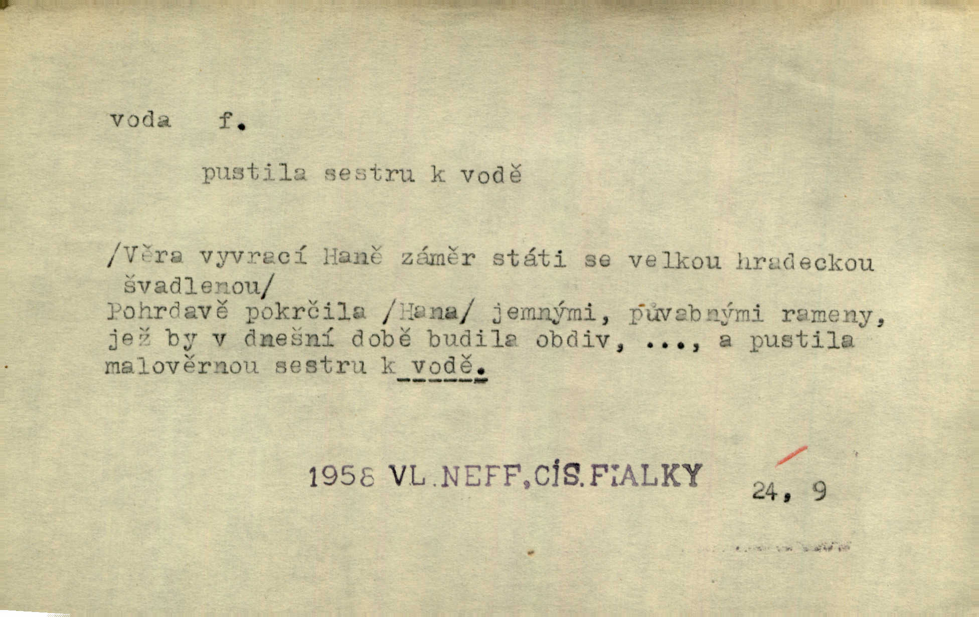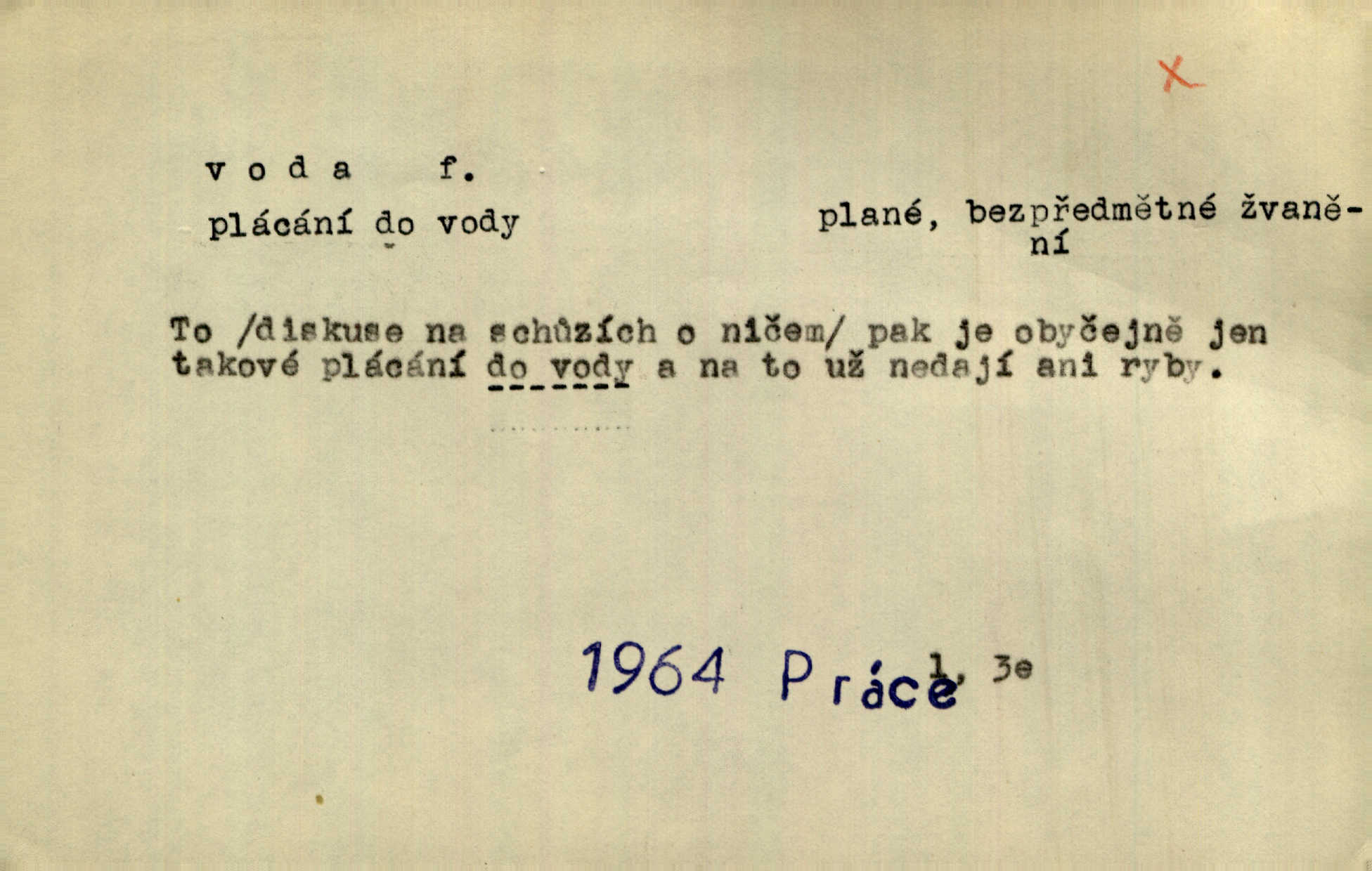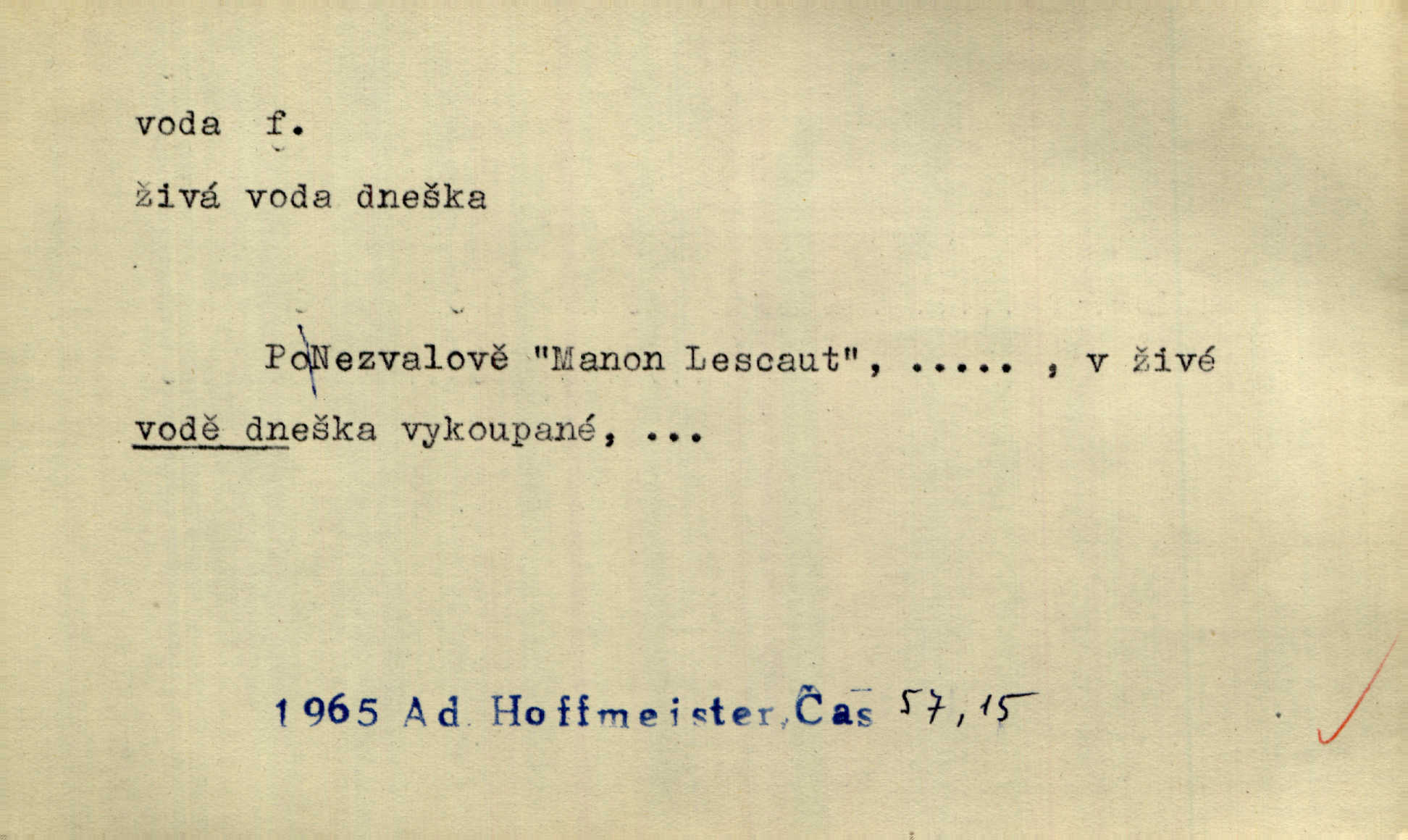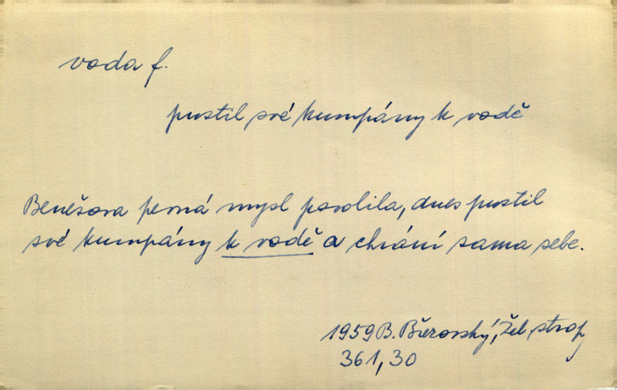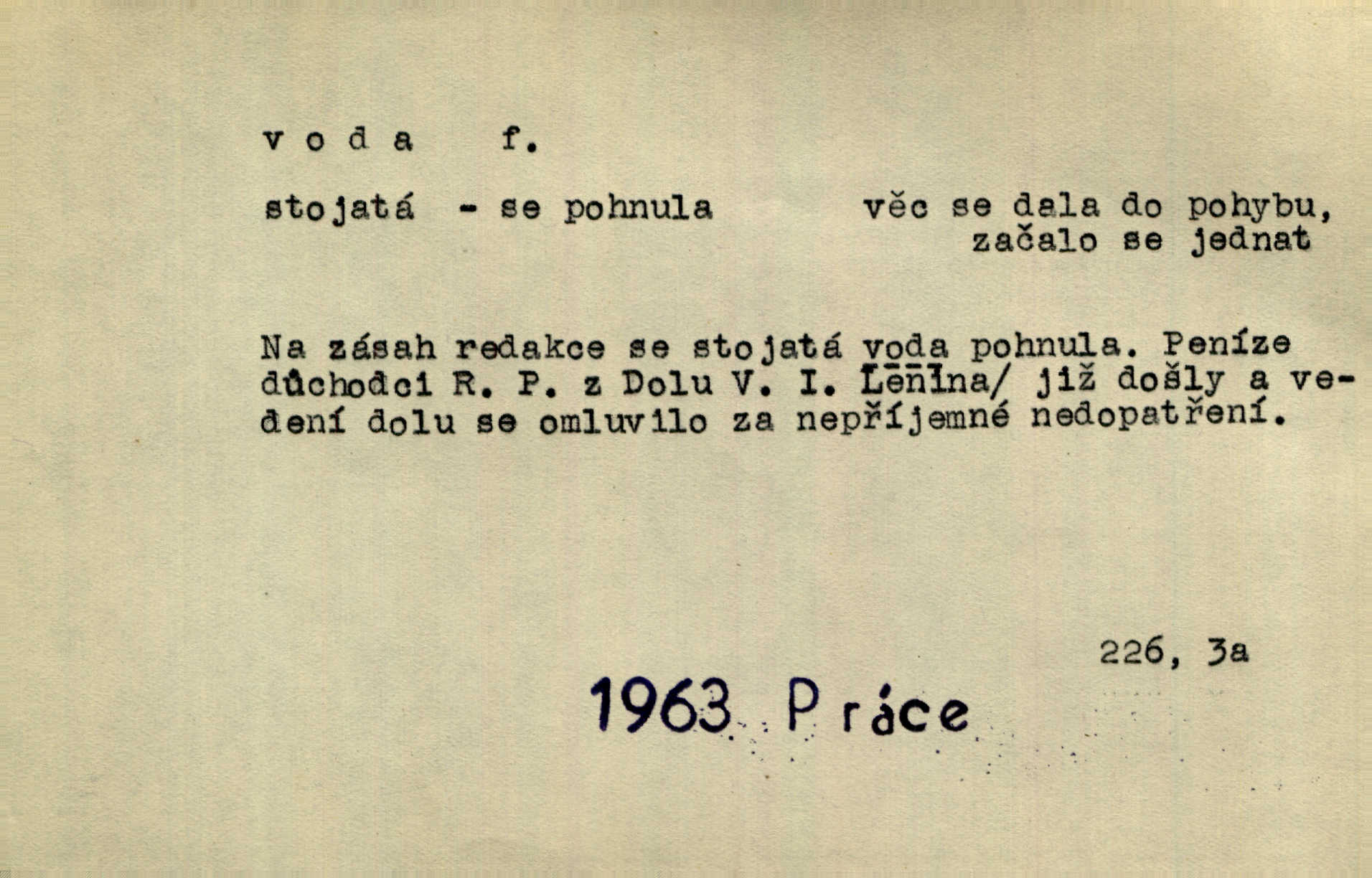 - voda, -y f. průhledná kapalina, vyskytující se jako déšť (sníh, led) n. pramenící ze země, uložená v různých přírodních nádržích a sloužící za základní nápoj. Vyběhnuvši na dvůr, navážila vody. Rais. Voda se už vaří a můžete hned po čaji usnout. Ner. Po mase přinesla sobě sklenici vody. Šim. Přišel čas, kdy došla [na lodi] sladká voda pitná. Dyk. [Řeka] je nějak zachmouřená. Spadla někde voda dešť. V. Mrš. A v dáli Eufrat své sivé vody valí bez hluku jak řeka smrti vlny. Mach. Ráda kočka ryby jí, ale do vody se jí nechce. Přísl. Tak dlouho se chodí s hrnečkem pro vodu, až se ucho utrhne všecko má své následky. Přísl. Není ostýchavý a nesmělý: ryba přišla do vody je ve svém živlu. Hol. Krev není voda. Přísl. Řeč se mluví a voda teče něco nemá závažnosti. Přísl. Inu, voda se pije a řeč se mluví. Bozd. Je [syn] jako voda v koši nestálý. Poláč. Jen nesmíš zapomjet, že von je stálej jako voda v saku. Lid. nov. U mladého jsou peníze jako voda v koši hned je utratí. Jir. Neřekl nic a vytratil se jako voda z koše. Jir. Plynou peníze jako voda skrz prsty snadno se utratí. Ner. Celý den jsem jako na vodě, z pláče nevycházím. Rais. Karla zůstala, jako by ji polil studenou vodou zaražena. Štol. Všichni tu stáli, jako by je polil horkou vodou. Hál. Byly na sebe jak oheň a voda nesnesly se. Herb. Po čtyřnedělním pátrání vyšla skutečně pravda na světlo jako olej na vodu zřetelně, jasně. Herb. Bylo tam řečí jako vody mnoho. Vrba. I lidé nadělají řečí jako vody. Rais. Je tu tak potřebný jako voda velmi. Svět. Jsme my ženy sobě podobny jako voda k dešti. Šmil. Stála průhledná jako voda úplně. Hol. Já byl střízliv jako džbánek vody. Šmil. Žoli jako by se byl do vody propadl zmizel beze stopy. Čech. Jako by se nad ním voda zavřela. Šim. Byl stále jako na vodě nejistý, neklidný. Rais. Mám dneska žaludek jako na vodě podrážděný. J. Tom. V dalších dnech se chodník pod botami poddával, chodci „šli jako na vodě“ nejistě. Techn. obz. Spala ještě jako na nepokojné vodě. Šmil. [Říkala o zubech,] že je už má jako na vodě viklavé. Šim. [Bříza] rostla jako z vody a brzo přerostla všecky smrčky bujně. Vrba. Byli dvojčata a rostli jako z vody. Herb. Měl jedinou dceru Gábinku, dívku jako z vody vyrostlou ztepilou. Šmil. Dni utíkaly jako voda rychle. Jir. Léta ubíhají jako vlny po vodě. Šmil. Spal jsem celou noc, jakoby mne do vody hodil tvrdě. Jir. Inu pan doktor je pevná hlava a hodí se do těch časů jako ryba do vody dobře. O. Červ. Ve dveřích, jak ji [rakev] vynášeli, se na ní zaleskly kapky svěcené vody posvěcené církevním obřadem. Til. Svěcení „tříkrálové vody“. Cin. A teď mu ani svěcená voda nepomůže nic, nikdo. Vrba. Uvidíš časem, že bude třeba, abys měla svěcenou vodu v žilách místo krve velkou trpělivost. Šmil. Neruda vznášel se tu vždycky [při humoru] nad vodami vyhnul se všednosti. Vrch. [Žurnalista] musí nové prameny pro svůj časopis hledat, neboť by jeho čtenářstvo mnoho vody nesneslo banalit. Ner. „Kočku,“ vykřikla paní Včeličková [hádajíc, co jí muž přinese]. „Samá voda,“ smál jsem se vesele jsi daleko od pravdy (cíle). Lid. nov. Menší děti měly oči na vodě plakaly. J. Šír. Tolik dokladů měl, že ho mohl utopit na lžíci vody velmi snadno. Vrba. Socialistu by na lžíci vody utopil. Zápot. Na koho si zasedla, byla by jej na lžíci vody utopila. Pitt. Kdo má cit v těle, ani vám vody nepodá nebude mít nejmenší úctu. Šmil. Tito koníčci by na příklad hanáckým „vody podat nesměli“ nevyrovnali se. Herb. Do konce června t. r. bude ústava z první vody projednána zhruba, v hlavních rysech. Svob. nov. Zašlete mi novellu svou třeba jen z první vody napsanou. Svět. Hrál jsem symfonii z jedné vody načisto z listu, bez nácviku. Smet. Domácí povinnosti vykonány z jedné vody na čisto najednou, bez okolků. Kun. [V úvodníku] bylo práno špinavé prádlo páně purkmistrovo z jedné vody na čisto činnost důkladně probírána. Vrba. Měli svatbu najednou, aby se to vypralo jednou vodou odbylo najednou. Kosm. Mnoho práce bude potřebí, než budeme moci říci, že jsme již opravdu z vody venku z nejhoršího. R. právo. Machno se zrovna do vody propadl zmizel beze stopy. Maj. Stalo se — nestalo, padlo do vody a bylo dobře zapomnělo se. Herrm. Potřebuješ mě vždycky, když ti teče voda do bot jsi v nesnázích. Branald. My začínáme vařit z vody žijeme skromně. Práce. No, kalí to nebylo, chudý lidi vařej z vody mají chudá jídla. Kubín. Bylo to ohromné plácnutí do vody nicotný čin, zbytečnost. K. Čap. Purkmistr mu prorokoval, že bude vodu řešetem nabírat, omluvil se a odešel dělat marnou práci. Baar. Blázen, kdo vodu řešetem měří. Čech. Tedy nemá nazbyt peněz, ale chce honit vodu dělat dojem. K. Čap. Jistě by neopomněli poznamenat, že bych v nich [rukavičkách] mohl i „honit vodu“ dělati šviháka. Svob. nov. Bude vám na prospěch, když vám v „Pražském sportu“ udělám trochu vody reklamu. Böhn. Uhlídá pan direktor, jakou zvednu vodu způsobím rozruch. Štech. A co ti lidé mají? Vždyť nikomu vody nekalím neubližuji. Herb. Po lidských žlabech kalná voda teče lidé rádi pomlouvají. Přísl. Byla to sebranka, lidé, kteří chtějí lovit v kalných vodách těžiti ze situace. Dyk. Postihla jeho rozpaky, a to byla voda na její mlýn velmi se jí to hodilo. Herrm. Nesprávná politika hnala přímo vodu na mlýn hlinkovských zrádců prospívala jim. R. právo. Nač hnáti vodu cizí na kola? Vrch. Noviny varovaly ministry naše, že nadhánějí vodu jen na mlýn pruský. Herb. Udržoval s napětím pozornosti hovor nad vodou plynulý rozhovor. Schein. Jen ponižující vydávání h