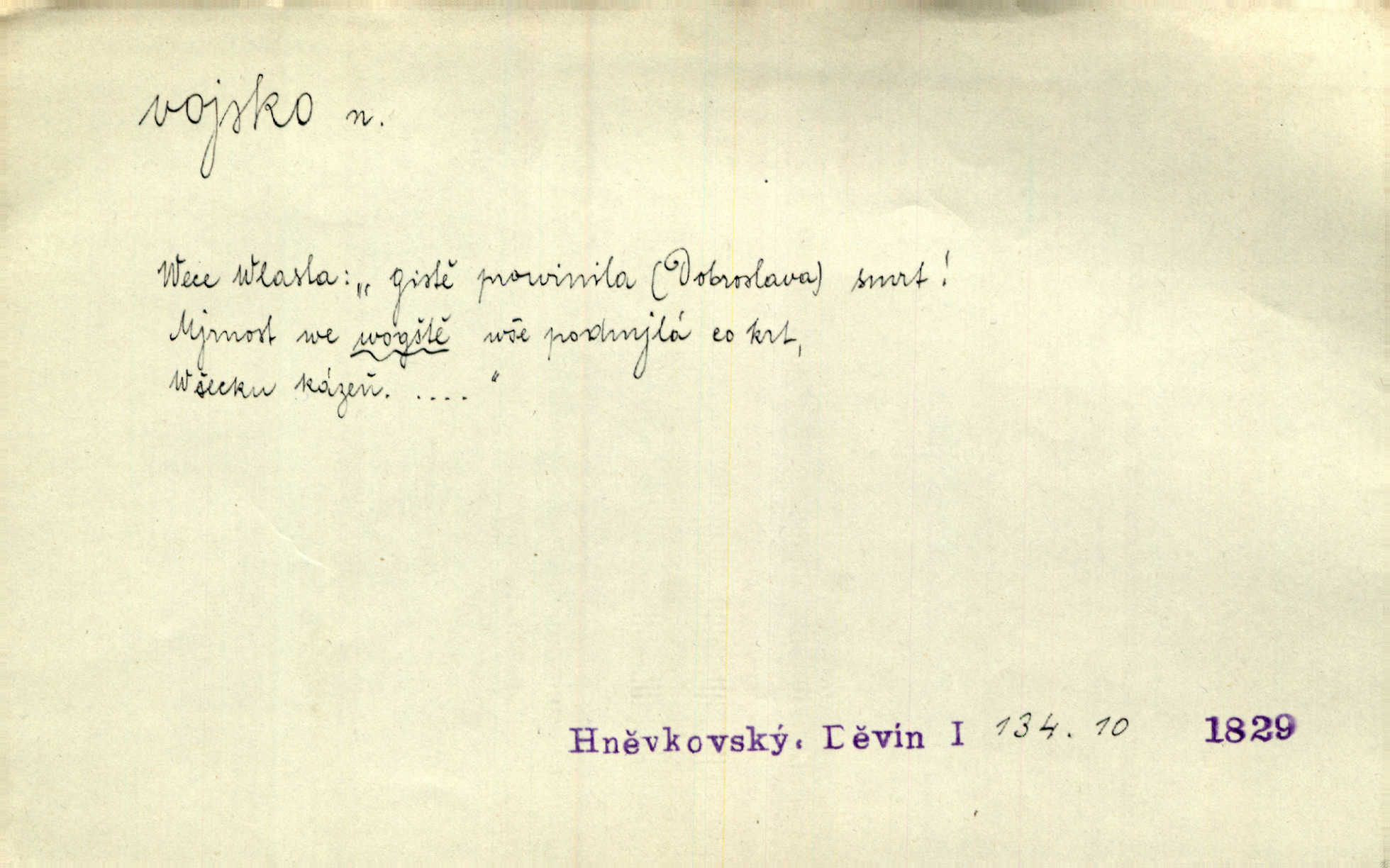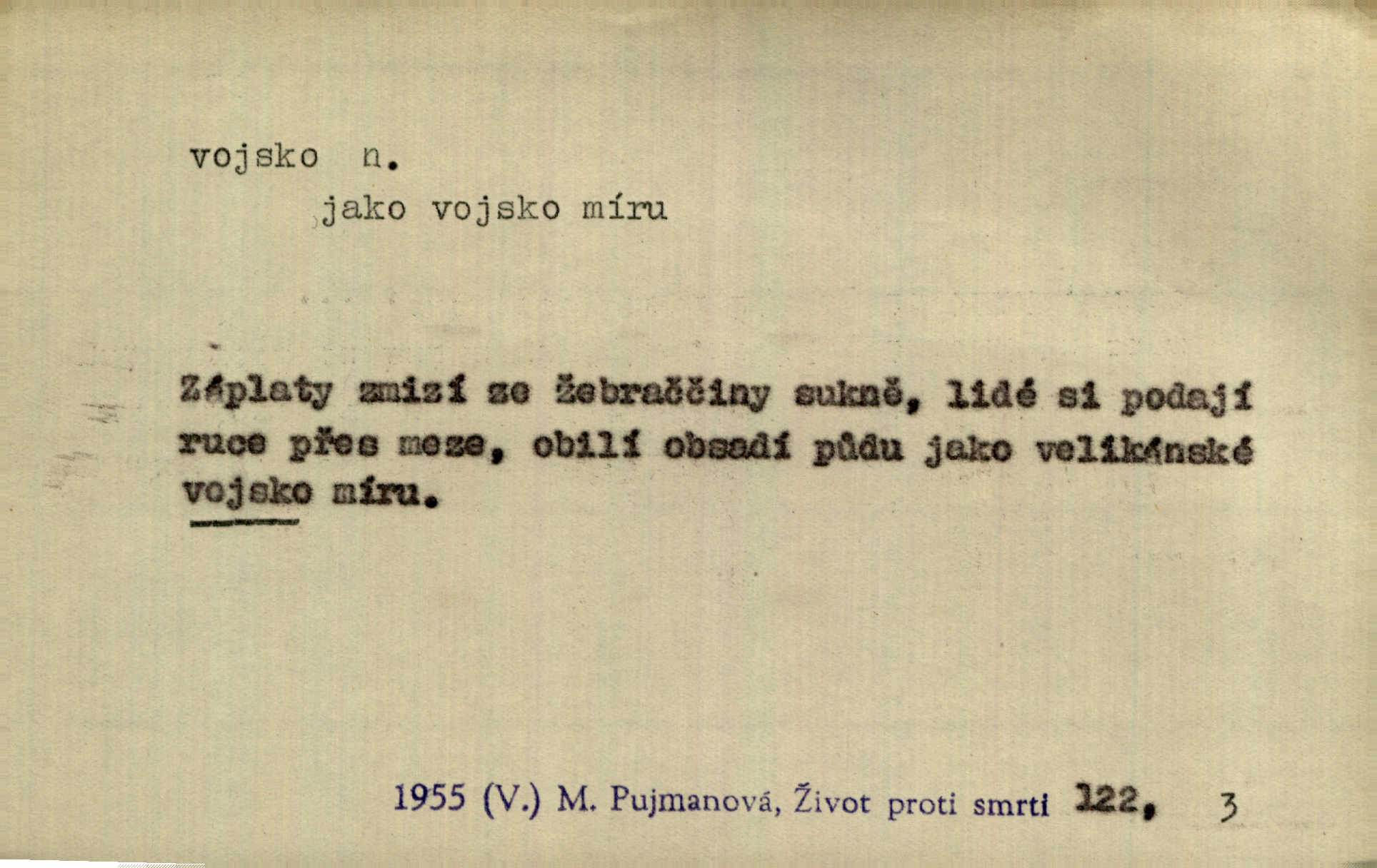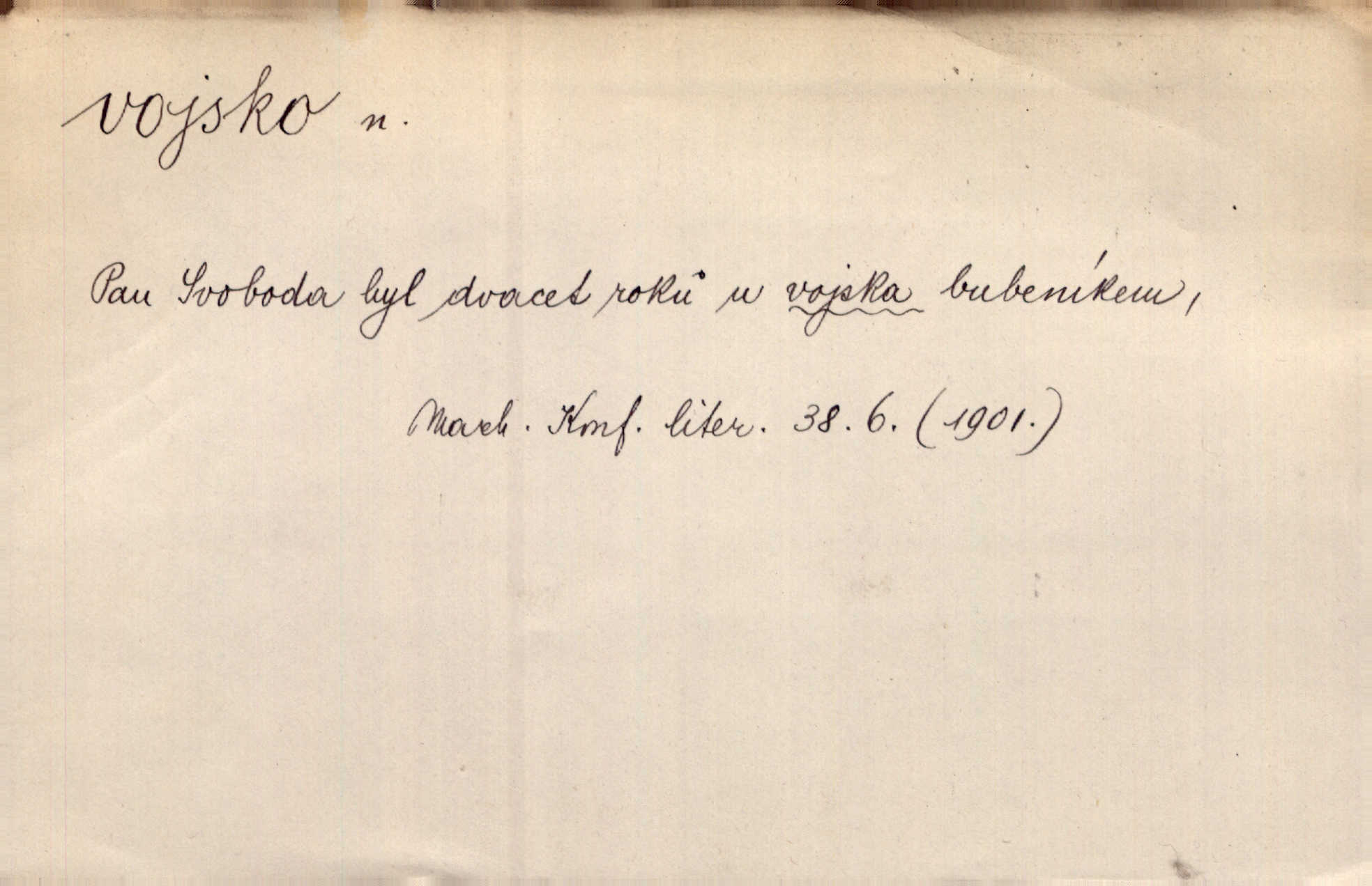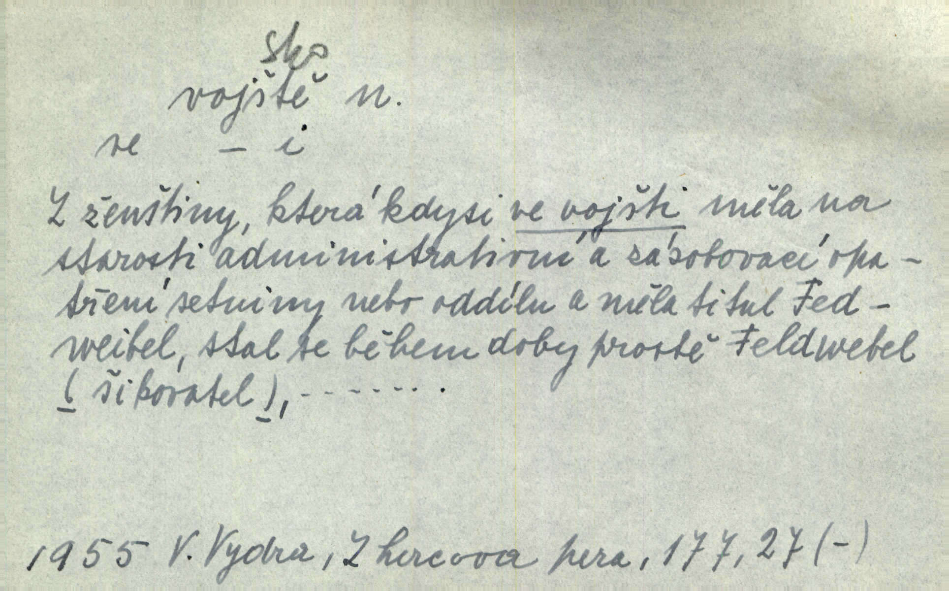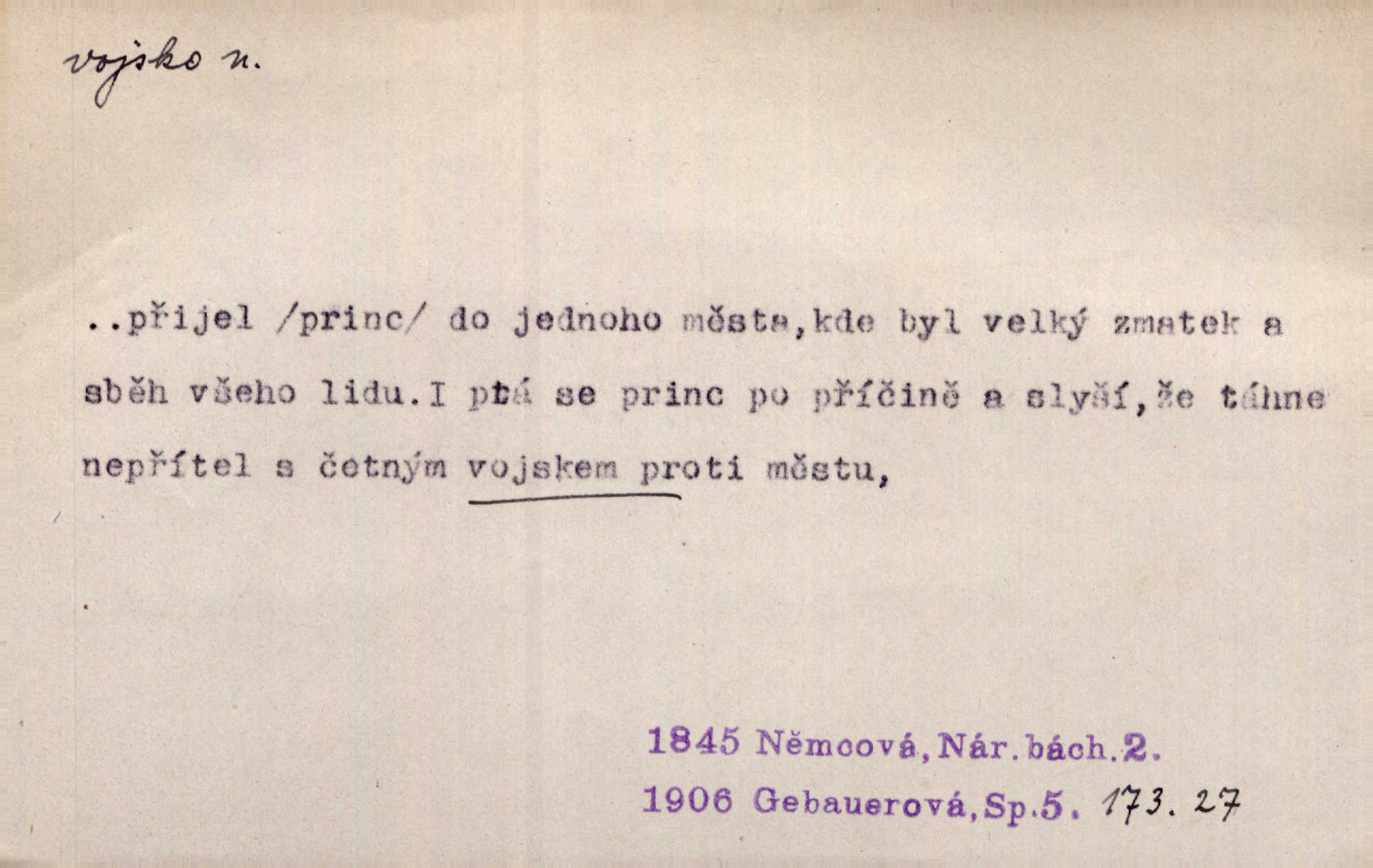 - vojsko, -a n. (6. sg. ve vojsku, zast. ve vojště; zast. vojska, -y f.) souhrn vojenských sil státu; armáda; vojáci. Můj [babiččin] nebožtík Jiří sloužil v pruském vojsku. Něm. Bylo mi asi deset let, když mého bratra k vojsku odvedli. Zey. Císař začal sbírati vojsko. Herb. Jedinou čekárnu naplnil transport vojska. K. Čap. Panenko Marja, ešče jde jiný vojsko! Jir. Ve vojště se roztahuje nahnilá půle Francie. Bozd. Tam se obraťte, tady máme vojsku na starosti a vojnu. Jir. Musilo přijít vojsko a výtržníky rozehnati. Svět. Delegace lidových vojsk dala [na Koreji] při jednáních jasně najevo [své úmysly]. Ml. fronta. Co se v něm [sedlákovi] dálo, táhlo jako nepřátelské vojsko. Hál. Přen. Na jasném nebi se rozsvěcuje vojsko bledých hvězd. V. Fiala. Voj. branná moc n. její část. Jednotlivý druh vojska (op. služeb) (pěchota, dělostřelectvo, letectvo, vojsko ženijní, spojovací, chemické, výsadkové, protiletadlové, tankové a mechanisované). Vojska n. pl. všeobecné souhrnné označení pro vojenské jednotky n. útvary. Pozemní vojska, uskupení vojsk, řízení vojsk.