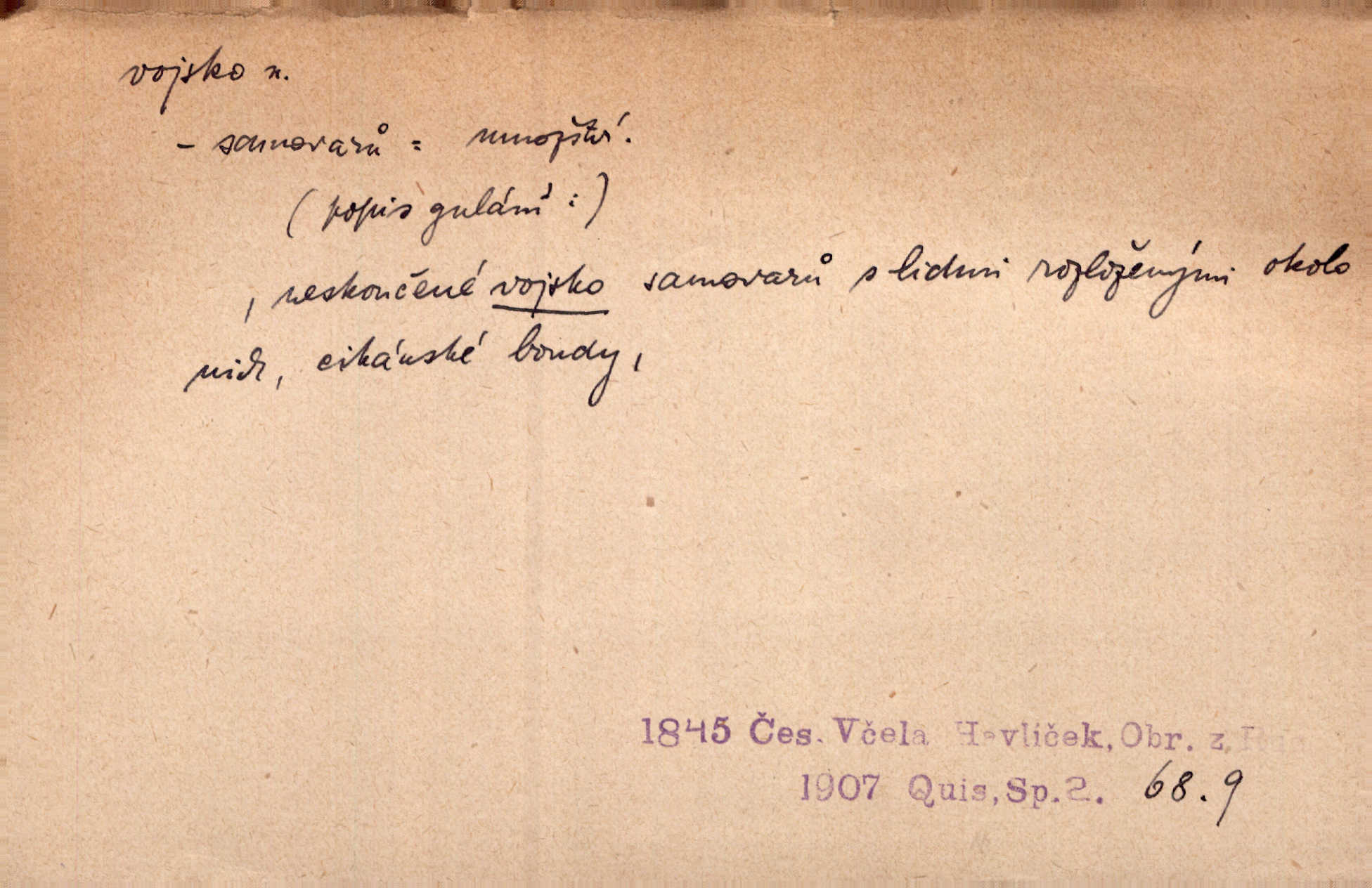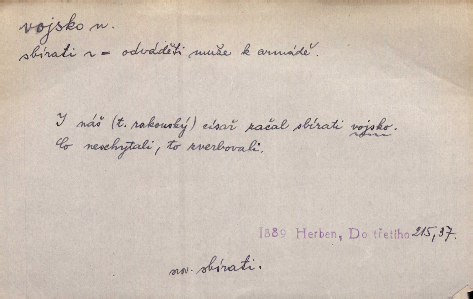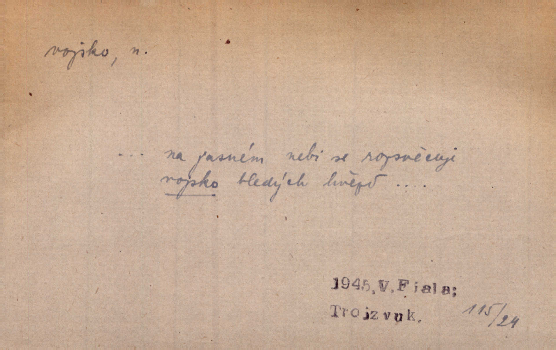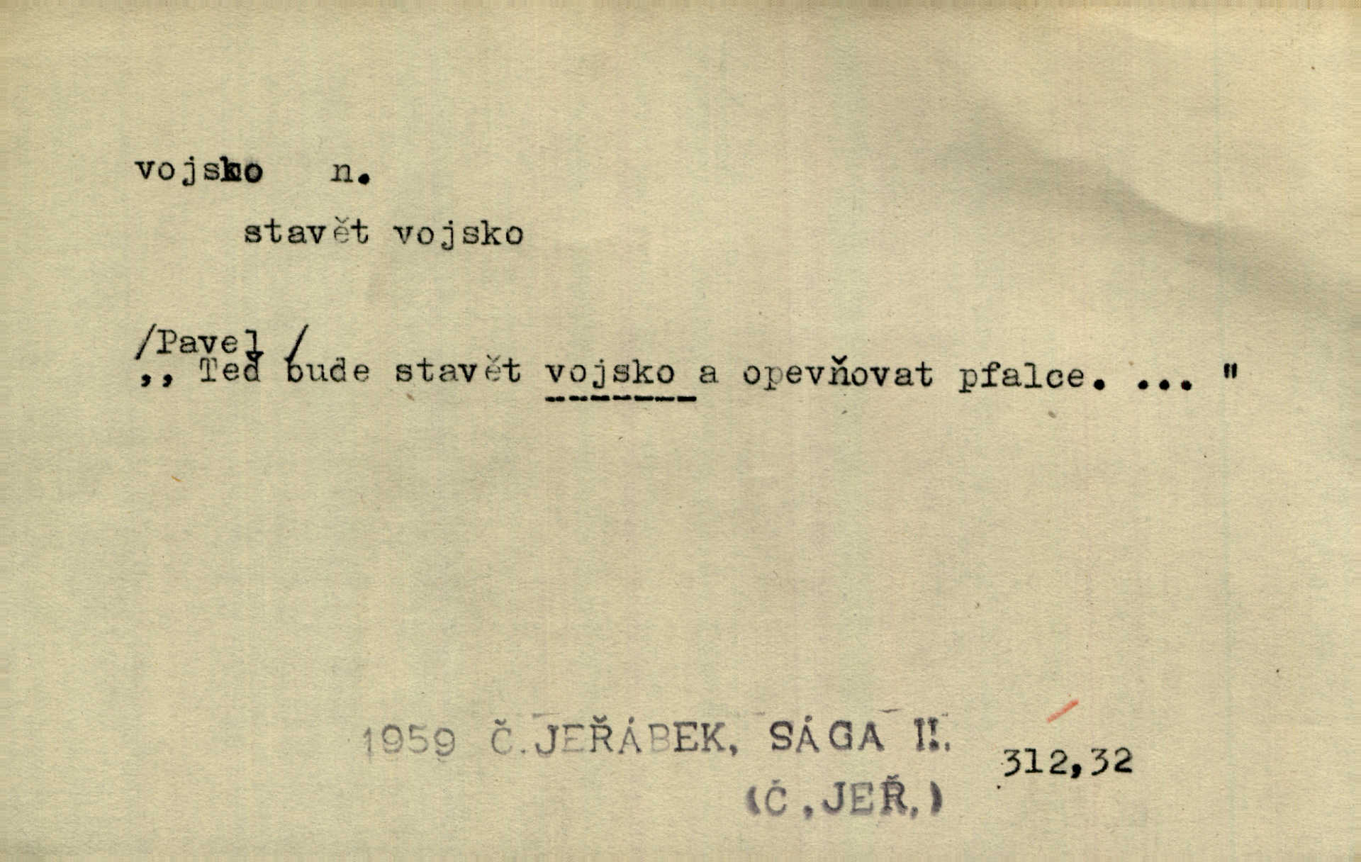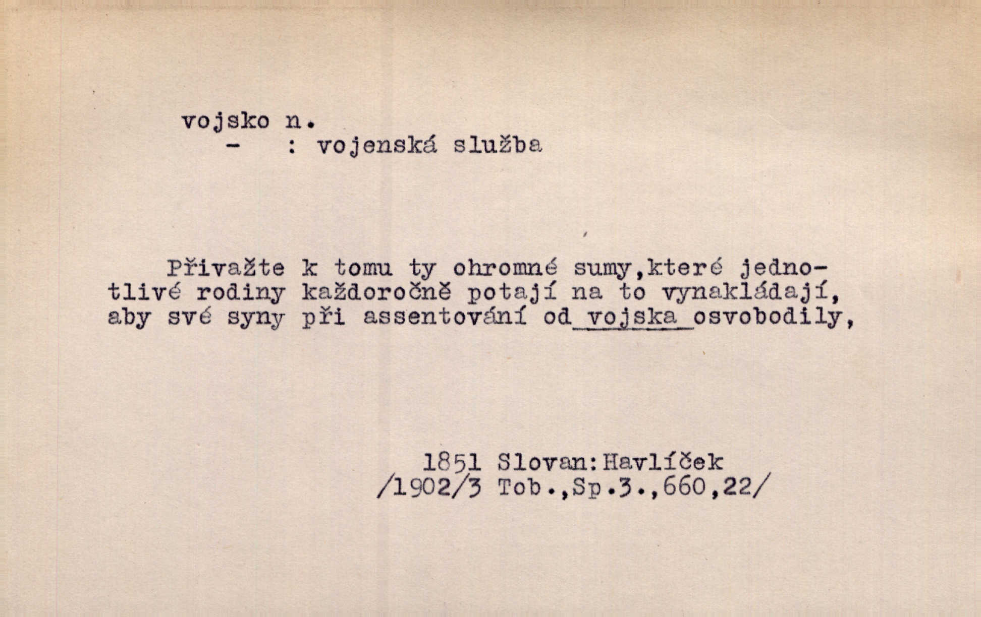 - vojsko, -a n. (6. sg. ve vojsku, zast. ve vojště; zast. vojska, -y f.) souhrn vojenských sil státu; armáda; vojáci. Můj [babiččin] nebožtík Jiří sloužil v pruském vojsku. Něm. Bylo mi asi deset let, když mého bratra k vojsku odvedli. Zey. Císař začal sbírati vojsko. Herb. Jedinou čekárnu naplnil transport vojska. K. Čap. Panenko Marja, ešče jde jiný vojsko! Jir. Ve vojště se roztahuje nahnilá půle Francie. Bozd. Tam se obraťte, tady máme vojsku na starosti a vojnu. Jir. Musilo přijít vojsko a výtržníky rozehnati. Svět. Delegace lidových vojsk dala [na Koreji] při jednáních jasně najevo [své úmysly]. Ml. fronta. Co se v něm [sedlákovi] dálo, táhlo jako nepřátelské vojsko. Hál. Přen. Na jasném nebi se rozsvěcuje vojsko bledých hvězd. V. Fiala. Voj. branná moc n. její část. Jednotlivý druh vojska (op. služeb) (pěchota, dělostřelectvo, letectvo, vojsko ženijní, spojovací, chemické, výsadkové, protiletadlové, tankové a mechanisované). Vojska n. pl. všeobecné souhrnné označení pro vojenské jednotky n. útvary. Pozemní vojska, uskupení vojsk, řízení vojsk.