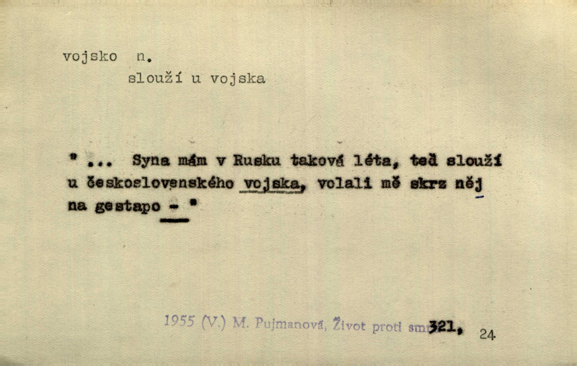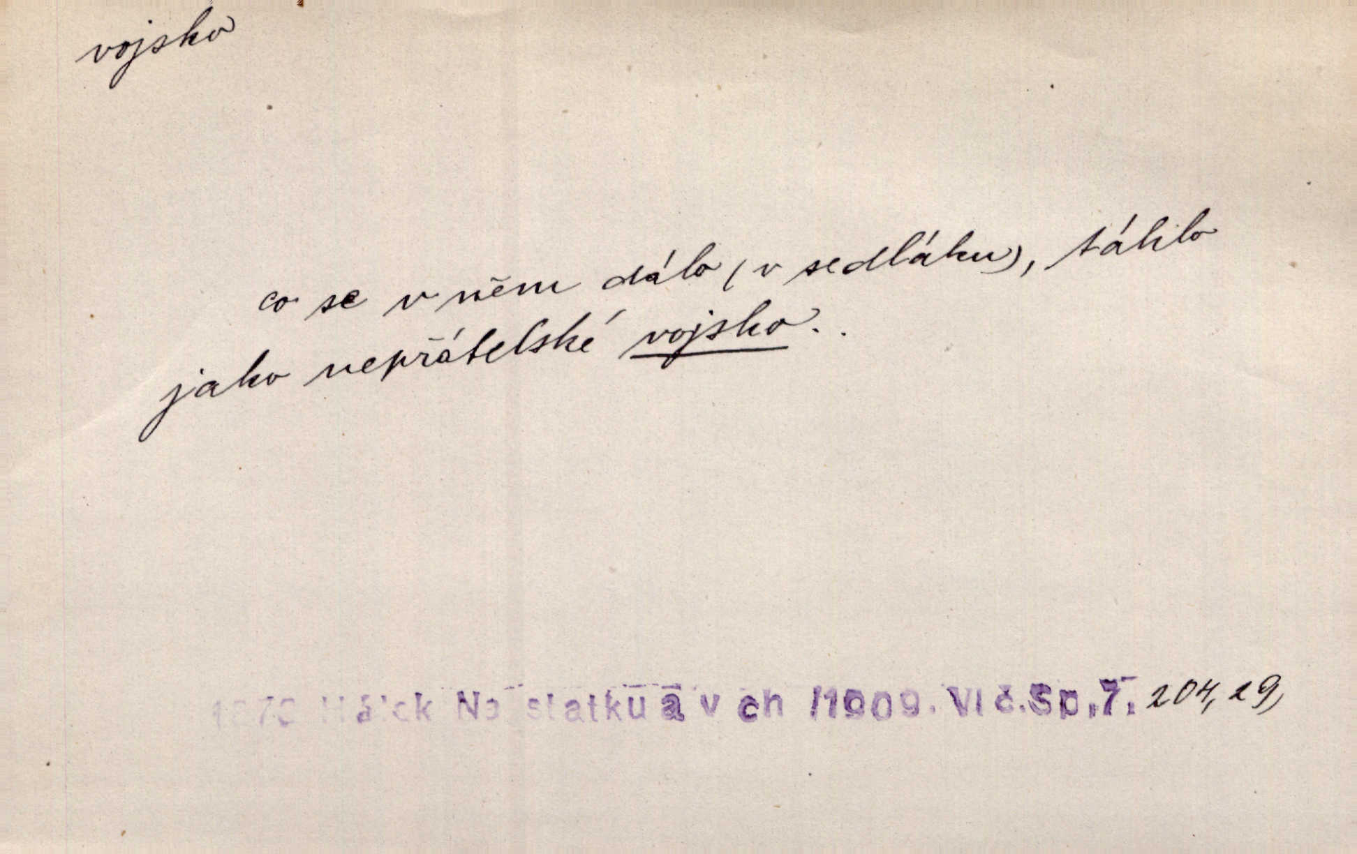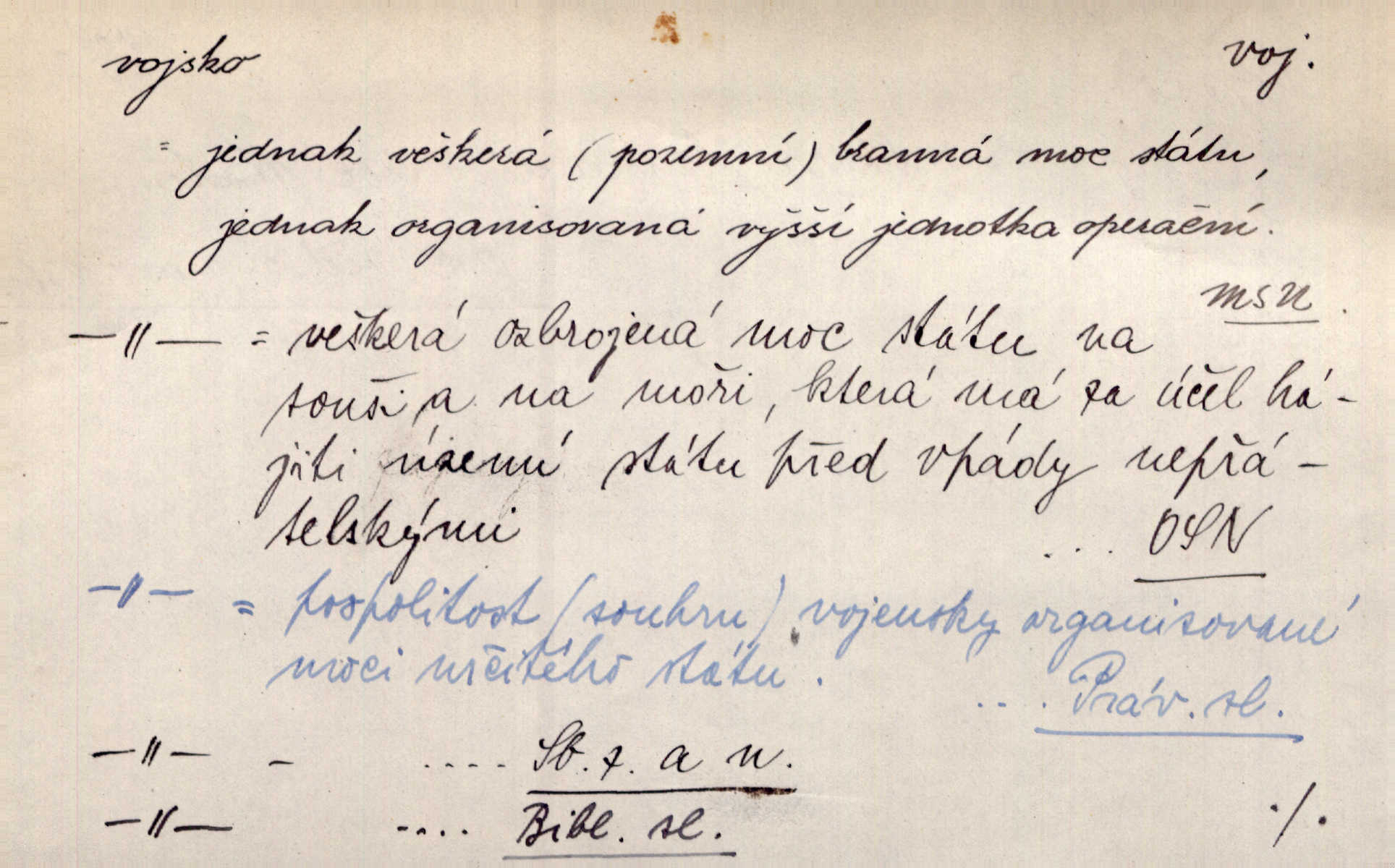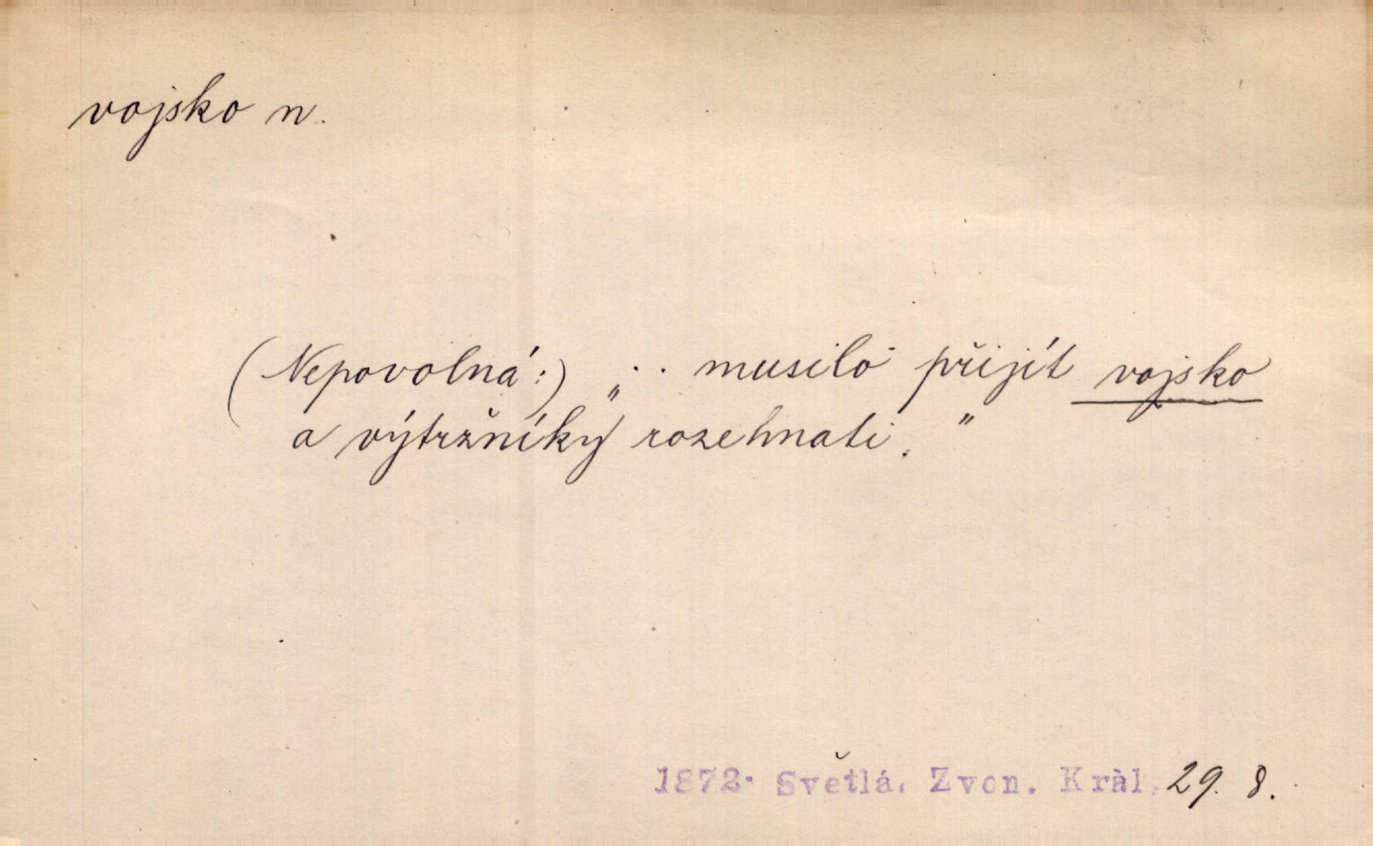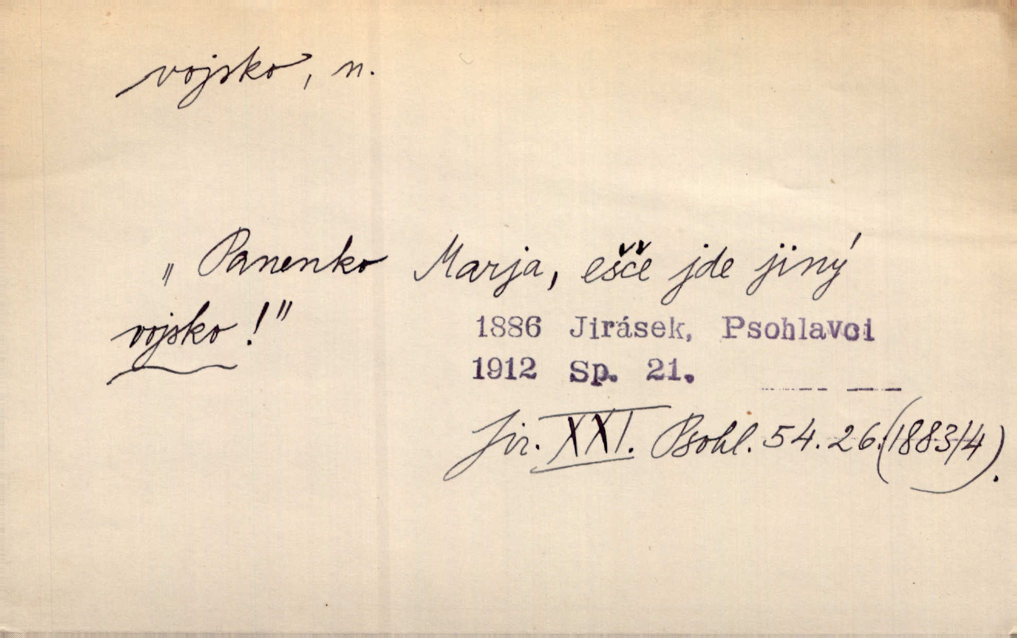 - vojsko, -a n. (6. sg. ve vojsku, zast. ve vojště; zast. vojska, -y f.) souhrn vojenských sil státu; armáda; vojáci. Můj [babiččin] nebožtík Jiří sloužil v pruském vojsku. Něm. Bylo mi asi deset let, když mého bratra k vojsku odvedli. Zey. Císař začal sbírati vojsko. Herb. Jedinou čekárnu naplnil transport vojska. K. Čap. Panenko Marja, ešče jde jiný vojsko! Jir. Ve vojště se roztahuje nahnilá půle Francie. Bozd. Tam se obraťte, tady máme vojsku na starosti a vojnu. Jir. Musilo přijít vojsko a výtržníky rozehnati. Svět. Delegace lidových vojsk dala [na Koreji] při jednáních jasně najevo [své úmysly]. Ml. fronta. Co se v něm [sedlákovi] dálo, táhlo jako nepřátelské vojsko. Hál. Přen. Na jasném nebi se rozsvěcuje vojsko bledých hvězd. V. Fiala. Voj. branná moc n. její část. Jednotlivý druh vojska (op. služeb) (pěchota, dělostřelectvo, letectvo, vojsko ženijní, spojovací, chemické, výsadkové, protiletadlové, tankové a mechanisované). Vojska n. pl. všeobecné souhrnné označení pro vojenské jednotky n. útvary. Pozemní vojska, uskupení vojsk, řízení vojsk.