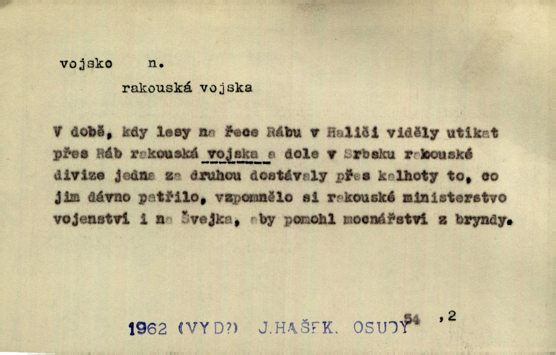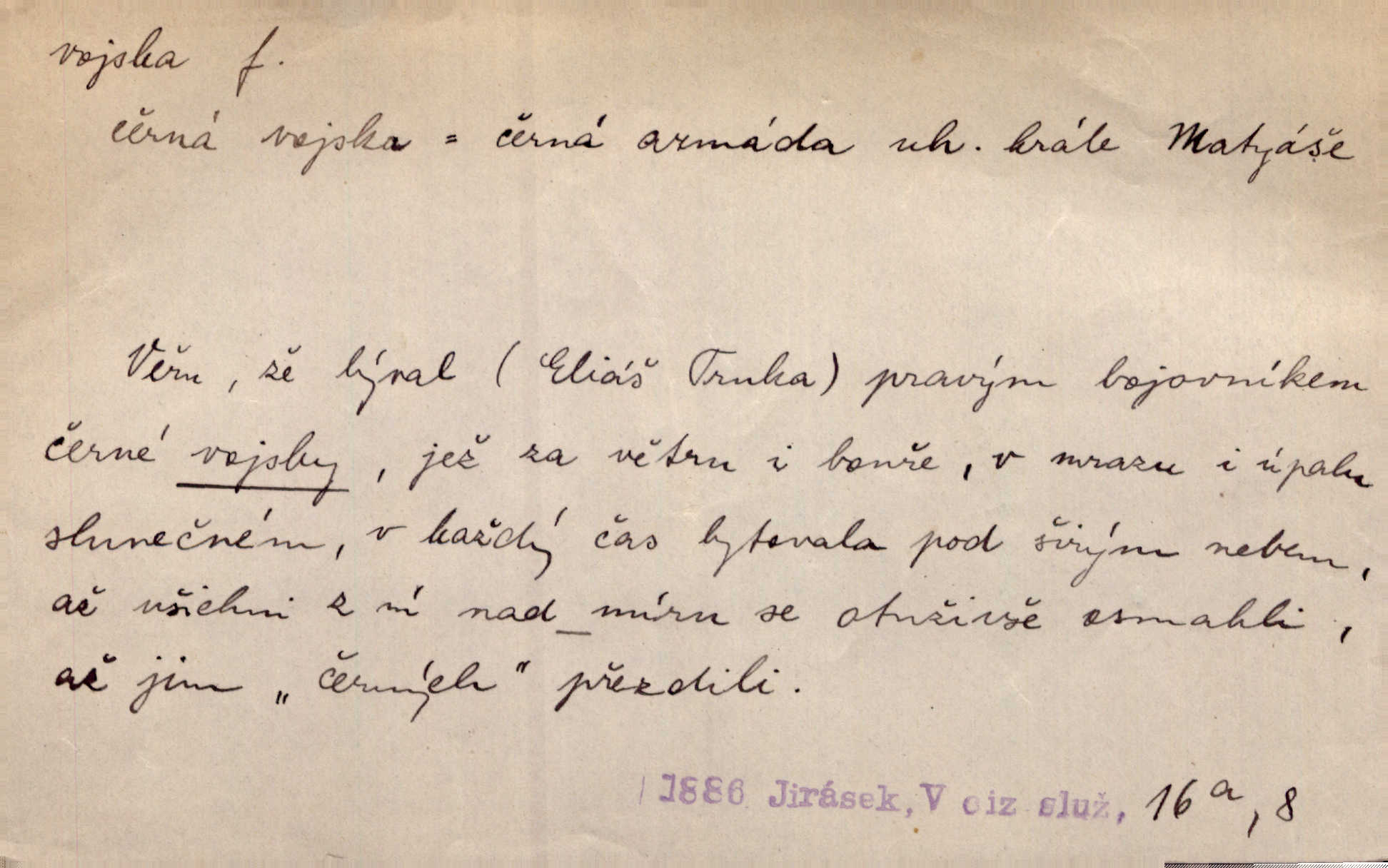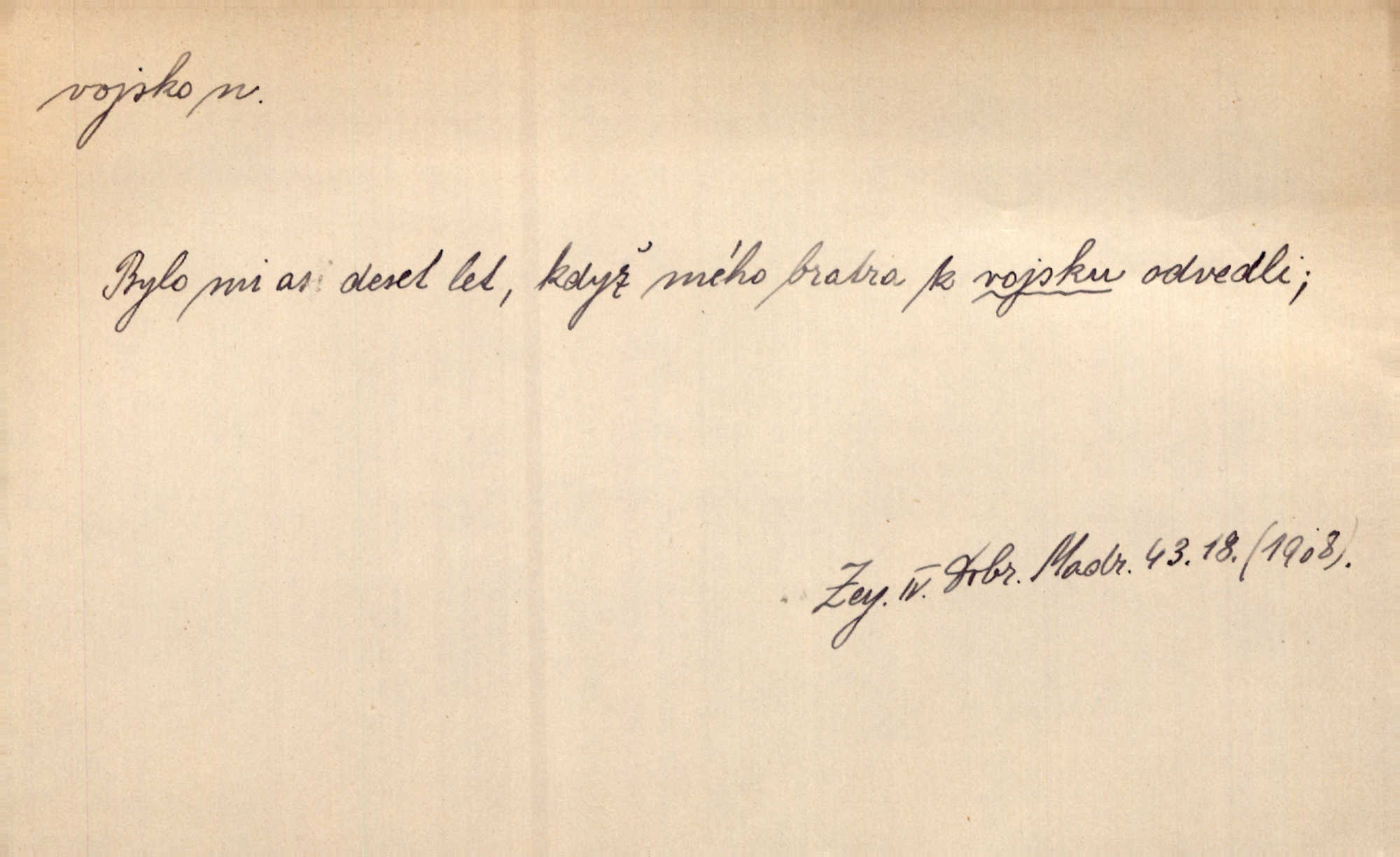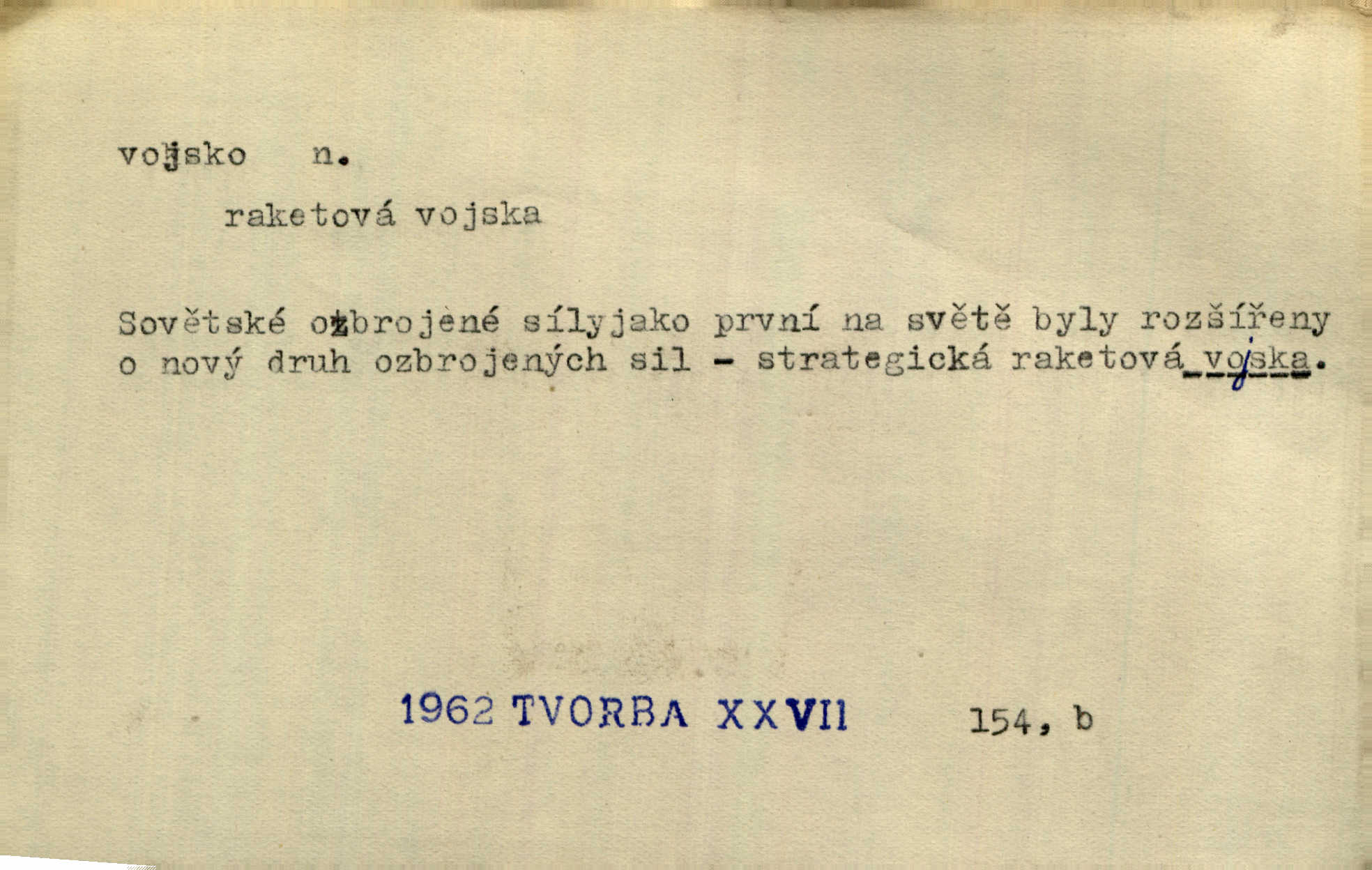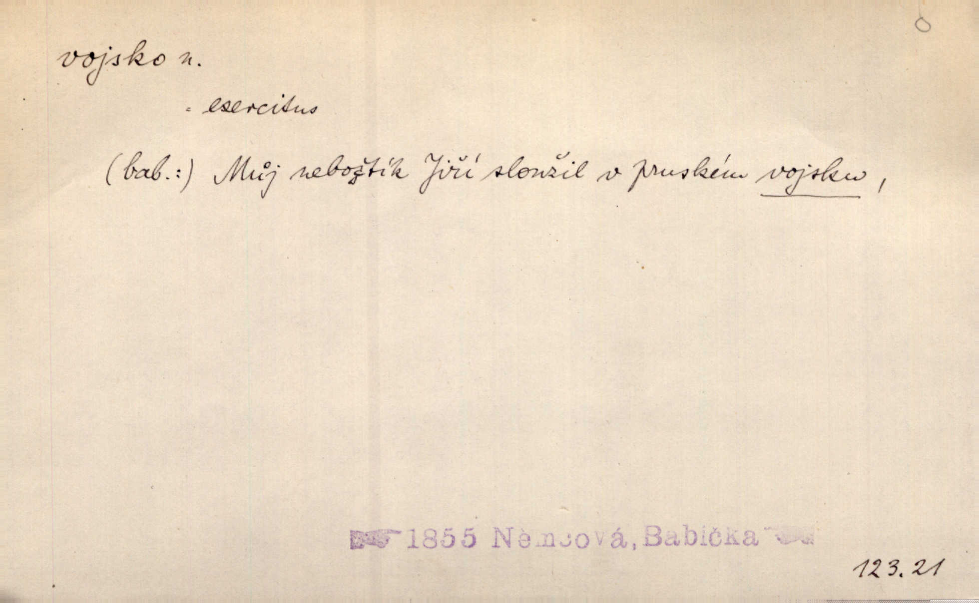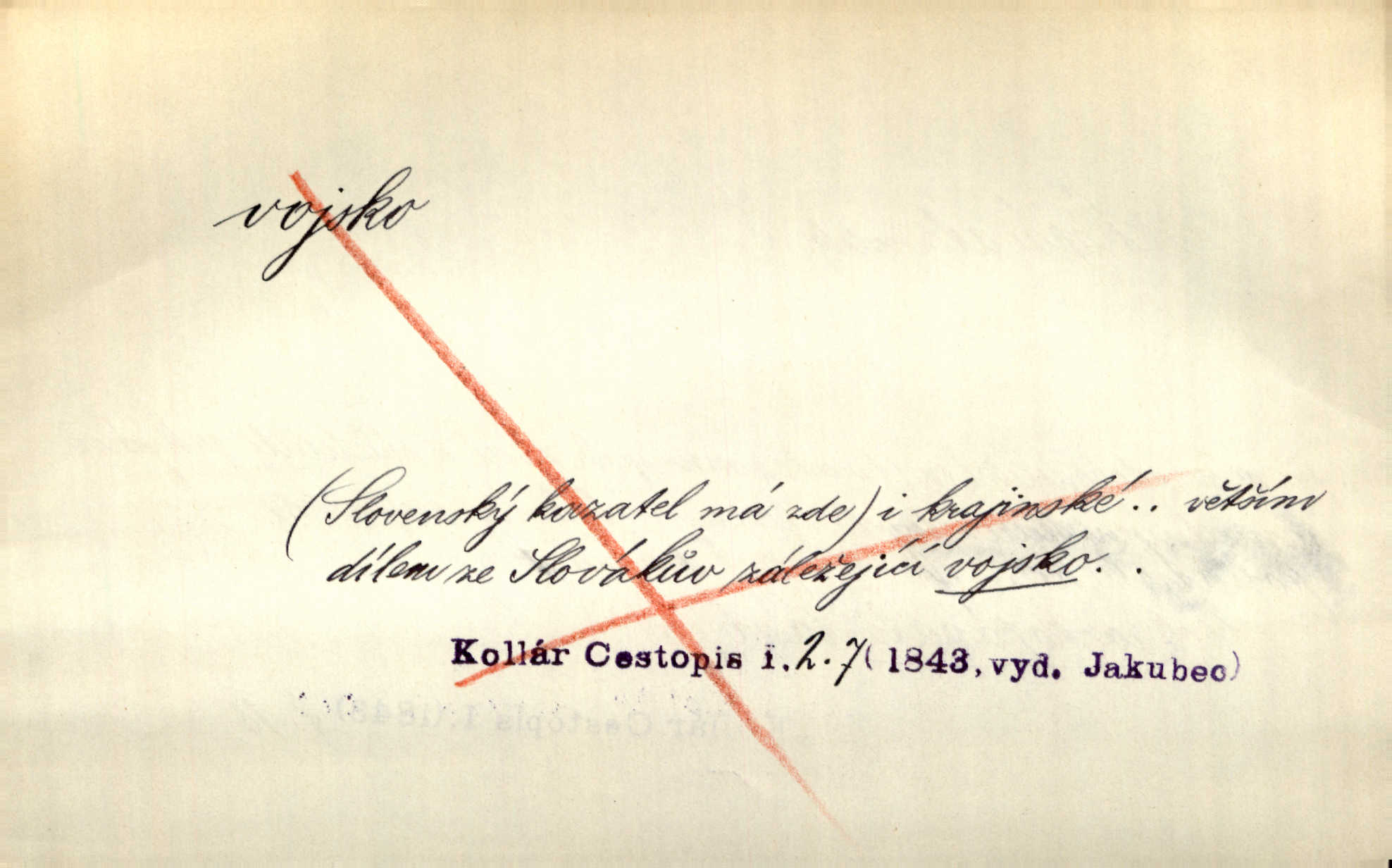 - vojsko, -a n. (6. sg. ve vojsku, zast. ve vojště; zast. vojska, -y f.) souhrn vojenských sil státu; armáda; vojáci. Můj [babiččin] nebožtík Jiří sloužil v pruském vojsku. Něm. Bylo mi asi deset let, když mého bratra k vojsku odvedli. Zey. Císař začal sbírati vojsko. Herb. Jedinou čekárnu naplnil transport vojska. K. Čap. Panenko Marja, ešče jde jiný vojsko! Jir. Ve vojště se roztahuje nahnilá půle Francie. Bozd. Tam se obraťte, tady máme vojsku na starosti a vojnu. Jir. Musilo přijít vojsko a výtržníky rozehnati. Svět. Delegace lidových vojsk dala [na Koreji] při jednáních jasně najevo [své úmysly]. Ml. fronta. Co se v něm [sedlákovi] dálo, táhlo jako nepřátelské vojsko. Hál. Přen. Na jasném nebi se rozsvěcuje vojsko bledých hvězd. V. Fiala. Voj. branná moc n. její část. Jednotlivý druh vojska (op. služeb) (pěchota, dělostřelectvo, letectvo, vojsko ženijní, spojovací, chemické, výsadkové, protiletadlové, tankové a mechanisované). Vojska n. pl. všeobecné souhrnné označení pro vojenské jednotky n. útvary. Pozemní vojska, uskupení vojsk, řízení vojsk.