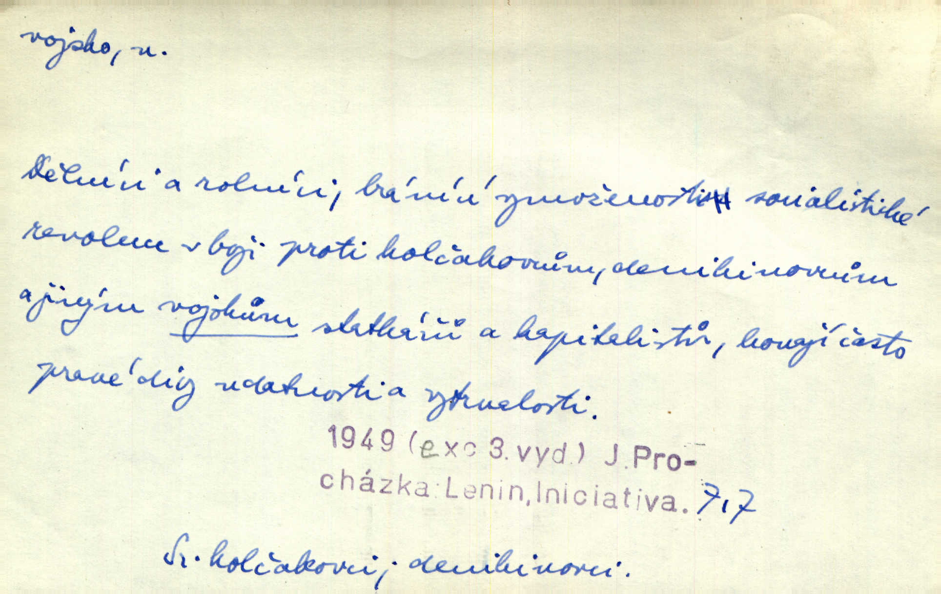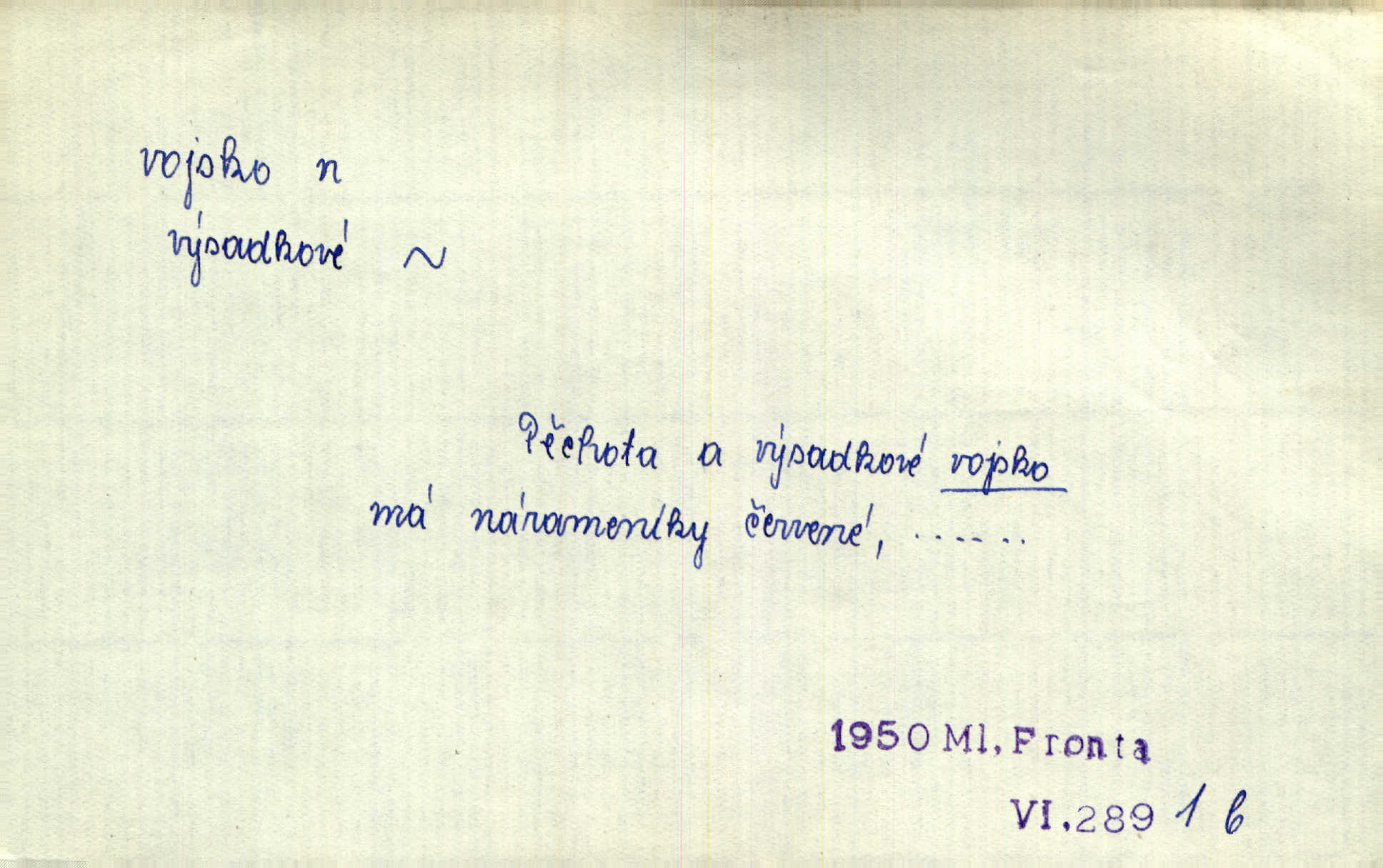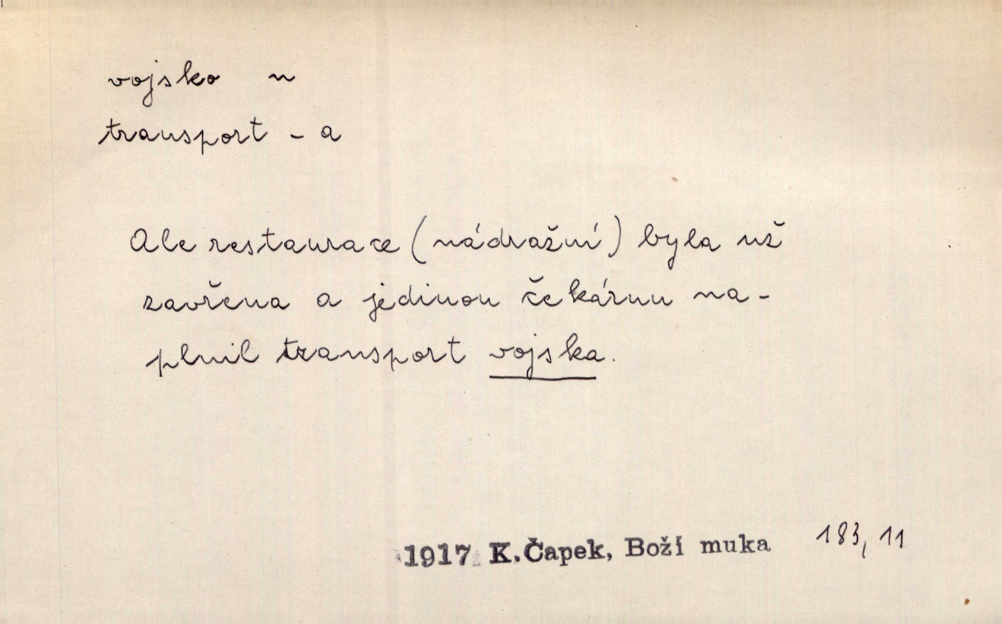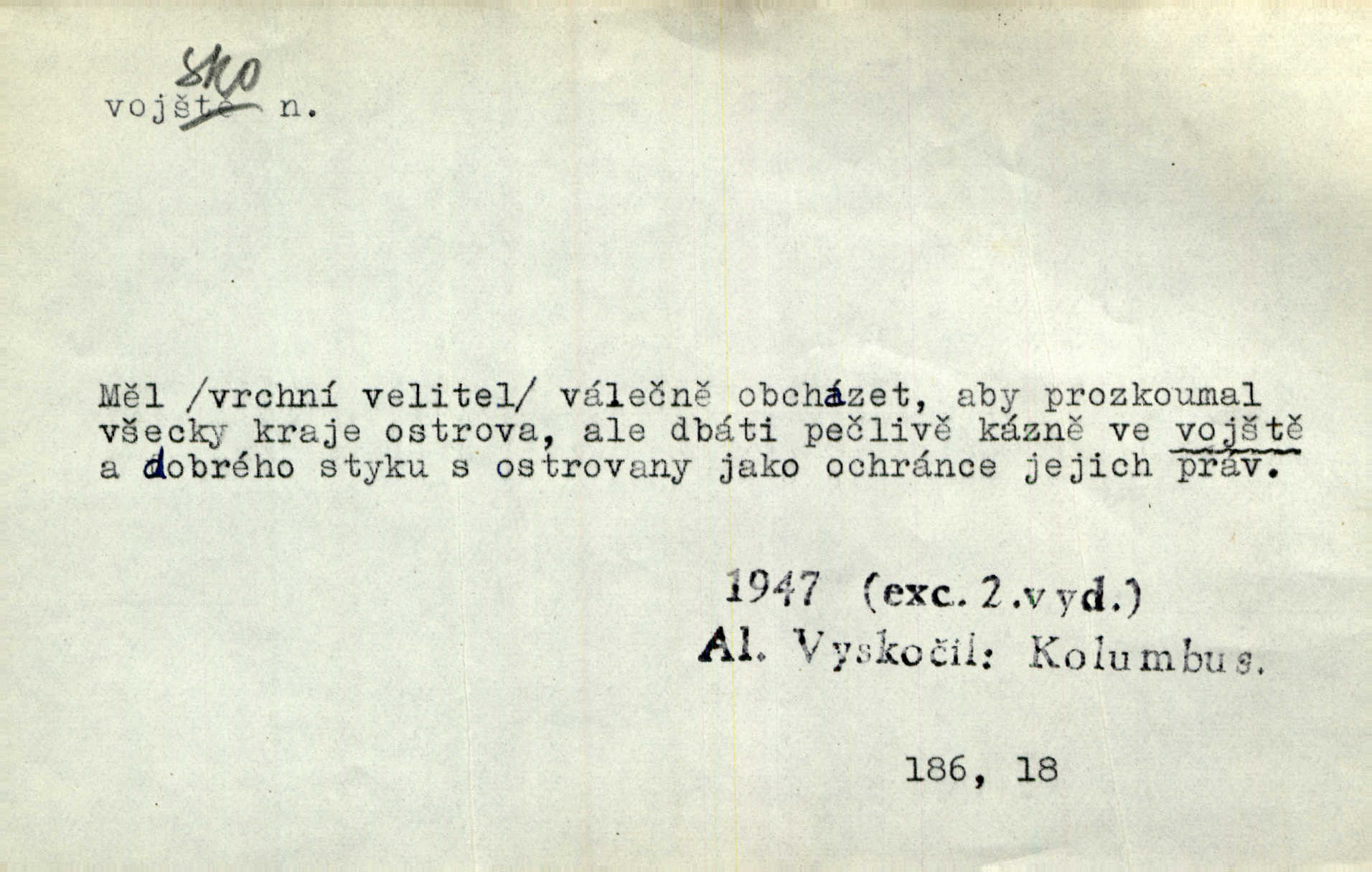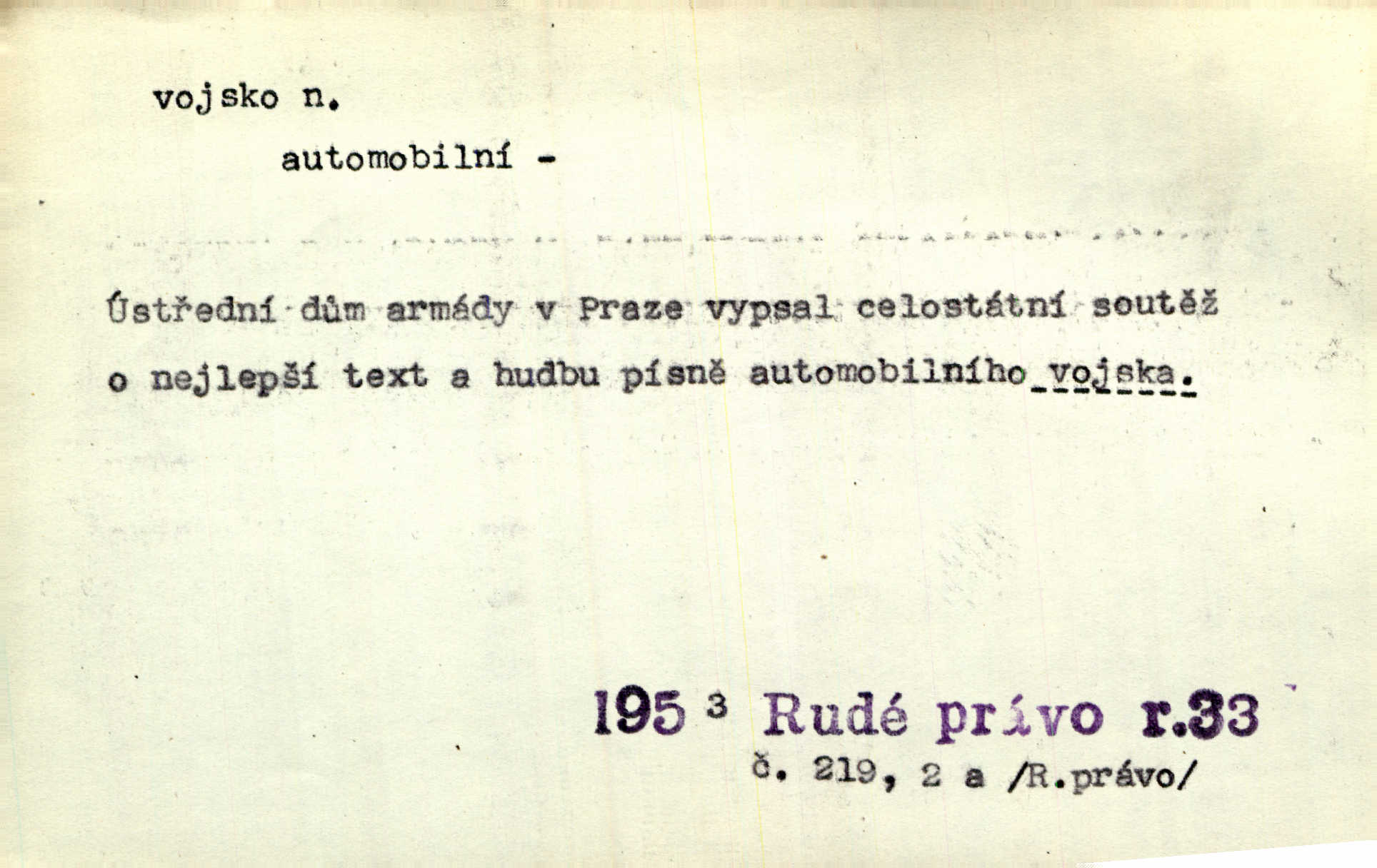 - vojsko, -a n. (6. sg. ve vojsku, zast. ve vojště; zast. vojska, -y f.) souhrn vojenských sil státu; armáda; vojáci. Můj [babiččin] nebožtík Jiří sloužil v pruském vojsku. Něm. Bylo mi asi deset let, když mého bratra k vojsku odvedli. Zey. Císař začal sbírati vojsko. Herb. Jedinou čekárnu naplnil transport vojska. K. Čap. Panenko Marja, ešče jde jiný vojsko! Jir. Ve vojště se roztahuje nahnilá půle Francie. Bozd. Tam se obraťte, tady máme vojsku na starosti a vojnu. Jir. Musilo přijít vojsko a výtržníky rozehnati. Svět. Delegace lidových vojsk dala [na Koreji] při jednáních jasně najevo [své úmysly]. Ml. fronta. Co se v něm [sedlákovi] dálo, táhlo jako nepřátelské vojsko. Hál. Přen. Na jasném nebi se rozsvěcuje vojsko bledých hvězd. V. Fiala. Voj. branná moc n. její část. Jednotlivý druh vojska (op. služeb) (pěchota, dělostřelectvo, letectvo, vojsko ženijní, spojovací, chemické, výsadkové, protiletadlové, tankové a mechanisované). Vojska n. pl. všeobecné souhrnné označení pro vojenské jednotky n. útvary. Pozemní vojska, uskupení vojsk, řízení vojsk.