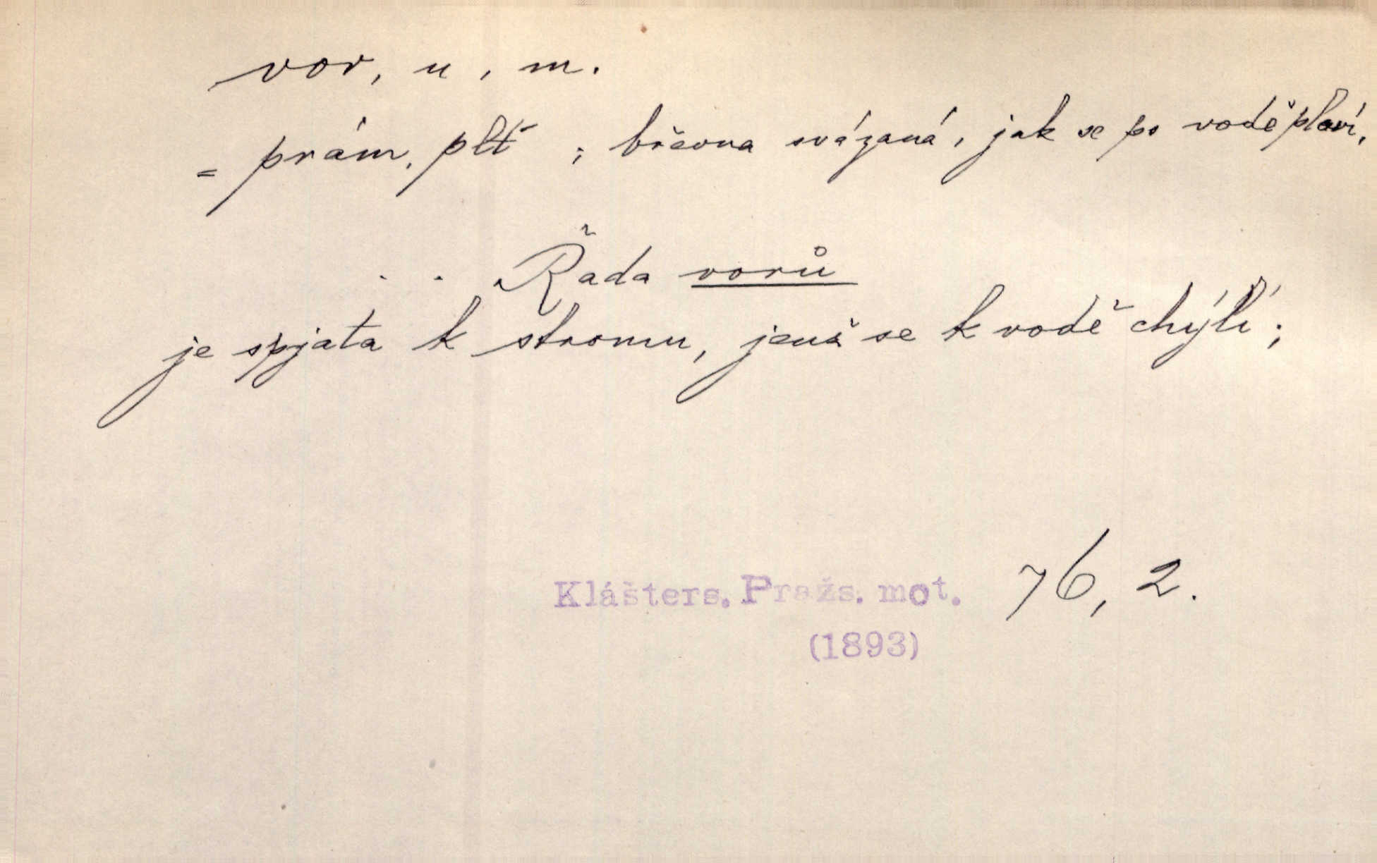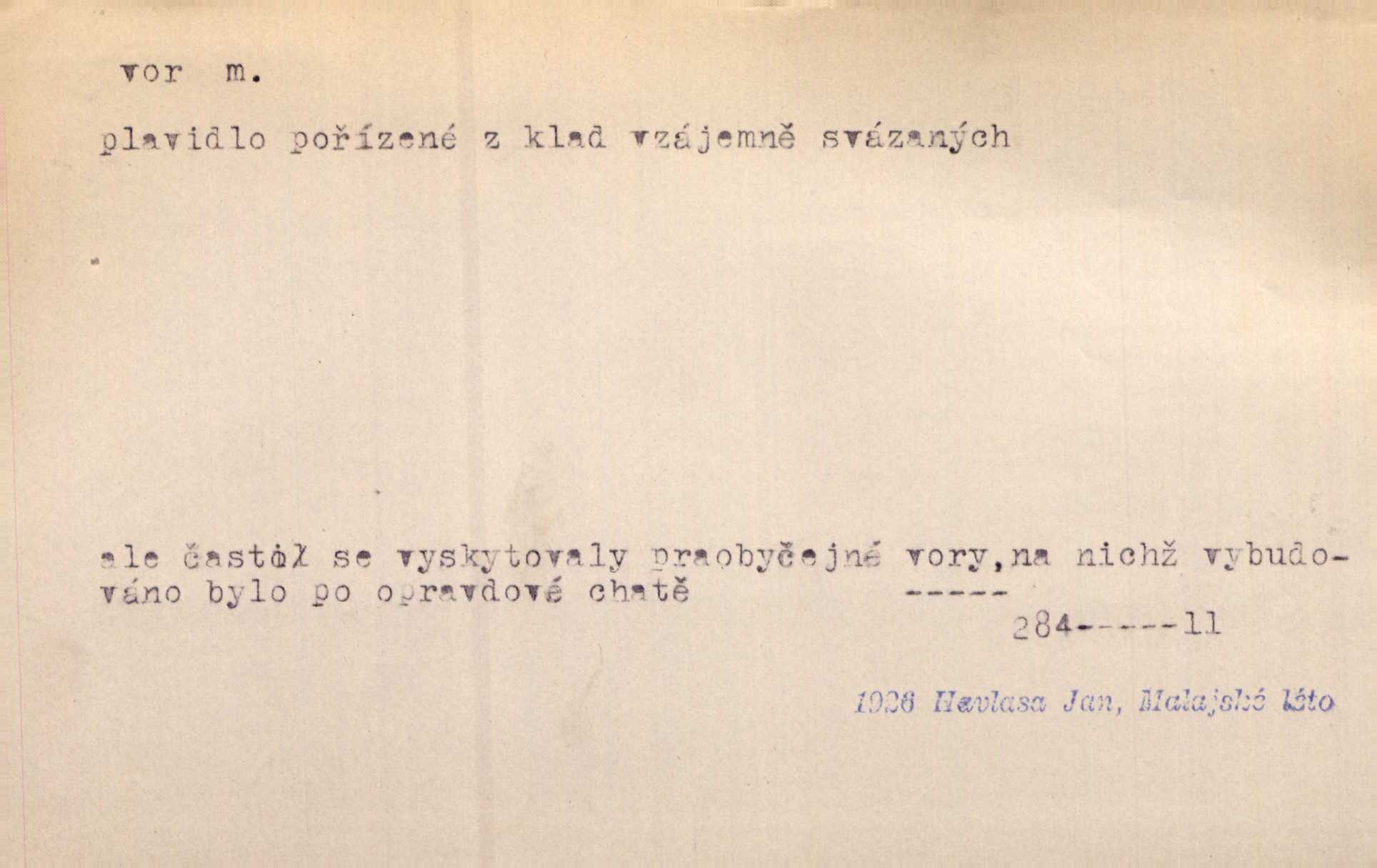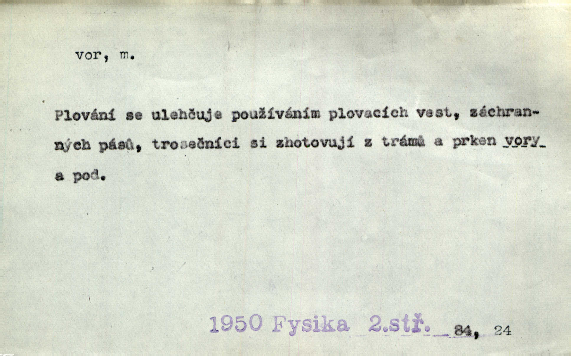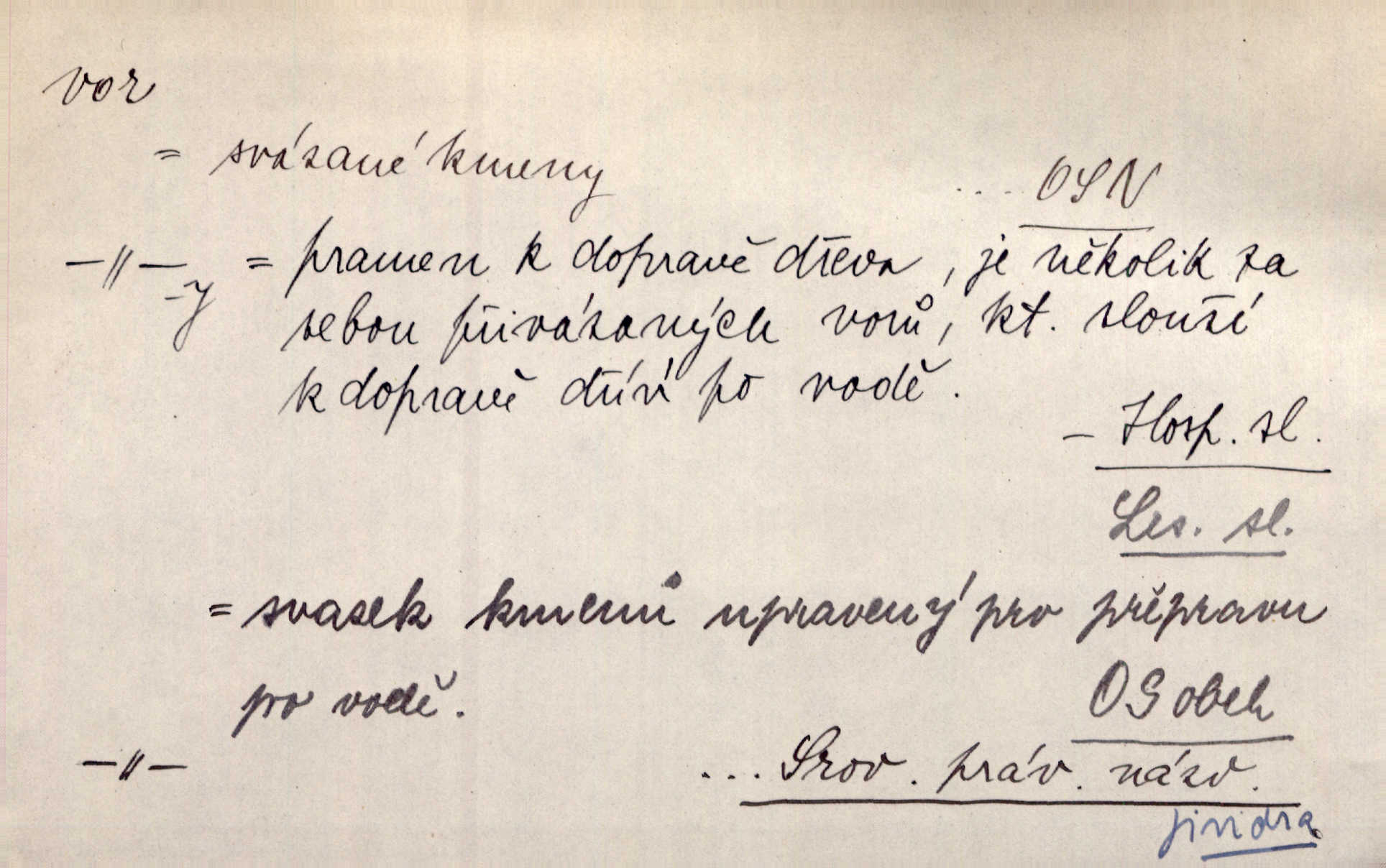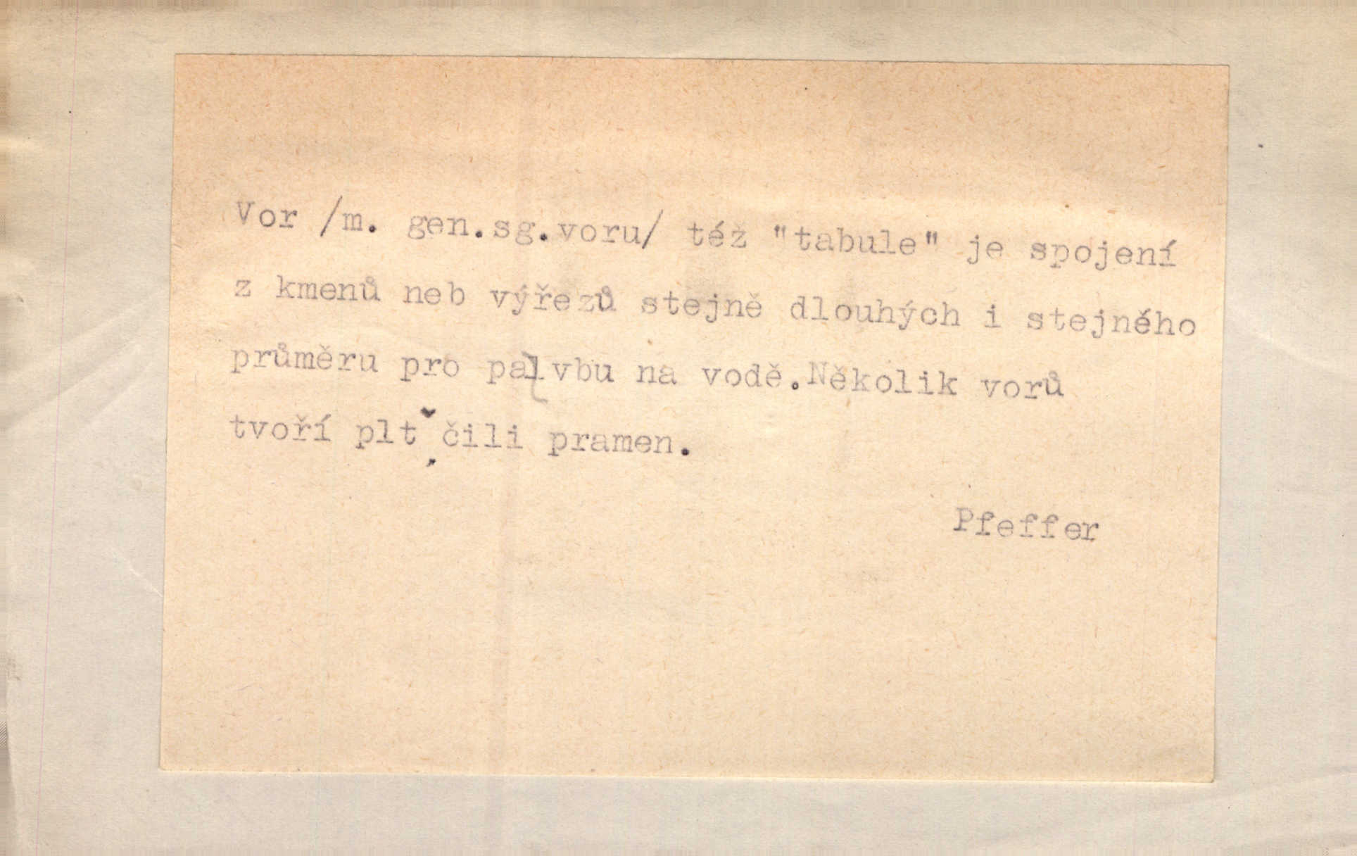 - vor, -u m. svazek kmenů upravený pro přepravu po vodě. Věděli jsme, kdy poplujou vory po Labi. Mach. Panic z Hvozdna skočil na vor. Jir. Plav. sestava stejně dlouhých a stejně silných kmenů spojených houžvemi pro plavení po vodě, tabule.