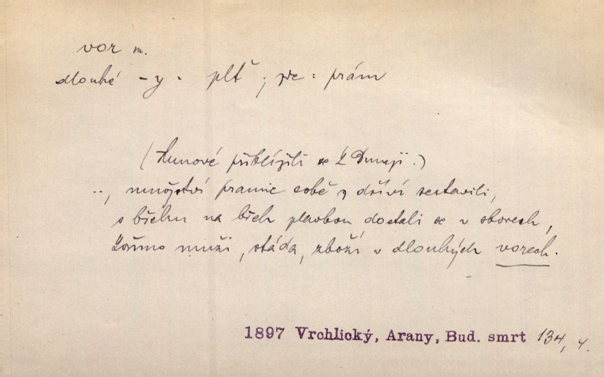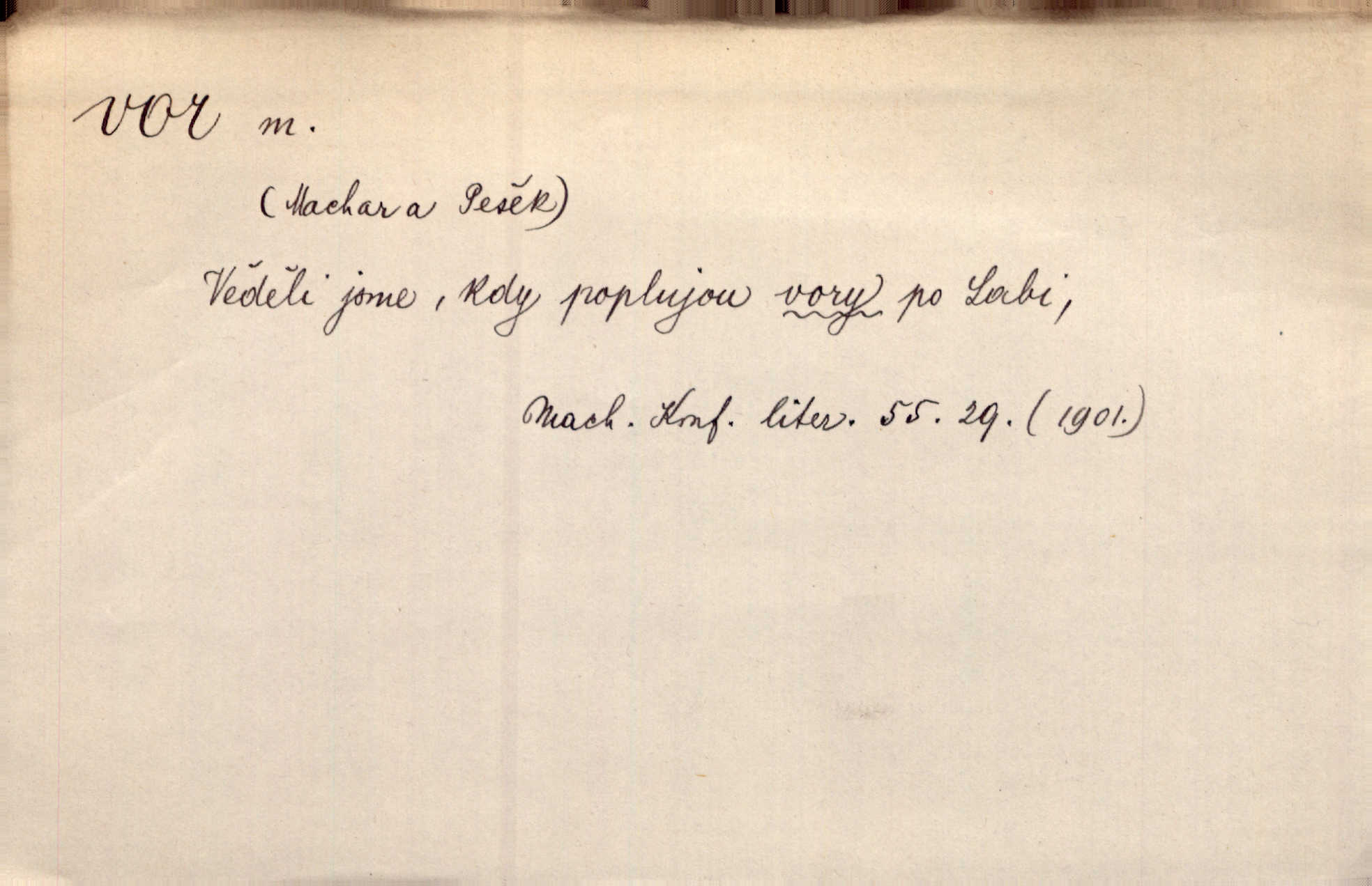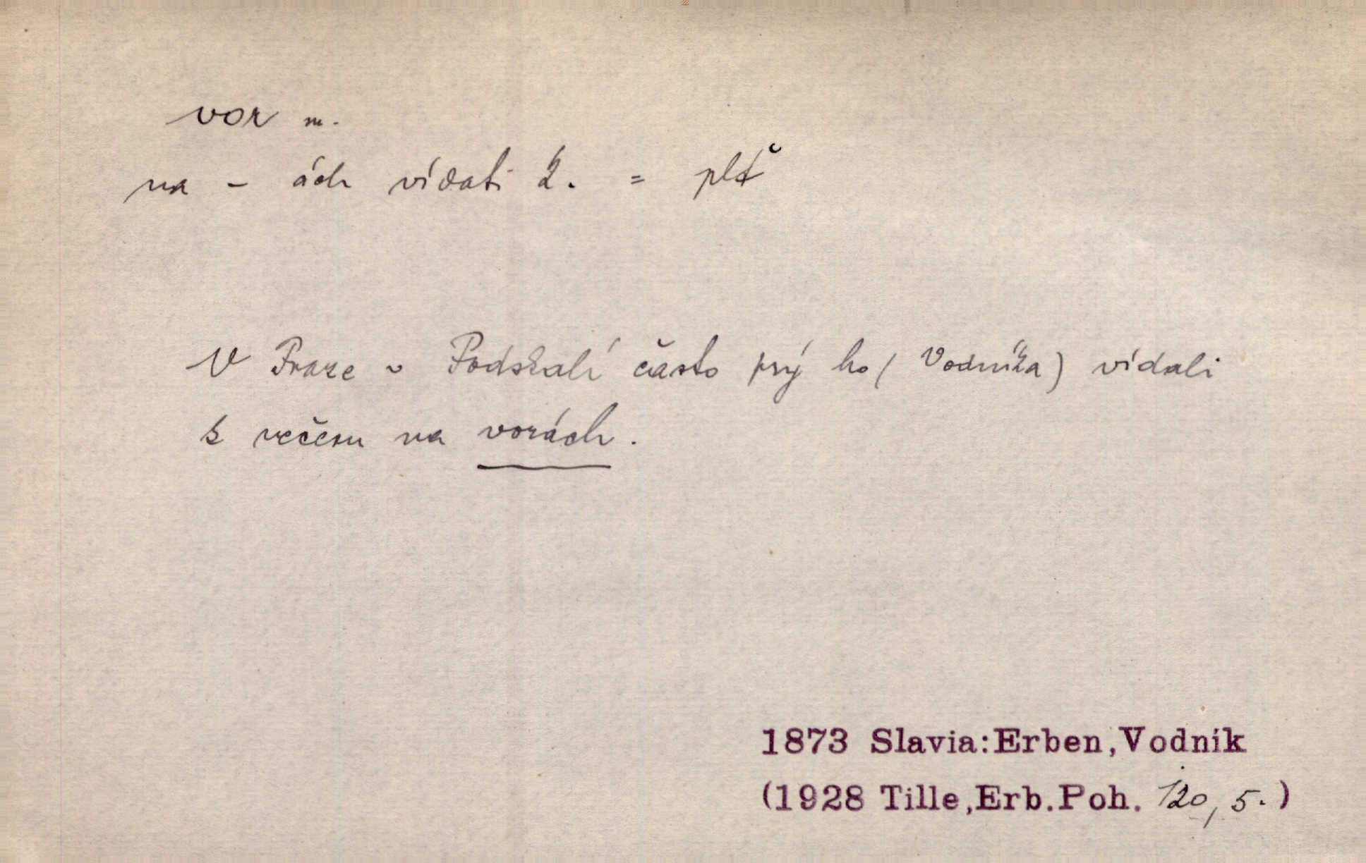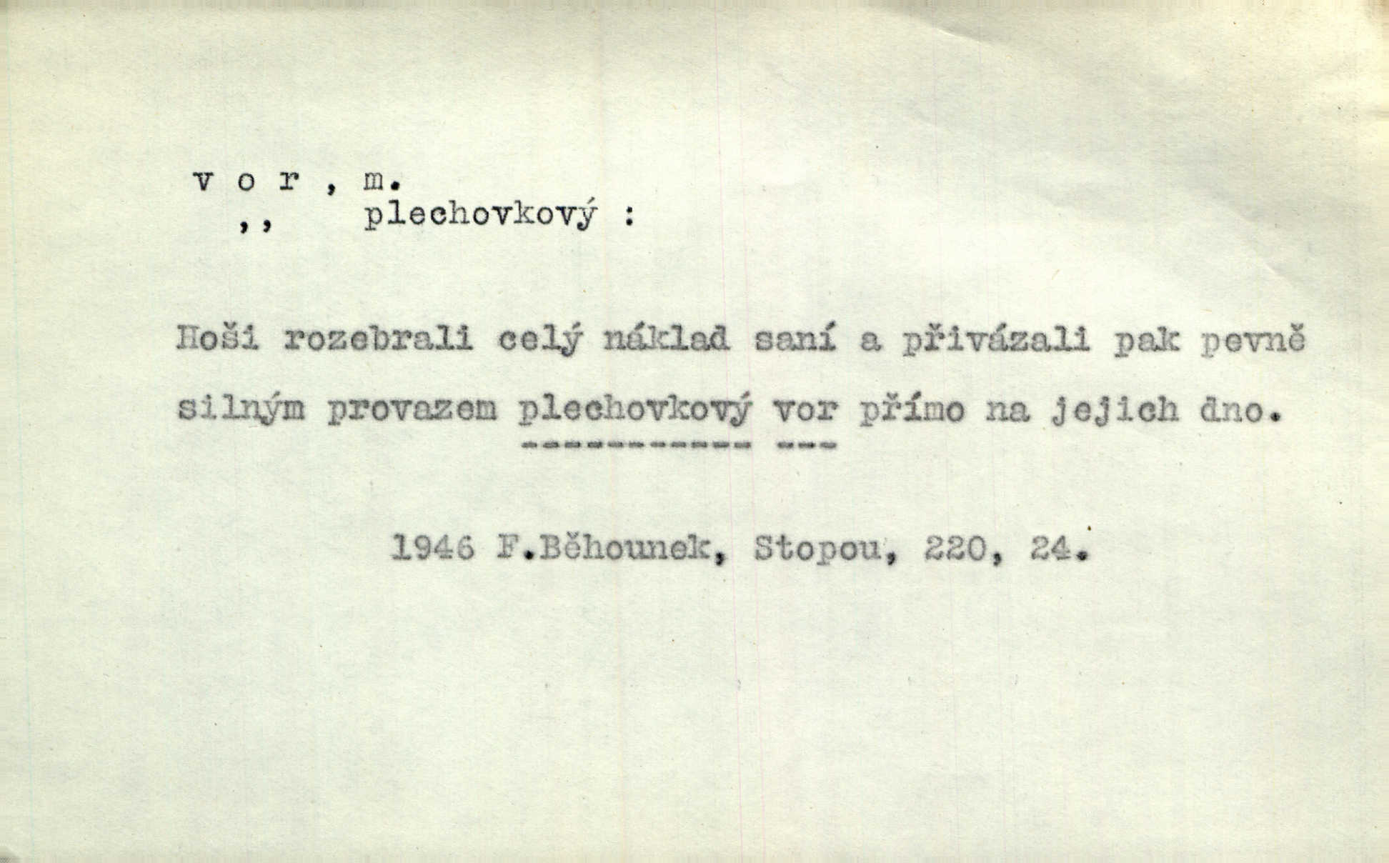 - vor, -u m. svazek kmenů upravený pro přepravu po vodě. Věděli jsme, kdy poplujou vory po Labi. Mach. Panic z Hvozdna skočil na vor. Jir. Plav. sestava stejně dlouhých a stejně silných kmenů spojených houžvemi pro plavení po vodě, tabule.