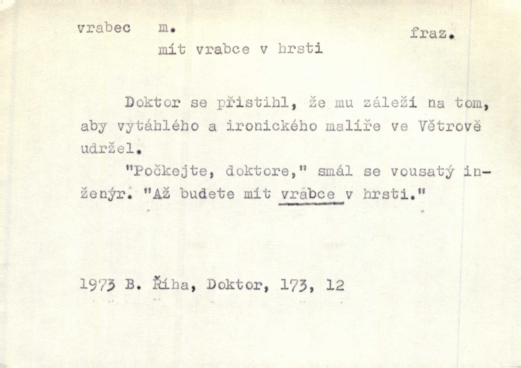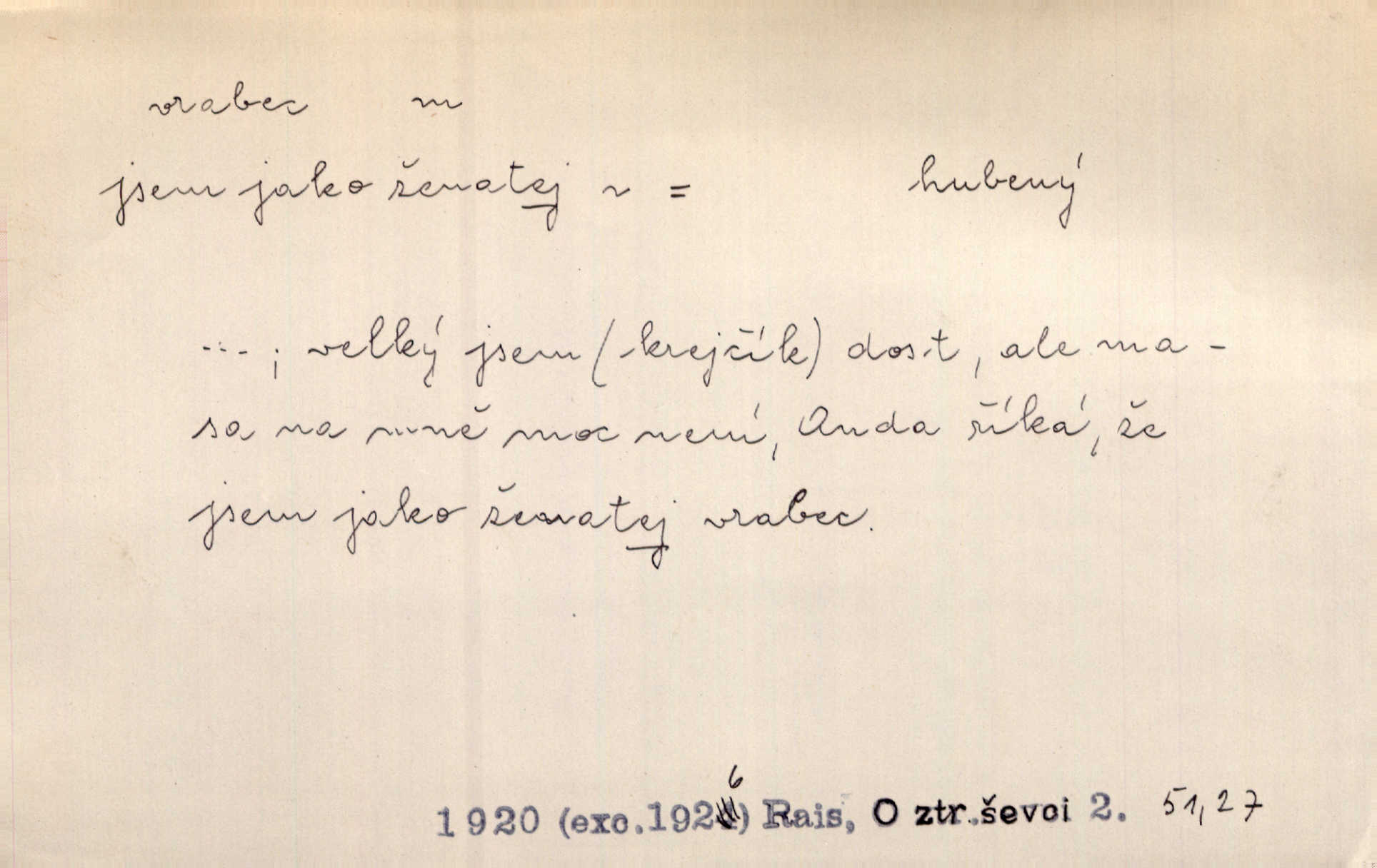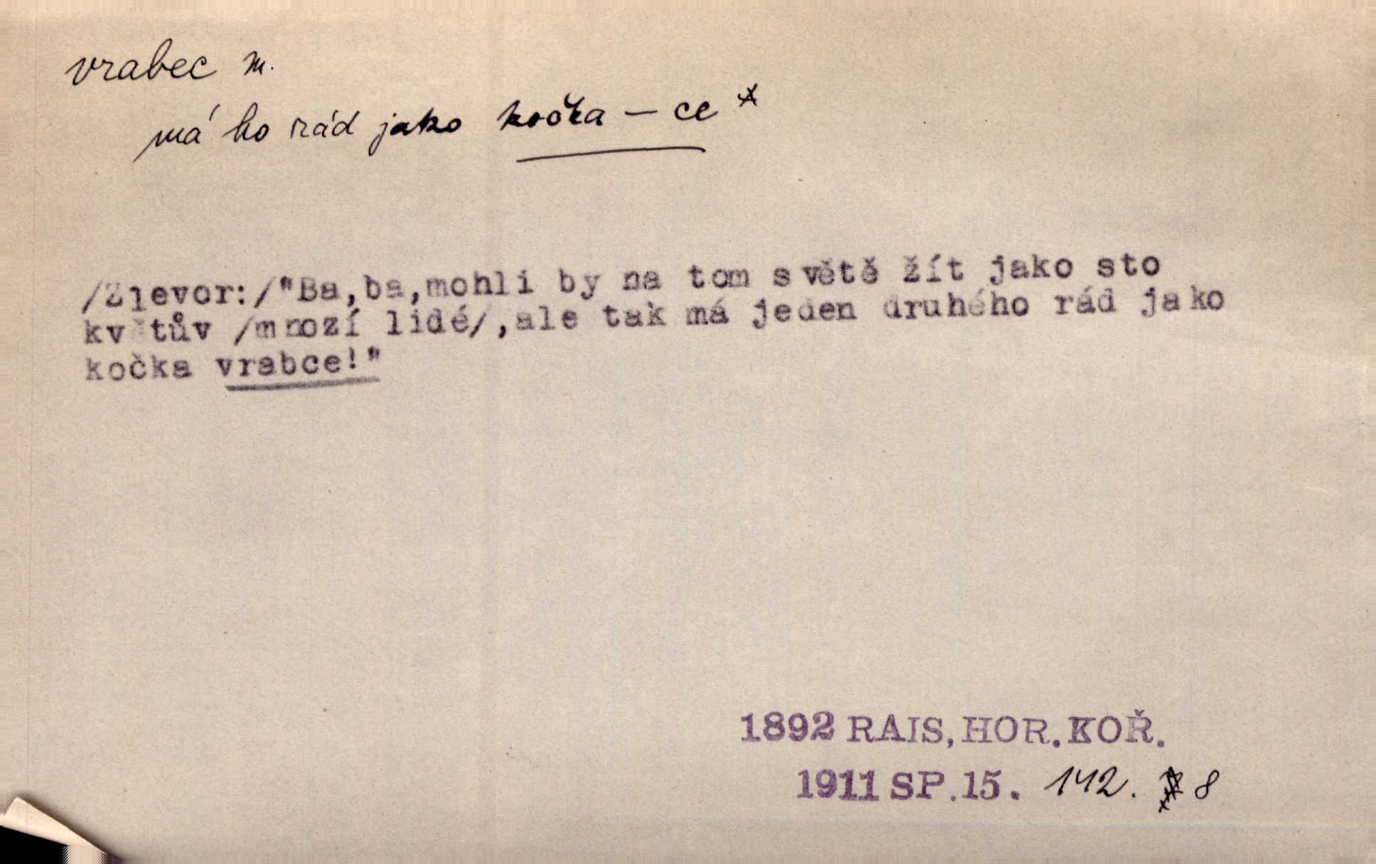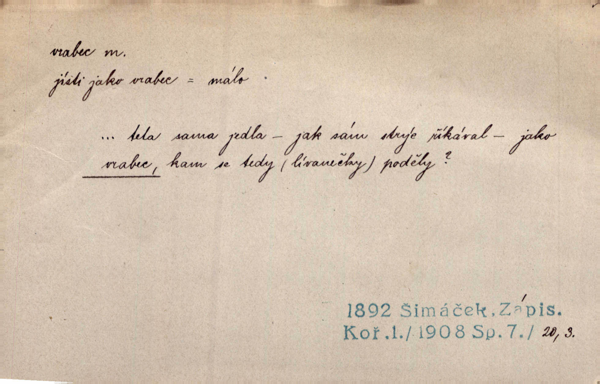 - vrabec (lid. brabec), -bce m. náš nejobyčejnější pták žijící kolem lidských sídlišť. V koších stromů štiřikali vrabci. Rais. Pozoroval jsem několik vrabců honících se za jiným, nejspíše cizím vrabcem. Ner. Vrabci a strnadi odstěhovali se do vsí ku stodolám. Jir. Teď nejsou zimy, jako bývaly. Za mého mládí padali vrabci se střech. Hál. Máš pod klobúkem brabce? neumíš smeknout? Herb. Teta sama jedla jako vrabec, kam se tedy [lívanečky] poděly? málo. Šim. Byl chudý jako vrabec. Vanč. Ten Lojzík byl takový střapatý kluk, rozdrbaný jako brabec. K. Čap. Já nemám už za vrabce síly! Pomozte mi! Mah. A což o hudebníky, ti přitáhnou jako vrabci za zrním. Hál. Po maturitním večírku jsme se rozprášili, jako když do vrabců střelí. Dyk. Tak má jeden druhého [lidi] rád jako kočka vrabce velmi nerad. Rais. Ten má lejtka jako ženatej brabec hubená. Č. lid. Masa na mně moc není, Anda říká, že jsem jako ženatej vrabec. Rais. Chceli sedlák náš neodbytnosť někoho naznačit, praví: „Stěhuje se jako vrabec z Čech“ loudavě. Ner. Jasná myšlenka svitla v Hrabcově hlavě. Nešel však na brabce s bubnem neunáhlil se, nejednal neopatrně. Herb. Myslím si, že je zbytečno mluvit o vrabci na střeše o něčem nejistém. Baar. Lepší vrabec v hrsti nežli holub na střeše. Přísl. V Praze nepadají pečení vrabci do huby živobytí není snadné. Svob. Ať jen mlčí tvá svatá paní, vrabci na střechách o tom štěbetají, že je bečka hříchů je všeobecně známo. Něm. Přen. Přeškoda, že jest pan Vokoun takový starý, sivý vrabec. Herrm. Malí uličníci, ti vrabci velkoměstské ulice. Heřm. Neměla valný kus cesty, když se sníh rozpadal. Vrabci ho padali velké kusy. Hol. Zool. vrabec rod ptáků z čeledi pěnkavovitých, Passer; vrabec domácí. Kuch. vrabci druh noků z brambor n. moučného těsta. Odřezky vepřového masa.