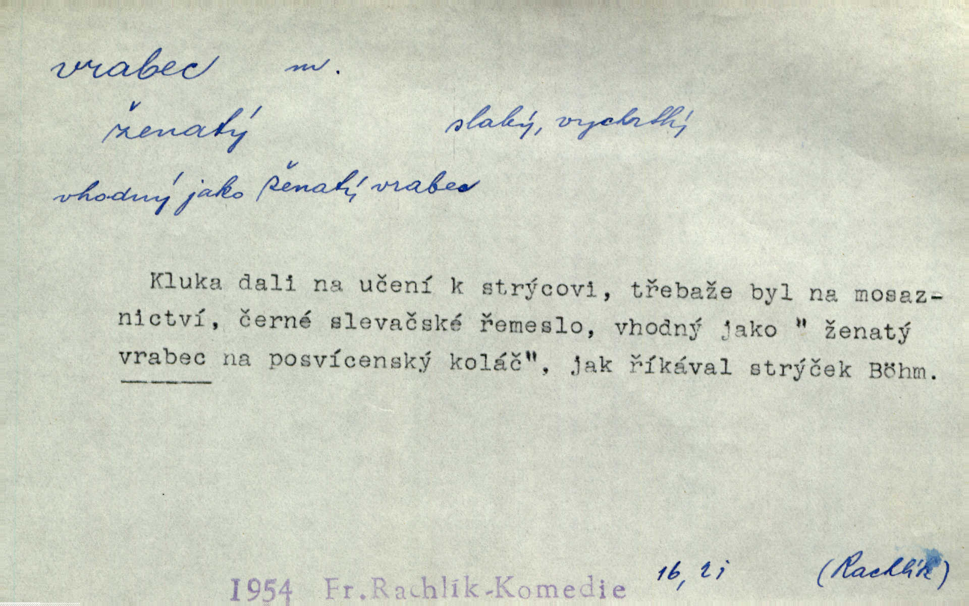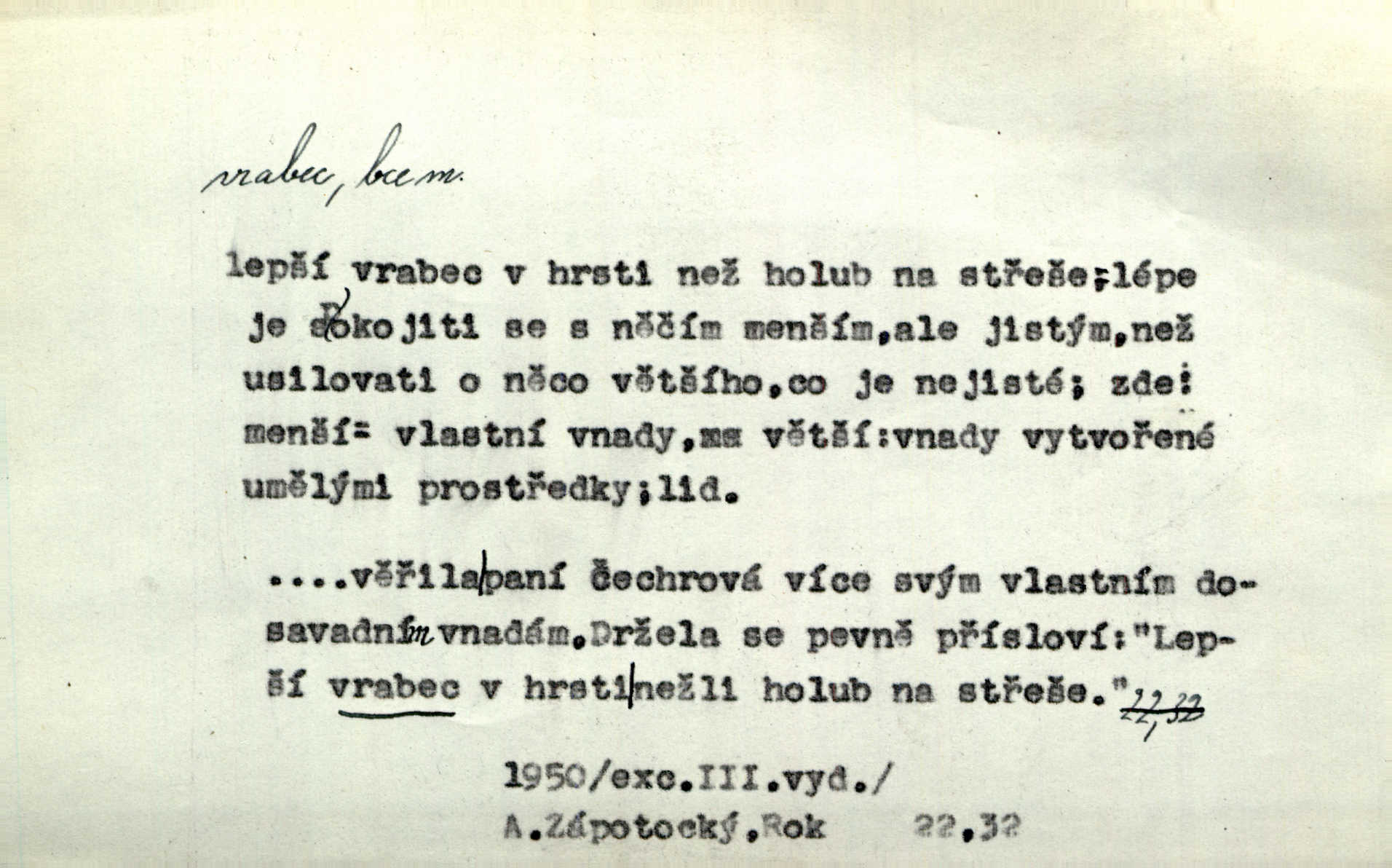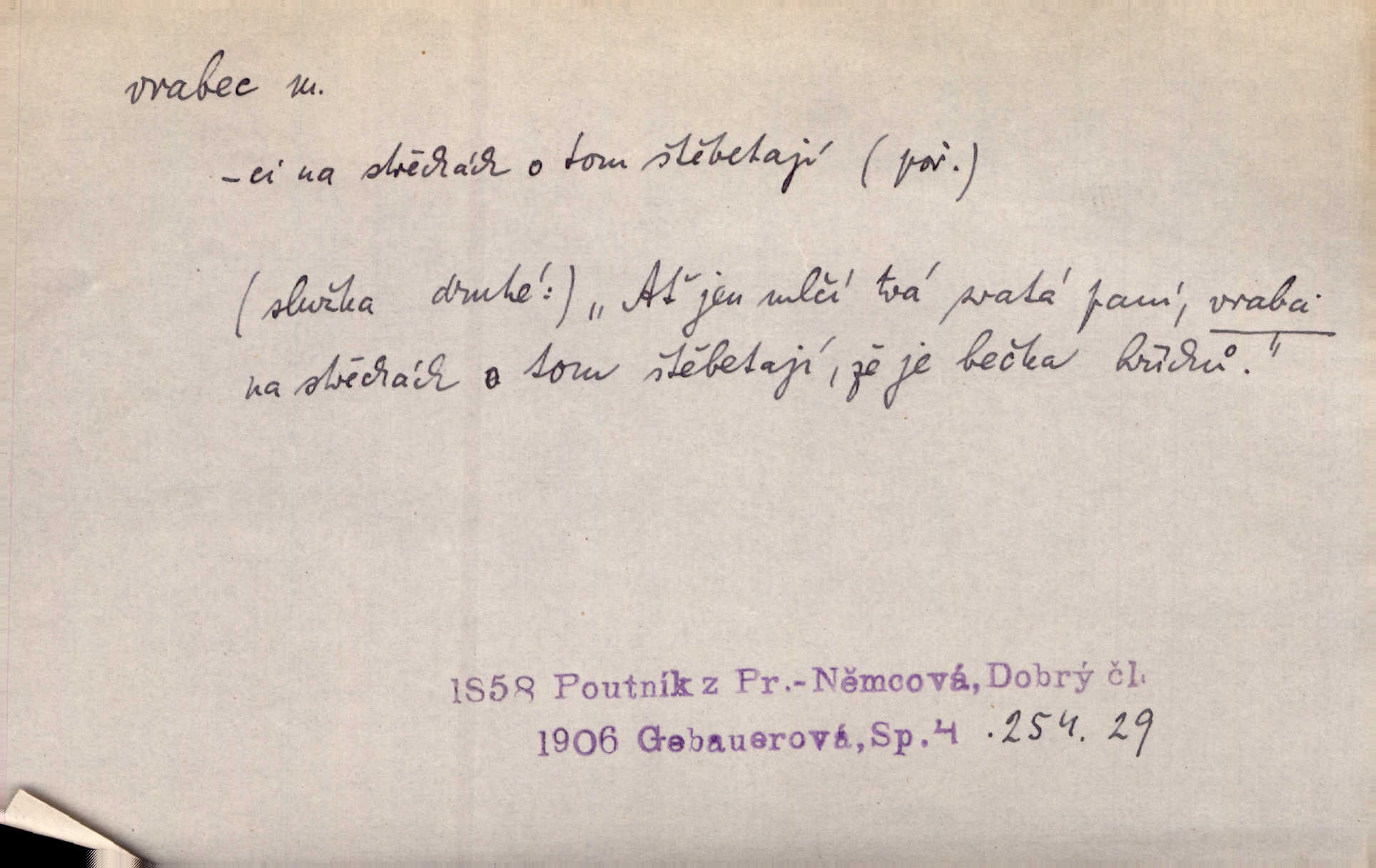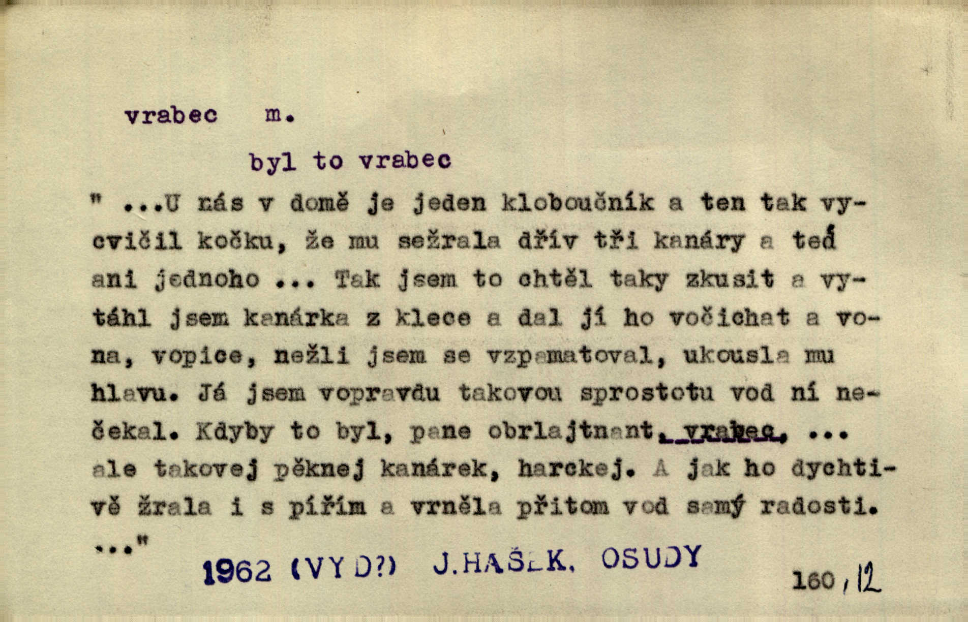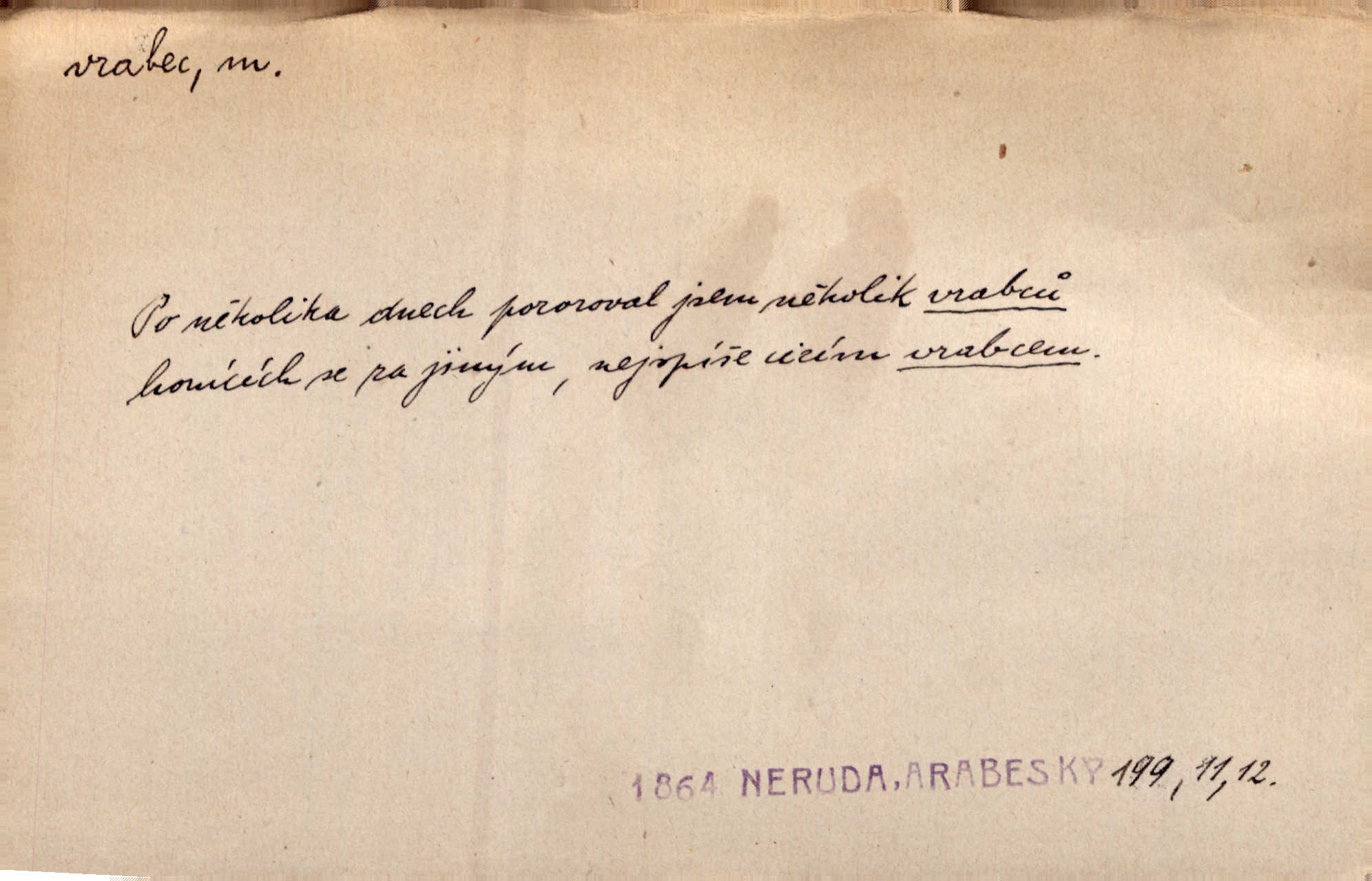 - vrabec (lid. brabec), -bce m. náš nejobyčejnější pták žijící kolem lidských sídlišť. V koších stromů štiřikali vrabci. Rais. Pozoroval jsem několik vrabců honících se za jiným, nejspíše cizím vrabcem. Ner. Vrabci a strnadi odstěhovali se do vsí ku stodolám. Jir. Teď nejsou zimy, jako bývaly. Za mého mládí padali vrabci se střech. Hál. Máš pod klobúkem brabce? neumíš smeknout? Herb. Teta sama jedla jako vrabec, kam se tedy [lívanečky] poděly? málo. Šim. Byl chudý jako vrabec. Vanč. Ten Lojzík byl takový střapatý kluk, rozdrbaný jako brabec. K. Čap. Já nemám už za vrabce síly! Pomozte mi! Mah. A což o hudebníky, ti přitáhnou jako vrabci za zrním. Hál. Po maturitním večírku jsme se rozprášili, jako když do vrabců střelí. Dyk. Tak má jeden druhého [lidi] rád jako kočka vrabce velmi nerad. Rais. Ten má lejtka jako ženatej brabec hubená. Č. lid. Masa na mně moc není, Anda říká, že jsem jako ženatej vrabec. Rais. Chceli sedlák náš neodbytnosť někoho naznačit, praví: „Stěhuje se jako vrabec z Čech“ loudavě. Ner. Jasná myšlenka svitla v Hrabcově hlavě. Nešel však na brabce s bubnem neunáhlil se, nejednal neopatrně. Herb. Myslím si, že je zbytečno mluvit o vrabci na střeše o něčem nejistém. Baar. Lepší vrabec v hrsti nežli holub na střeše. Přísl. V Praze nepadají pečení vrabci do huby živobytí není snadné. Svob. Ať jen mlčí tvá svatá paní, vrabci na střechách o tom štěbetají, že je bečka hříchů je všeobecně známo. Něm. Přen. Přeškoda, že jest pan Vokoun takový starý, sivý vrabec. Herrm. Malí uličníci, ti vrabci velkoměstské ulice. Heřm. Neměla valný kus cesty, když se sníh rozpadal. Vrabci ho padali velké kusy. Hol. Zool. vrabec rod ptáků z čeledi pěnkavovitých, Passer; vrabec domácí. Kuch. vrabci druh noků z brambor n. moučného těsta. Odřezky vepřového masa.
