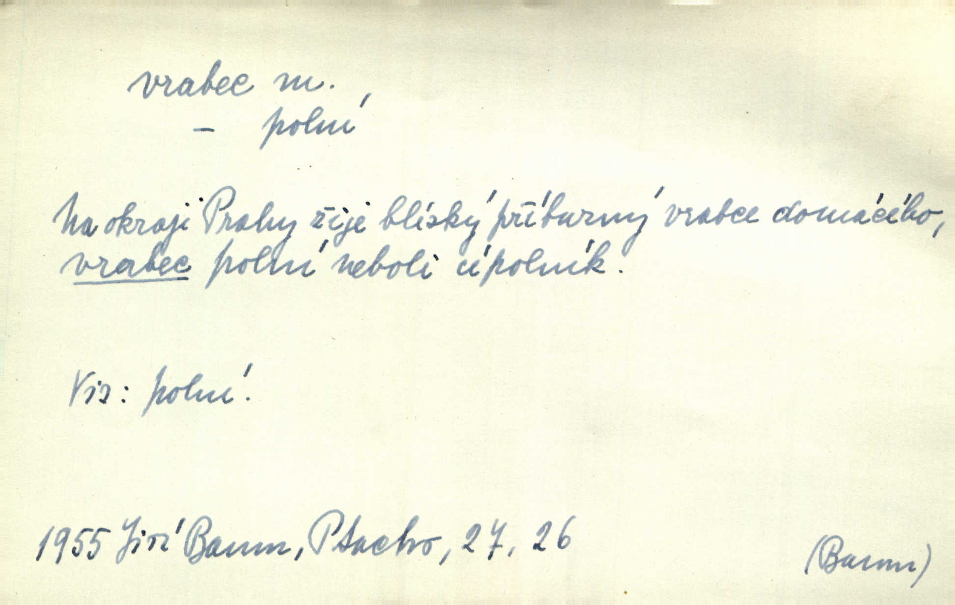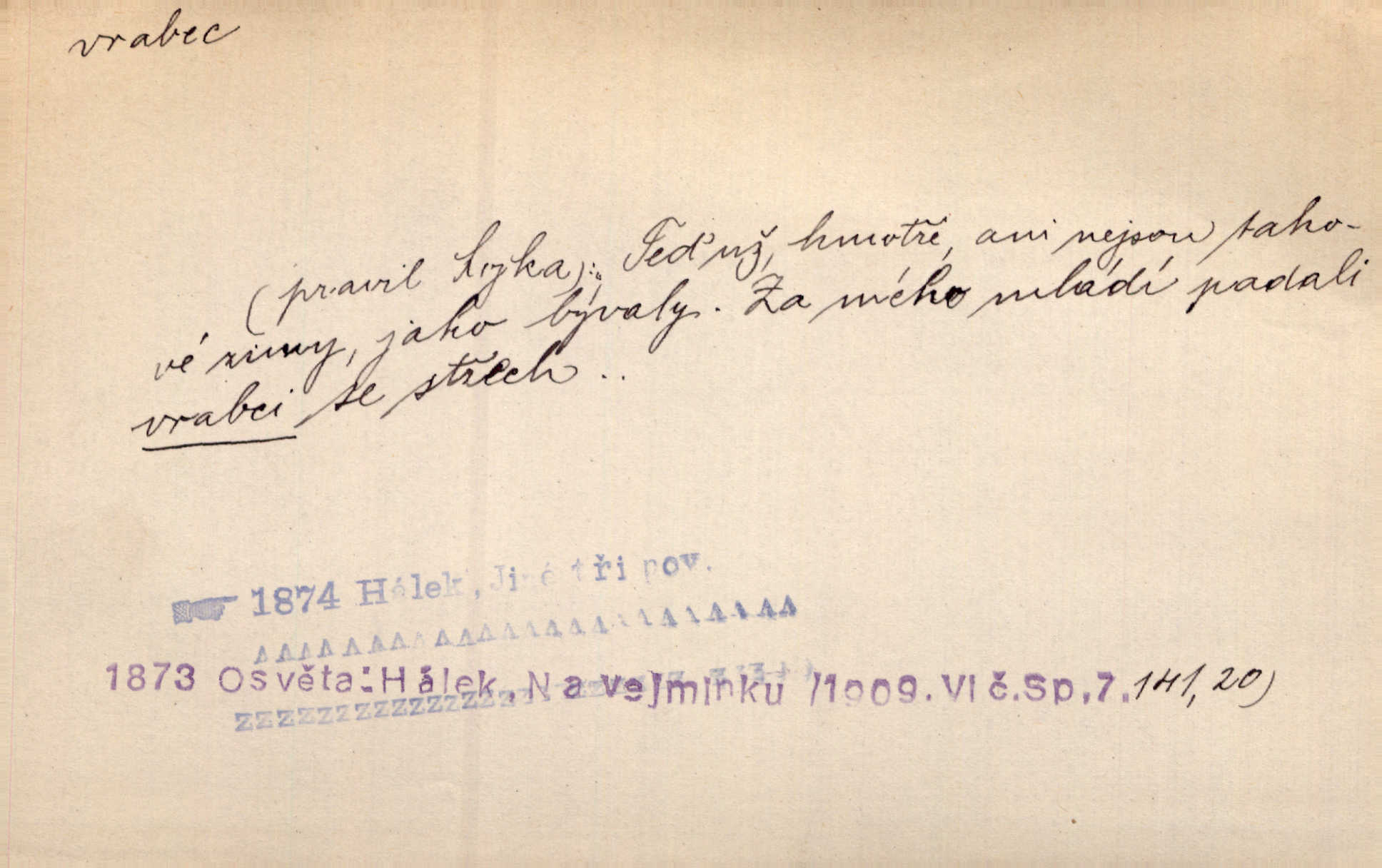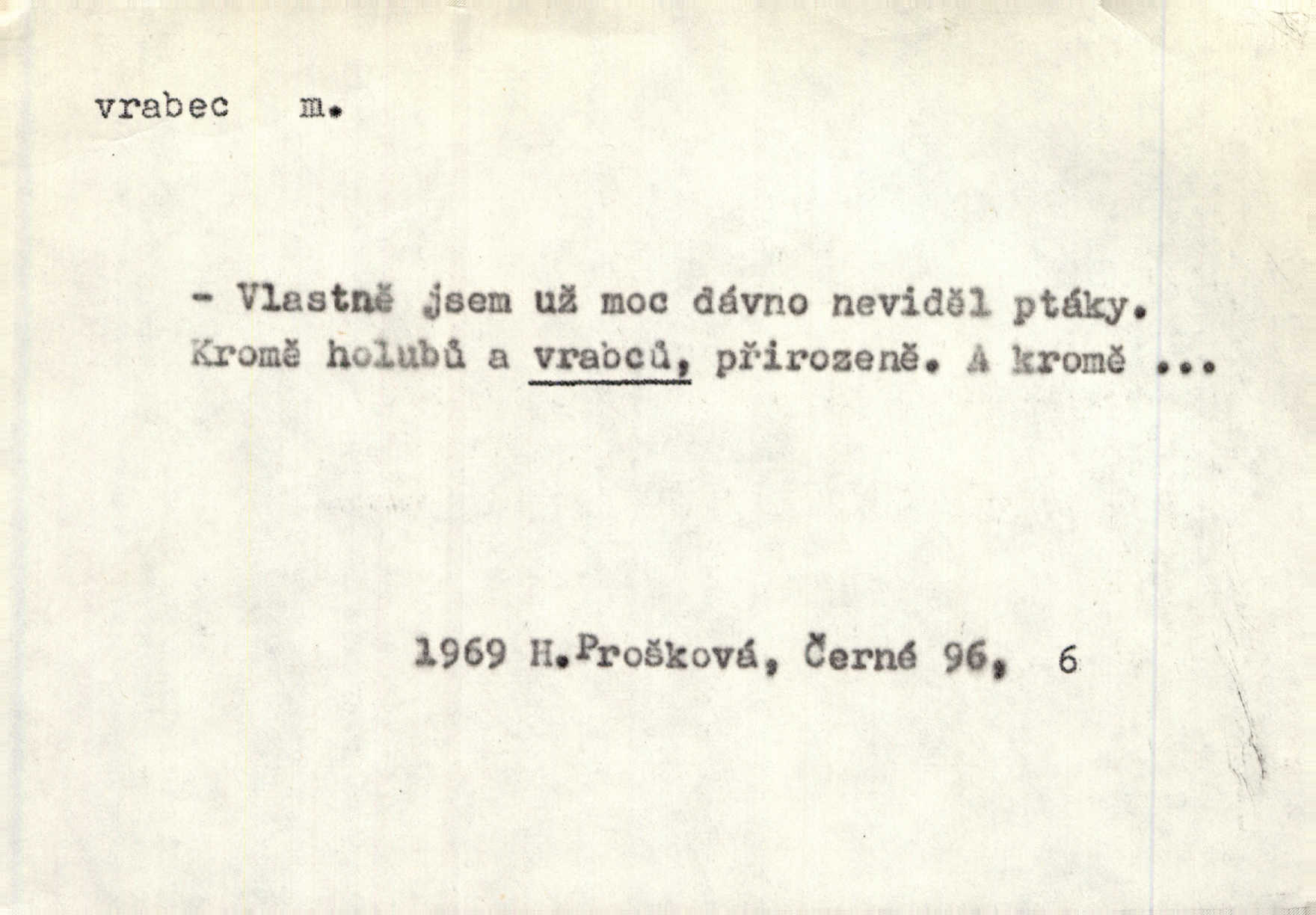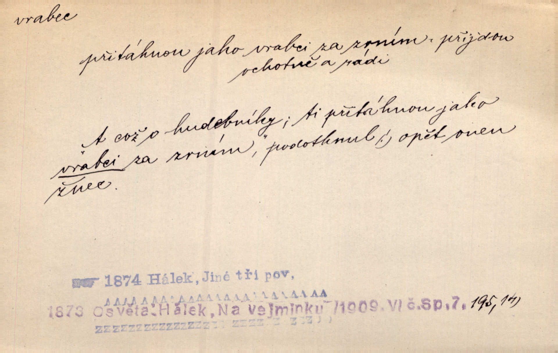 - vrabec (lid. brabec), -bce m. náš nejobyčejnější pták žijící kolem lidských sídlišť. V koších stromů štiřikali vrabci. Rais. Pozoroval jsem několik vrabců honících se za jiným, nejspíše cizím vrabcem. Ner. Vrabci a strnadi odstěhovali se do vsí ku stodolám. Jir. Teď nejsou zimy, jako bývaly. Za mého mládí padali vrabci se střech. Hál. Máš pod klobúkem brabce? neumíš smeknout? Herb. Teta sama jedla jako vrabec, kam se tedy [lívanečky] poděly? málo. Šim. Byl chudý jako vrabec. Vanč. Ten Lojzík byl takový střapatý kluk, rozdrbaný jako brabec. K. Čap. Já nemám už za vrabce síly! Pomozte mi! Mah. A což o hudebníky, ti přitáhnou jako vrabci za zrním. Hál. Po maturitním večírku jsme se rozprášili, jako když do vrabců střelí. Dyk. Tak má jeden druhého [lidi] rád jako kočka vrabce velmi nerad. Rais. Ten má lejtka jako ženatej brabec hubená. Č. lid. Masa na mně moc není, Anda říká, že jsem jako ženatej vrabec. Rais. Chceli sedlák náš neodbytnosť někoho naznačit, praví: „Stěhuje se jako vrabec z Čech“ loudavě. Ner. Jasná myšlenka svitla v Hrabcově hlavě. Nešel však na brabce s bubnem neunáhlil se, nejednal neopatrně. Herb. Myslím si, že je zbytečno mluvit o vrabci na střeše o něčem nejistém. Baar. Lepší vrabec v hrsti nežli holub na střeše. Přísl. V Praze nepadají pečení vrabci do huby živobytí není snadné. Svob. Ať jen mlčí tvá svatá paní, vrabci na střechách o tom štěbetají, že je bečka hříchů je všeobecně známo. Něm. Přen. Přeškoda, že jest pan Vokoun takový starý, sivý vrabec. Herrm. Malí uličníci, ti vrabci velkoměstské ulice. Heřm. Neměla valný kus cesty, když se sníh rozpadal. Vrabci ho padali velké kusy. Hol. Zool. vrabec rod ptáků z čeledi pěnkavovitých, Passer; vrabec domácí. Kuch. vrabci druh noků z brambor n. moučného těsta. Odřezky vepřového masa.