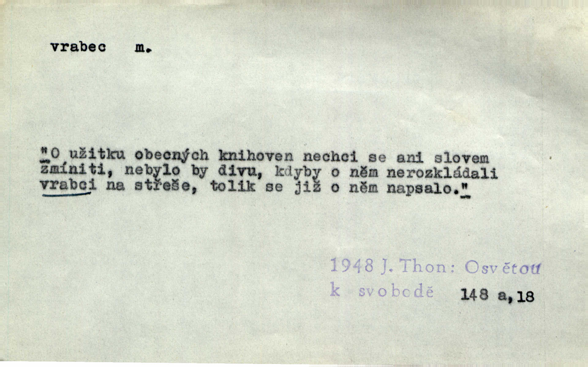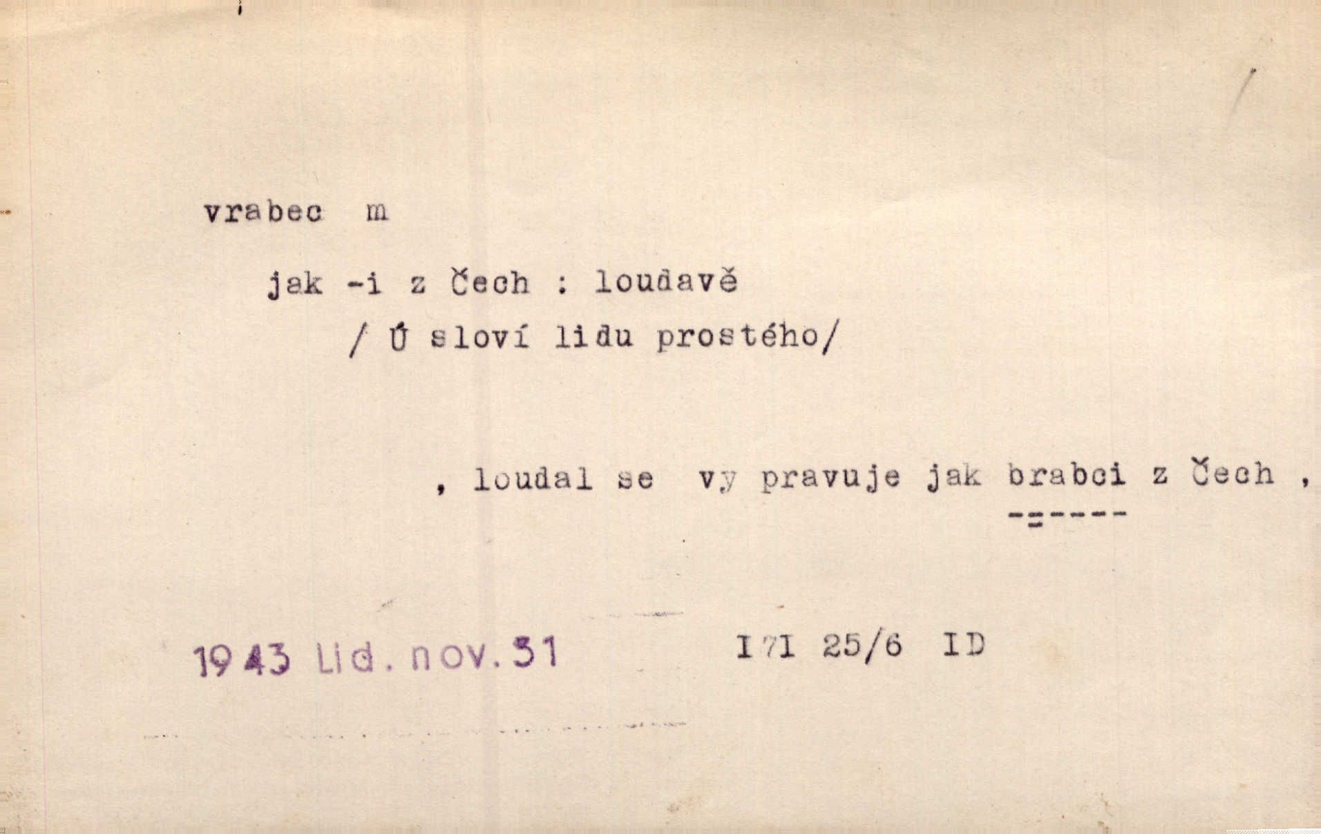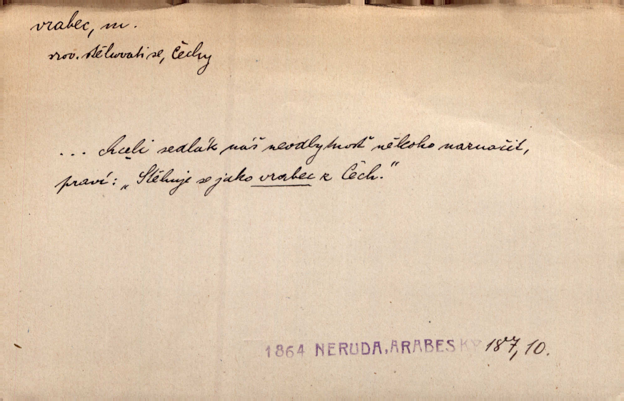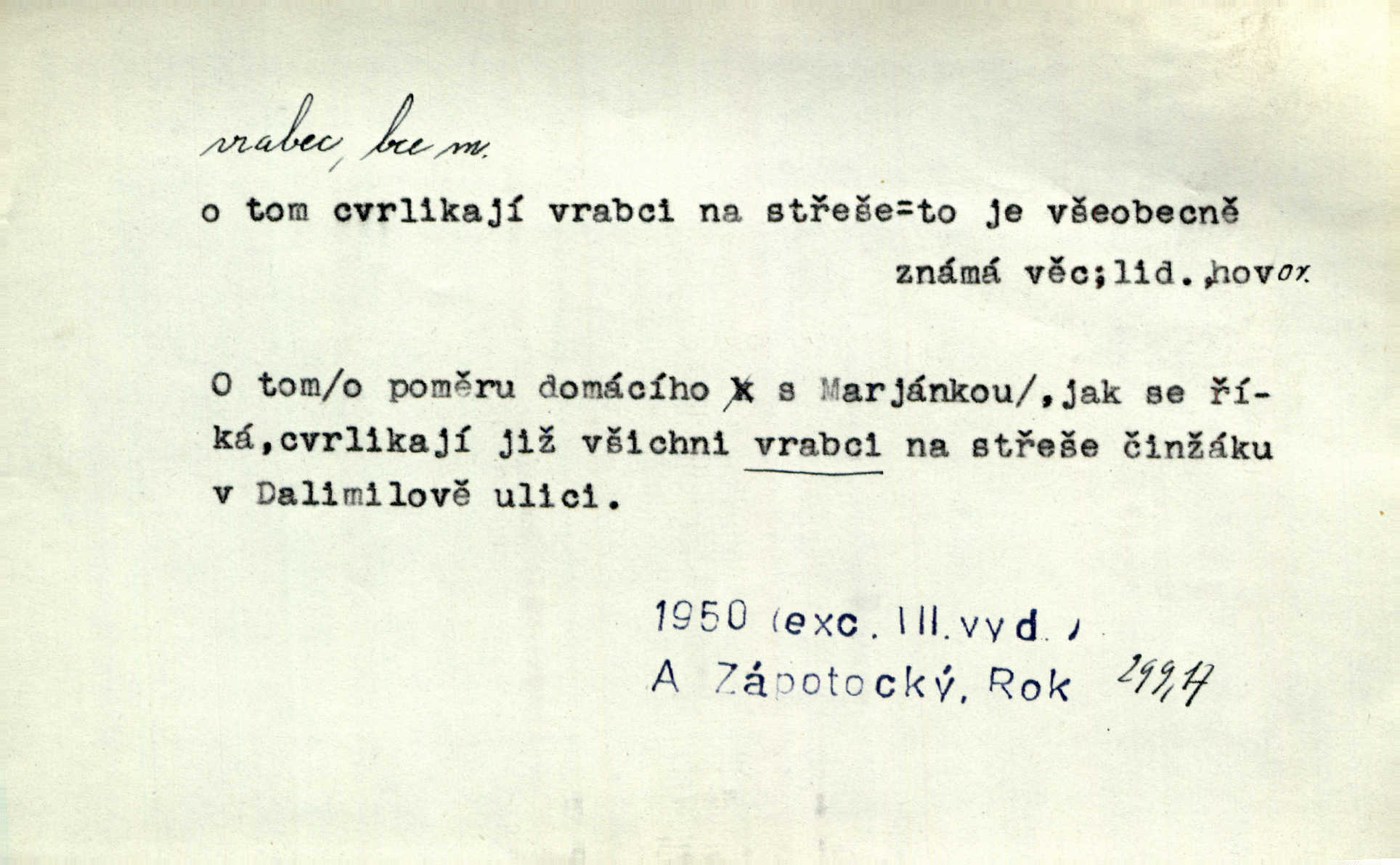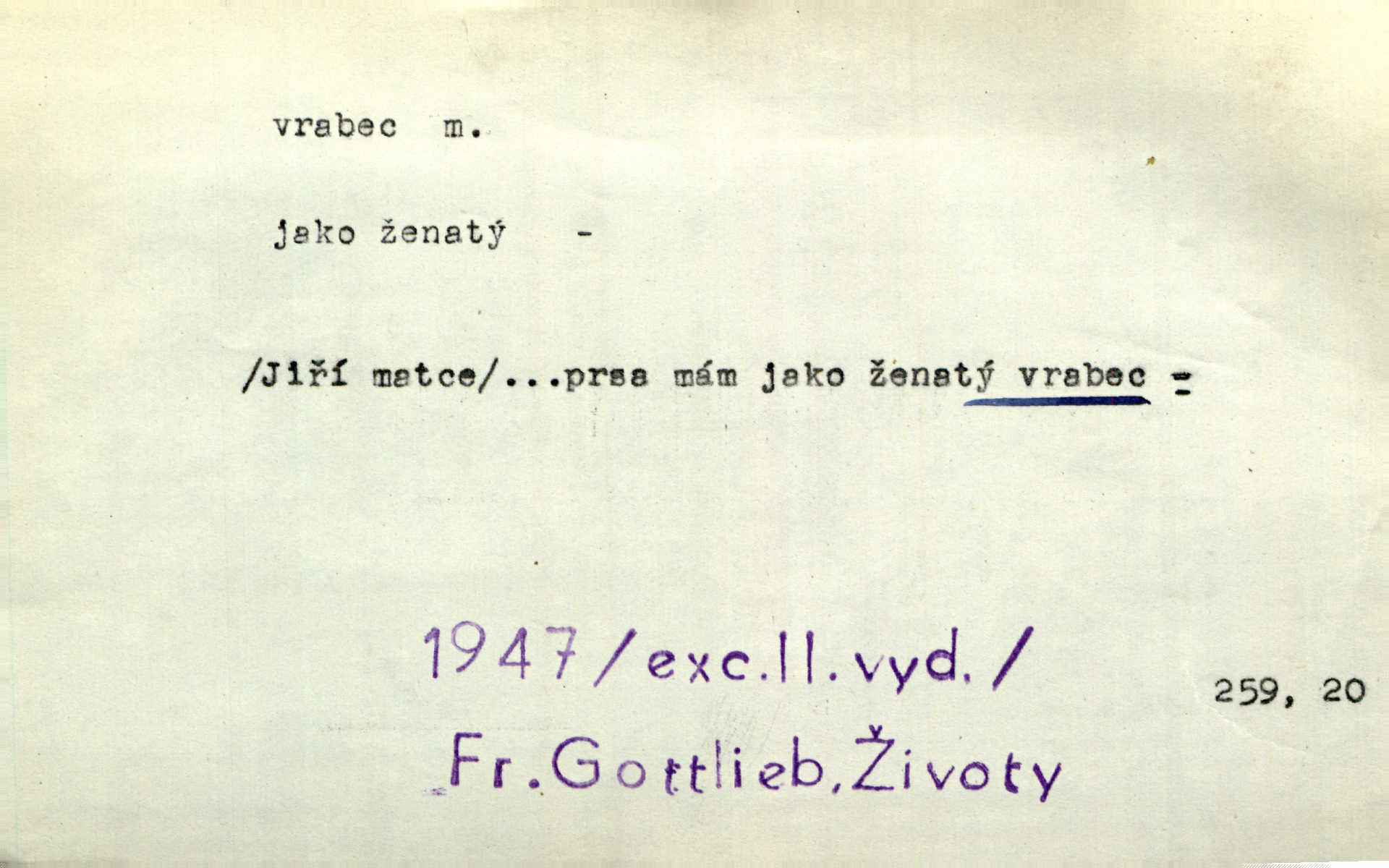 - vrabec (lid. brabec), -bce m. náš nejobyčejnější pták žijící kolem lidských sídlišť. V koších stromů štiřikali vrabci. Rais. Pozoroval jsem několik vrabců honících se za jiným, nejspíše cizím vrabcem. Ner. Vrabci a strnadi odstěhovali se do vsí ku stodolám. Jir. Teď nejsou zimy, jako bývaly. Za mého mládí padali vrabci se střech. Hál. Máš pod klobúkem brabce? neumíš smeknout? Herb. Teta sama jedla jako vrabec, kam se tedy [lívanečky] poděly? málo. Šim. Byl chudý jako vrabec. Vanč. Ten Lojzík byl takový střapatý kluk, rozdrbaný jako brabec. K. Čap. Já nemám už za vrabce síly! Pomozte mi! Mah. A což o hudebníky, ti přitáhnou jako vrabci za zrním. Hál. Po maturitním večírku jsme se rozprášili, jako když do vrabců střelí. Dyk. Tak má jeden druhého [lidi] rád jako kočka vrabce velmi nerad. Rais. Ten má lejtka jako ženatej brabec hubená. Č. lid. Masa na mně moc není, Anda říká, že jsem jako ženatej vrabec. Rais. Chceli sedlák náš neodbytnosť někoho naznačit, praví: „Stěhuje se jako vrabec z Čech“ loudavě. Ner. Jasná myšlenka svitla v Hrabcově hlavě. Nešel však na brabce s bubnem neunáhlil se, nejednal neopatrně. Herb. Myslím si, že je zbytečno mluvit o vrabci na střeše o něčem nejistém. Baar. Lepší vrabec v hrsti nežli holub na střeše. Přísl. V Praze nepadají pečení vrabci do huby živobytí není snadné. Svob. Ať jen mlčí tvá svatá paní, vrabci na střechách o tom štěbetají, že je bečka hříchů je všeobecně známo. Něm. Přen. Přeškoda, že jest pan Vokoun takový starý, sivý vrabec. Herrm. Malí uličníci, ti vrabci velkoměstské ulice. Heřm. Neměla valný kus cesty, když se sníh rozpadal. Vrabci ho padali velké kusy. Hol. Zool. vrabec rod ptáků z čeledi pěnkavovitých, Passer; vrabec domácí. Kuch. vrabci druh noků z brambor n. moučného těsta. Odřezky vepřového masa.