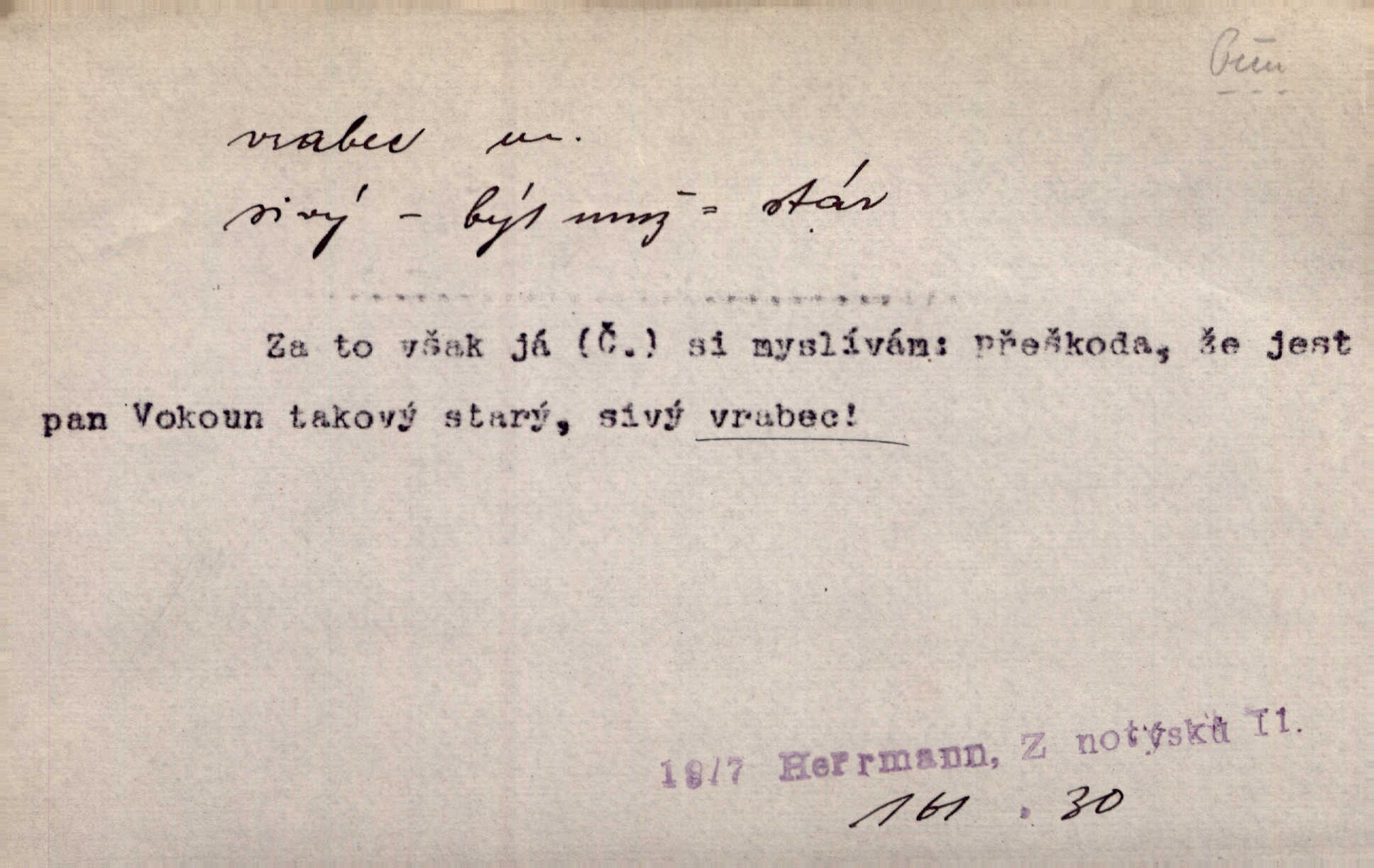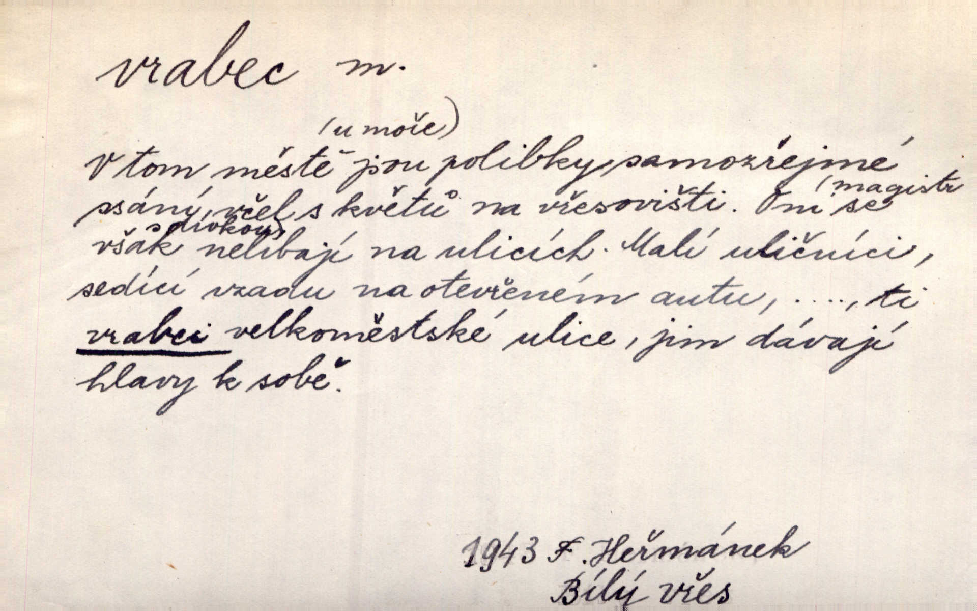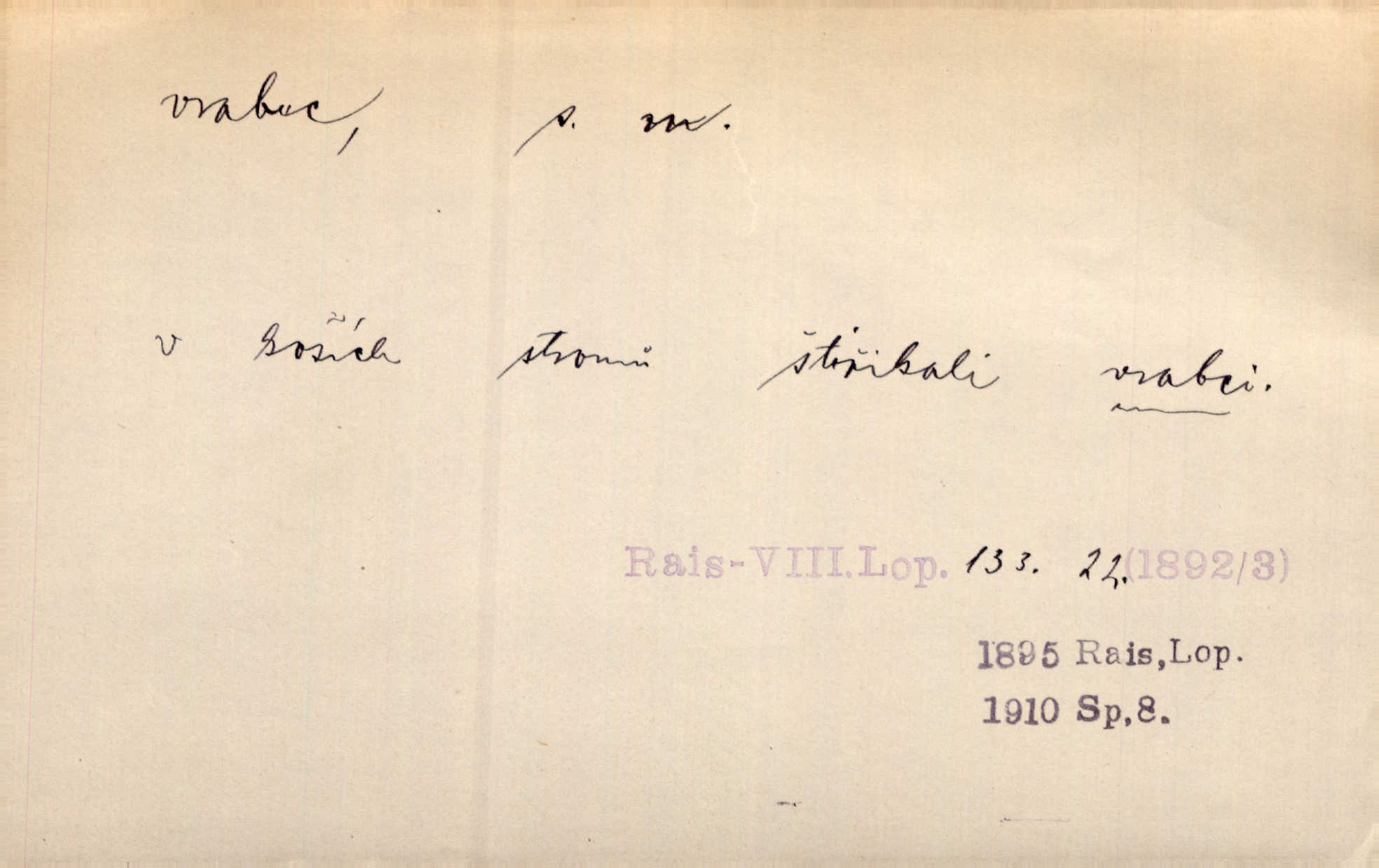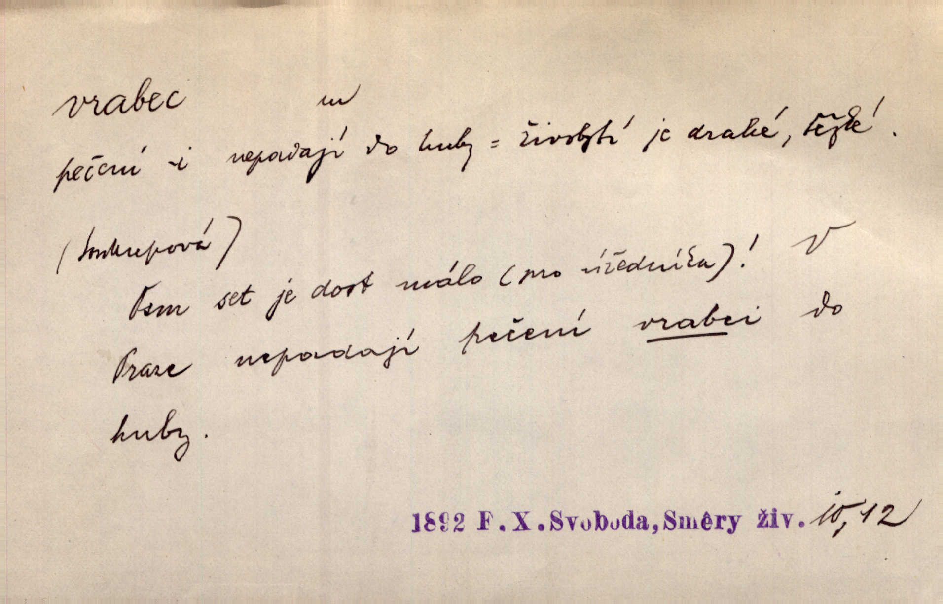 - vrabec (lid. brabec), -bce m. náš nejobyčejnější pták žijící kolem lidských sídlišť. V koších stromů štiřikali vrabci. Rais. Pozoroval jsem několik vrabců honících se za jiným, nejspíše cizím vrabcem. Ner. Vrabci a strnadi odstěhovali se do vsí ku stodolám. Jir. Teď nejsou zimy, jako bývaly. Za mého mládí padali vrabci se střech. Hál. Máš pod klobúkem brabce? neumíš smeknout? Herb. Teta sama jedla jako vrabec, kam se tedy [lívanečky] poděly? málo. Šim. Byl chudý jako vrabec. Vanč. Ten Lojzík byl takový střapatý kluk, rozdrbaný jako brabec. K. Čap. Já nemám už za vrabce síly! Pomozte mi! Mah. A což o hudebníky, ti přitáhnou jako vrabci za zrním. Hál. Po maturitním večírku jsme se rozprášili, jako když do vrabců střelí. Dyk. Tak má jeden druhého [lidi] rád jako kočka vrabce velmi nerad. Rais. Ten má lejtka jako ženatej brabec hubená. Č. lid. Masa na mně moc není, Anda říká, že jsem jako ženatej vrabec. Rais. Chceli sedlák náš neodbytnosť někoho naznačit, praví: „Stěhuje se jako vrabec z Čech“ loudavě. Ner. Jasná myšlenka svitla v Hrabcově hlavě. Nešel však na brabce s bubnem neunáhlil se, nejednal neopatrně. Herb. Myslím si, že je zbytečno mluvit o vrabci na střeše o něčem nejistém. Baar. Lepší vrabec v hrsti nežli holub na střeše. Přísl. V Praze nepadají pečení vrabci do huby živobytí není snadné. Svob. Ať jen mlčí tvá svatá paní, vrabci na střechách o tom štěbetají, že je bečka hříchů je všeobecně známo. Něm. Přen. Přeškoda, že jest pan Vokoun takový starý, sivý vrabec. Herrm. Malí uličníci, ti vrabci velkoměstské ulice. Heřm. Neměla valný kus cesty, když se sníh rozpadal. Vrabci ho padali velké kusy. Hol. Zool. vrabec rod ptáků z čeledi pěnkavovitých, Passer; vrabec domácí. Kuch. vrabci druh noků z brambor n. moučného těsta. Odřezky vepřového masa.