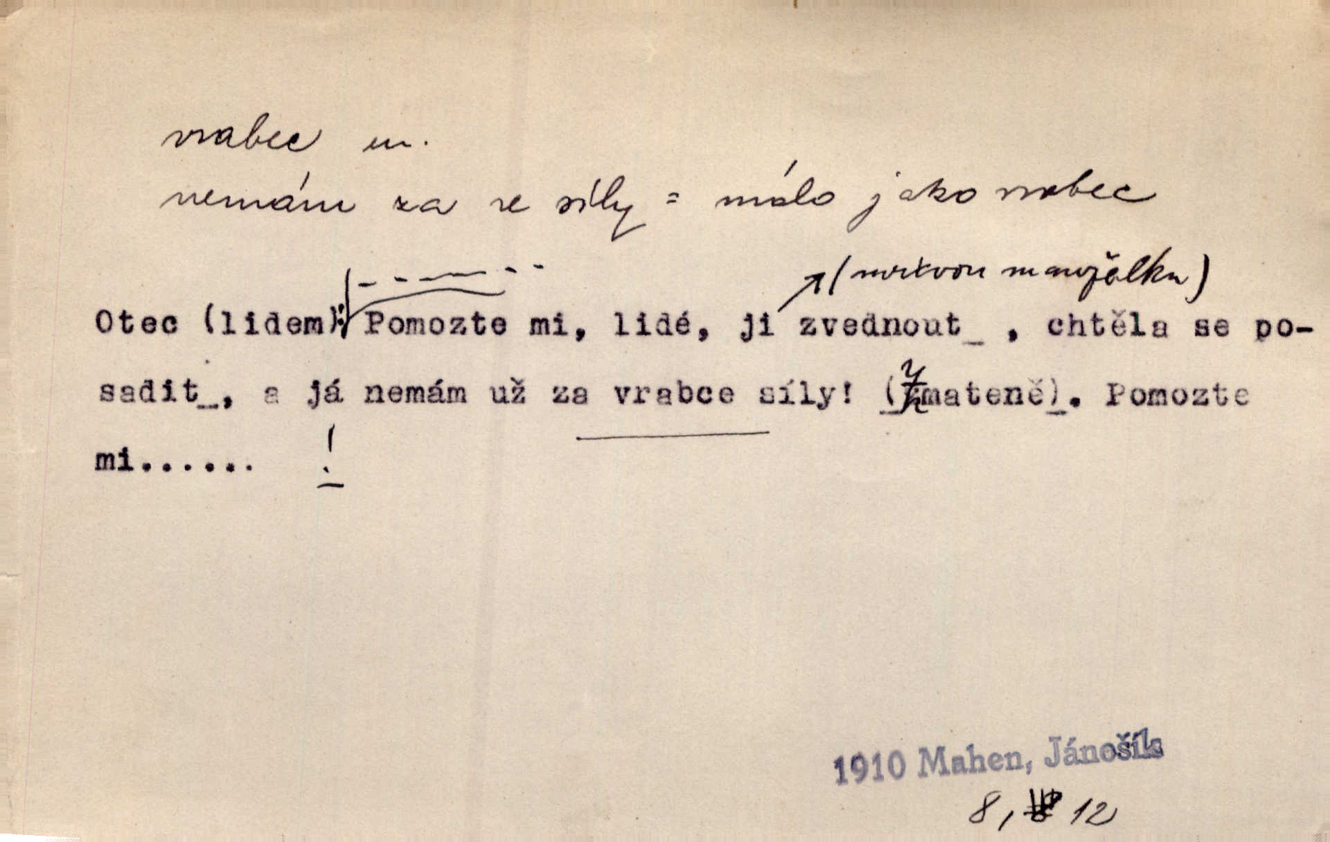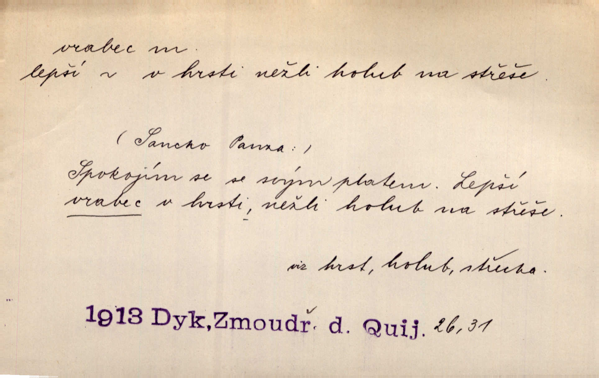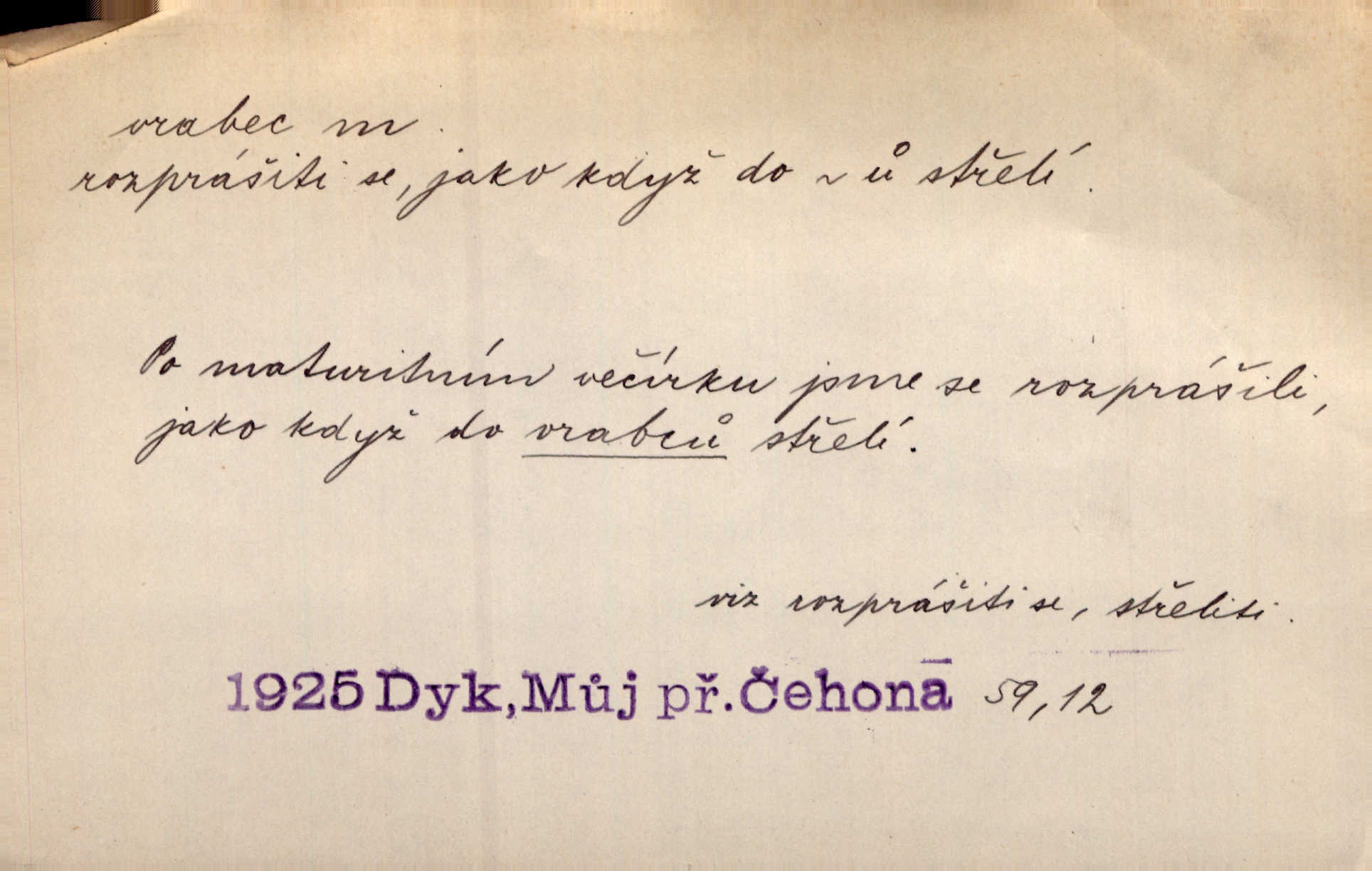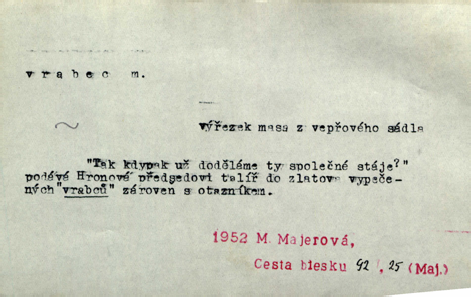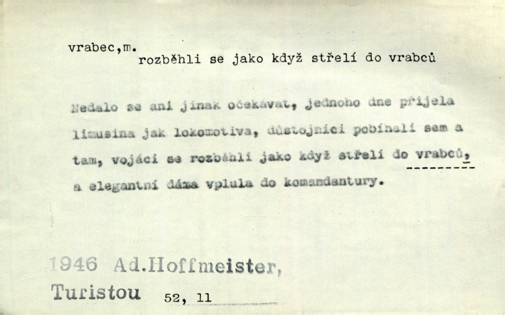 - vrabec (lid. brabec), -bce m. náš nejobyčejnější pták žijící kolem lidských sídlišť. V koších stromů štiřikali vrabci. Rais. Pozoroval jsem několik vrabců honících se za jiným, nejspíše cizím vrabcem. Ner. Vrabci a strnadi odstěhovali se do vsí ku stodolám. Jir. Teď nejsou zimy, jako bývaly. Za mého mládí padali vrabci se střech. Hál. Máš pod klobúkem brabce? neumíš smeknout? Herb. Teta sama jedla jako vrabec, kam se tedy [lívanečky] poděly? málo. Šim. Byl chudý jako vrabec. Vanč. Ten Lojzík byl takový střapatý kluk, rozdrbaný jako brabec. K. Čap. Já nemám už za vrabce síly! Pomozte mi! Mah. A což o hudebníky, ti přitáhnou jako vrabci za zrním. Hál. Po maturitním večírku jsme se rozprášili, jako když do vrabců střelí. Dyk. Tak má jeden druhého [lidi] rád jako kočka vrabce velmi nerad. Rais. Ten má lejtka jako ženatej brabec hubená. Č. lid. Masa na mně moc není, Anda říká, že jsem jako ženatej vrabec. Rais. Chceli sedlák náš neodbytnosť někoho naznačit, praví: „Stěhuje se jako vrabec z Čech“ loudavě. Ner. Jasná myšlenka svitla v Hrabcově hlavě. Nešel však na brabce s bubnem neunáhlil se, nejednal neopatrně. Herb. Myslím si, že je zbytečno mluvit o vrabci na střeše o něčem nejistém. Baar. Lepší vrabec v hrsti nežli holub na střeše. Přísl. V Praze nepadají pečení vrabci do huby živobytí není snadné. Svob. Ať jen mlčí tvá svatá paní, vrabci na střechách o tom štěbetají, že je bečka hříchů je všeobecně známo. Něm. Přen. Přeškoda, že jest pan Vokoun takový starý, sivý vrabec. Herrm. Malí uličníci, ti vrabci velkoměstské ulice. Heřm. Neměla valný kus cesty, když se sníh rozpadal. Vrabci ho padali velké kusy. Hol. Zool. vrabec rod ptáků z čeledi pěnkavovitých, Passer; vrabec domácí. Kuch. vrabci druh noků z brambor n. moučného těsta. Odřezky vepřového masa.