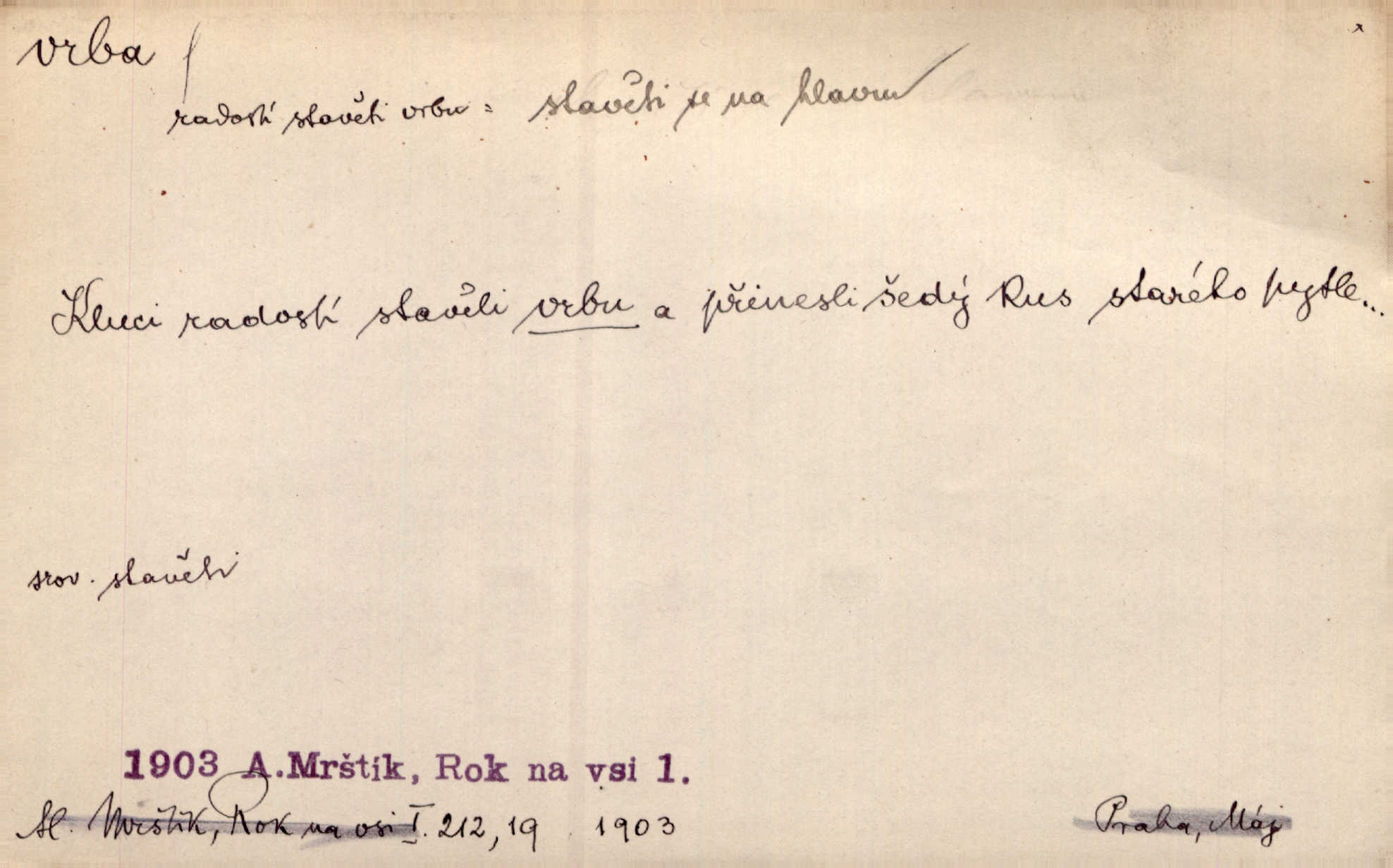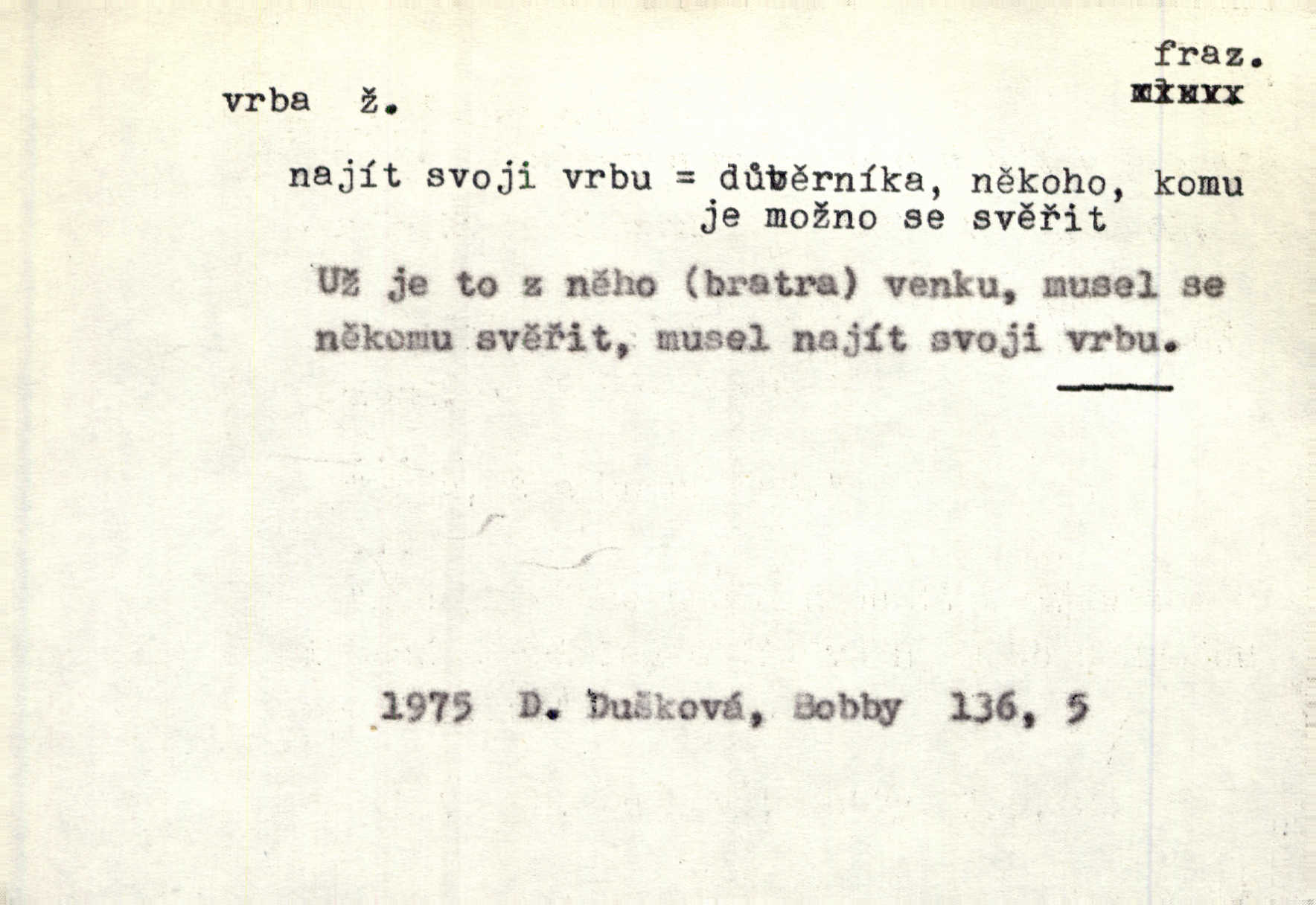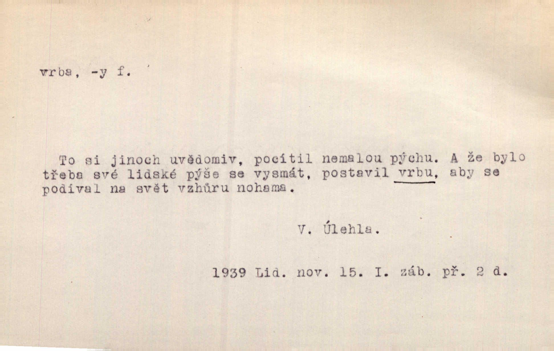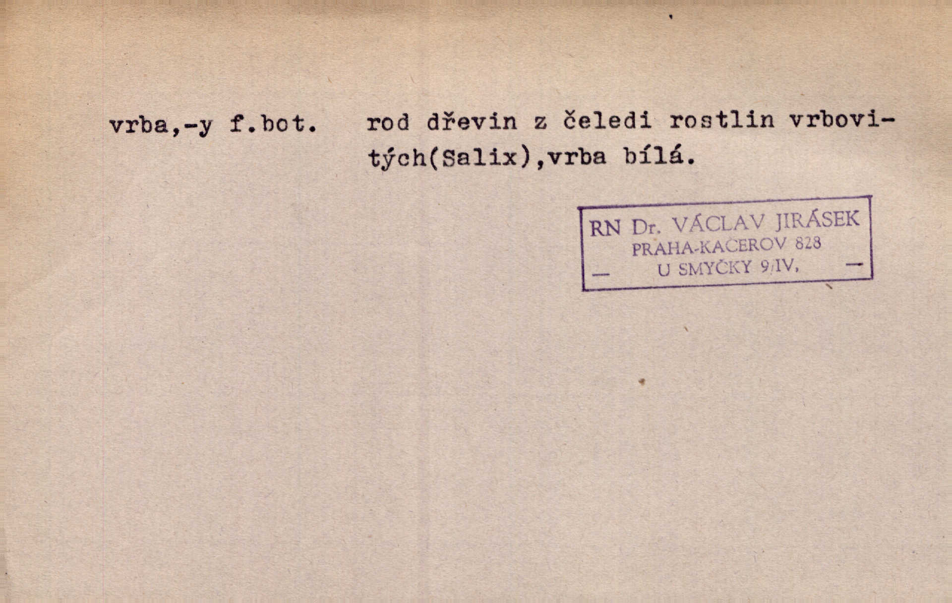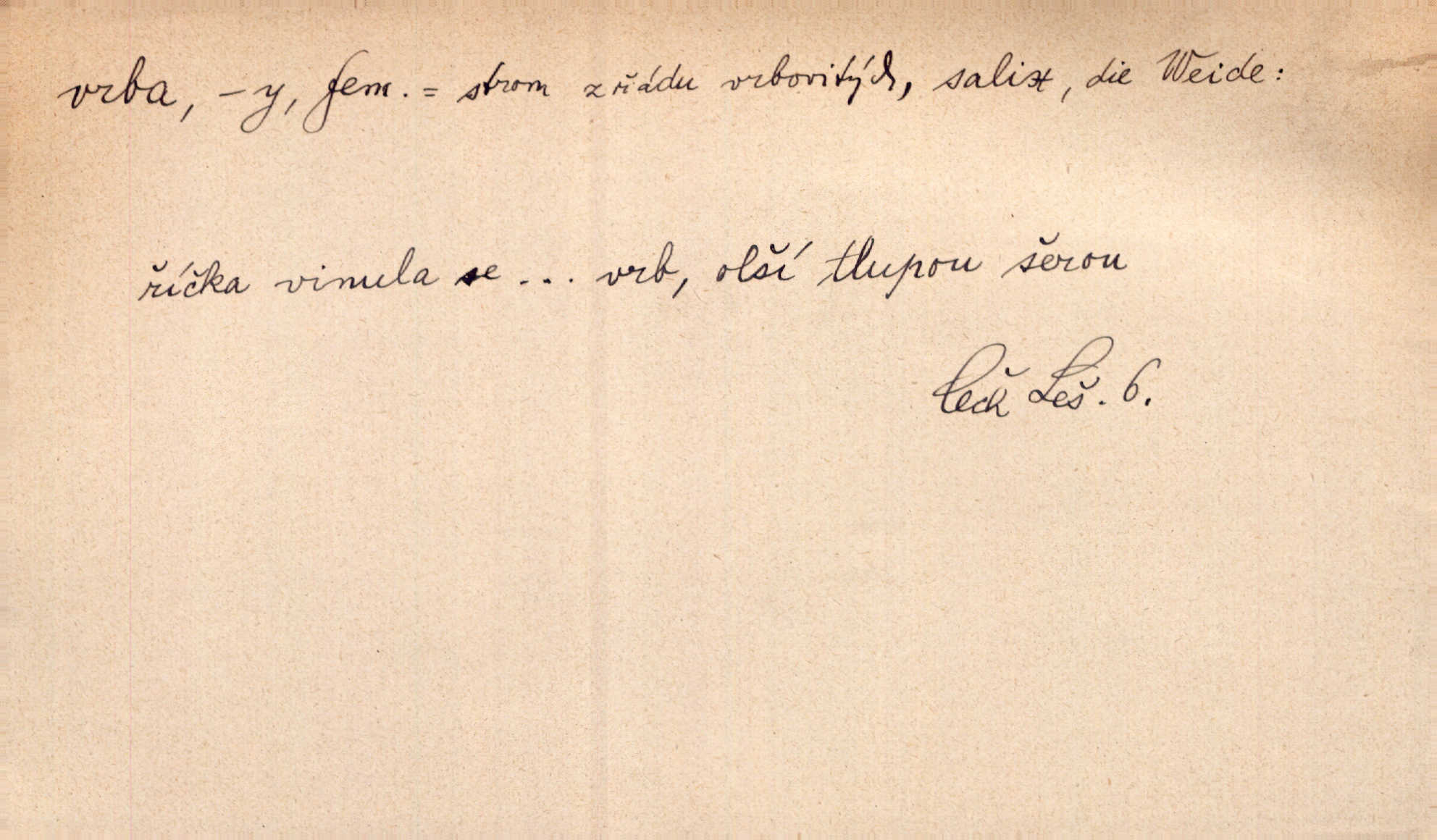 - vrba, -y f. keř n. strom rostoucí na vlhkých místech. Po březích mládly štíhlé olšiny a stárly mdle zelené vrby. Třeb. Na stoku dvou řek stojí dutá vrba. Havl. Vsaď na osamělý hrob můj vrbu. Zey. Poseděl hodinku v malém parku před jezírkem, odstíněným smutečními vrbami se svislými větvemi. Čech. Vy mi malujete straku na vrbě, táto! namlouváte něco nepravdivého. Klost. My nejsme tak hloupé, abys nám mohl ukazovat straky na vrbě. Něm. D Dial. Kluci radostí stavěli vrbu stavěli se na hlavu. A. Mrš. Hoši na drnu metali kozelce, stavěli suchou vrbu, chodili po rukou. Baar. A hned udělal suchou vrbu, jak se říká stojce na hlavě. Sekora. Bot. rod dřevin z čeledi rostlin vrbovitých, Salix; vrba bílá.