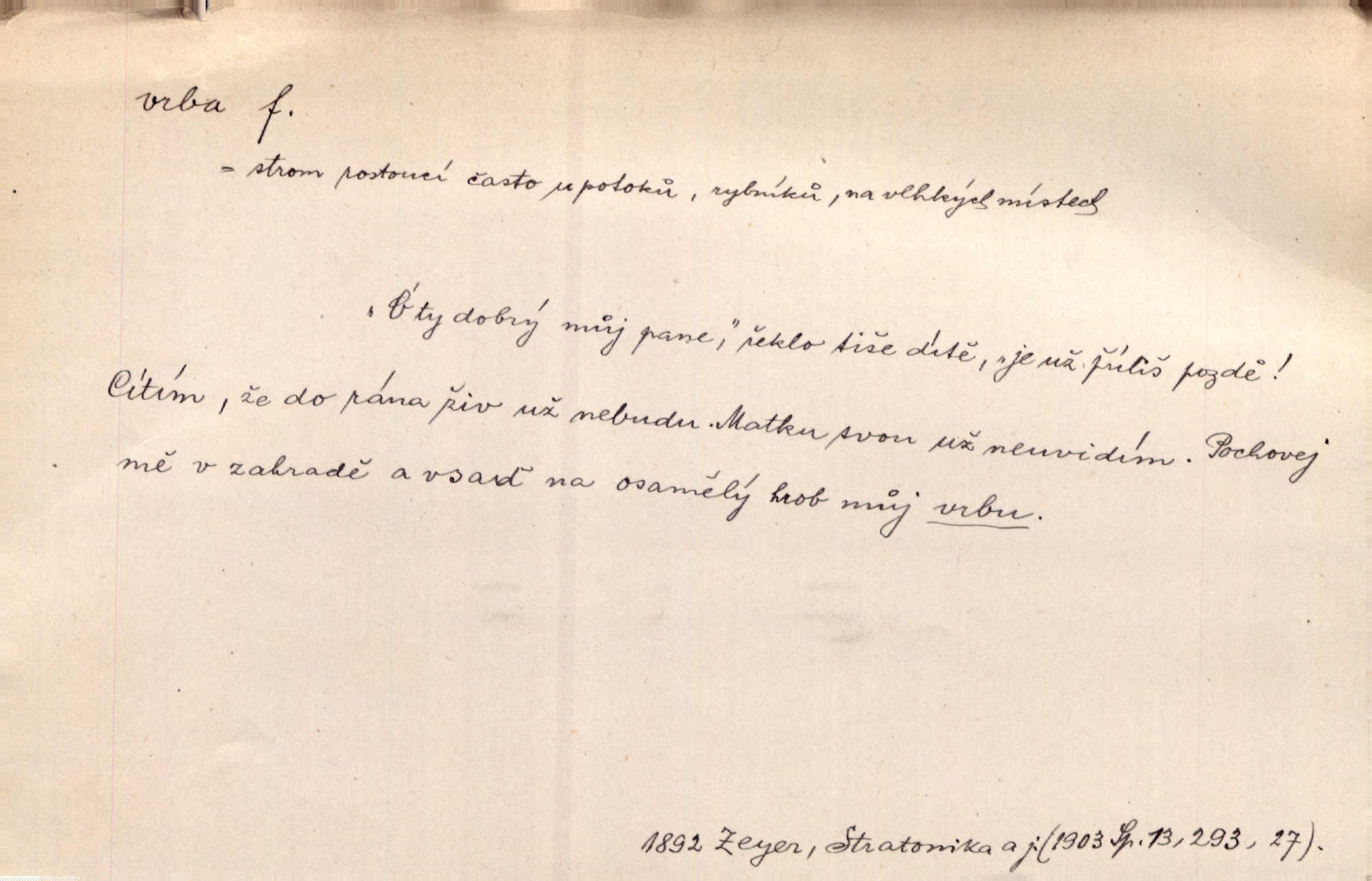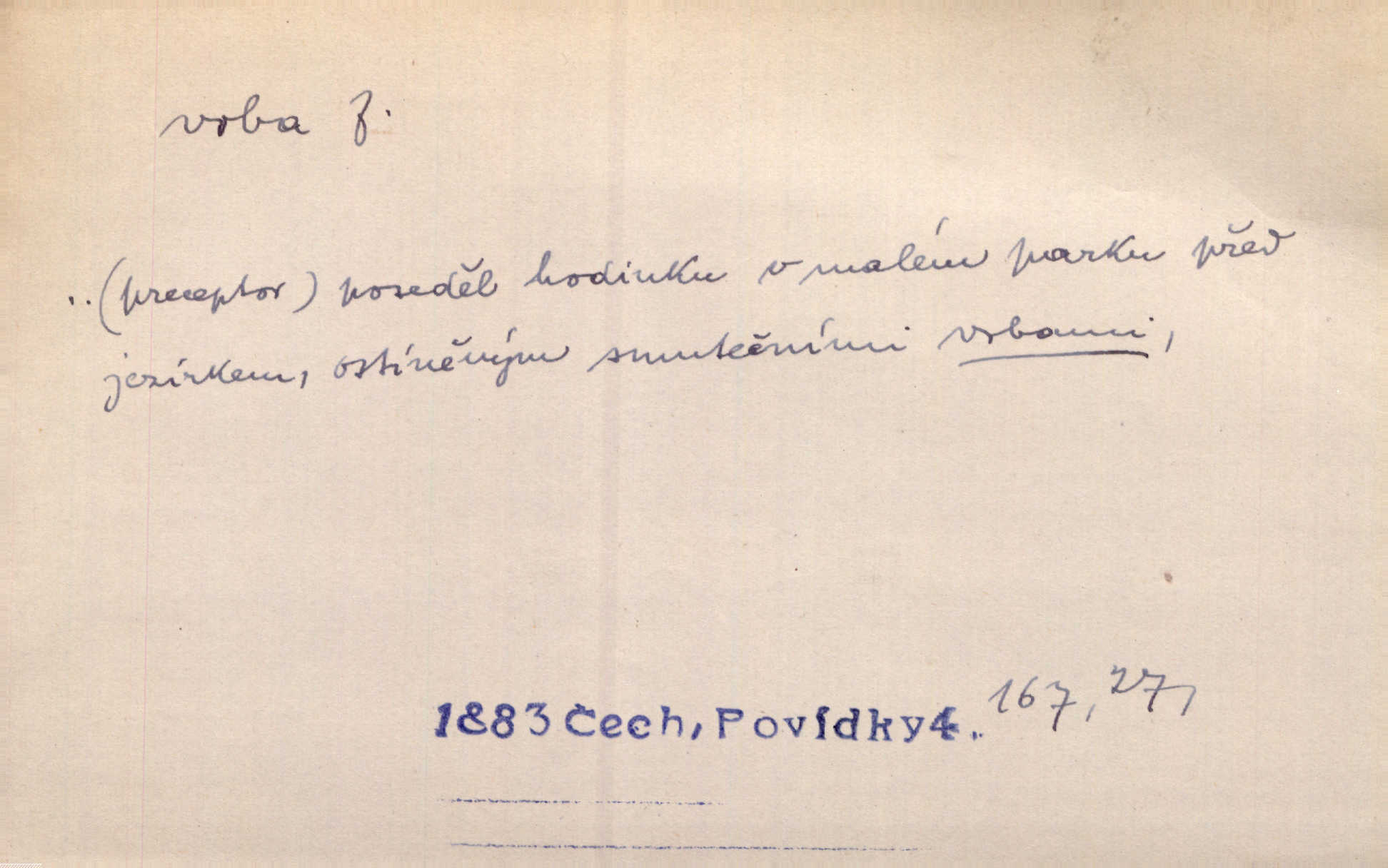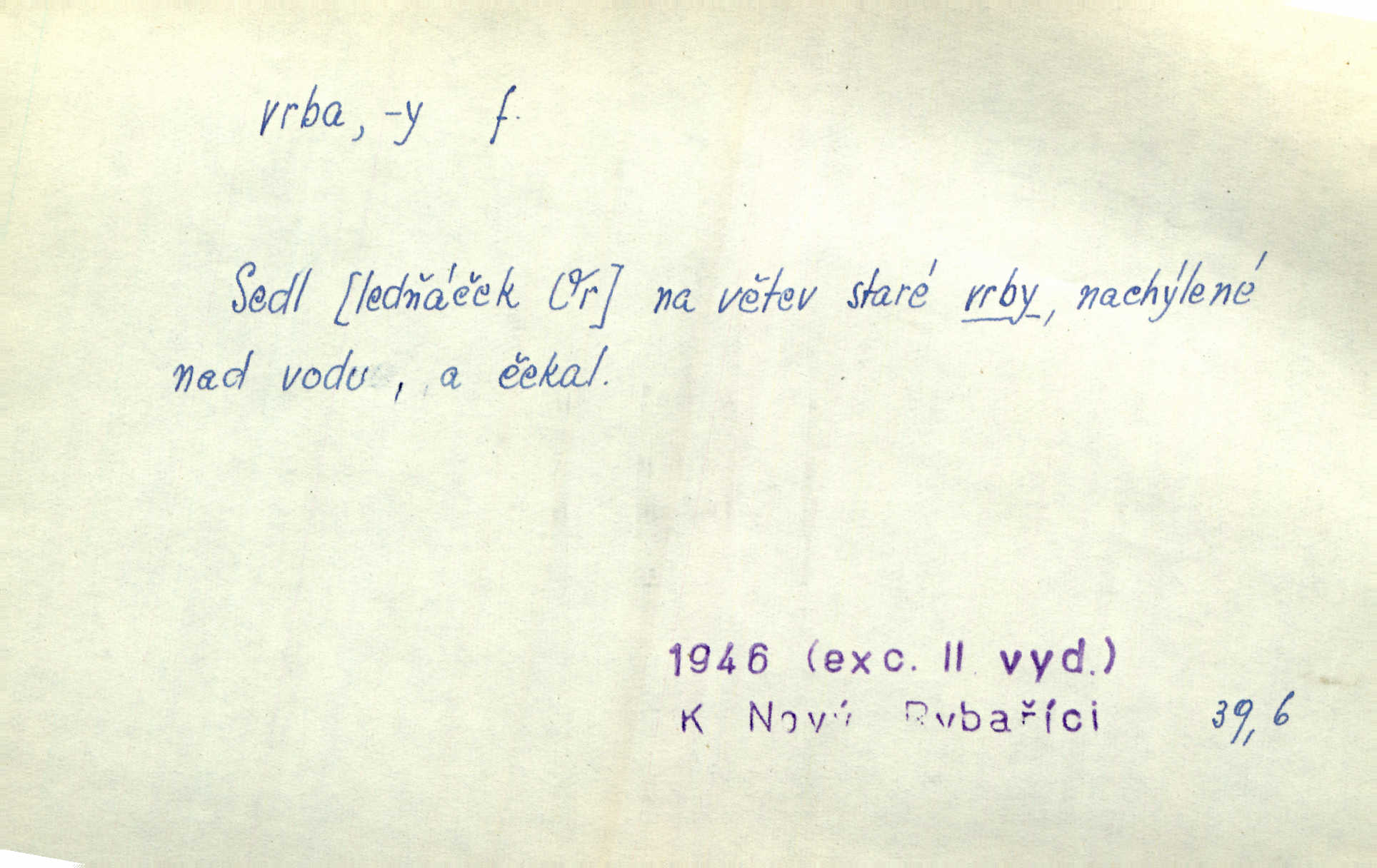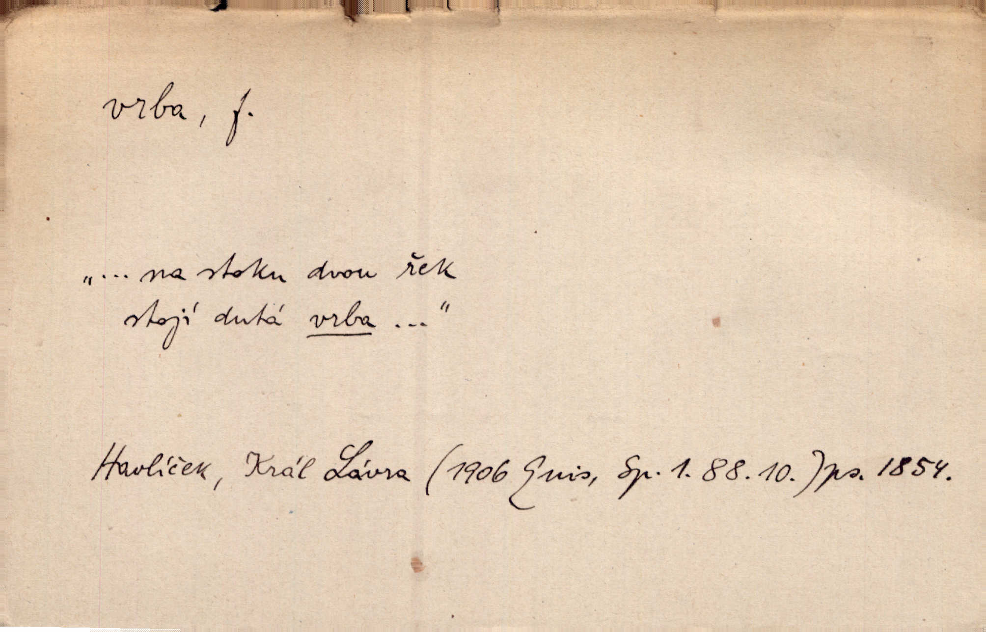 - vrba, -y f. keř n. strom rostoucí na vlhkých místech. Po březích mládly štíhlé olšiny a stárly mdle zelené vrby. Třeb. Na stoku dvou řek stojí dutá vrba. Havl. Vsaď na osamělý hrob můj vrbu. Zey. Poseděl hodinku v malém parku před jezírkem, odstíněným smutečními vrbami se svislými větvemi. Čech. Vy mi malujete straku na vrbě, táto! namlouváte něco nepravdivého. Klost. My nejsme tak hloupé, abys nám mohl ukazovat straky na vrbě. Něm. D Dial. Kluci radostí stavěli vrbu stavěli se na hlavu. A. Mrš. Hoši na drnu metali kozelce, stavěli suchou vrbu, chodili po rukou. Baar. A hned udělal suchou vrbu, jak se říká stojce na hlavě. Sekora. Bot. rod dřevin z čeledi rostlin vrbovitých, Salix; vrba bílá.