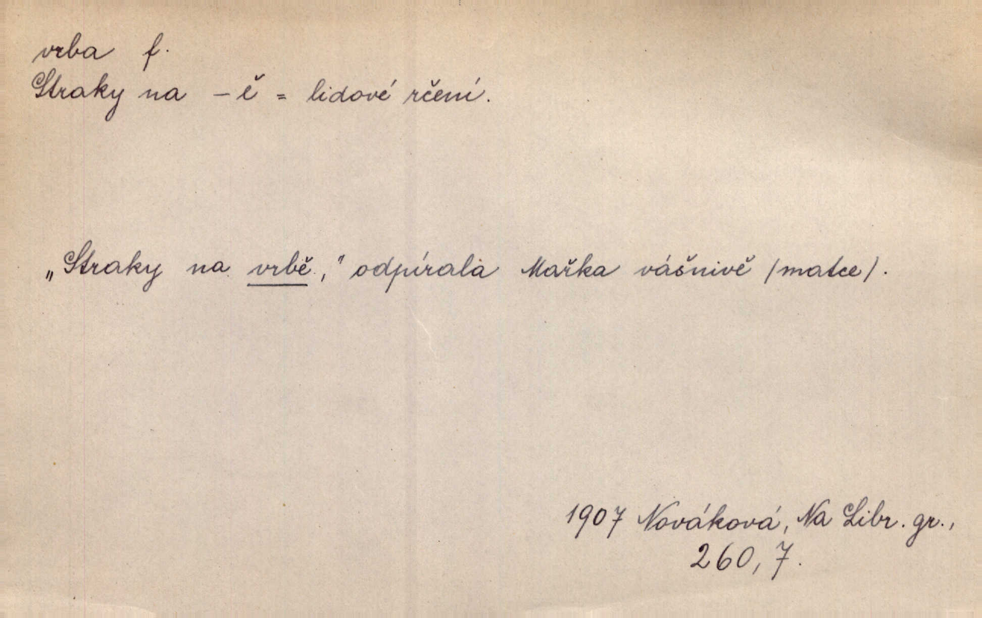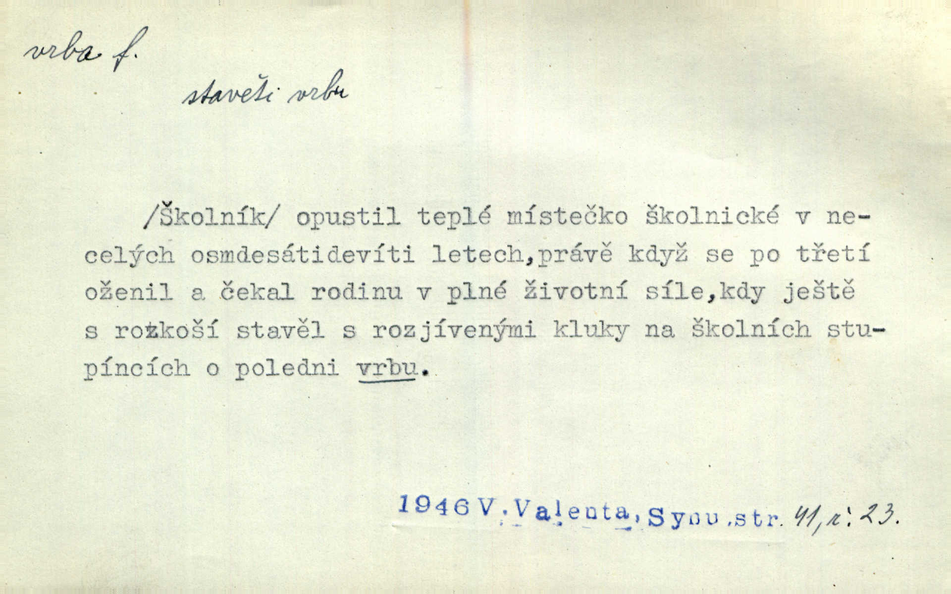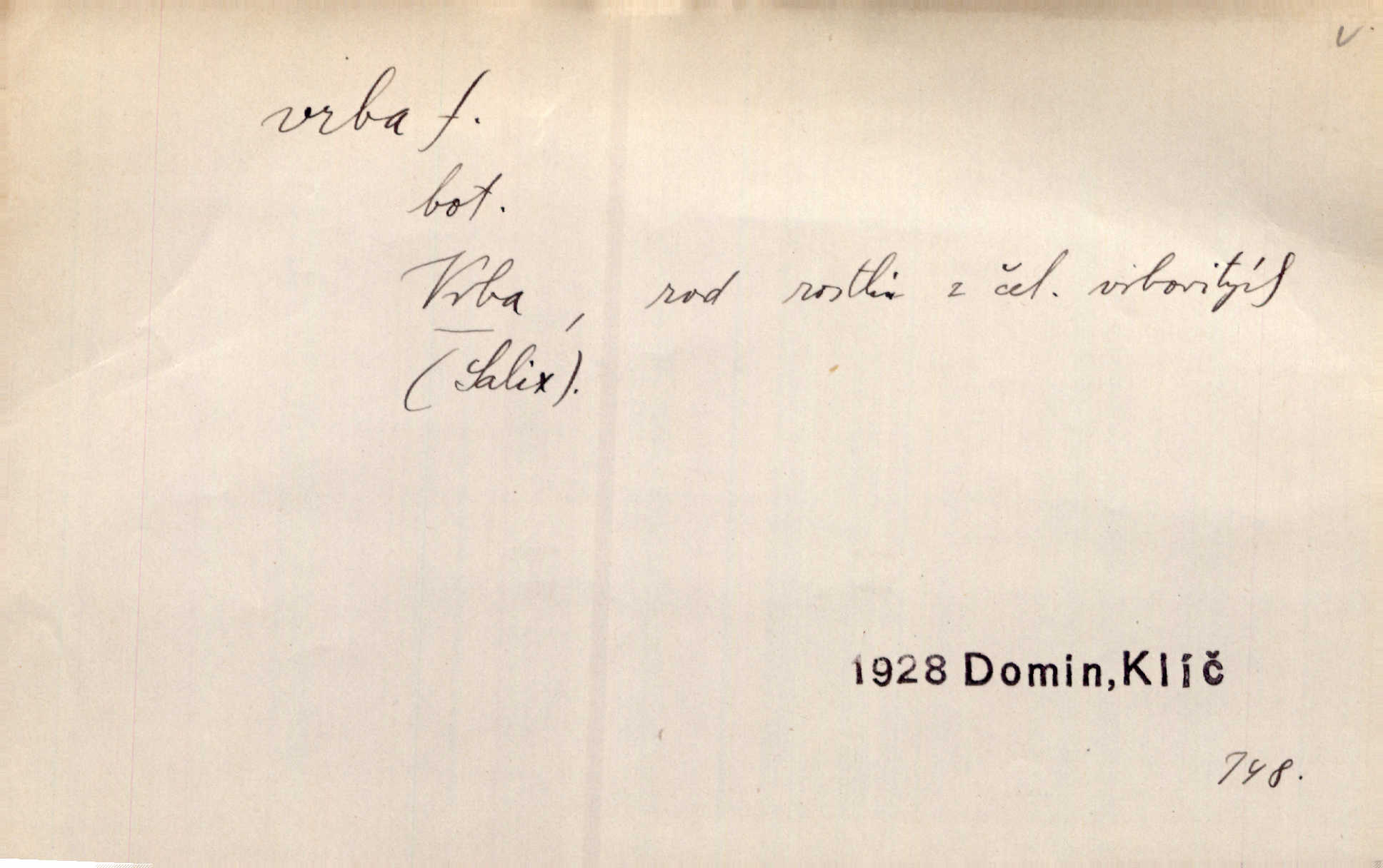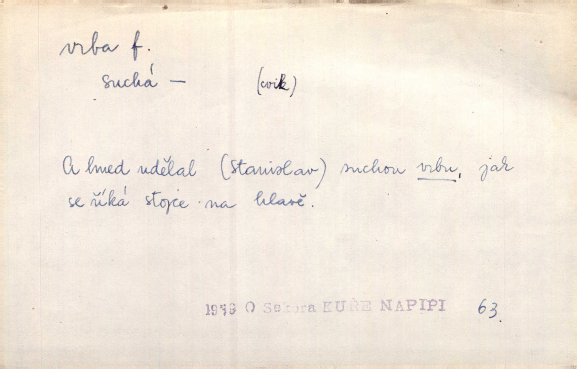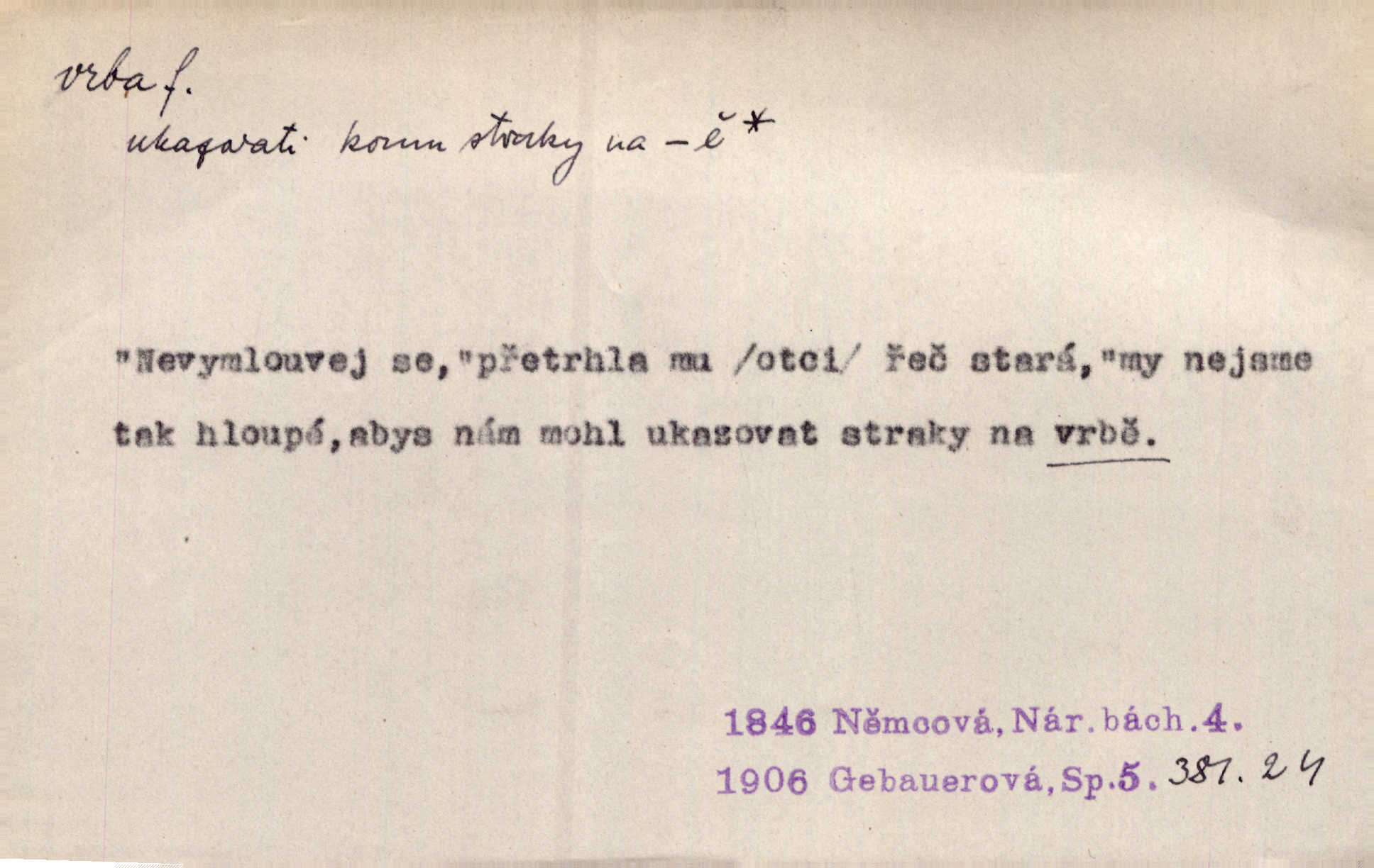 - vrba, -y f. keř n. strom rostoucí na vlhkých místech. Po březích mládly štíhlé olšiny a stárly mdle zelené vrby. Třeb. Na stoku dvou řek stojí dutá vrba. Havl. Vsaď na osamělý hrob můj vrbu. Zey. Poseděl hodinku v malém parku před jezírkem, odstíněným smutečními vrbami se svislými větvemi. Čech. Vy mi malujete straku na vrbě, táto! namlouváte něco nepravdivého. Klost. My nejsme tak hloupé, abys nám mohl ukazovat straky na vrbě. Něm. D Dial. Kluci radostí stavěli vrbu stavěli se na hlavu. A. Mrš. Hoši na drnu metali kozelce, stavěli suchou vrbu, chodili po rukou. Baar. A hned udělal suchou vrbu, jak se říká stojce na hlavě. Sekora. Bot. rod dřevin z čeledi rostlin vrbovitých, Salix; vrba bílá.
