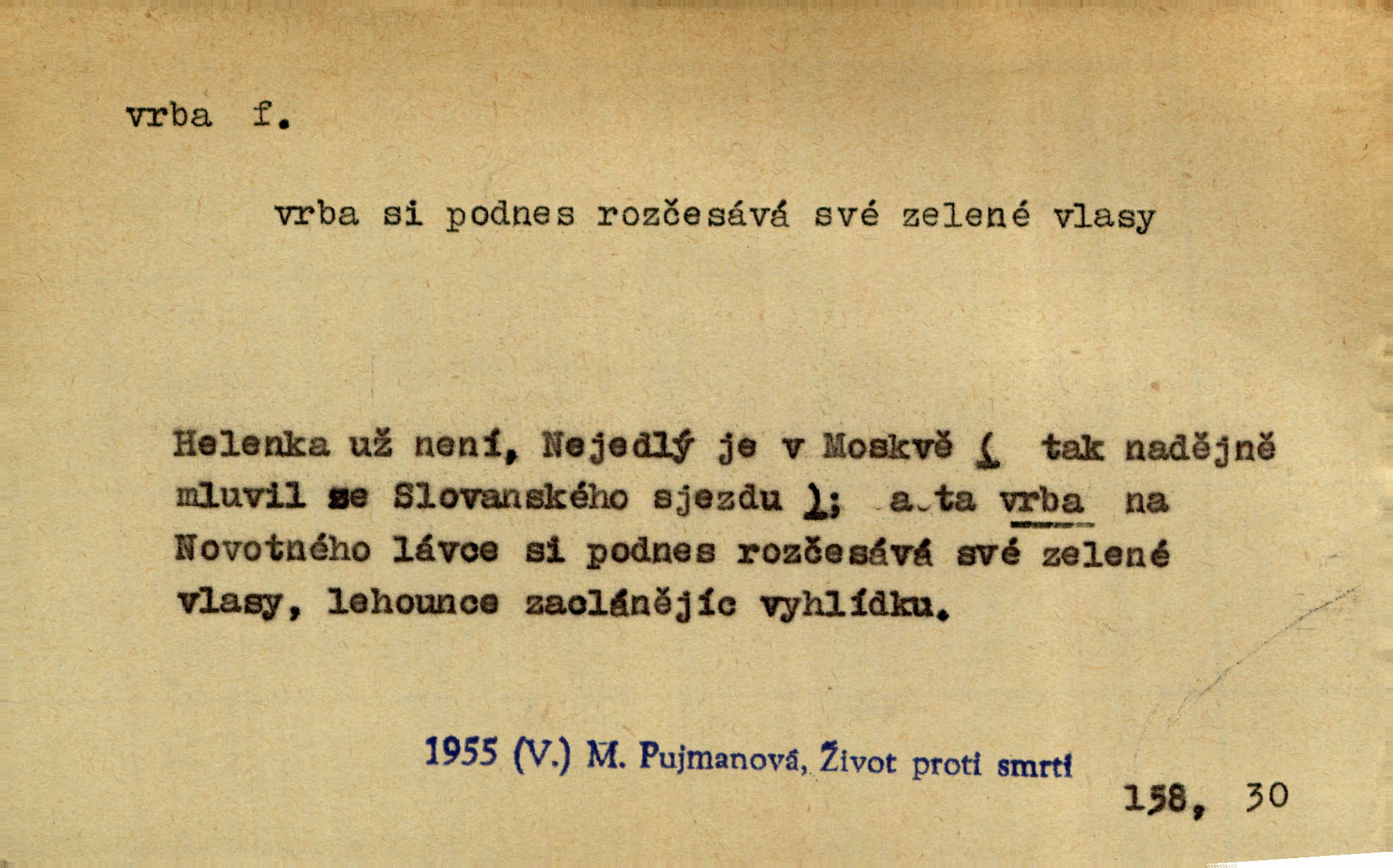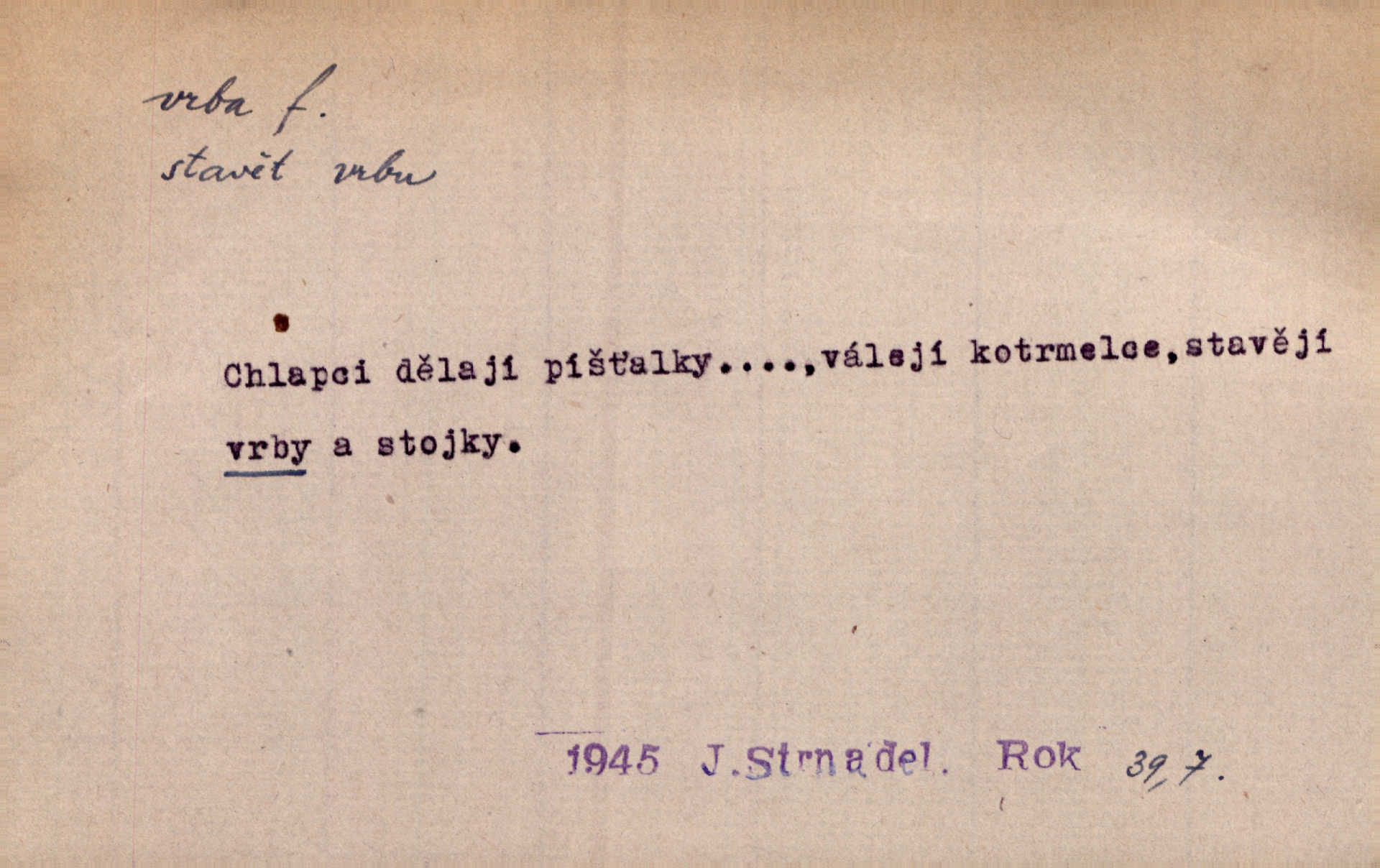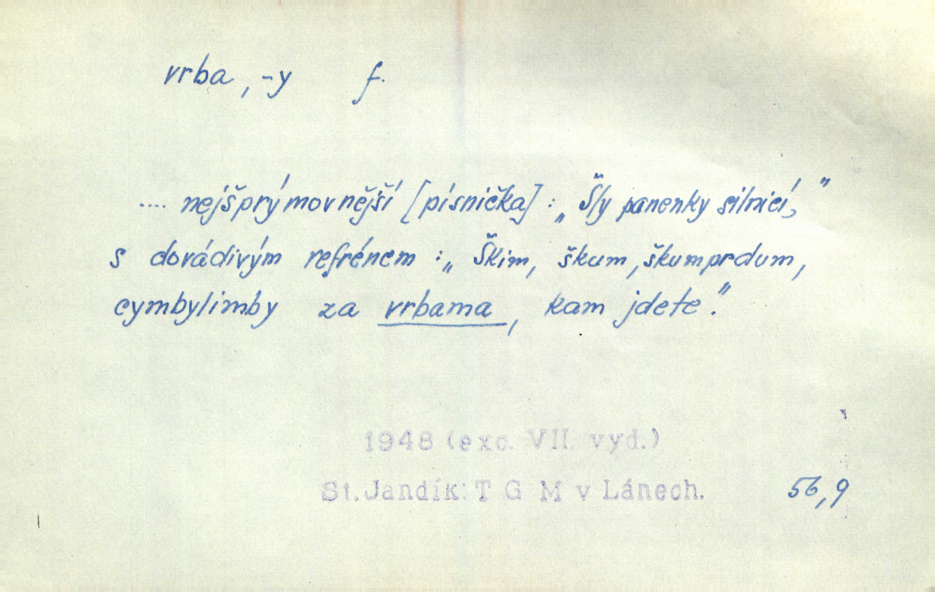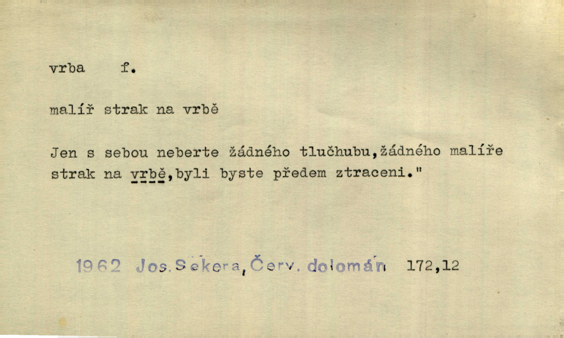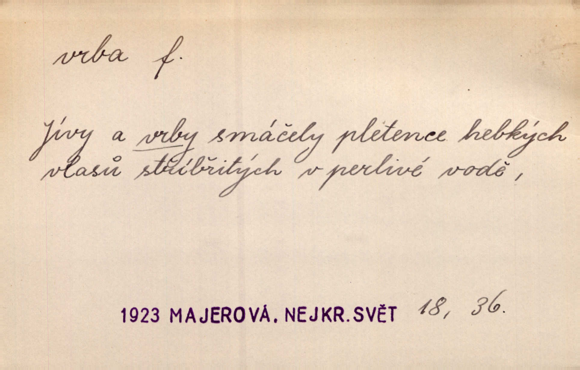 - vrba, -y f. keř n. strom rostoucí na vlhkých místech. Po březích mládly štíhlé olšiny a stárly mdle zelené vrby. Třeb. Na stoku dvou řek stojí dutá vrba. Havl. Vsaď na osamělý hrob můj vrbu. Zey. Poseděl hodinku v malém parku před jezírkem, odstíněným smutečními vrbami se svislými větvemi. Čech. Vy mi malujete straku na vrbě, táto! namlouváte něco nepravdivého. Klost. My nejsme tak hloupé, abys nám mohl ukazovat straky na vrbě. Něm. D Dial. Kluci radostí stavěli vrbu stavěli se na hlavu. A. Mrš. Hoši na drnu metali kozelce, stavěli suchou vrbu, chodili po rukou. Baar. A hned udělal suchou vrbu, jak se říká stojce na hlavě. Sekora. Bot. rod dřevin z čeledi rostlin vrbovitých, Salix; vrba bílá.
