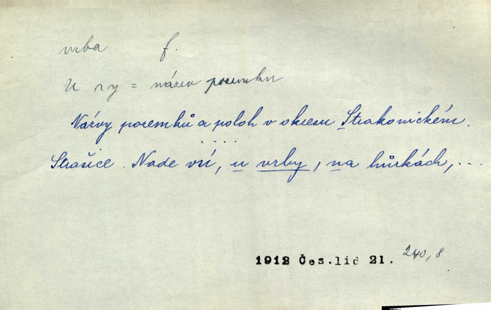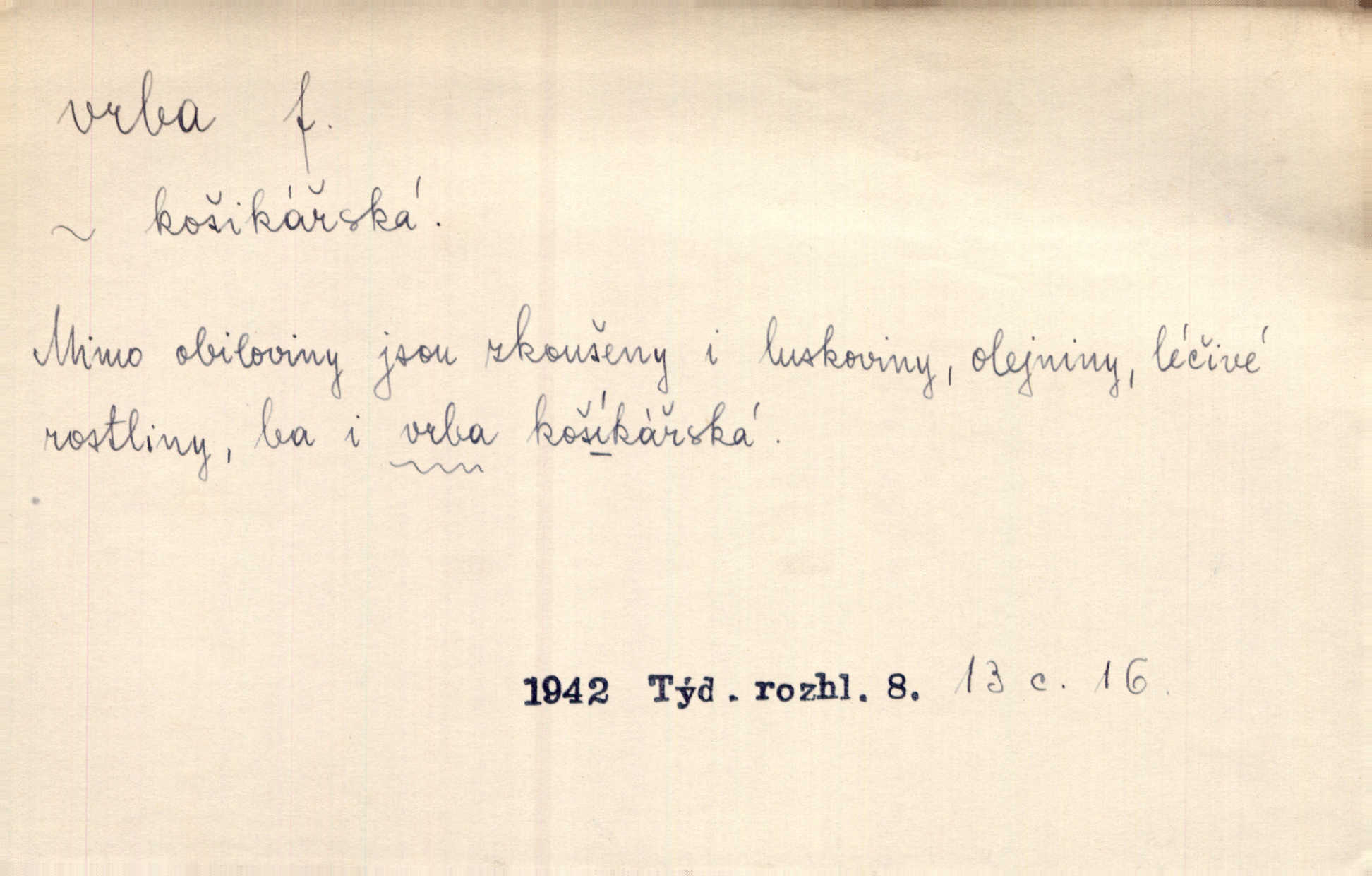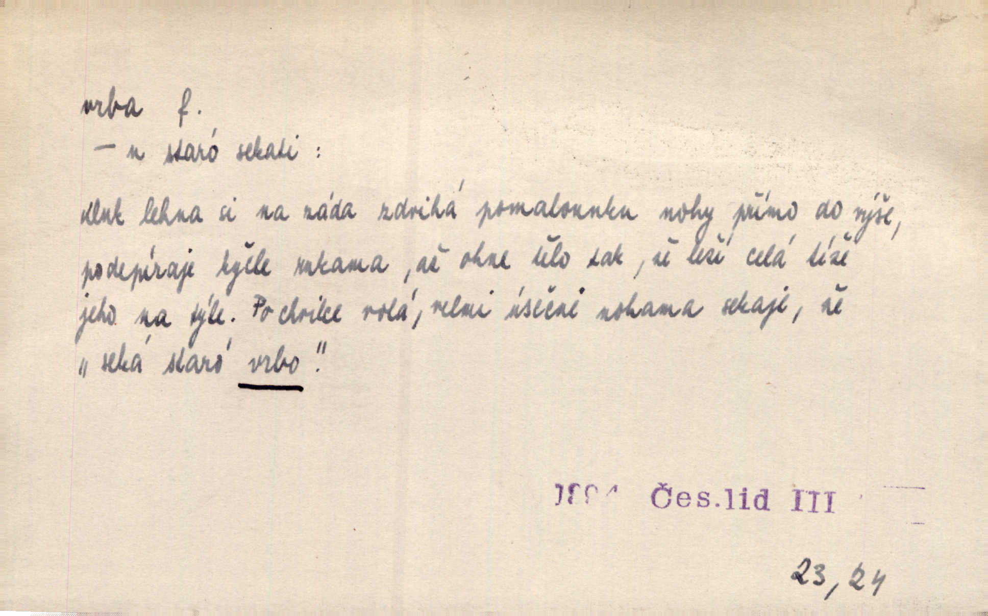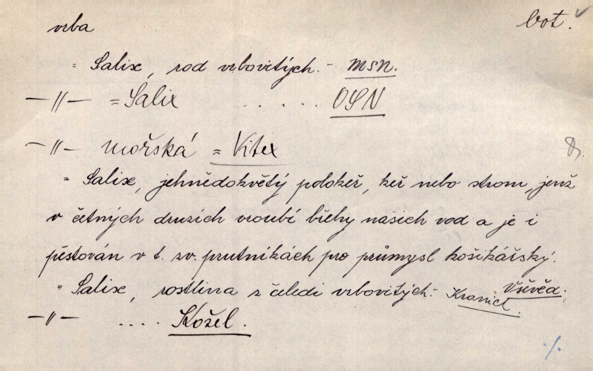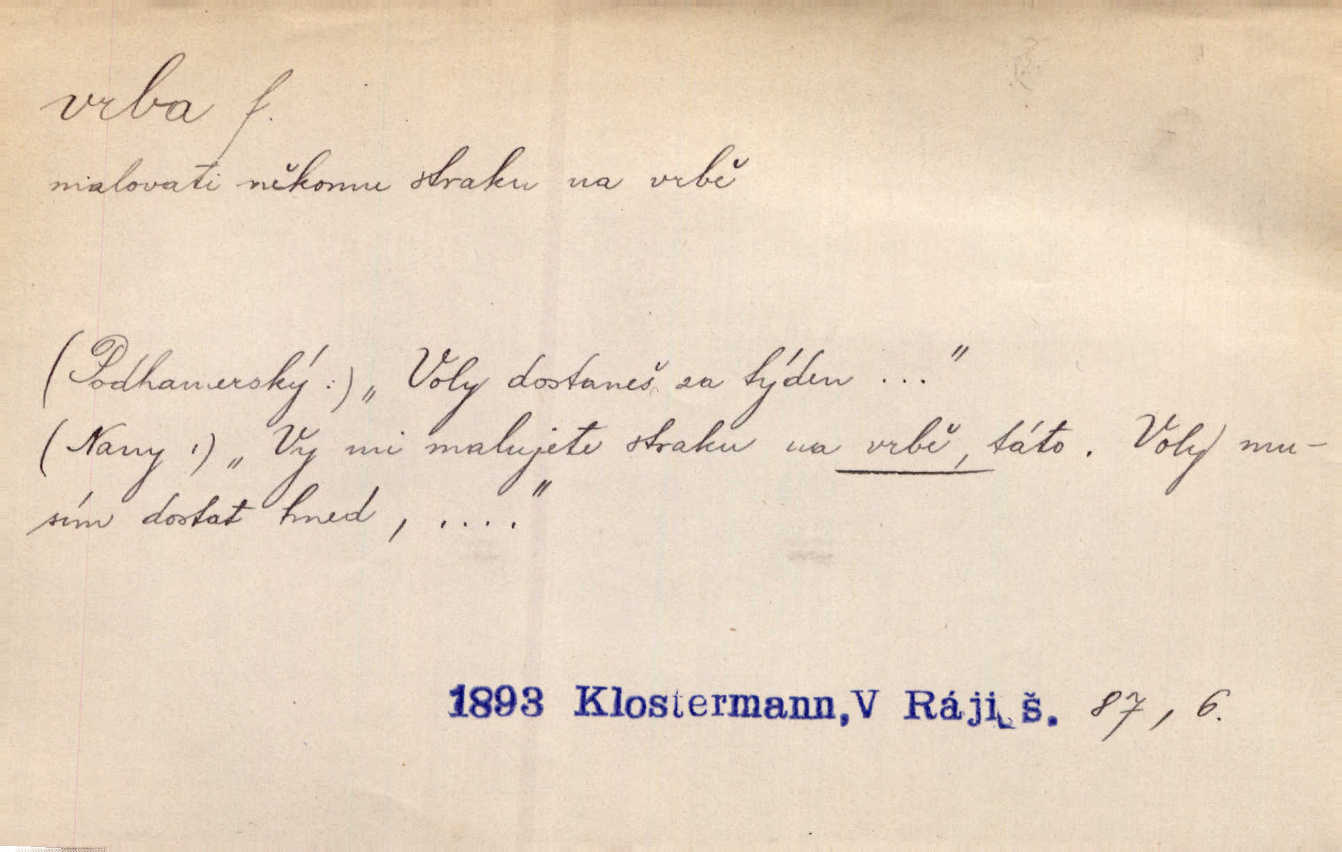- vrba, -y f. keř n. strom rostoucí na vlhkých místech. Po březích mládly štíhlé olšiny a stárly mdle zelené vrby. Třeb. Na stoku dvou řek stojí dutá vrba. Havl. Vsaď na osamělý hrob můj vrbu. Zey. Poseděl hodinku v malém parku před jezírkem, odstíněným smutečními vrbami se svislými větvemi. Čech. Vy mi malujete straku na vrbě, táto! namlouváte něco nepravdivého. Klost. My nejsme tak hloupé, abys nám mohl ukazovat straky na vrbě. Něm. D Dial. Kluci radostí stavěli vrbu stavěli se na hlavu. A. Mrš. Hoši na drnu metali kozelce, stavěli suchou vrbu, chodili po rukou. Baar. A hned udělal suchou vrbu, jak se říká stojce na hlavě. Sekora. Bot. rod dřevin z čeledi rostlin vrbovitých, Salix; vrba bílá.