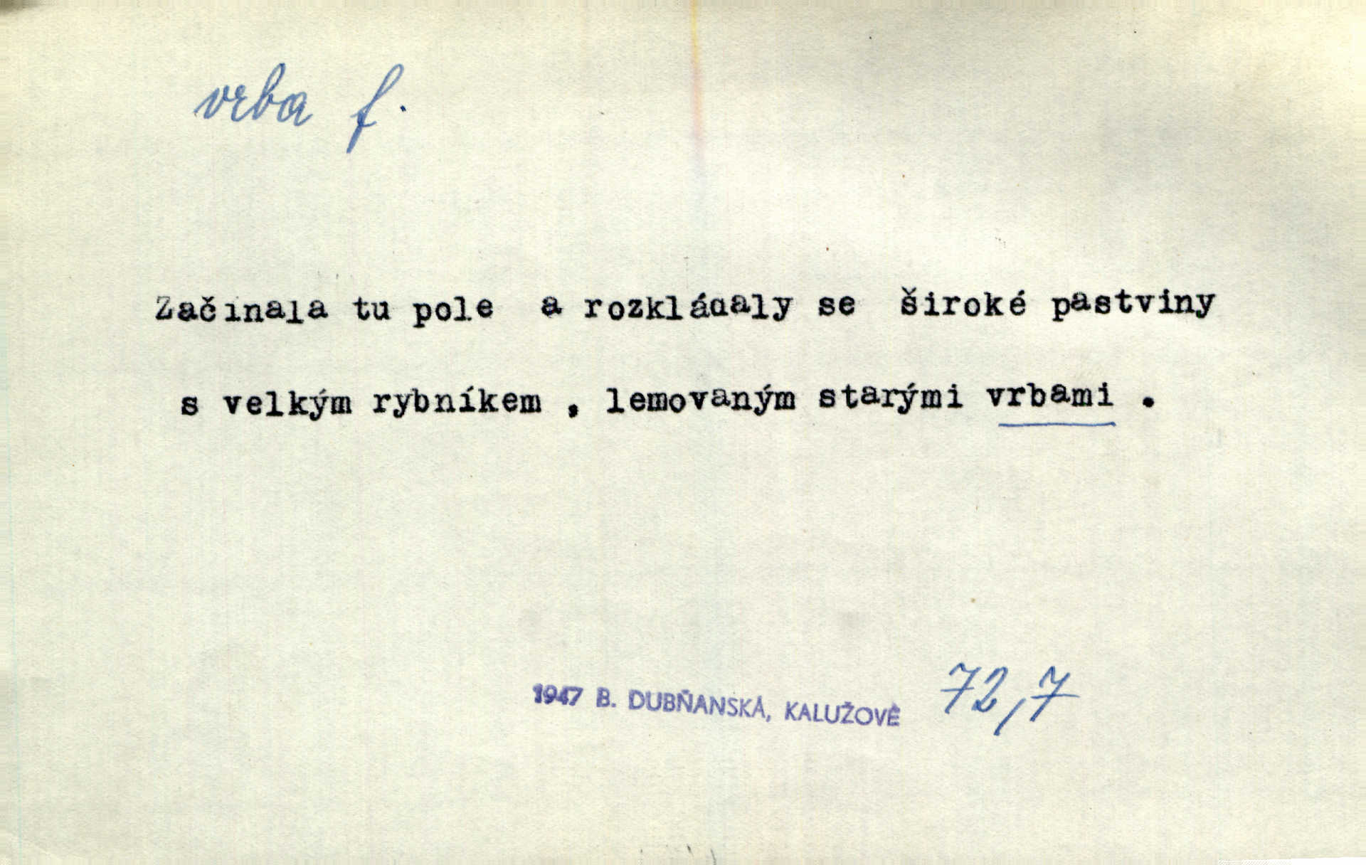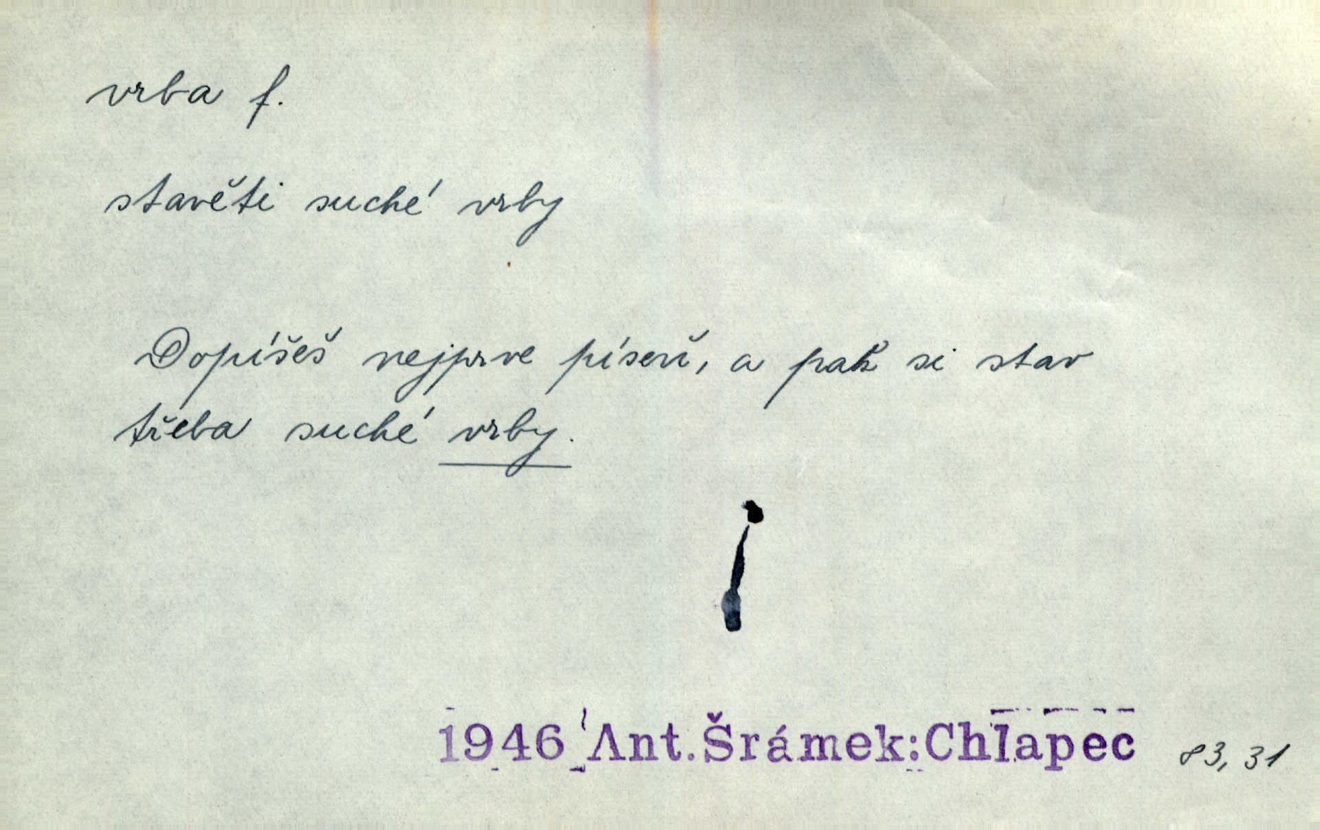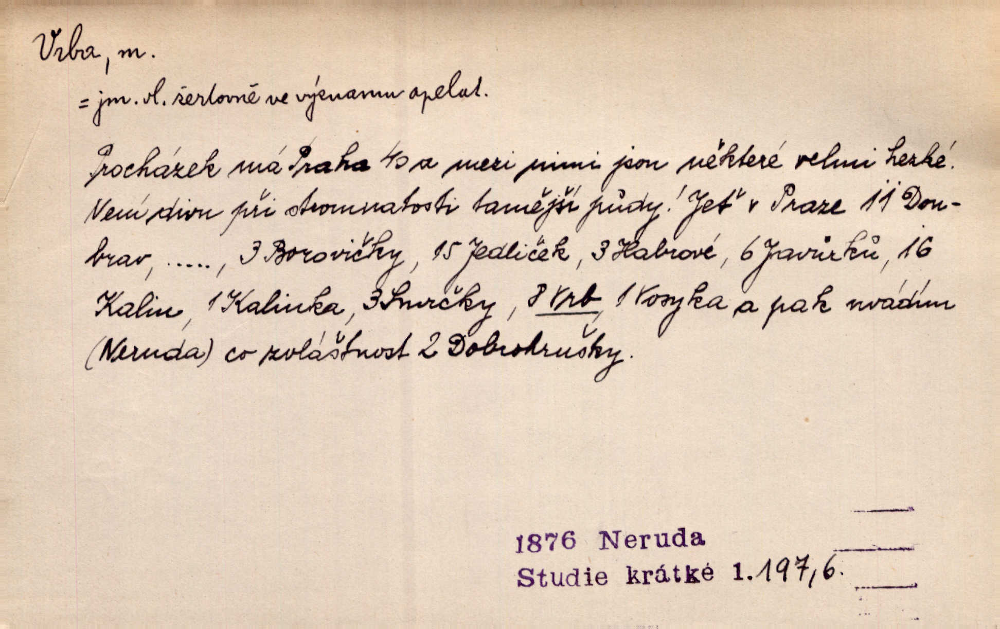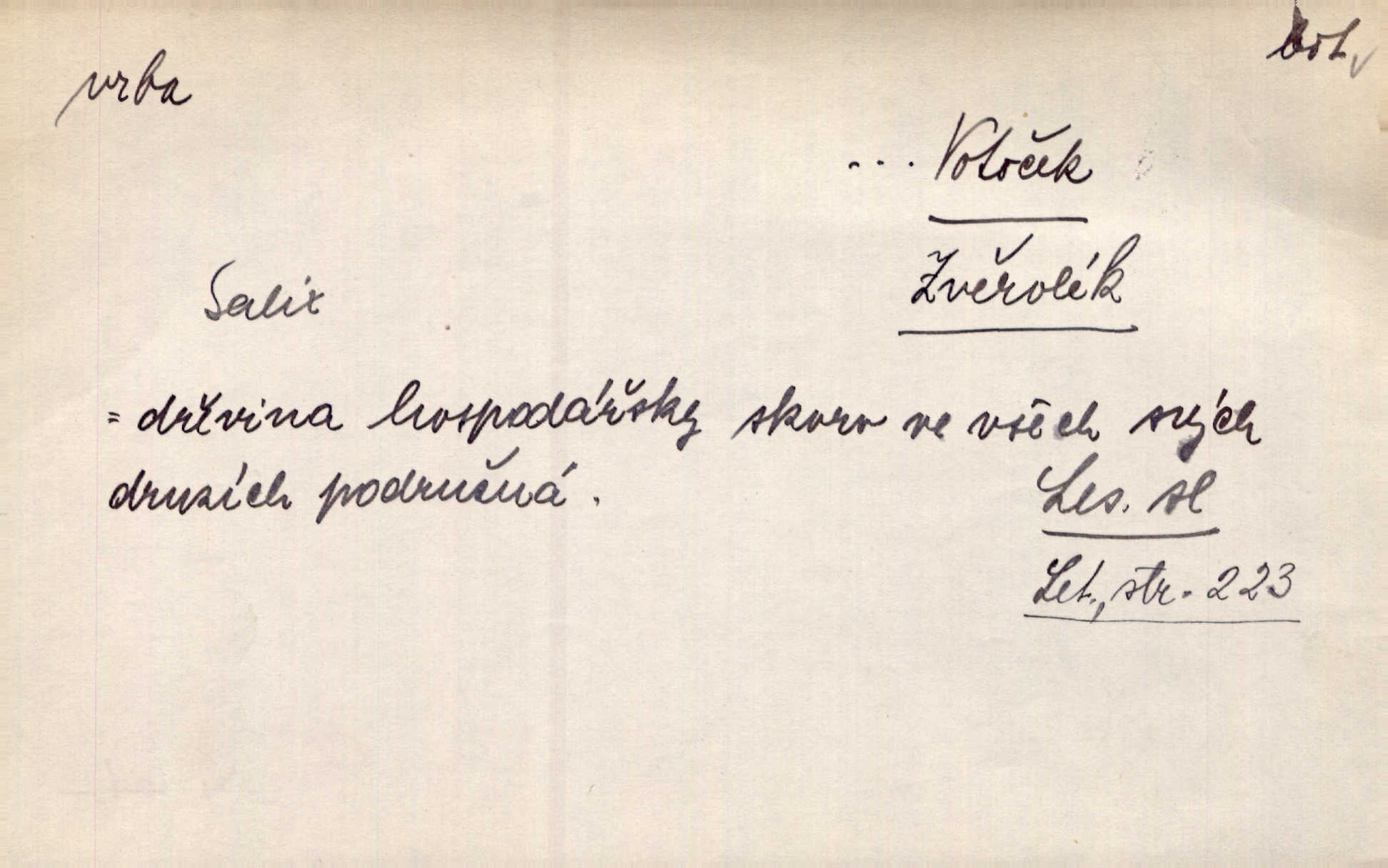 - vrba, -y f. keř n. strom rostoucí na vlhkých místech. Po březích mládly štíhlé olšiny a stárly mdle zelené vrby. Třeb. Na stoku dvou řek stojí dutá vrba. Havl. Vsaď na osamělý hrob můj vrbu. Zey. Poseděl hodinku v malém parku před jezírkem, odstíněným smutečními vrbami se svislými větvemi. Čech. Vy mi malujete straku na vrbě, táto! namlouváte něco nepravdivého. Klost. My nejsme tak hloupé, abys nám mohl ukazovat straky na vrbě. Něm. D Dial. Kluci radostí stavěli vrbu stavěli se na hlavu. A. Mrš. Hoši na drnu metali kozelce, stavěli suchou vrbu, chodili po rukou. Baar. A hned udělal suchou vrbu, jak se říká stojce na hlavě. Sekora. Bot. rod dřevin z čeledi rostlin vrbovitých, Salix; vrba bílá.