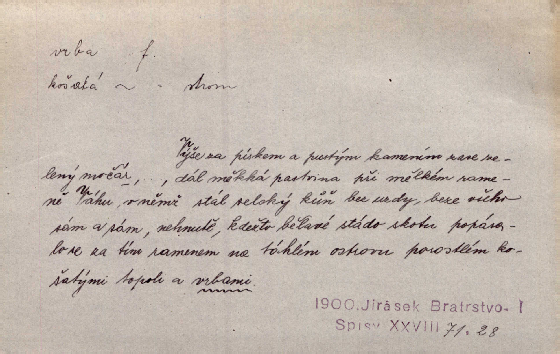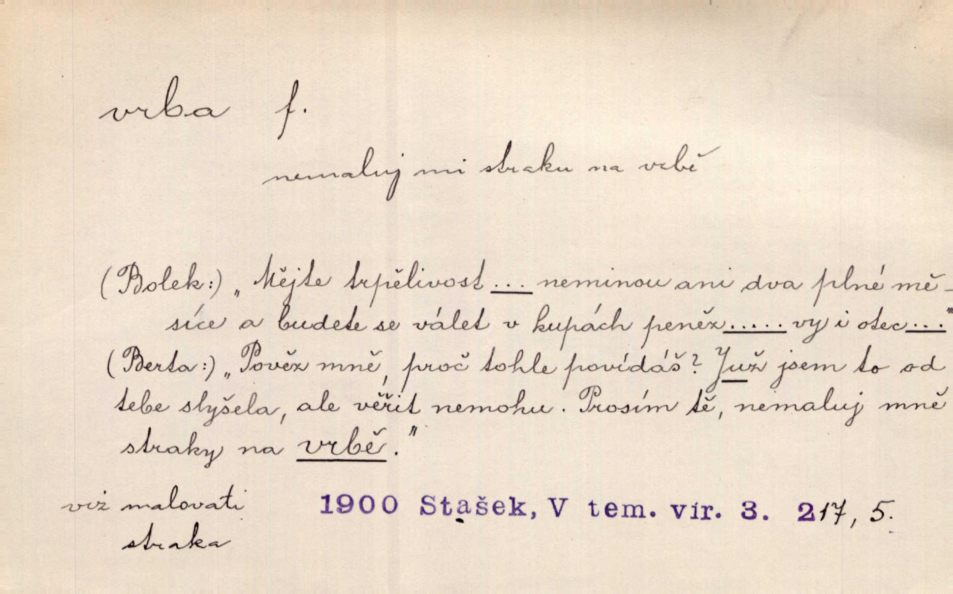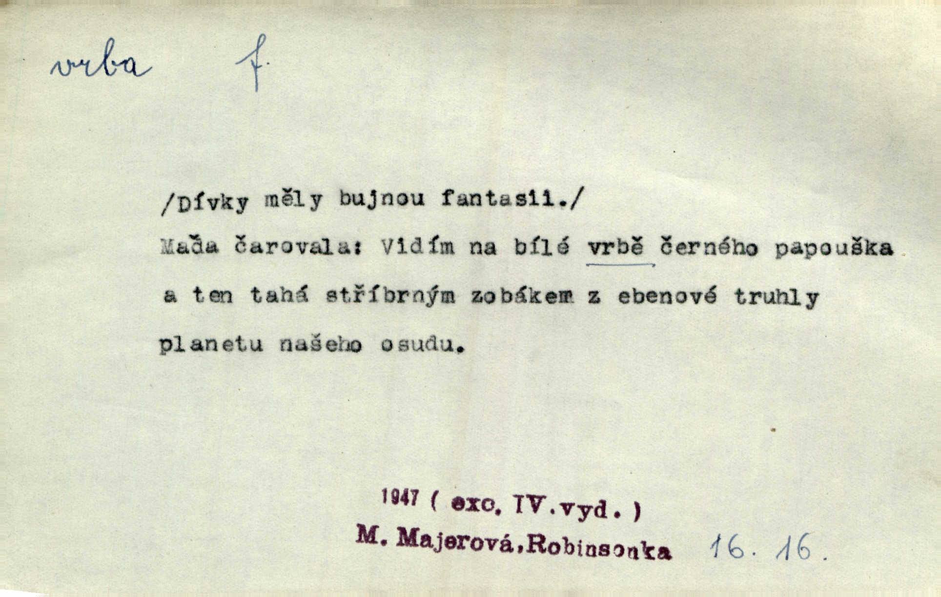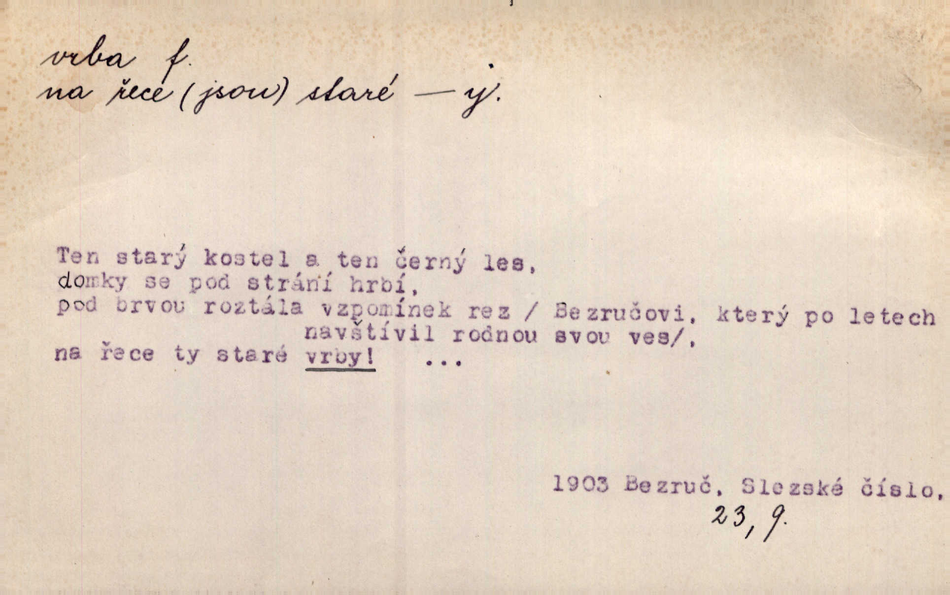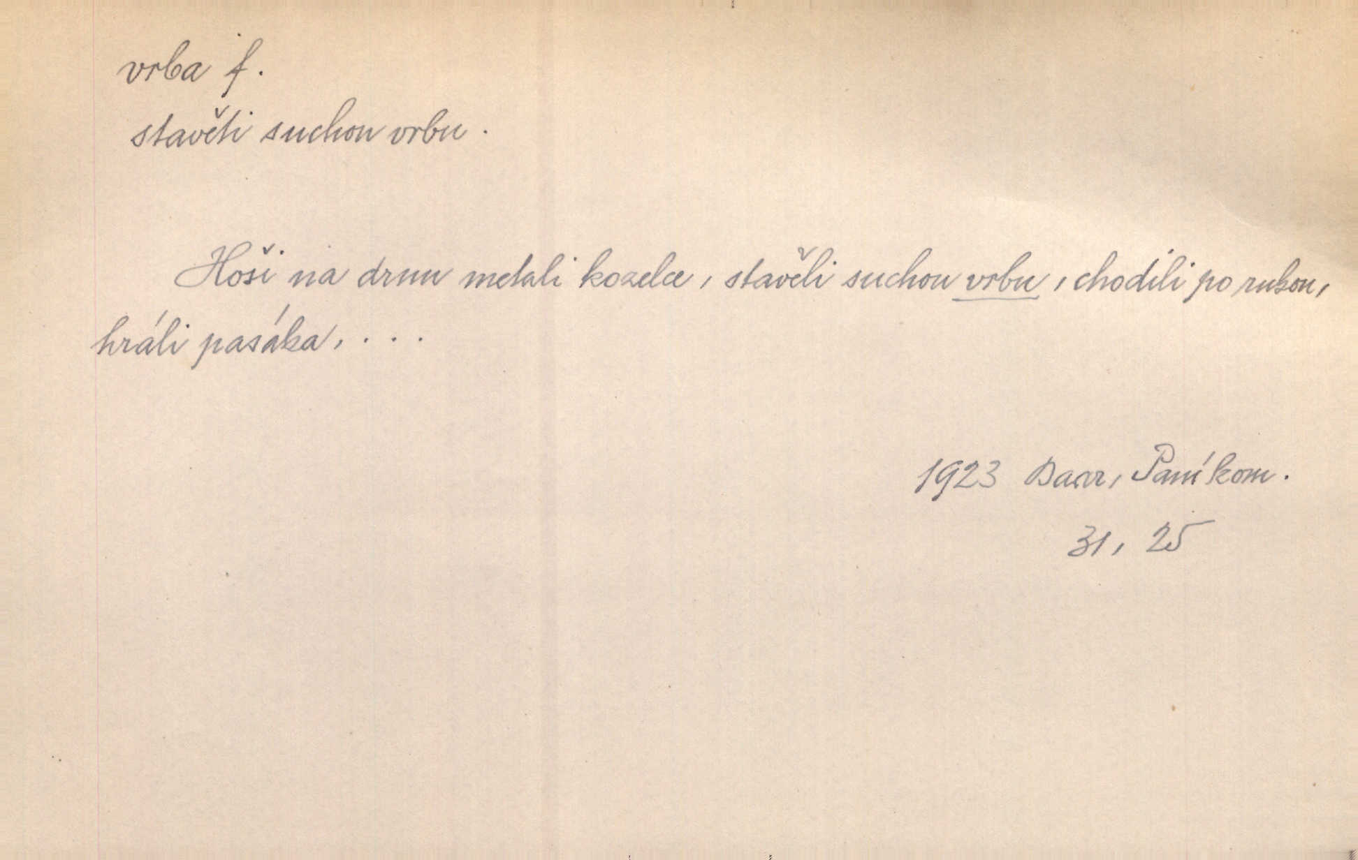 - vrba, -y f. keř n. strom rostoucí na vlhkých místech. Po březích mládly štíhlé olšiny a stárly mdle zelené vrby. Třeb. Na stoku dvou řek stojí dutá vrba. Havl. Vsaď na osamělý hrob můj vrbu. Zey. Poseděl hodinku v malém parku před jezírkem, odstíněným smutečními vrbami se svislými větvemi. Čech. Vy mi malujete straku na vrbě, táto! namlouváte něco nepravdivého. Klost. My nejsme tak hloupé, abys nám mohl ukazovat straky na vrbě. Něm. D Dial. Kluci radostí stavěli vrbu stavěli se na hlavu. A. Mrš. Hoši na drnu metali kozelce, stavěli suchou vrbu, chodili po rukou. Baar. A hned udělal suchou vrbu, jak se říká stojce na hlavě. Sekora. Bot. rod dřevin z čeledi rostlin vrbovitých, Salix; vrba bílá.