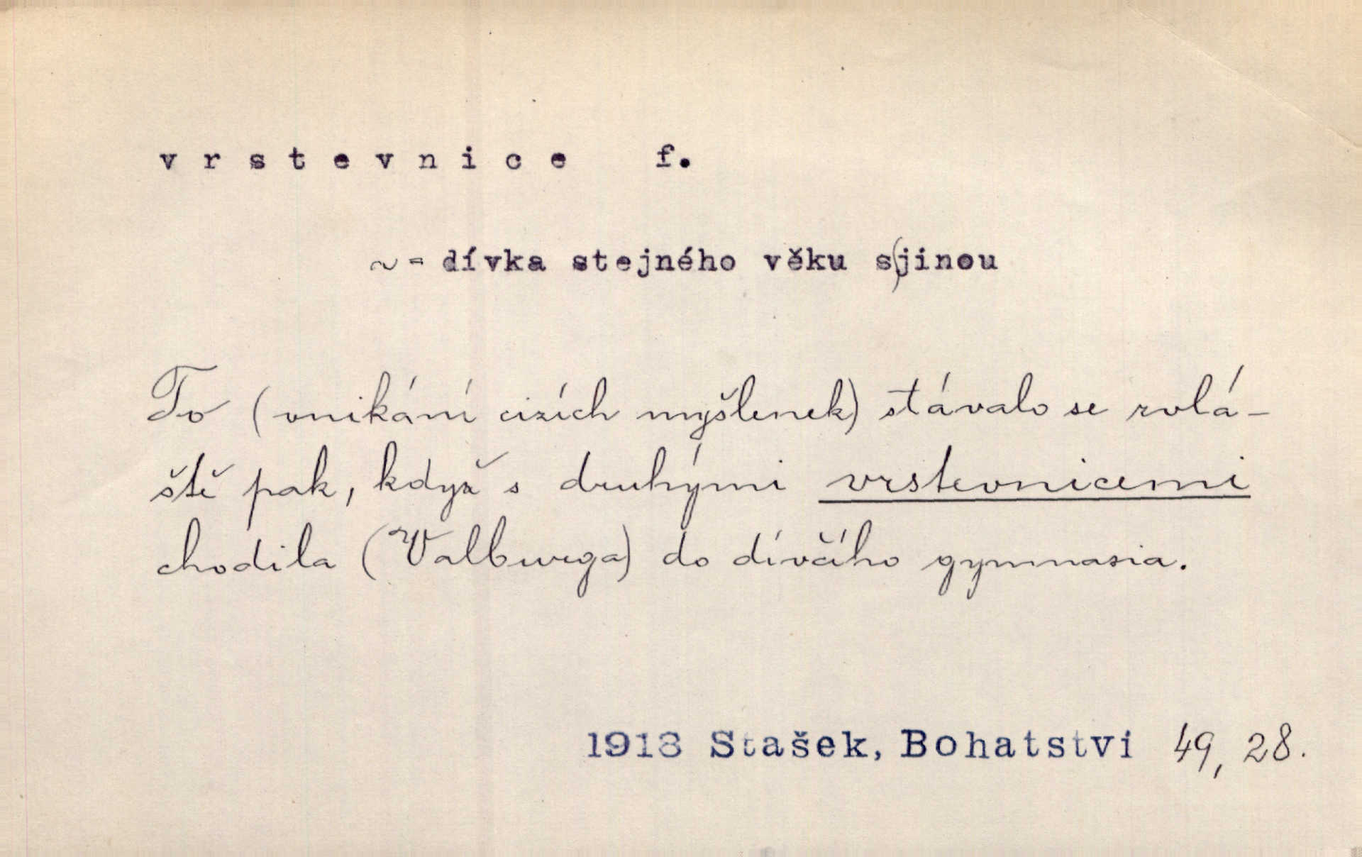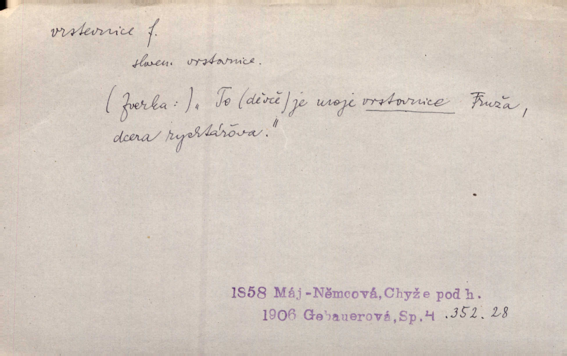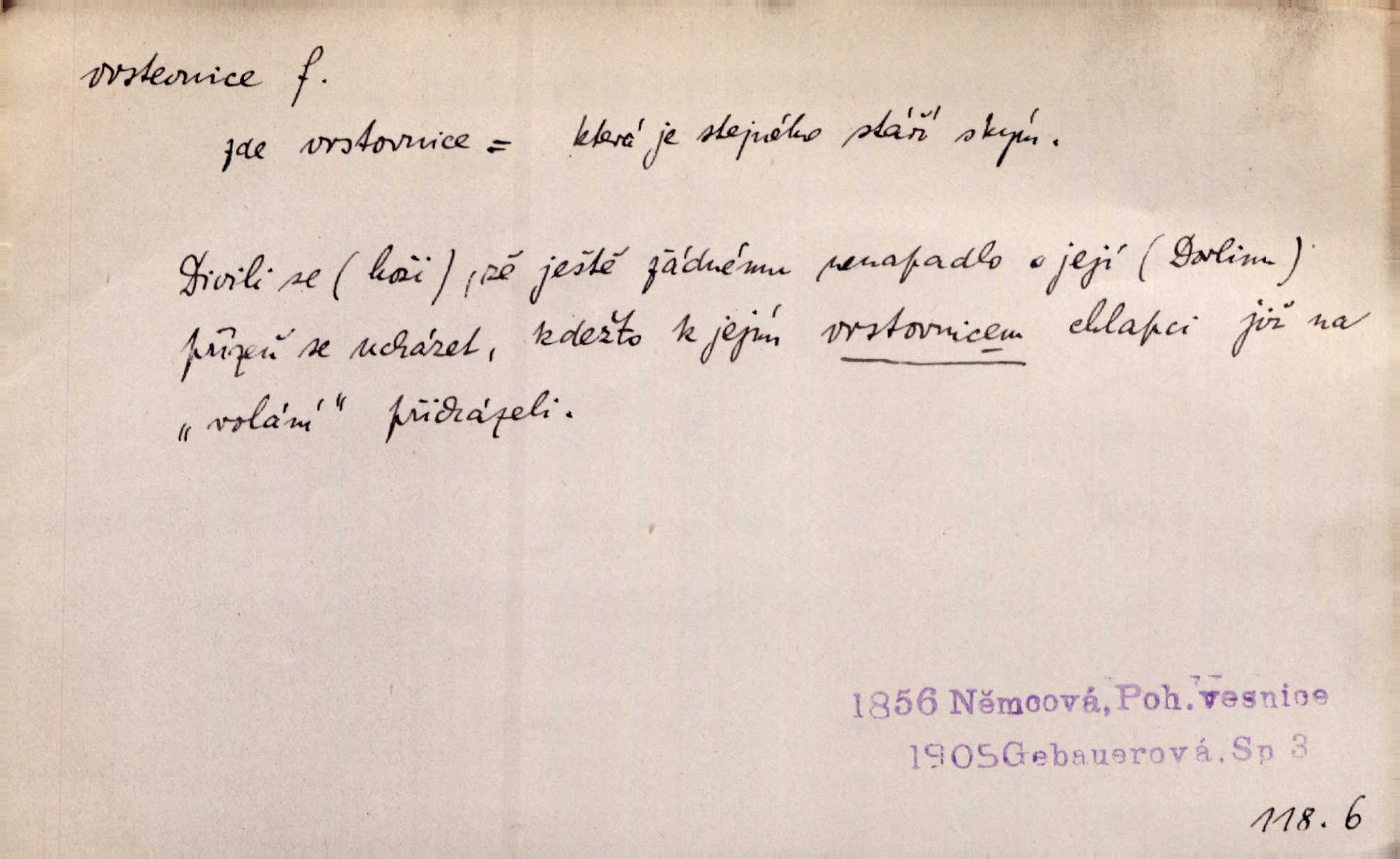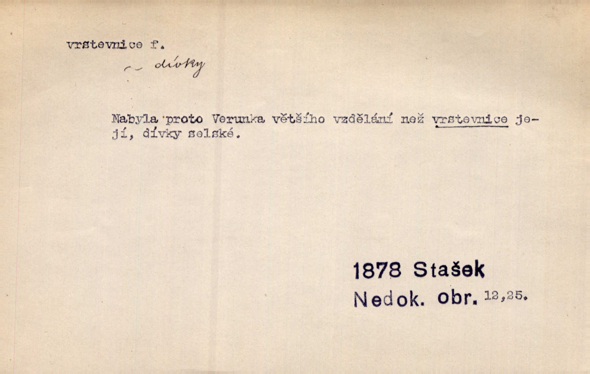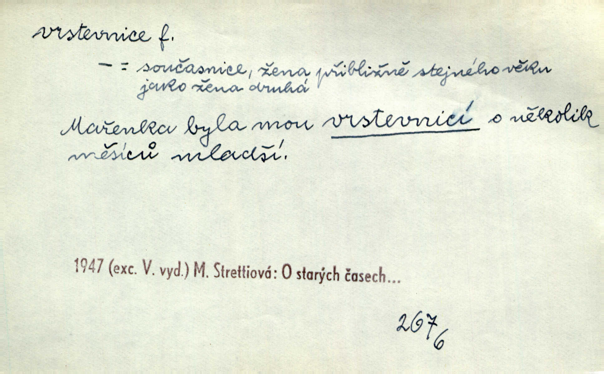 - vrstevnice, -e f. 1. k vrstevník. S druhými vrstevnicemi chodila do dívčího gymnasia. Staš. [Babička] žila spokojeně v malé chaloupce se starou Bětkou, která byla její vrstevnice. Něm. Nabyla Verunka většího vzdělání než vrstevnice její, dívky selské. Staš.