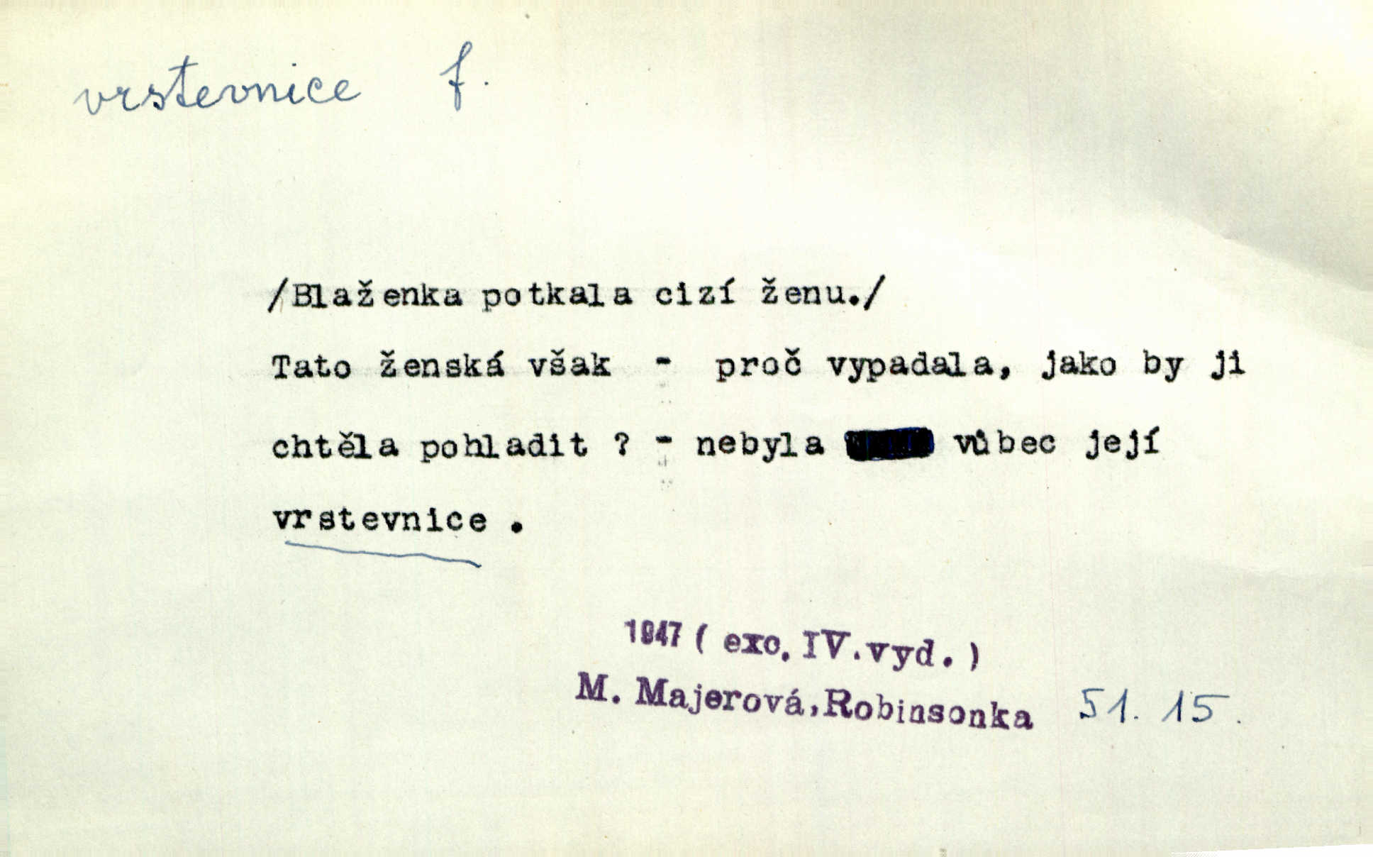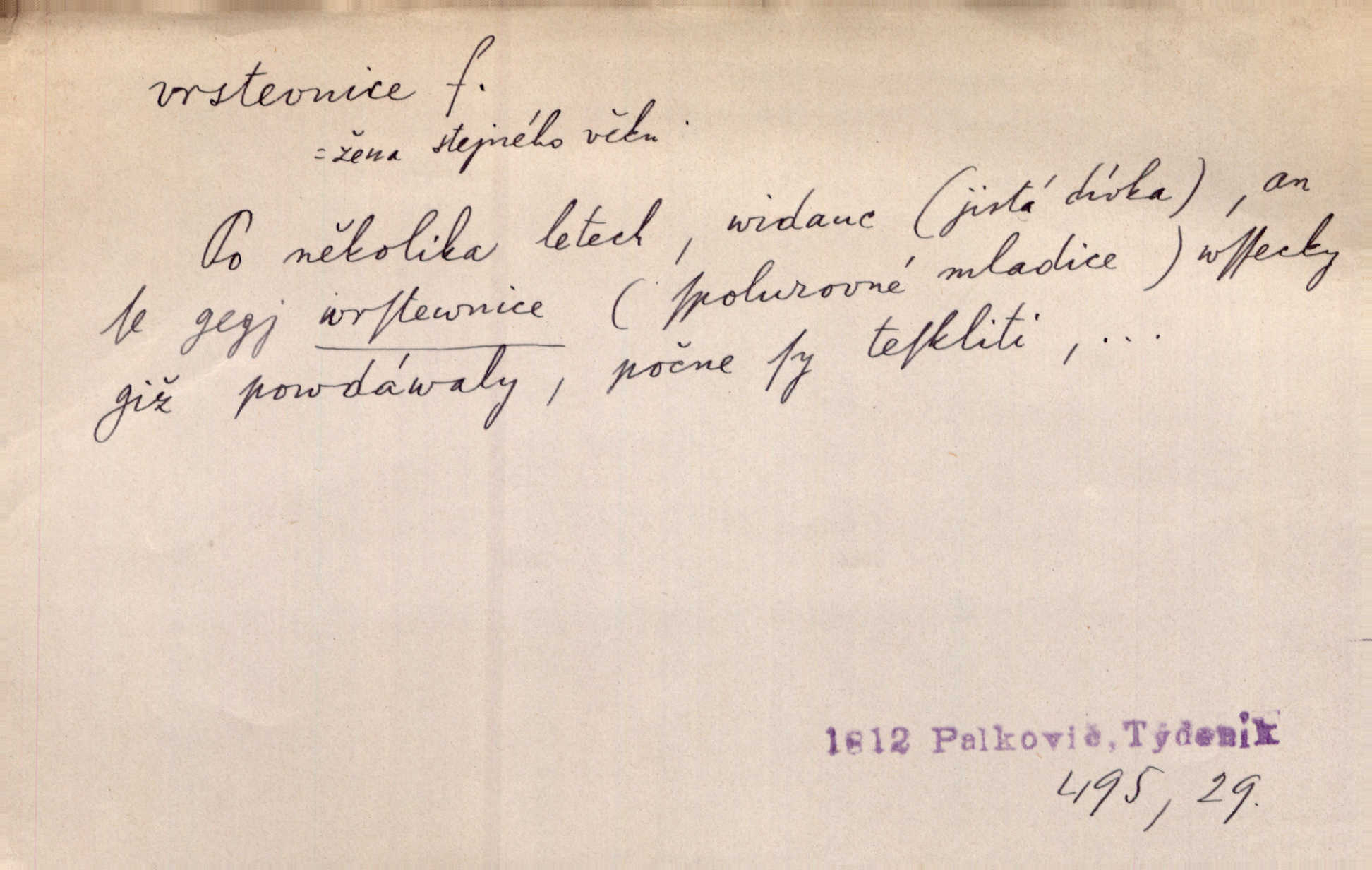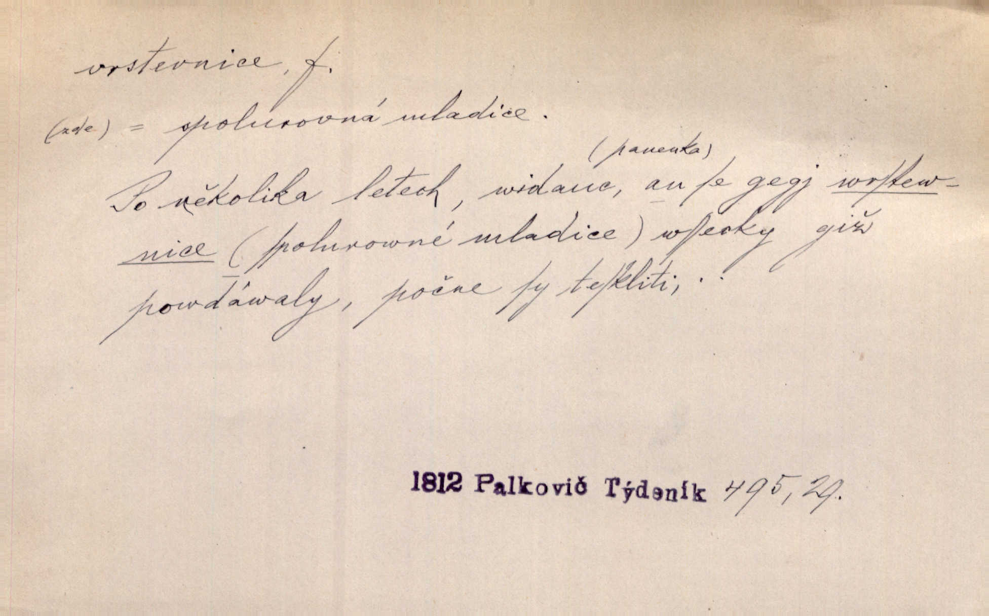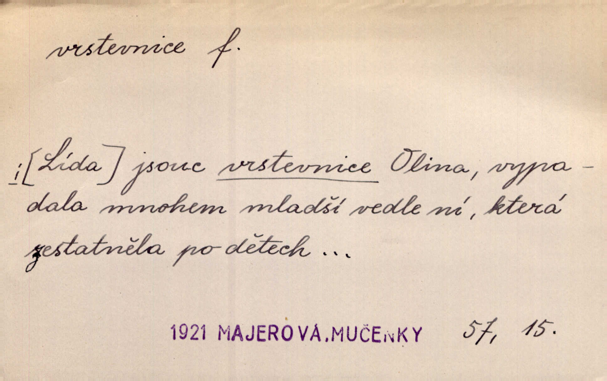 - vrstevnice, -e f. 1. k vrstevník. S druhými vrstevnicemi chodila do dívčího gymnasia. Staš. [Babička] žila spokojeně v malé chaloupce se starou Bětkou, která byla její vrstevnice. Něm. Nabyla Verunka většího vzdělání než vrstevnice její, dívky selské. Staš.