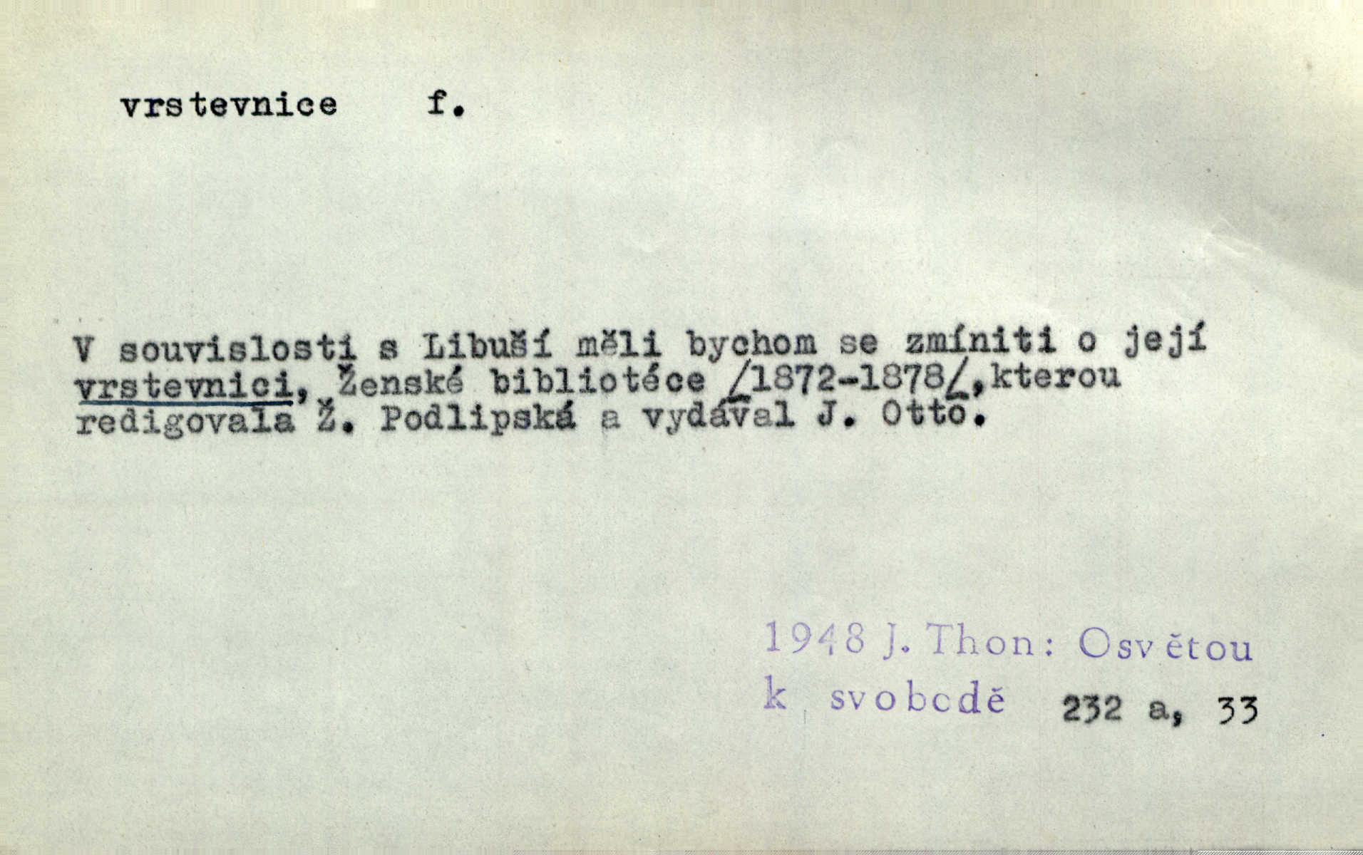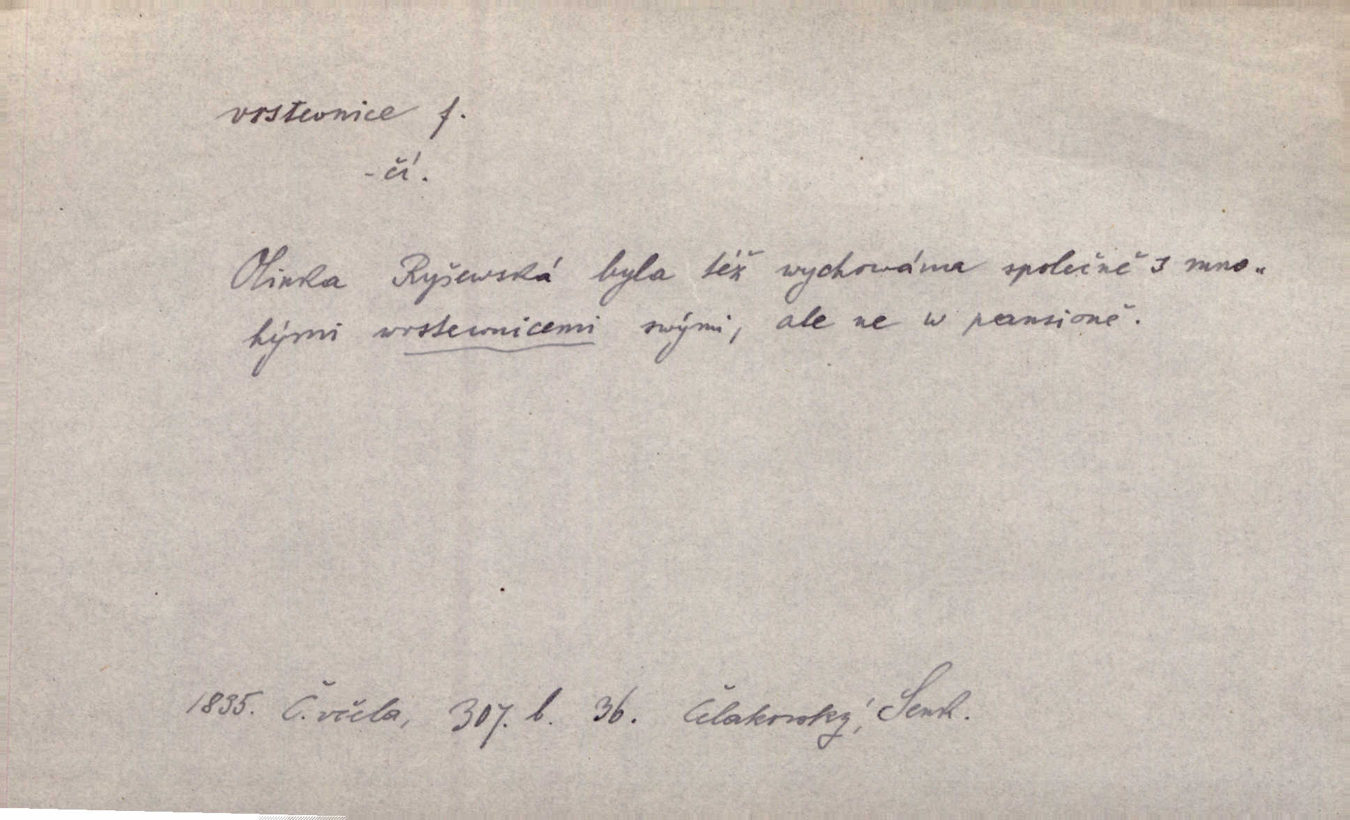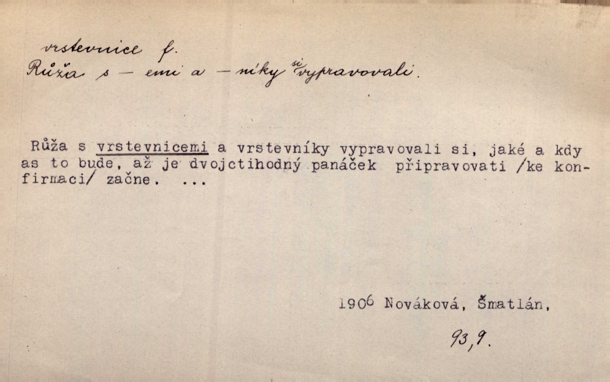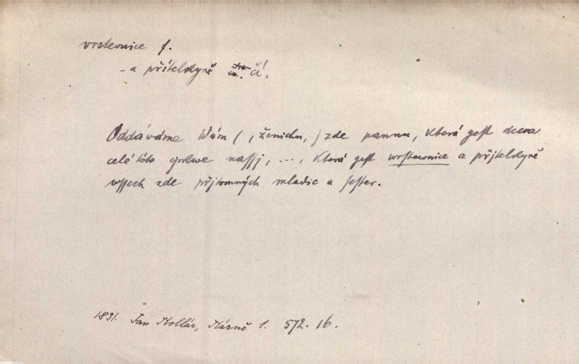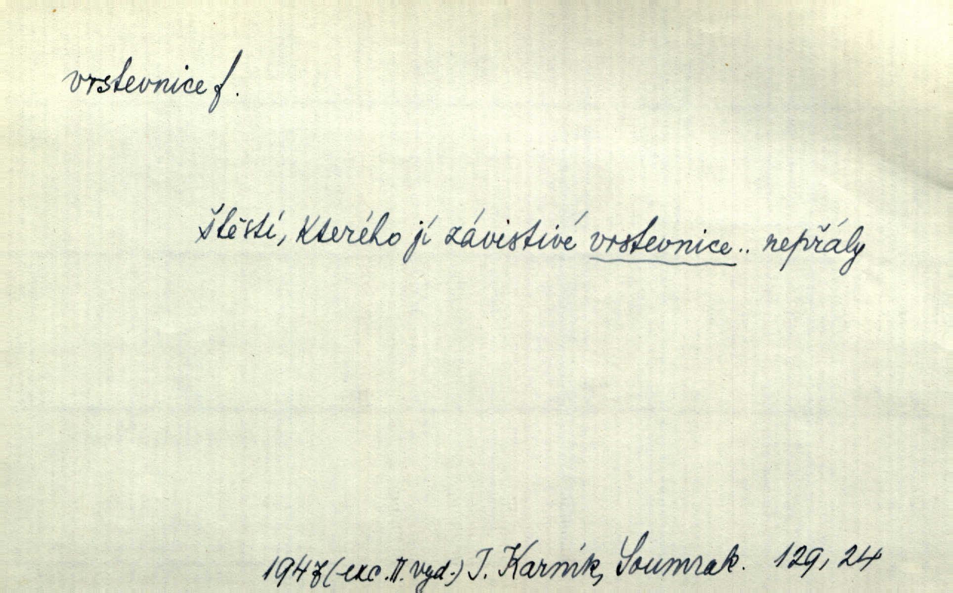 - vrstevnice, -e f. 1. k vrstevník. S druhými vrstevnicemi chodila do dívčího gymnasia. Staš. [Babička] žila spokojeně v malé chaloupce se starou Bětkou, která byla její vrstevnice. Něm. Nabyla Verunka většího vzdělání než vrstevnice její, dívky selské. Staš.