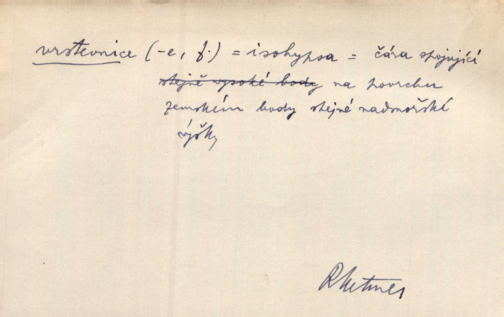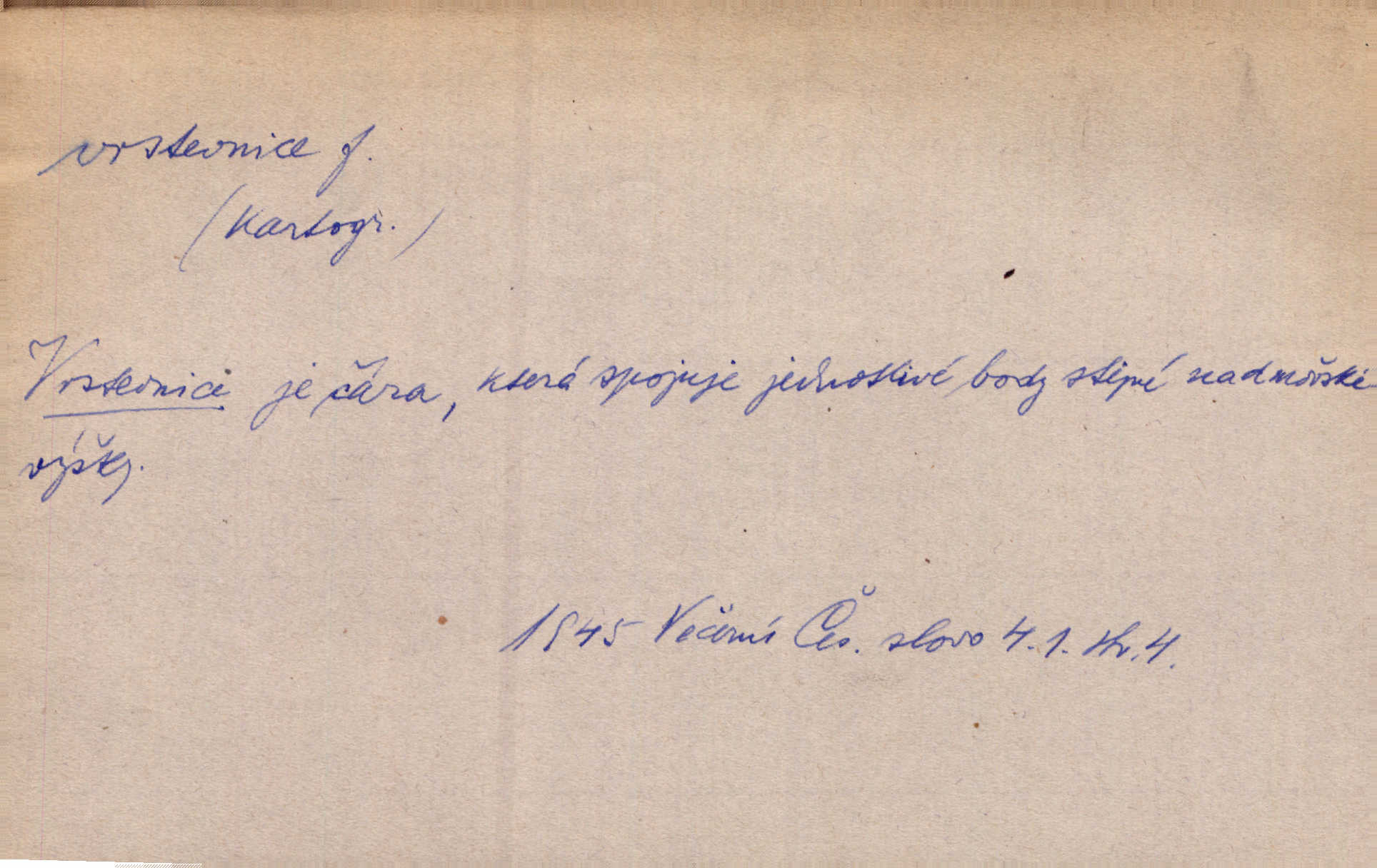 - vrstevnice, -e f. 2. kartograf. křivka spojující místa stejné nadmořské výšky, isohypsa.