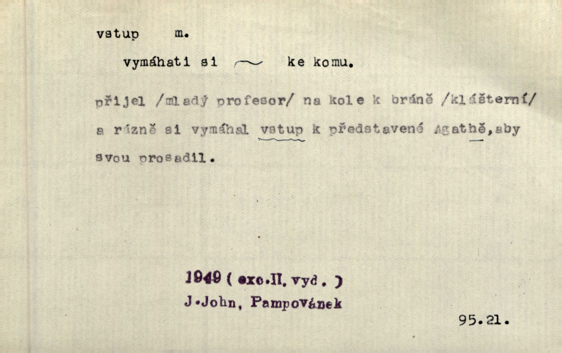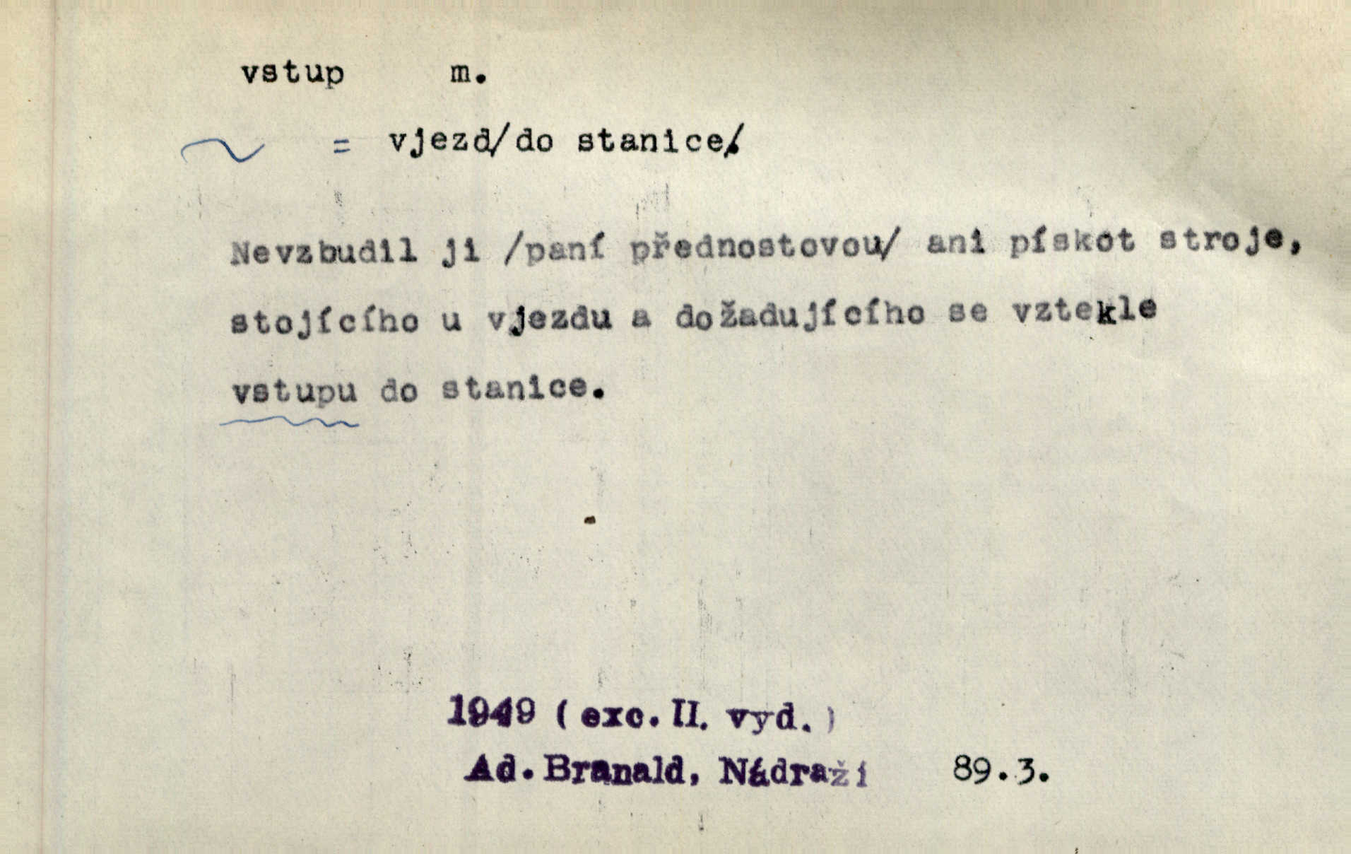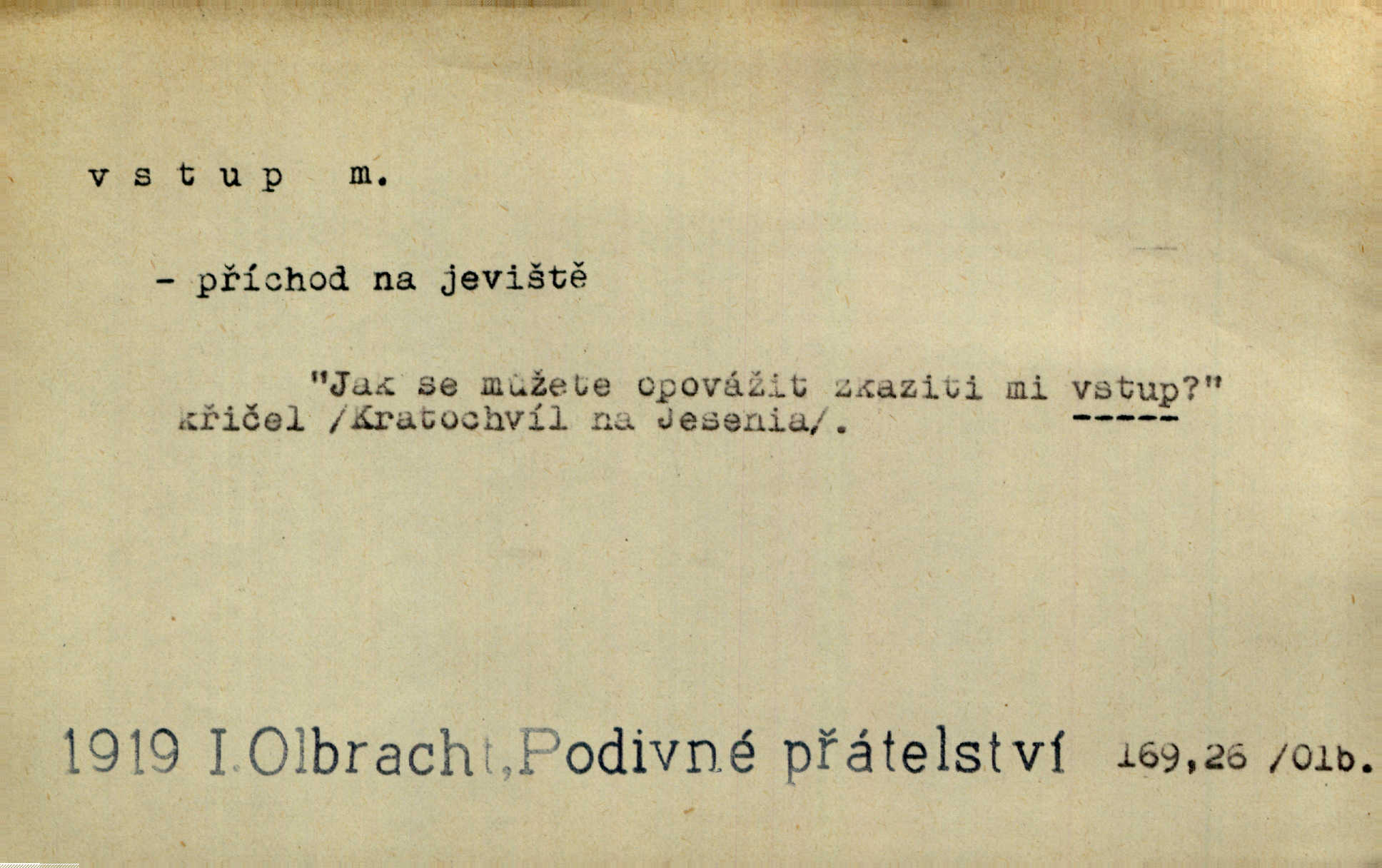 - vstup, -u m. vstoupení, vkročení, příchod někam. Zlaté polnice ohlašují vstup vítěze. K. Čap. Poslední host odešel krátce před vstupem krysařovým. Dyk. [Špatného uvítání] se jí dostalo při vstupu na svět narození. Vrba. Půlnoc zlomila kruh, přes nějž noha má neměla vstupu který jsem nesměl přestoupiti. Theer. Volba byla jen první část vstupu na trůn nastoupení. Bass. On svou mladost obrnil hned při prvním vstupu svém na kolbiště literární. Vrch. Dirigent, který odepřel vstup Sudovým pracem na Národní divadlo, je tu jmenován uvedení. Týd. rozhl. Na tyto rohovnické večery bude míti mládež vstup volný. Ml. fronta. Vláda Polské lidové republiky nabízí svobodný vstup na své území. Ml. fronta. Dřív ovšem musíme zaplatit pět para vstupu vstupného. Ner. D (o věci) vniknutí někam. Vstup vzdušiny do válcové trubice. Techn. prův. Vstup infekce jest nejčastěji ústrojím dýchacím a zažívacím, kůží. Šmilauerová. D místo, kudy lze vstoupiti, vejíti, vjeti; vchod, vjezd. Při vstupu do Starého Města zbudovalo [město] zdobnou věž. Lang. Byly to dvě míle obtížné plavby, poněvadž vstup do severního kotviště byl velice úzký. Lit. noviny. Do jejího bytu z druhé ulice vstup zřídil. Vrch. K přehlídce stok slouží t. zv. vstupy. Zprávy Spol. arch. D vstoupení do nějakého společenství, poměru jakožto člen, účastník. Prosil otce, aby podepsal prohlášení, že svoluje k synovu vstupu do vojska. Ros. Povinné pojištění vzniká u zaměstnanců dnem vstupu do zaměstnání. Nár. poj. [Selektory] dovolují všem účastníkům určitého úseku současný poslech i vstup do hovoru zapojení. Slabopr. obz. D zahájení, začátek, úvod. Nového historický román z doby Václava IV. má nádherný vstup. Jirát. Nepovažujte podrobné popisování mého rodiště za vstup k nějaké délkou hrozící biografii. Zey. Třetí list k M. Rokycanovi není než vstup k čtvrtému. Goll. [Jisté šachové postavení] zaviní menší skrytost a obtížnost vstupu. Rozhlas. Čtěte třeba vstupy a závěry prvních kapitol. K. Pol. Pavlata nastudoval [Tajemství] s pietní péčí pro svůj vstup na brněnskou scénu úvodní představení. Urie. V době vstupu znárodňovacích dekretů v účinnost tyto podniky byly v nexu podniků podléhajících znárodnění. Nešpor. Voj. vstup do boje, války započetí. Horolez. začátek cesty v lezeckém terénu.
