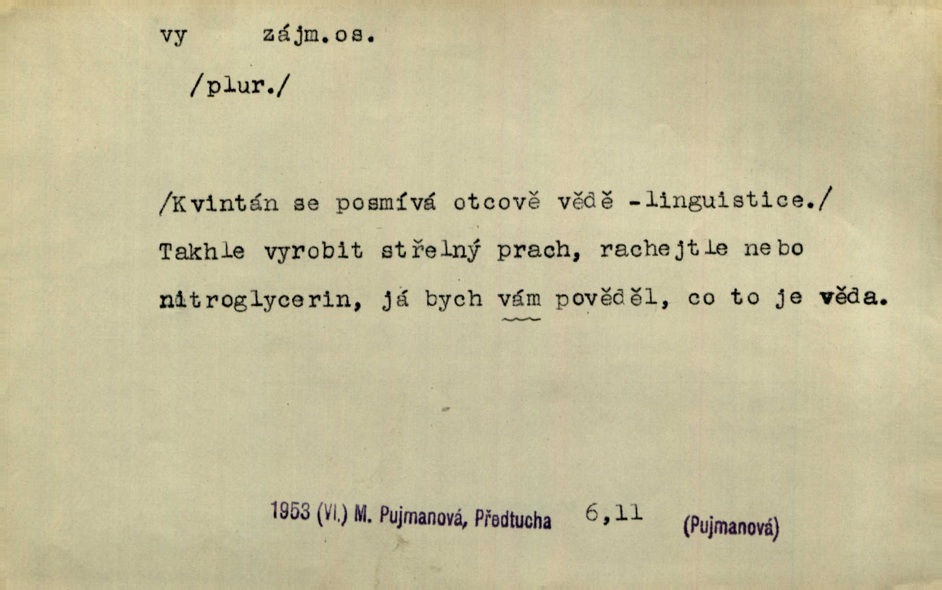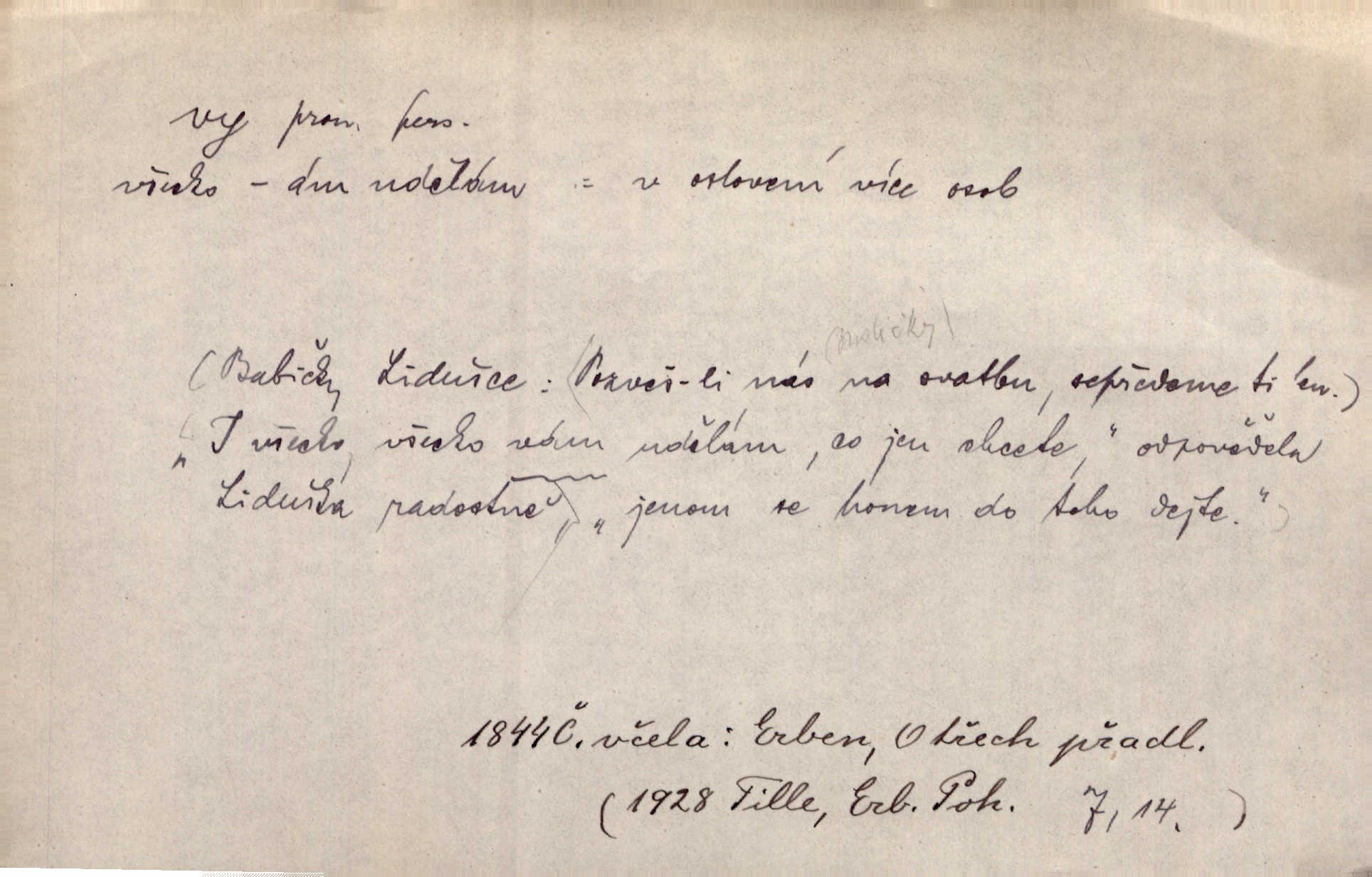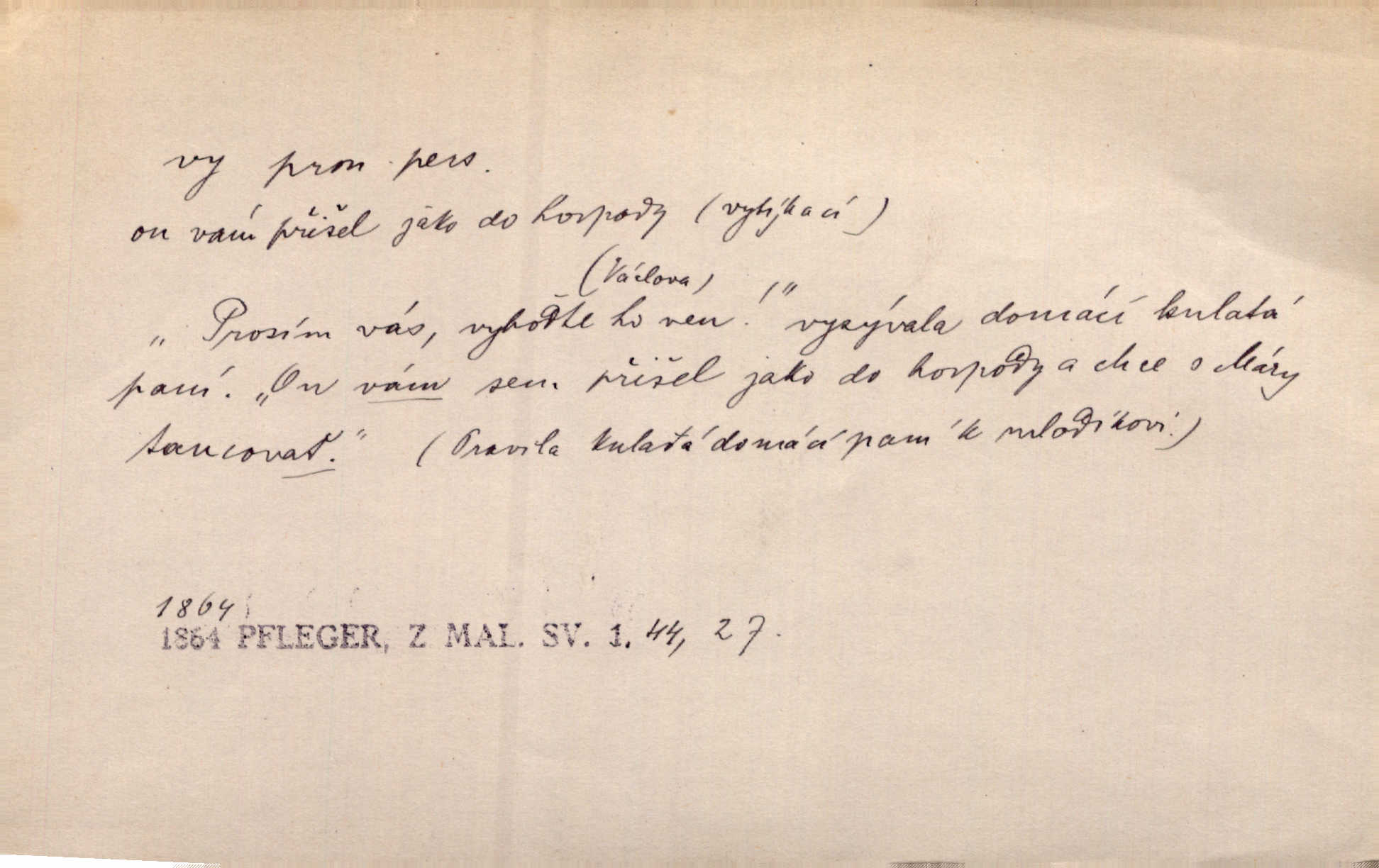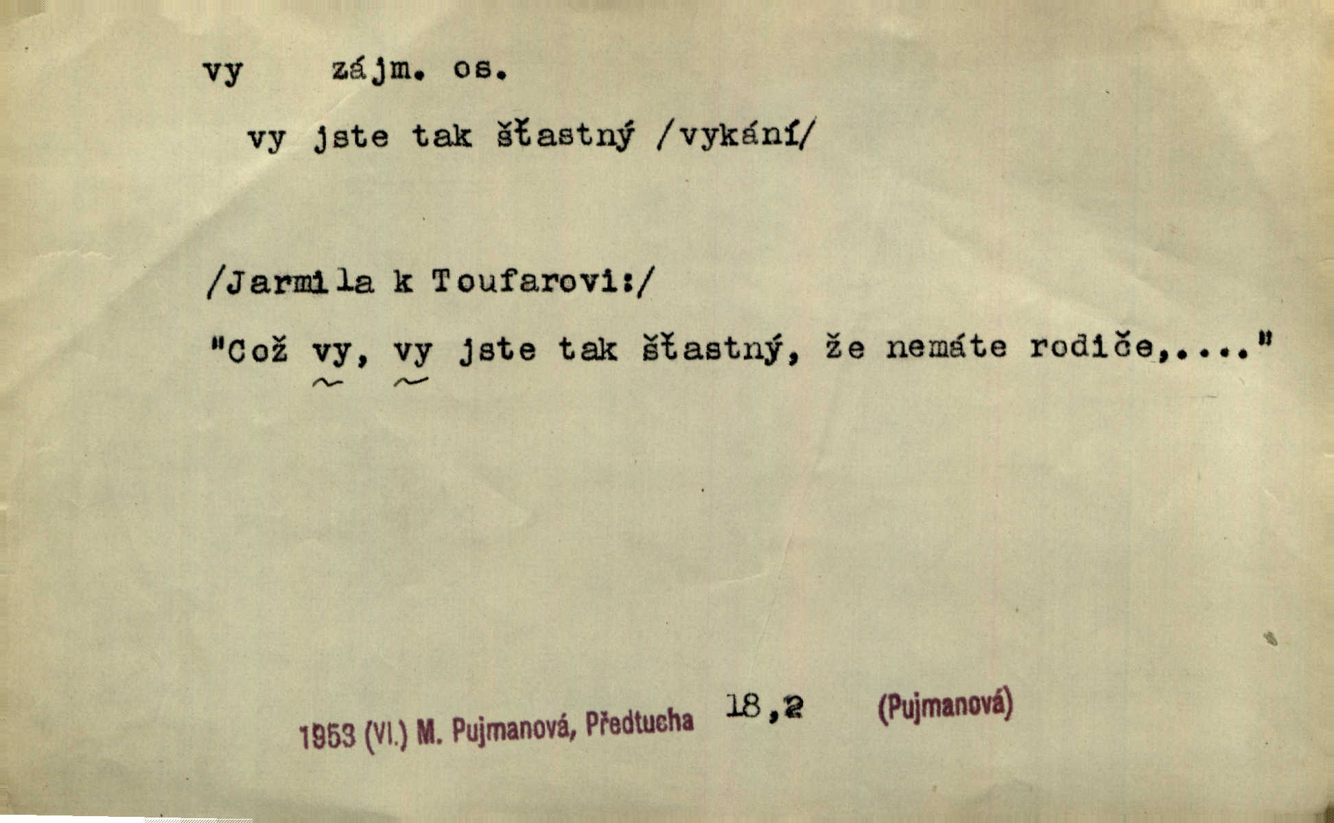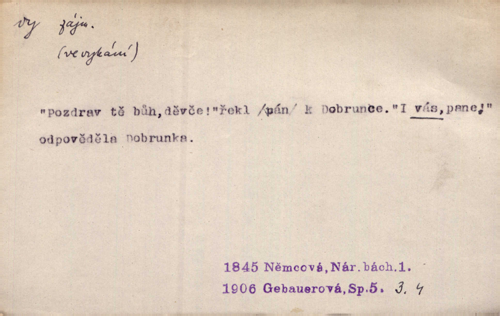 - vy zájm. osob. 2. os. pl. (2., 4. a 6. vás, 3. vám, 7. vámi) označuje dvě n. více osob n. věcí, k nimž se mluvící v řeči obrací. Vy jediní jste zbyli z průvodu, jenž vyšel se mnou z drahé vlasti mé. Vrch. „I všecko, všecko vám [babičky] udělám, co jen chcete, odpověděla Liduška radostně. Erb. Dala bych Ti kamaráda — ale koho dát Ti, koho? Je vás [děvčat] ve vsi trochu mnoho. Ner. Změňte svá sídla a odejděte do neznámých krajů, neboť půda, která neživí mne, nebude ani vás živiti. Vanč. Ani z vás čtoucích nikdo tomu listu nerozumí. Win. Pán Bůh s vámi, co ten čtvrtý? Hál. Brzy uslyším vás, milé zvony, zas! Čech. D označuje osobu, k níž se mluvící v řeči obrací a jíž vyká. „Pozdrav tě Bůh, děvče!“ řekl k Dobrunce. „I vás, pane!“ odpověděla Dobrunka. Něm. „Do jakých koncův to s vámi dojde, Mrštino, povedete-li pořád svou?“ Šmil. Prý takový chudý chlapec jako vy, Půlpáne, si má víc vážit vzdělání, kterého se mu poskytuje. K. Čap. „Jste vy pan hospodský?“ Pfleg. Stěžujete si, můj drahý, že Vám příliš málo milostivě a srdečně píšu. Ner. [Farář] chce, aby mu lidé nevoňovali, aby mu říkali vy vykali mu. Jir. D Nom. vy zdůrazňuje n. má význam citově zabarvující. Povolání vaše, milí přátelé, právě vznešené jest; vyť lidi vzdělávati máte. Pař. Já se s vámi sdílet chtěl — sdílet o vše, co jsem měl; vy však všecko jste mi pobrali. Paleč. Nežádejte to, lidé! Má velká duše pod tím [tajemstvím] klesá, vy byste se v prach a popel obrátili! Klicp. Třetí [dítě] povídá: „Ale, babičko, vy máte jen čtyři zuby!“ Něm. „Vy nejste přece stár.“ Čech. „Hleďme — vy mne budete chtít poučovat, co to znamená!“ Něm. „Tak, tak, Fanynko! Vy jste dnes nějak čiperna.“ Šim. „Snad máme hrát na ulici fortepiáno, co? Vy!“ Herrm. D Nom. vy expr. při zvolání dává důraz na oslovenou osobu n. věc. Vy lenochové, to jste toho nasekali od rána! Herb. Vy, Václave, ať se mi o to postaráte, aby se sem dostal člověk jak se patří. Svět. Vy všichni, kdo jste stísněni, již pojďte, pojďte ke mně. Hál. Vzhůru, vy hoši, podívejte se všichni z ostra ven. Svět. Ej, ztepilí šuhaji v čižmách vy, ej, děvčata v suknici rudé. Bezr. Mateřídouško vlasti naší milé, vy prosté naše pověsti! Erb. Neplačte, vy modré oči, však se brzy vrátím k vám! Čech. Proč vy, moje mladé dni, ve tmách jste se zasypaly? Čel. Vy hvězdy jasné, vy hvězdy ve výši! Mácha. D u vás ve vaší rodině, ve vašem domě, ve vašem kraji, ve vaší domovině. „Ale měli u vás radost, že jste přišel?“ Rais. „U vás ani nevědí, kde bydlíš.“ Svob. „Tak co tam u vás robíte?“ začal se výminkář sklinkařů vyptávati. Preis. „Co pak u vás nesejou [obilí]?“ Rais. D Dat. vám expr. vyjadřuje citové zaujetí, důvěrnost. „I dušičky drahé, to je vám novina.“ Rais. „Počnu se vám s ním hádat, a nadávám taky.“ Šrám. „On vám sem přišel jako do hospody a chce s Máry tancovať.“ Pfleg. „Tam [v nebi] je vám prý krásně.“ Svět. „On vám byl jako u vytržení.“ Svob. „Ale on vám byl jako blázen.“ Šim.