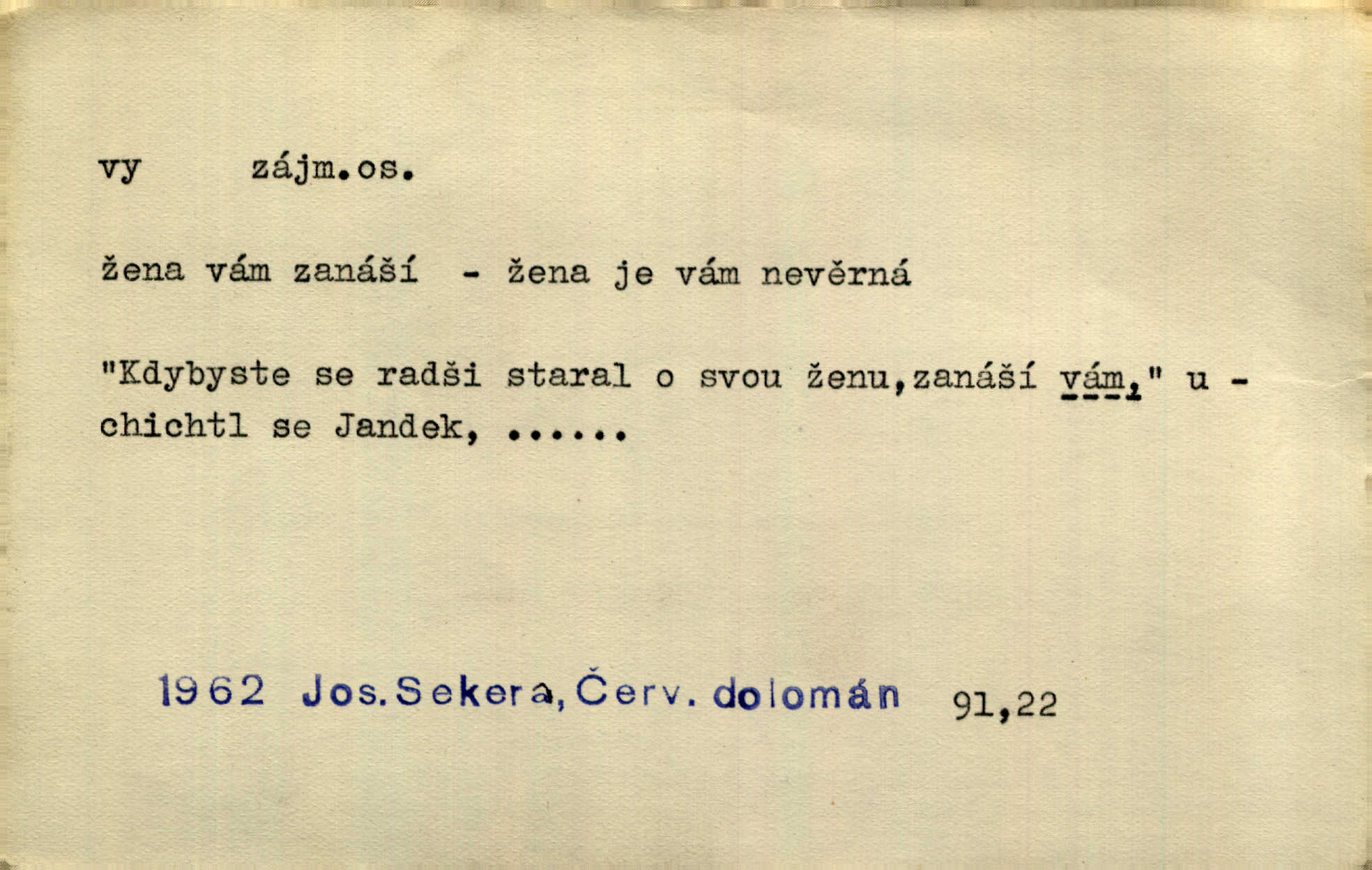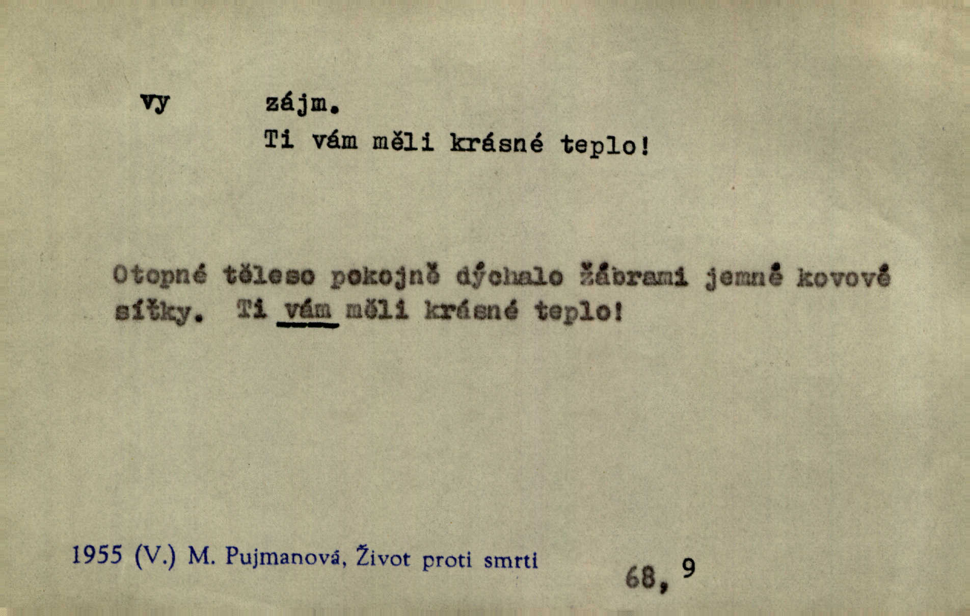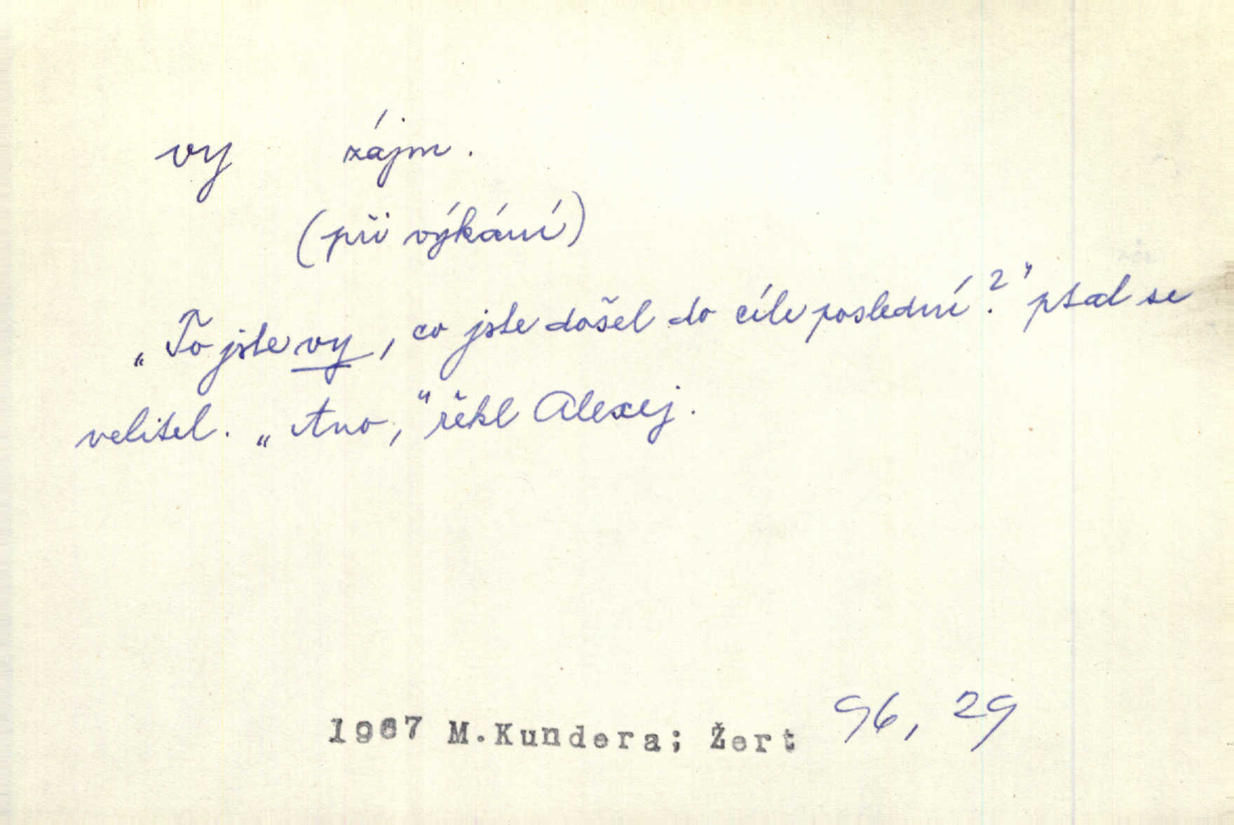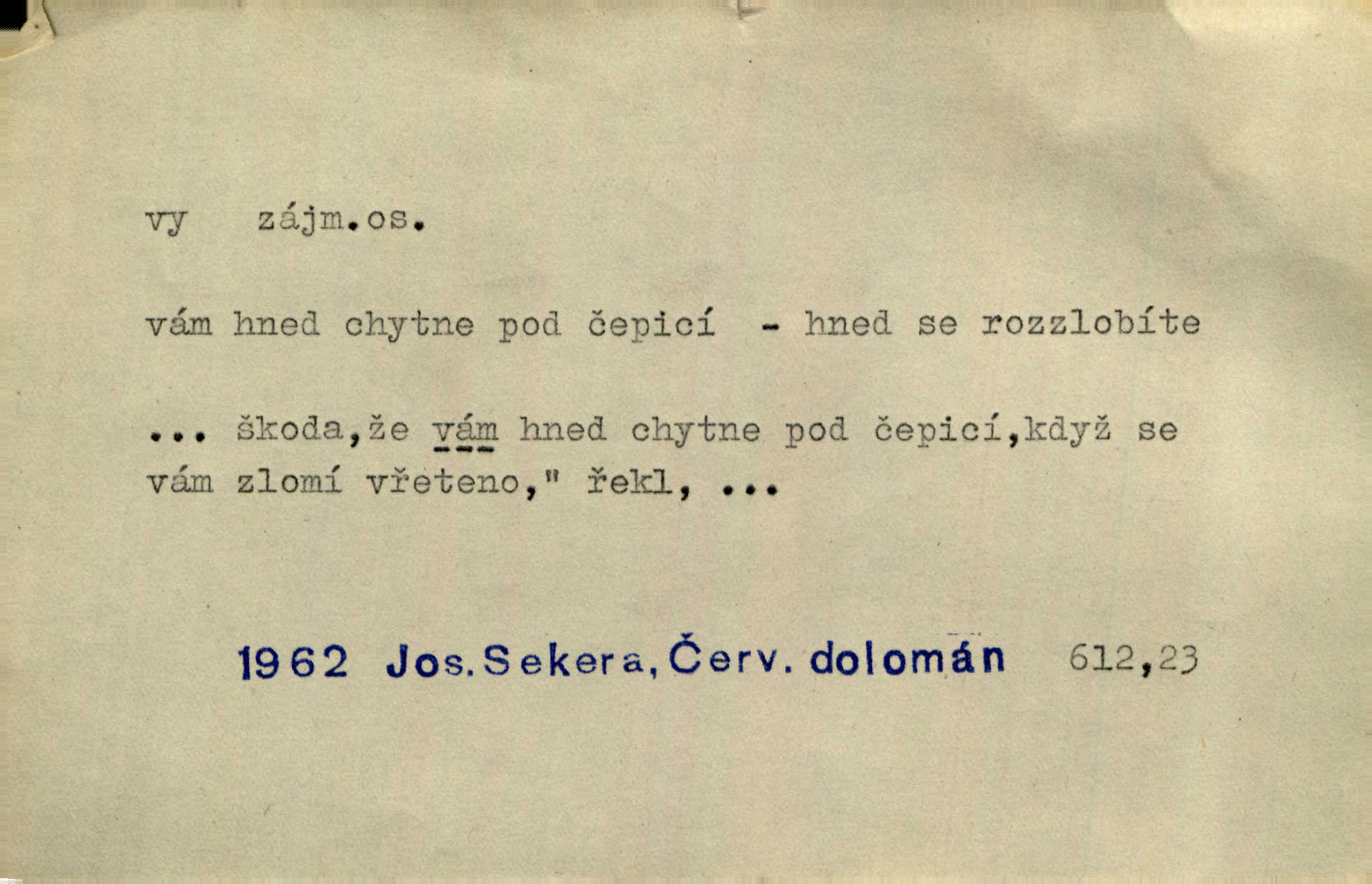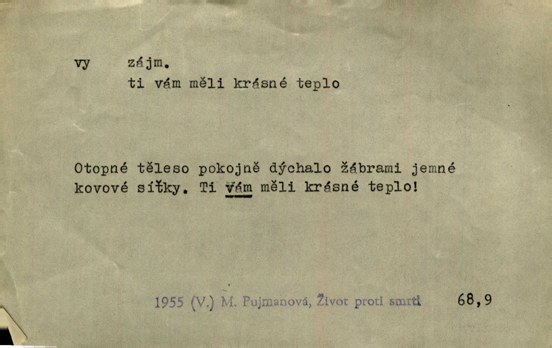 - vy zájm. osob. 2. os. pl. (2., 4. a 6. vás, 3. vám, 7. vámi) označuje dvě n. více osob n. věcí, k nimž se mluvící v řeči obrací. Vy jediní jste zbyli z průvodu, jenž vyšel se mnou z drahé vlasti mé. Vrch. „I všecko, všecko vám [babičky] udělám, co jen chcete, odpověděla Liduška radostně. Erb. Dala bych Ti kamaráda — ale koho dát Ti, koho? Je vás [děvčat] ve vsi trochu mnoho. Ner. Změňte svá sídla a odejděte do neznámých krajů, neboť půda, která neživí mne, nebude ani vás živiti. Vanč. Ani z vás čtoucích nikdo tomu listu nerozumí. Win. Pán Bůh s vámi, co ten čtvrtý? Hál. Brzy uslyším vás, milé zvony, zas! Čech. D označuje osobu, k níž se mluvící v řeči obrací a jíž vyká. „Pozdrav tě Bůh, děvče!“ řekl k Dobrunce. „I vás, pane!“ odpověděla Dobrunka. Něm. „Do jakých koncův to s vámi dojde, Mrštino, povedete-li pořád svou?“ Šmil. Prý takový chudý chlapec jako vy, Půlpáne, si má víc vážit vzdělání, kterého se mu poskytuje. K. Čap. „Jste vy pan hospodský?“ Pfleg. Stěžujete si, můj drahý, že Vám příliš málo milostivě a srdečně píšu. Ner. [Farář] chce, aby mu lidé nevoňovali, aby mu říkali vy vykali mu. Jir. D Nom. vy zdůrazňuje n. má význam citově zabarvující. Povolání vaše, milí přátelé, právě vznešené jest; vyť lidi vzdělávati máte. Pař. Já se s vámi sdílet chtěl — sdílet o vše, co jsem měl; vy však všecko jste mi pobrali. Paleč. Nežádejte to, lidé! Má velká duše pod tím [tajemstvím] klesá, vy byste se v prach a popel obrátili! Klicp. Třetí [dítě] povídá: „Ale, babičko, vy máte jen čtyři zuby!“ Něm. „Vy nejste přece stár.“ Čech. „Hleďme — vy mne budete chtít poučovat, co to znamená!“ Něm. „Tak, tak, Fanynko! Vy jste dnes nějak čiperna.“ Šim. „Snad máme hrát na ulici fortepiáno, co? Vy!“ Herrm. D Nom. vy expr. při zvolání dává důraz na oslovenou osobu n. věc. Vy lenochové, to jste toho nasekali od rána! Herb. Vy, Václave, ať se mi o to postaráte, aby se sem dostal člověk jak se patří. Svět. Vy všichni, kdo jste stísněni, již pojďte, pojďte ke mně. Hál. Vzhůru, vy hoši, podívejte se všichni z ostra ven. Svět. Ej, ztepilí šuhaji v čižmách vy, ej, děvčata v suknici rudé. Bezr. Mateřídouško vlasti naší milé, vy prosté naše pověsti! Erb. Neplačte, vy modré oči, však se brzy vrátím k vám! Čech. Proč vy, moje mladé dni, ve tmách jste se zasypaly? Čel. Vy hvězdy jasné, vy hvězdy ve výši! Mácha. D u vás ve vaší rodině, ve vašem domě, ve vašem kraji, ve vaší domovině. „Ale měli u vás radost, že jste přišel?“ Rais. „U vás ani nevědí, kde bydlíš.“ Svob. „Tak co tam u vás robíte?“ začal se výminkář sklinkařů vyptávati. Preis. „Co pak u vás nesejou [obilí]?“ Rais. D Dat. vám expr. vyjadřuje citové zaujetí, důvěrnost. „I dušičky drahé, to je vám novina.“ Rais. „Počnu se vám s ním hádat, a nadávám taky.“ Šrám. „On vám sem přišel jako do hospody a chce s Máry tancovať.“ Pfleg. „Tam [v nebi] je vám prý krásně.“ Svět. „On vám byl jako u vytržení.“ Svob. „Ale on vám byl jako blázen.“ Šim.