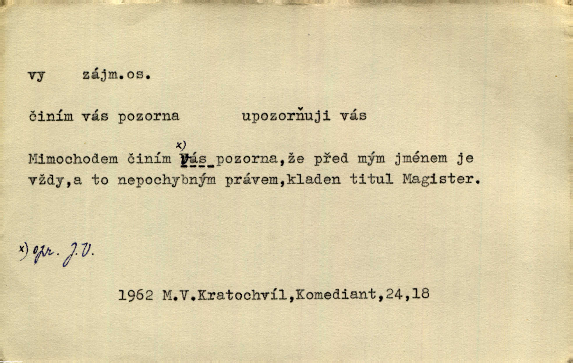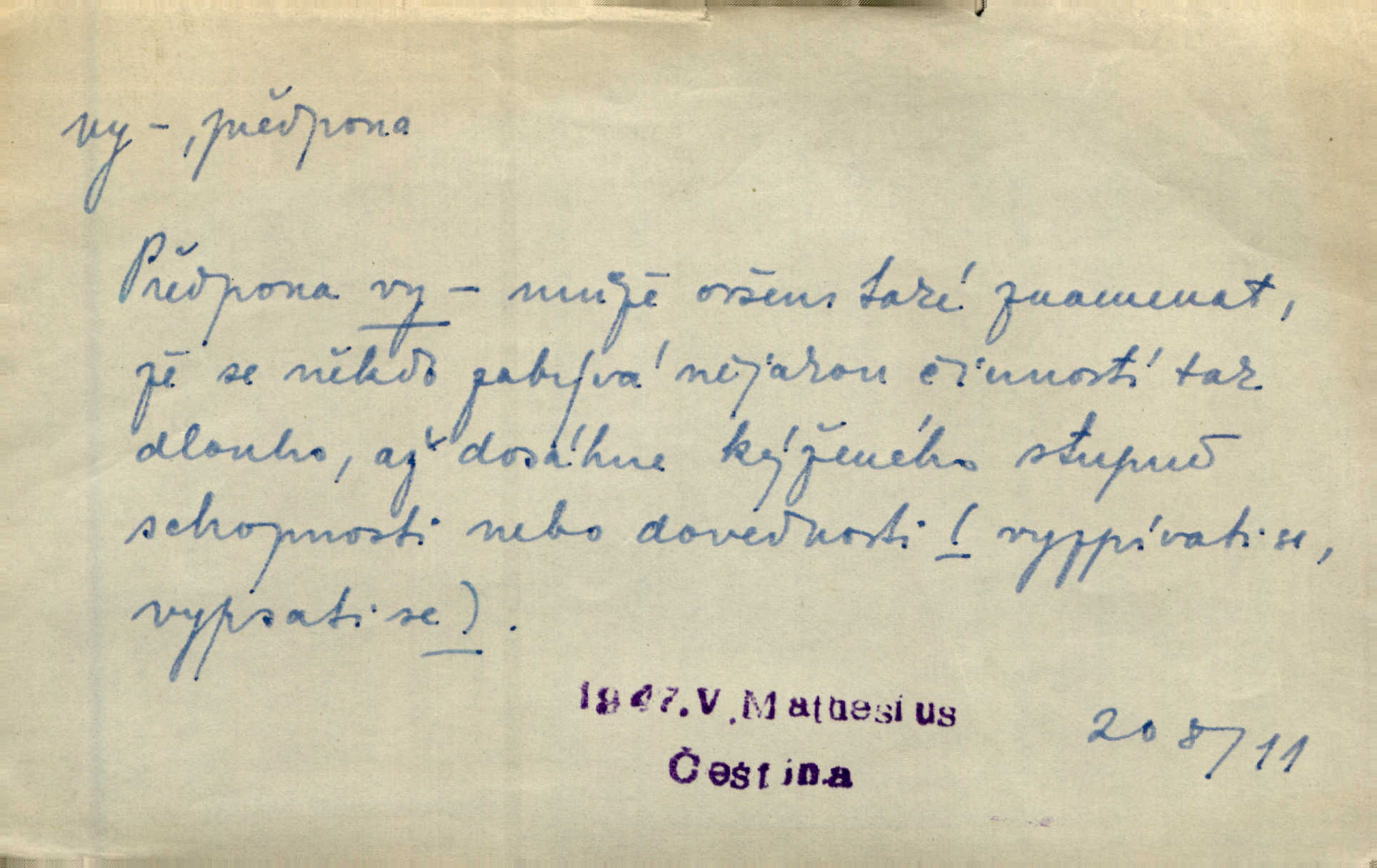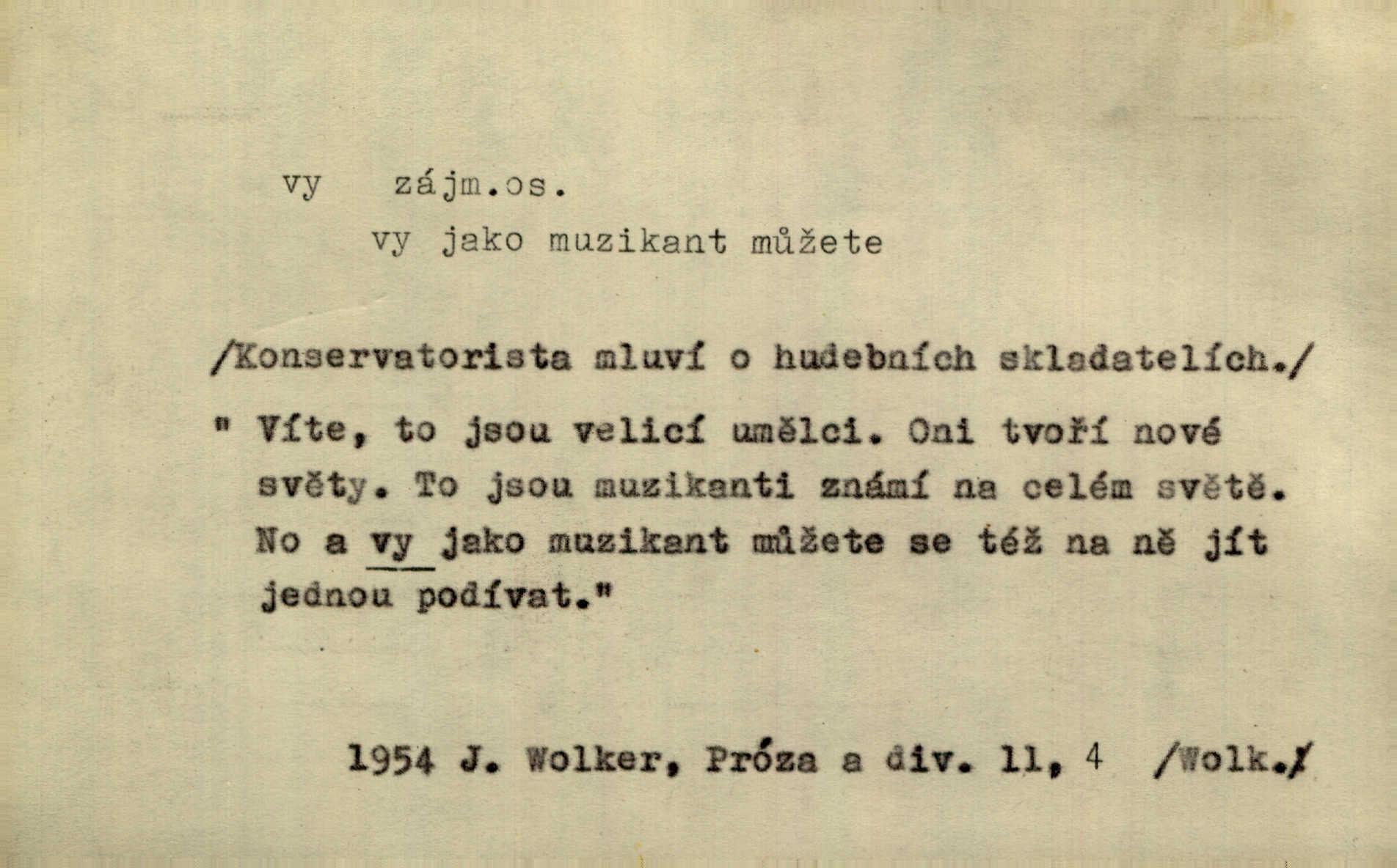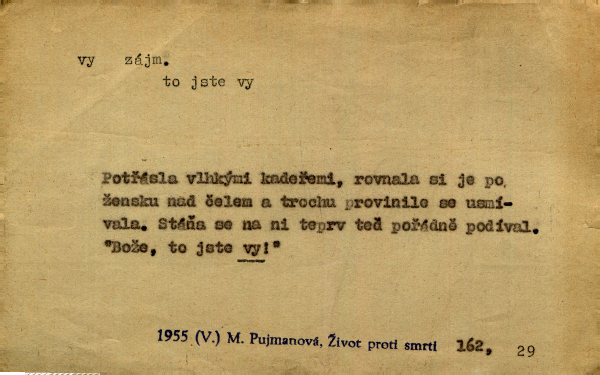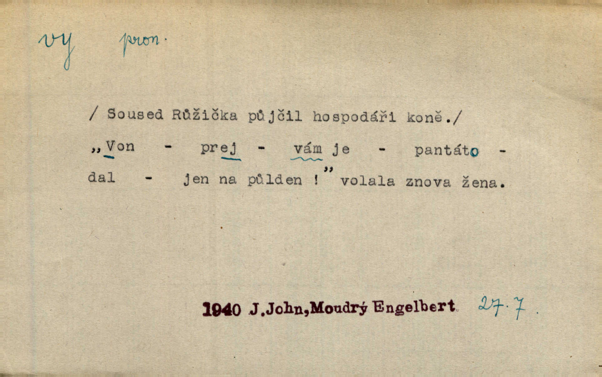 - vy zájm. osob. 2. os. pl. (2., 4. a 6. vás, 3. vám, 7. vámi) označuje dvě n. více osob n. věcí, k nimž se mluvící v řeči obrací. Vy jediní jste zbyli z průvodu, jenž vyšel se mnou z drahé vlasti mé. Vrch. „I všecko, všecko vám [babičky] udělám, co jen chcete, odpověděla Liduška radostně. Erb. Dala bych Ti kamaráda — ale koho dát Ti, koho? Je vás [děvčat] ve vsi trochu mnoho. Ner. Změňte svá sídla a odejděte do neznámých krajů, neboť půda, která neživí mne, nebude ani vás živiti. Vanč. Ani z vás čtoucích nikdo tomu listu nerozumí. Win. Pán Bůh s vámi, co ten čtvrtý? Hál. Brzy uslyším vás, milé zvony, zas! Čech. D označuje osobu, k níž se mluvící v řeči obrací a jíž vyká. „Pozdrav tě Bůh, děvče!“ řekl k Dobrunce. „I vás, pane!“ odpověděla Dobrunka. Něm. „Do jakých koncův to s vámi dojde, Mrštino, povedete-li pořád svou?“ Šmil. Prý takový chudý chlapec jako vy, Půlpáne, si má víc vážit vzdělání, kterého se mu poskytuje. K. Čap. „Jste vy pan hospodský?“ Pfleg. Stěžujete si, můj drahý, že Vám příliš málo milostivě a srdečně píšu. Ner. [Farář] chce, aby mu lidé nevoňovali, aby mu říkali vy vykali mu. Jir. D Nom. vy zdůrazňuje n. má význam citově zabarvující. Povolání vaše, milí přátelé, právě vznešené jest; vyť lidi vzdělávati máte. Pař. Já se s vámi sdílet chtěl — sdílet o vše, co jsem měl; vy však všecko jste mi pobrali. Paleč. Nežádejte to, lidé! Má velká duše pod tím [tajemstvím] klesá, vy byste se v prach a popel obrátili! Klicp. Třetí [dítě] povídá: „Ale, babičko, vy máte jen čtyři zuby!“ Něm. „Vy nejste přece stár.“ Čech. „Hleďme — vy mne budete chtít poučovat, co to znamená!“ Něm. „Tak, tak, Fanynko! Vy jste dnes nějak čiperna.“ Šim. „Snad máme hrát na ulici fortepiáno, co? Vy!“ Herrm. D Nom. vy expr. při zvolání dává důraz na oslovenou osobu n. věc. Vy lenochové, to jste toho nasekali od rána! Herb. Vy, Václave, ať se mi o to postaráte, aby se sem dostal člověk jak se patří. Svět. Vy všichni, kdo jste stísněni, již pojďte, pojďte ke mně. Hál. Vzhůru, vy hoši, podívejte se všichni z ostra ven. Svět. Ej, ztepilí šuhaji v čižmách vy, ej, děvčata v suknici rudé. Bezr. Mateřídouško vlasti naší milé, vy prosté naše pověsti! Erb. Neplačte, vy modré oči, však se brzy vrátím k vám! Čech. Proč vy, moje mladé dni, ve tmách jste se zasypaly? Čel. Vy hvězdy jasné, vy hvězdy ve výši! Mácha. D u vás ve vaší rodině, ve vašem domě, ve vašem kraji, ve vaší domovině. „Ale měli u vás radost, že jste přišel?“ Rais. „U vás ani nevědí, kde bydlíš.“ Svob. „Tak co tam u vás robíte?“ začal se výminkář sklinkařů vyptávati. Preis. „Co pak u vás nesejou [obilí]?“ Rais. D Dat. vám expr. vyjadřuje citové zaujetí, důvěrnost. „I dušičky drahé, to je vám novina.“ Rais. „Počnu se vám s ním hádat, a nadávám taky.“ Šrám. „On vám sem přišel jako do hospody a chce s Máry tancovať.“ Pfleg. „Tam [v nebi] je vám prý krásně.“ Svět. „On vám byl jako u vytržení.“ Svob. „Ale on vám byl jako blázen.“ Šim.