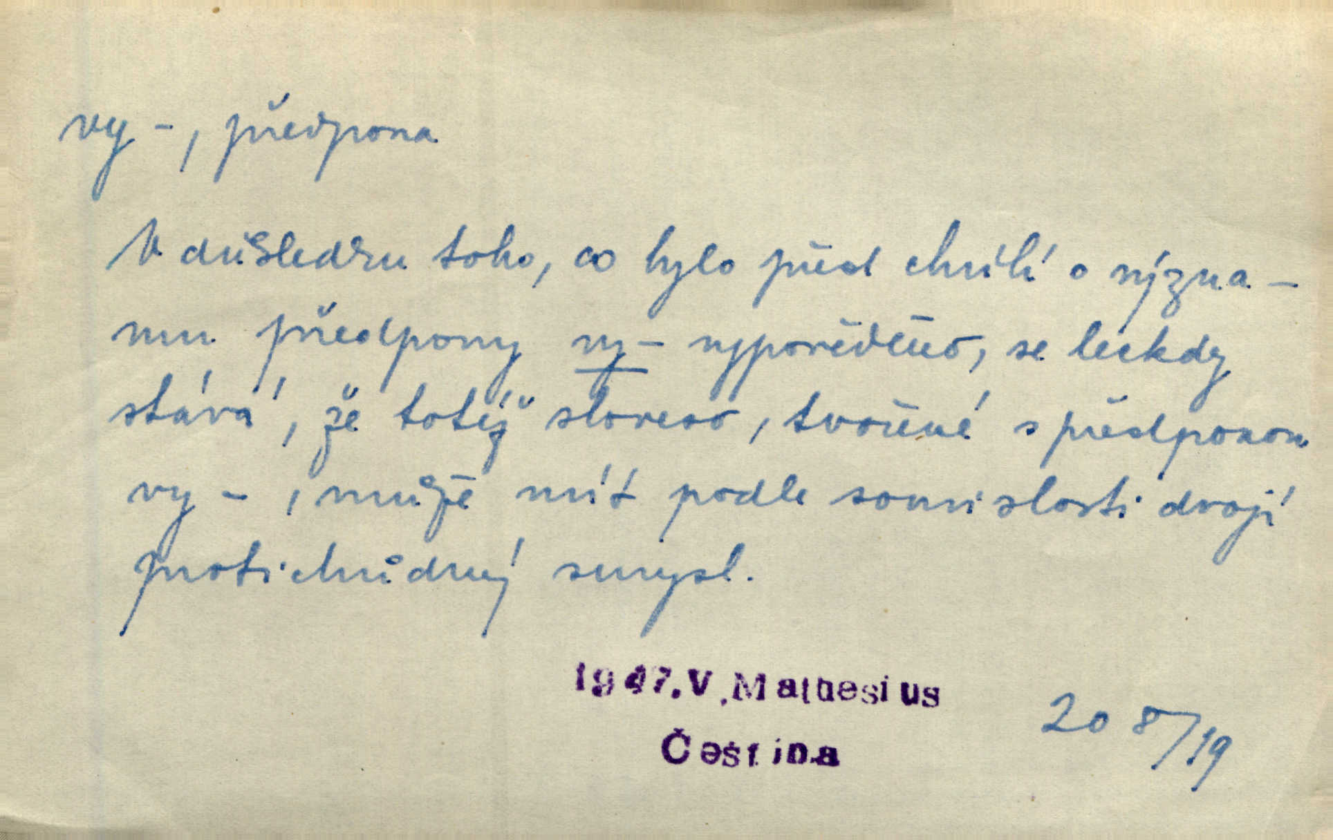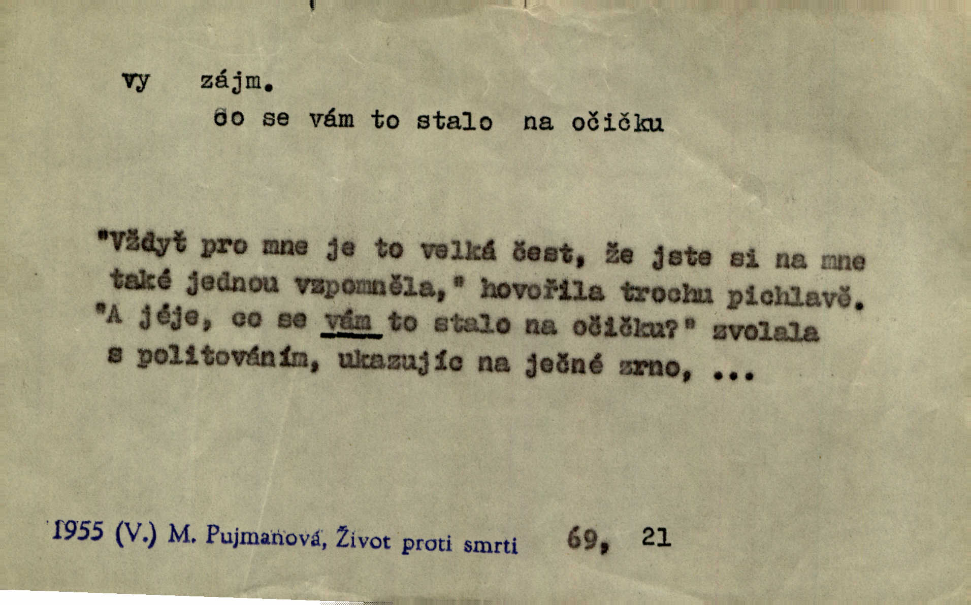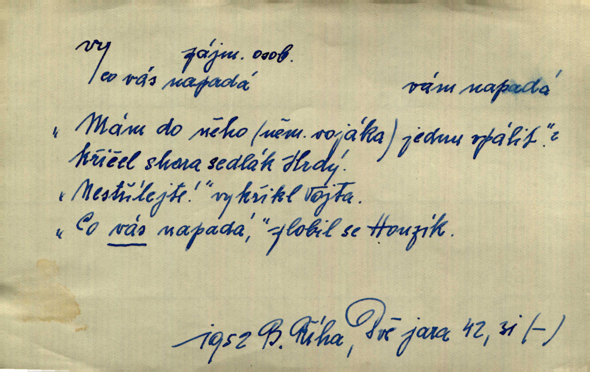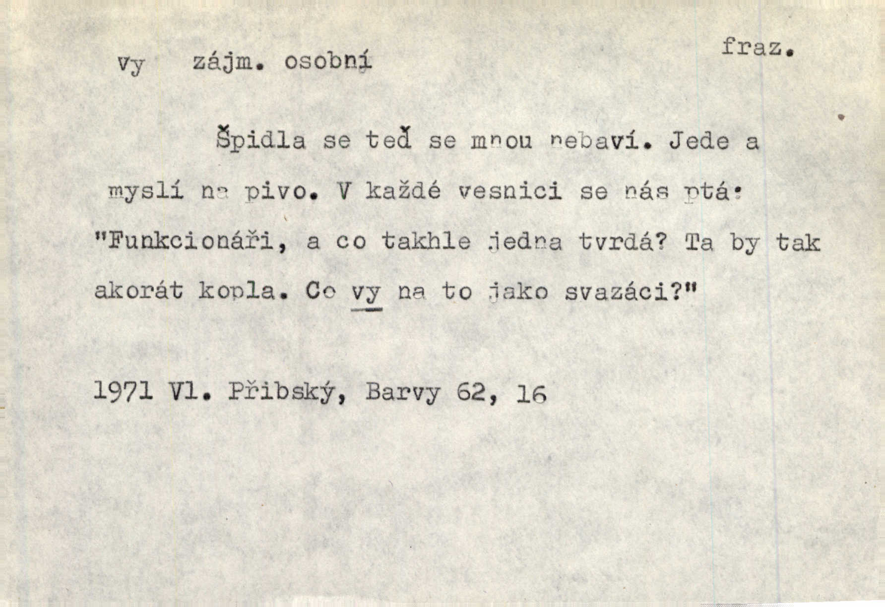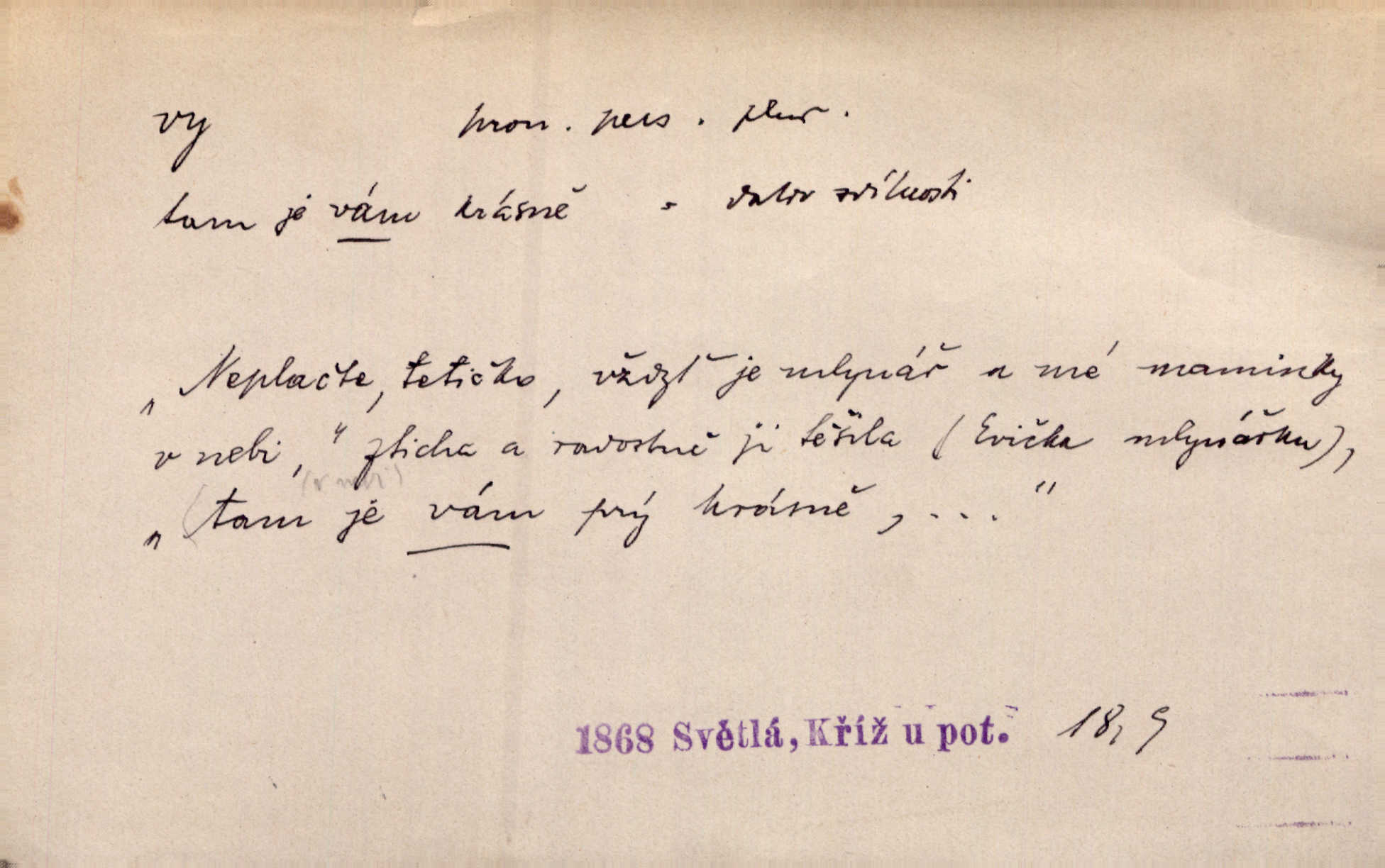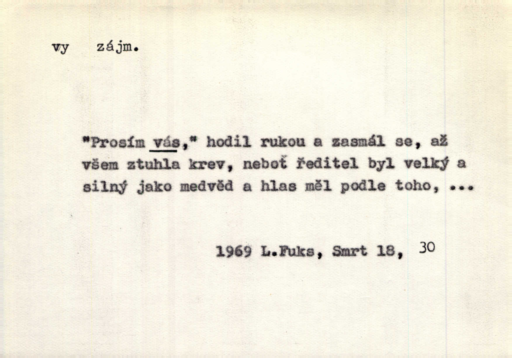 - vy zájm. osob. 2. os. pl. (2., 4. a 6. vás, 3. vám, 7. vámi) označuje dvě n. více osob n. věcí, k nimž se mluvící v řeči obrací. Vy jediní jste zbyli z průvodu, jenž vyšel se mnou z drahé vlasti mé. Vrch. „I všecko, všecko vám [babičky] udělám, co jen chcete, odpověděla Liduška radostně. Erb. Dala bych Ti kamaráda — ale koho dát Ti, koho? Je vás [děvčat] ve vsi trochu mnoho. Ner. Změňte svá sídla a odejděte do neznámých krajů, neboť půda, která neživí mne, nebude ani vás živiti. Vanč. Ani z vás čtoucích nikdo tomu listu nerozumí. Win. Pán Bůh s vámi, co ten čtvrtý? Hál. Brzy uslyším vás, milé zvony, zas! Čech. D označuje osobu, k níž se mluvící v řeči obrací a jíž vyká. „Pozdrav tě Bůh, děvče!“ řekl k Dobrunce. „I vás, pane!“ odpověděla Dobrunka. Něm. „Do jakých koncův to s vámi dojde, Mrštino, povedete-li pořád svou?“ Šmil. Prý takový chudý chlapec jako vy, Půlpáne, si má víc vážit vzdělání, kterého se mu poskytuje. K. Čap. „Jste vy pan hospodský?“ Pfleg. Stěžujete si, můj drahý, že Vám příliš málo milostivě a srdečně píšu. Ner. [Farář] chce, aby mu lidé nevoňovali, aby mu říkali vy vykali mu. Jir. D Nom. vy zdůrazňuje n. má význam citově zabarvující. Povolání vaše, milí přátelé, právě vznešené jest; vyť lidi vzdělávati máte. Pař. Já se s vámi sdílet chtěl — sdílet o vše, co jsem měl; vy však všecko jste mi pobrali. Paleč. Nežádejte to, lidé! Má velká duše pod tím [tajemstvím] klesá, vy byste se v prach a popel obrátili! Klicp. Třetí [dítě] povídá: „Ale, babičko, vy máte jen čtyři zuby!“ Něm. „Vy nejste přece stár.“ Čech. „Hleďme — vy mne budete chtít poučovat, co to znamená!“ Něm. „Tak, tak, Fanynko! Vy jste dnes nějak čiperna.“ Šim. „Snad máme hrát na ulici fortepiáno, co? Vy!“ Herrm. D Nom. vy expr. při zvolání dává důraz na oslovenou osobu n. věc. Vy lenochové, to jste toho nasekali od rána! Herb. Vy, Václave, ať se mi o to postaráte, aby se sem dostal člověk jak se patří. Svět. Vy všichni, kdo jste stísněni, již pojďte, pojďte ke mně. Hál. Vzhůru, vy hoši, podívejte se všichni z ostra ven. Svět. Ej, ztepilí šuhaji v čižmách vy, ej, děvčata v suknici rudé. Bezr. Mateřídouško vlasti naší milé, vy prosté naše pověsti! Erb. Neplačte, vy modré oči, však se brzy vrátím k vám! Čech. Proč vy, moje mladé dni, ve tmách jste se zasypaly? Čel. Vy hvězdy jasné, vy hvězdy ve výši! Mácha. D u vás ve vaší rodině, ve vašem domě, ve vašem kraji, ve vaší domovině. „Ale měli u vás radost, že jste přišel?“ Rais. „U vás ani nevědí, kde bydlíš.“ Svob. „Tak co tam u vás robíte?“ začal se výminkář sklinkařů vyptávati. Preis. „Co pak u vás nesejou [obilí]?“ Rais. D Dat. vám expr. vyjadřuje citové zaujetí, důvěrnost. „I dušičky drahé, to je vám novina.“ Rais. „Počnu se vám s ním hádat, a nadávám taky.“ Šrám. „On vám sem přišel jako do hospody a chce s Máry tancovať.“ Pfleg. „Tam [v nebi] je vám prý krásně.“ Svět. „On vám byl jako u vytržení.“ Svob. „Ale on vám byl jako blázen.“ Šim.