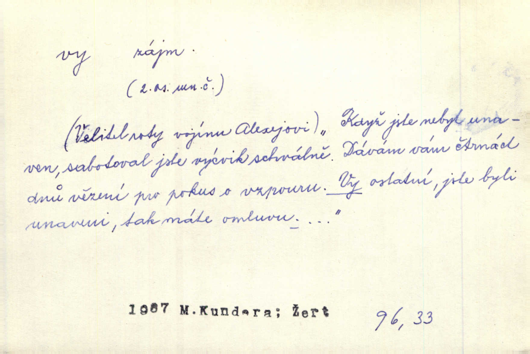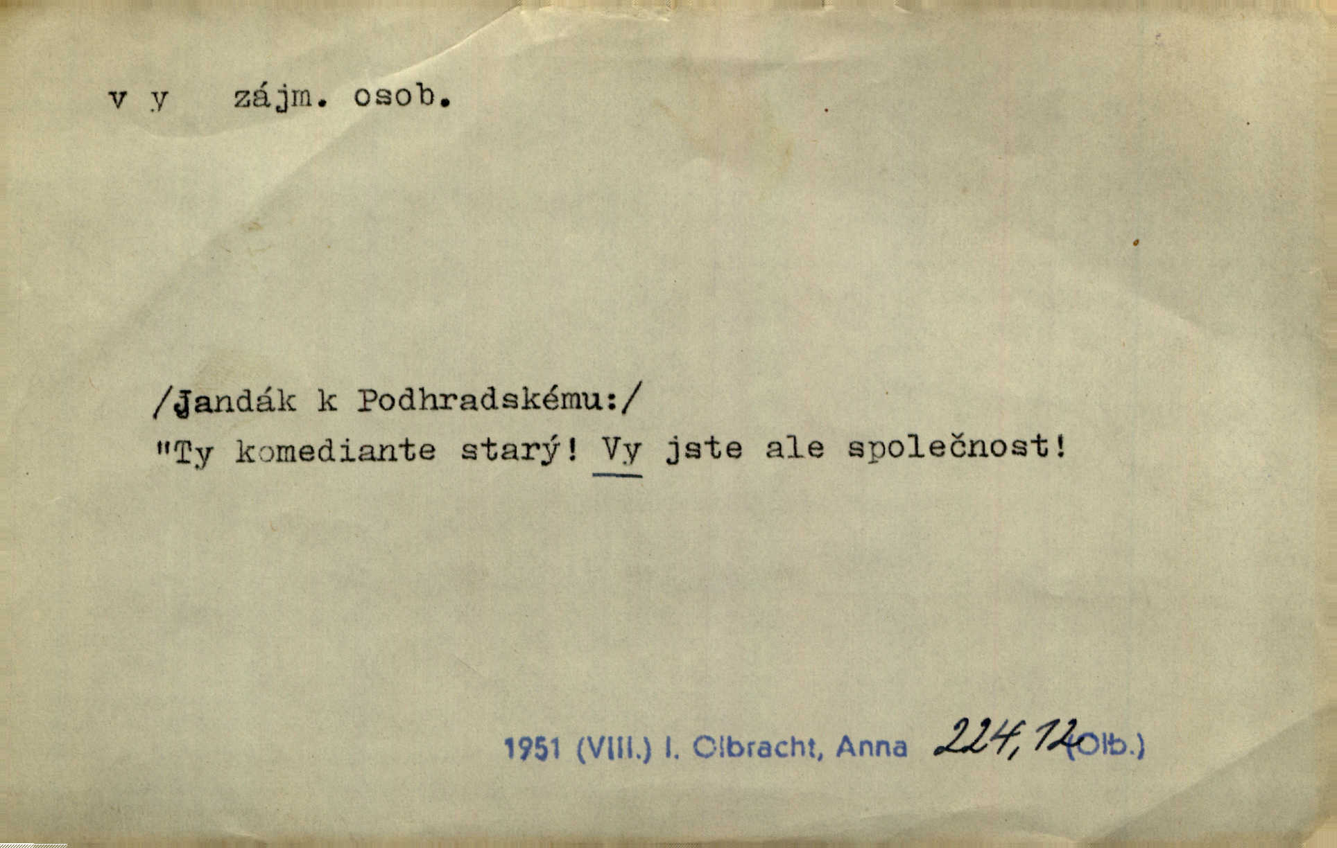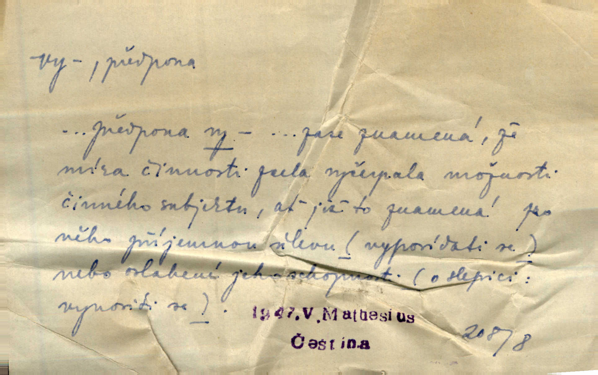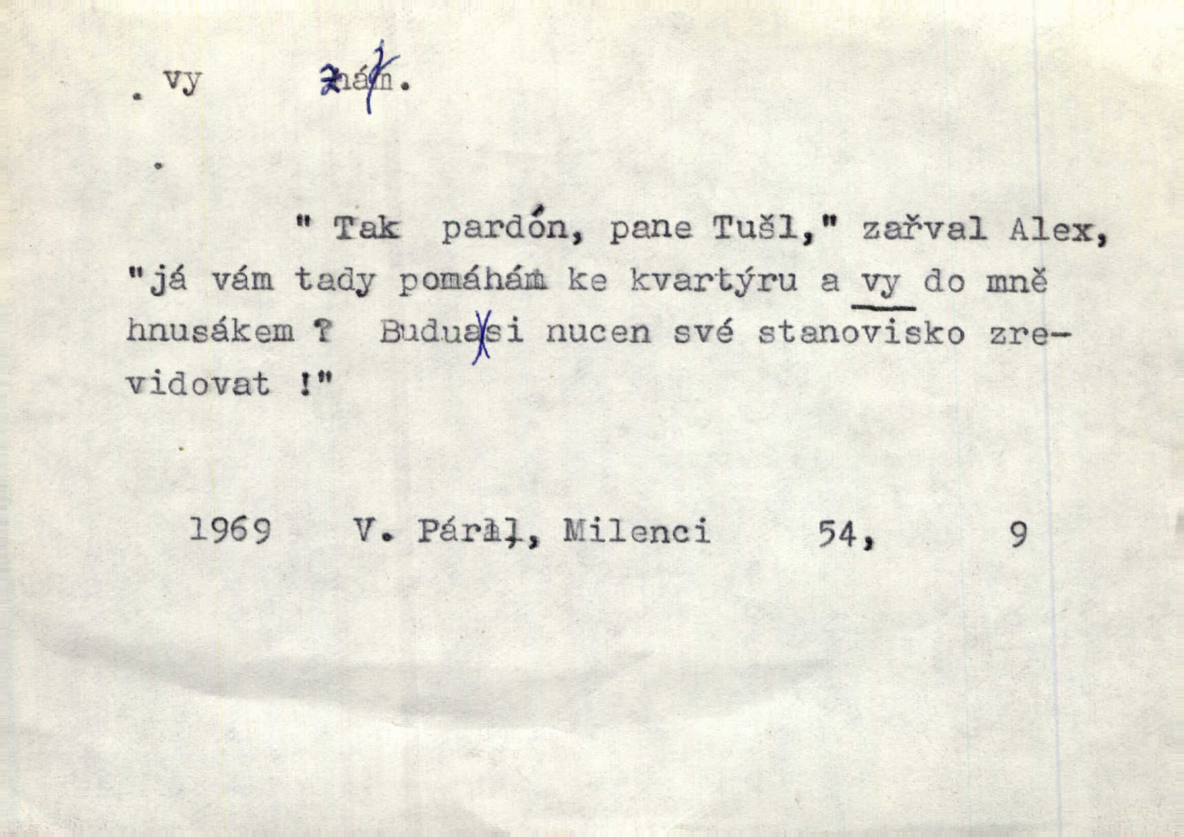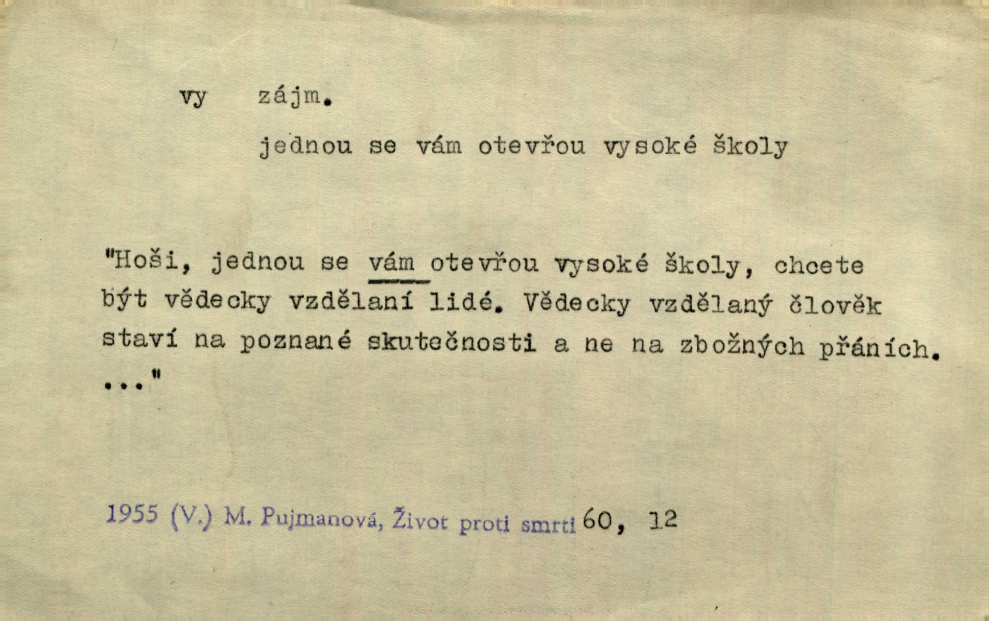 - vy zájm. osob. 2. os. pl. (2., 4. a 6. vás, 3. vám, 7. vámi) označuje dvě n. více osob n. věcí, k nimž se mluvící v řeči obrací. Vy jediní jste zbyli z průvodu, jenž vyšel se mnou z drahé vlasti mé. Vrch. „I všecko, všecko vám [babičky] udělám, co jen chcete, odpověděla Liduška radostně. Erb. Dala bych Ti kamaráda — ale koho dát Ti, koho? Je vás [děvčat] ve vsi trochu mnoho. Ner. Změňte svá sídla a odejděte do neznámých krajů, neboť půda, která neživí mne, nebude ani vás živiti. Vanč. Ani z vás čtoucích nikdo tomu listu nerozumí. Win. Pán Bůh s vámi, co ten čtvrtý? Hál. Brzy uslyším vás, milé zvony, zas! Čech. D označuje osobu, k níž se mluvící v řeči obrací a jíž vyká. „Pozdrav tě Bůh, děvče!“ řekl k Dobrunce. „I vás, pane!“ odpověděla Dobrunka. Něm. „Do jakých koncův to s vámi dojde, Mrštino, povedete-li pořád svou?“ Šmil. Prý takový chudý chlapec jako vy, Půlpáne, si má víc vážit vzdělání, kterého se mu poskytuje. K. Čap. „Jste vy pan hospodský?“ Pfleg. Stěžujete si, můj drahý, že Vám příliš málo milostivě a srdečně píšu. Ner. [Farář] chce, aby mu lidé nevoňovali, aby mu říkali vy vykali mu. Jir. D Nom. vy zdůrazňuje n. má význam citově zabarvující. Povolání vaše, milí přátelé, právě vznešené jest; vyť lidi vzdělávati máte. Pař. Já se s vámi sdílet chtěl — sdílet o vše, co jsem měl; vy však všecko jste mi pobrali. Paleč. Nežádejte to, lidé! Má velká duše pod tím [tajemstvím] klesá, vy byste se v prach a popel obrátili! Klicp. Třetí [dítě] povídá: „Ale, babičko, vy máte jen čtyři zuby!“ Něm. „Vy nejste přece stár.“ Čech. „Hleďme — vy mne budete chtít poučovat, co to znamená!“ Něm. „Tak, tak, Fanynko! Vy jste dnes nějak čiperna.“ Šim. „Snad máme hrát na ulici fortepiáno, co? Vy!“ Herrm. D Nom. vy expr. při zvolání dává důraz na oslovenou osobu n. věc. Vy lenochové, to jste toho nasekali od rána! Herb. Vy, Václave, ať se mi o to postaráte, aby se sem dostal člověk jak se patří. Svět. Vy všichni, kdo jste stísněni, již pojďte, pojďte ke mně. Hál. Vzhůru, vy hoši, podívejte se všichni z ostra ven. Svět. Ej, ztepilí šuhaji v čižmách vy, ej, děvčata v suknici rudé. Bezr. Mateřídouško vlasti naší milé, vy prosté naše pověsti! Erb. Neplačte, vy modré oči, však se brzy vrátím k vám! Čech. Proč vy, moje mladé dni, ve tmách jste se zasypaly? Čel. Vy hvězdy jasné, vy hvězdy ve výši! Mácha. D u vás ve vaší rodině, ve vašem domě, ve vašem kraji, ve vaší domovině. „Ale měli u vás radost, že jste přišel?“ Rais. „U vás ani nevědí, kde bydlíš.“ Svob. „Tak co tam u vás robíte?“ začal se výminkář sklinkařů vyptávati. Preis. „Co pak u vás nesejou [obilí]?“ Rais. D Dat. vám expr. vyjadřuje citové zaujetí, důvěrnost. „I dušičky drahé, to je vám novina.“ Rais. „Počnu se vám s ním hádat, a nadávám taky.“ Šrám. „On vám sem přišel jako do hospody a chce s Máry tancovať.“ Pfleg. „Tam [v nebi] je vám prý krásně.“ Svět. „On vám byl jako u vytržení.“ Svob. „Ale on vám byl jako blázen.“ Šim.