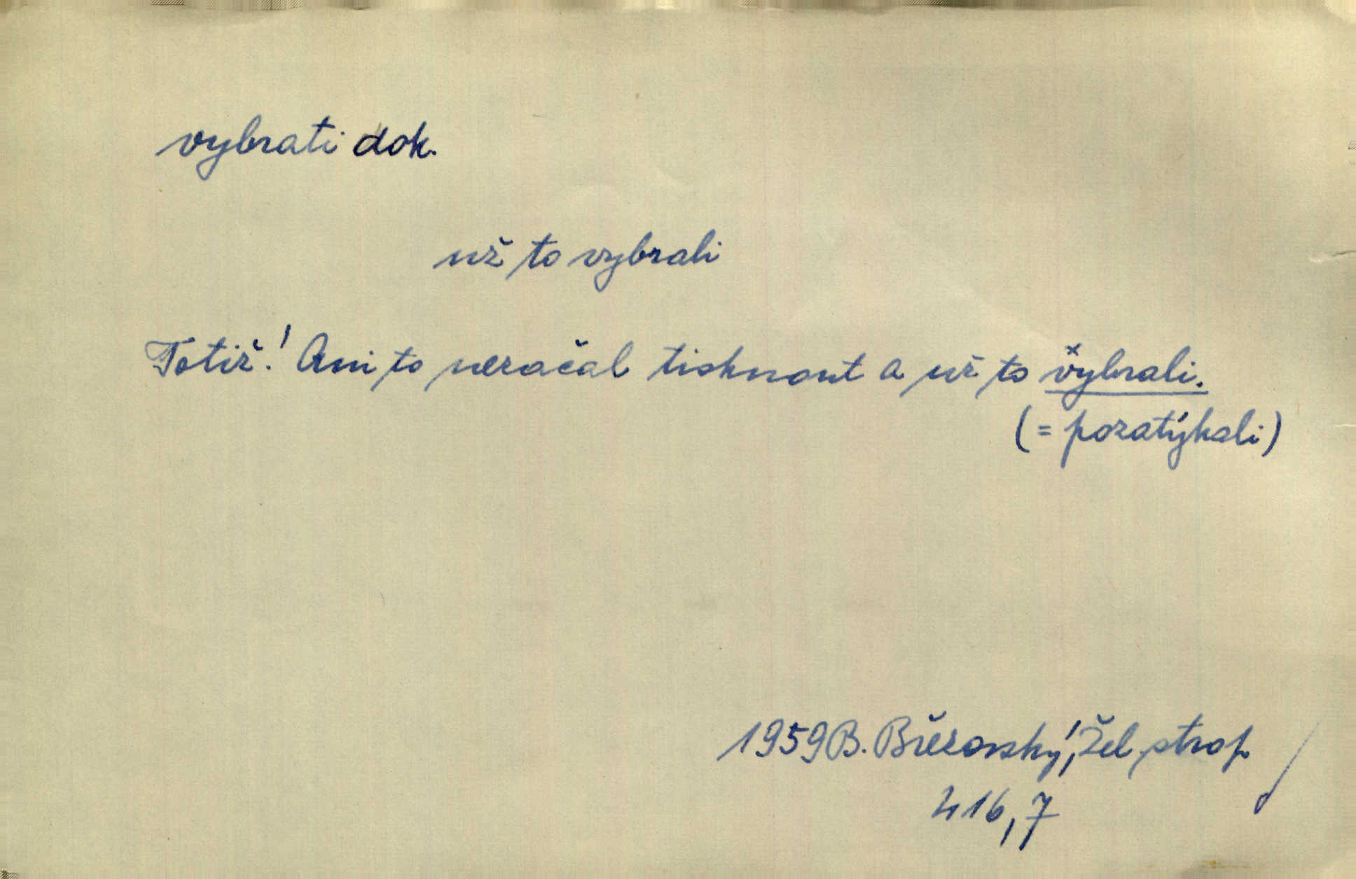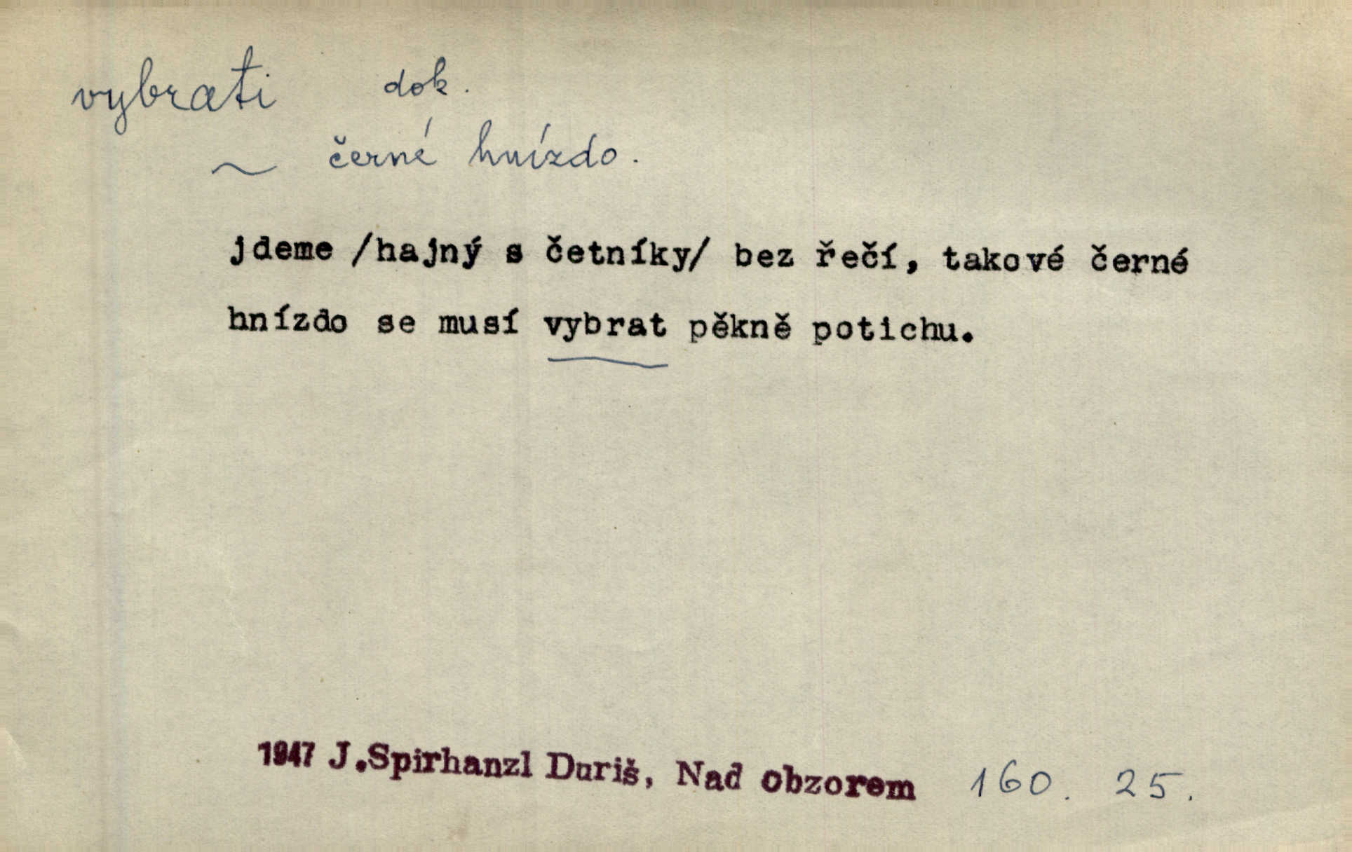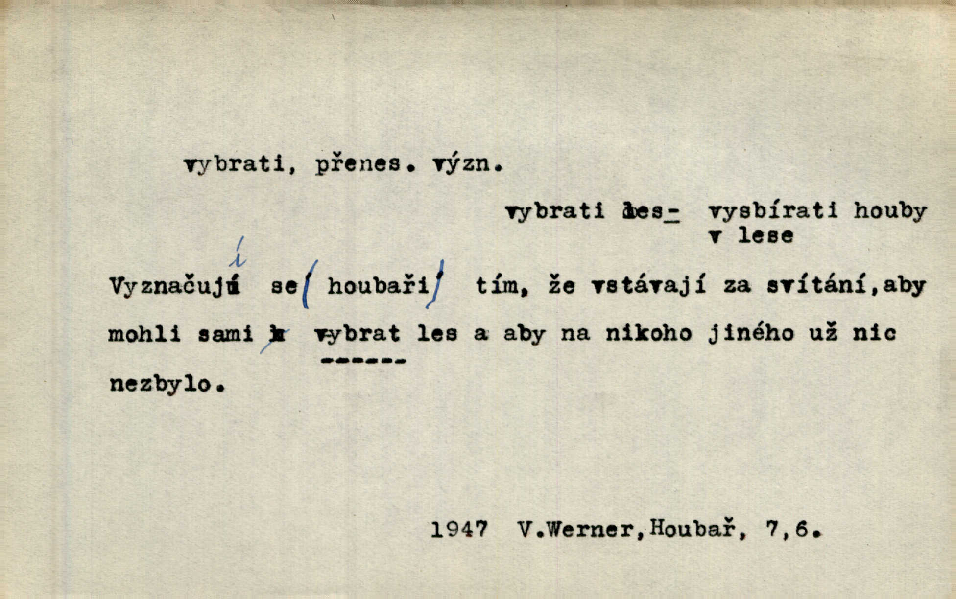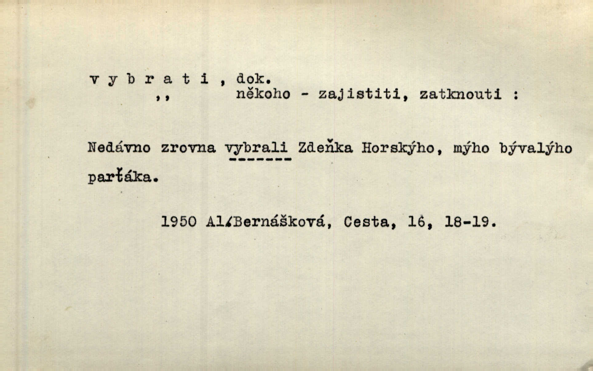 - vybrati dok. (1. sg. vyberu, imper. vyber) vyhledati něco rozptýleného, vzíti a od ostatního odděliti. Největší [jahody] vybrala a na zimu usušila co lék. Svět. Vybral všecken chléb z mléka. Rad. Vybral rozsypaný tabák z vody. Paleč. Rozvázal [pytlíček]‚ a vybrav tři dvacetníky, cinkal jimi na dlani. Rais. Brambory byly sice vybrány, ale pšenice teprve čekala sklizeny. Mor. D vybrati, vybrati si (co, koho) z většího množství vyhledati a vzíti to nejlepší n. co se hodí, rozhodnouti se pro něco, pro někoho, zvoliti, vyvoliti si něco, někoho. Z loděk dlouhé řady jsem vybral jednu. Vrch. Hostinská přinesla doutníky, a Voral si vybral. Rais. Naposled vybrala z několika zástěr jednu bílou vyšívanou. Něm. Tyto [buchty] jsou vaše z domu, ty zde naše, vyberte si, kterou chcete! Rais. Žádal ceduli, aby si mohl jídlo vybrat. Hajn. Nesla manželu talíř vybraných hlemýžďů. Herrm. Vybral jsem z veliké řady svých literárních článků pouze ty, o kterých myslím, že mají větší cenu. Vrch. Nebude zbytečno připojiti některé příklady vybrané ze starých spisovatelův. Čel. Měj se na pozoru, abys pravou pannu vybral. Erb. Cos to za ženicha vybrala sobě? Bezr. Okresní školní rada sama vybrala Kalinu [za učitele] rozhodla se pro něho. Herb. To místo si vybral za svůj poslední odpočinek. Jir. Tuto dobu jsi si vybral, abys mne opustil? Podl. Potom už si bude moci vybrati, čím bude chtít být. Šrám. Každý si může z toho prohlášení vybrati, co chce. Mach. Nevěděl, co si má z toho všeho vybrat. Svět. [Z posunku] jsem si vybral, že mám zazvonit u vrat paláce. Čap. Ch. D (co) vzíti a dáti ven, vyndati, vyjmouti, zprav. po částech, postupně, jedno po druhém; (koho) expr. zajistiti, zatknouti. Přistoupil ke skřínkám, vybral pánev, misky a sklenice. Tyl. Dal mu dvě knížky, kteréž z regálu vybral. Jir. Chvilkou hrábl také do nádoby, do peněz, plnou hrst jich vybral. Jir. Všechno z ní [truhličky] vybráno, všechno pryč, truhla jako vymetena. Jir. Mohli by vodu [ze studně] vybrat. Něm. Za slunného dne zrána se plásty včelám opatrně vyberou. Daněk. [Zahradník] s tváří žlutou a vousy světlými jako z klasu vybraná kukuřice. R. Svob. Jeden nebo druhý [chlapec] vybere pod slepicí vejce. Herb. „Vybral ptáčky“ — žalovaly naň děti ve škole. Baar. Včera mu kočka vybrala [kosovi] celé hnízdo. Kytl. Ale to si dal ubohý pán, ta [paní] mu vybrala z kapsy drobečky vyčinila mu. Něm. Expr. Vybrali [detektivové] u ní nějaké slečny a nějakou korespondenci. Včel. D postupným braním odstraniti obsah něčeho, vyprázdniti něco. Dostali jsme z dlouhé chvíle hlad, vybrali celou špižírnu. Lier. Jak muž přijel, kapsy mu vybrala. Jah. I studna se vybere, tím spíše vak peněz. Hronov. Celé ložisko [uhlí se] vybere. Hronov. D (peníze, vklady, zboží a pod.) vzíti, vyzdvihnouti, přijmouti výplatu. To on Hornof ani neví, co nebožka u mne vybrala, ony ženské nerady o dluhu mužovi vypravují. Jah. Čas od času vybráno bylo vždy po pěti zlatých [ze spořitelny]. Svob. Pro jistotu vybral pražské vklady. Vrba. Vybral si mimochodem měsíční částku své hubené pense. Čech. Není-li pak jiné pomoci, vybere to [učitel sobotales] v másle nebo vejcích. Tyl. D přijmouti, sebrati, postupně shromážditi povinný n. dobrovolný poplatek za něco, vytěžiti. I nájemné z polí vybrala, aby pan notář nebyl vytrhován. Baar. Nelze věděti, mnoho-li do roka vybere mostného. Světozor. Společnost dělila se večer po představení o to, co se vybralo. Kam. V sobotu nebo v neděli — deset — patnáct zlatek vyberem. Baar. Za to u kasy vybrali méně. Jir. Ten [hudec]‚ vybrav do sešlého klobouku beze střechy něco drobných penízků, bral se odtud. Jir. Vybrali mezi sebou na známky. Svob. D něco z něčeho odstraniti a tím vytvořiti prostor, vyhloubiti, prohloubiti. Vybrali příkop. Vaň. Ostatek [Suezského průplavu] mimo [splavnou] dráhu tu není ještě úplně vybrán — a nevybírá se. Ner. Já tu už vybral díru přes čtvrt metru a pořád nejsem na dně. Kop. Studny karlovarské se daly čistiti a hloub vybrati. ČČM. Spadl do Jeleního příkopu, kterýž pod věží hluboce vybrán. Herb. Nejdelší stranu [prkénka] můžeme uprostřed vybrati. Rozhlas. Všechny strany rámu jsou zdola vybrány. Rozhlas. Při rozvodnění Dunaje reduty podvráceny a od vody vybrány byly vymlety. Schoenf. nov. D Lid. vykrásti, ukrásti. Téhož dne Pražany vybrali a vypálili [táboři] klášter sv. Markéty v Břevnově. Lum. Když tam někdo vložil cigaro, hned jsem je vybral. Herrm. Vybravše z radnice poklady a spisy, zapálili je. Pal. D vybrati zatáčku a p. sport. slang projeti jí, bezpečně ji zdolat. Aby zatáčku vybral, na to nebylo v té rychlosti pomyšlení. Lid. nov. Jezdci [na bobu] se naklonili jako jeden muž a vybrali mistrovsky zatáčku. Svob. nov. D vybrati se (odkud) řidč. vyjíti odněkud, vystoupiti z něčeho. Vybral jsem se z hotelu. Kam. Bylo dvanáct, když se vybral z domu. Herrm. Ještě spěšněji než prve vybral se znova ze stavení. Preis. Vybrala se na dobro z Domanína. Šmil. D Řidč. vydati se na cestu, vypraviti se, odejíti, odebrati se někam. Vybral jsem se k němu, abych se s ním pojednal. Hol. Za čas jednou se vybrala [mlynářka] na Staré bělidlo. Něm. Bylo po desáté, když se vybrali z Vambeřic. Jir. Vybral se s čeládkou do polí. Šmil. Petr vybral se navštívit starého Hájka. Staš. Do vojny se vybrati musel král. Něm. D (z čeho) řidč. z něčeho se zvolna dostati, něčeho se zbaviti, probrati se, vzpamatovati se z něčeho, vytrhnouti se. Šťastně jsme se vybrali z roje prodavačů pohlednic. Mach. Vzpíral se do výše, aby se vybral ze závěje. Vrba. Než se někdo probudil a z postele vybral, byli už [zloději] přes hory a do